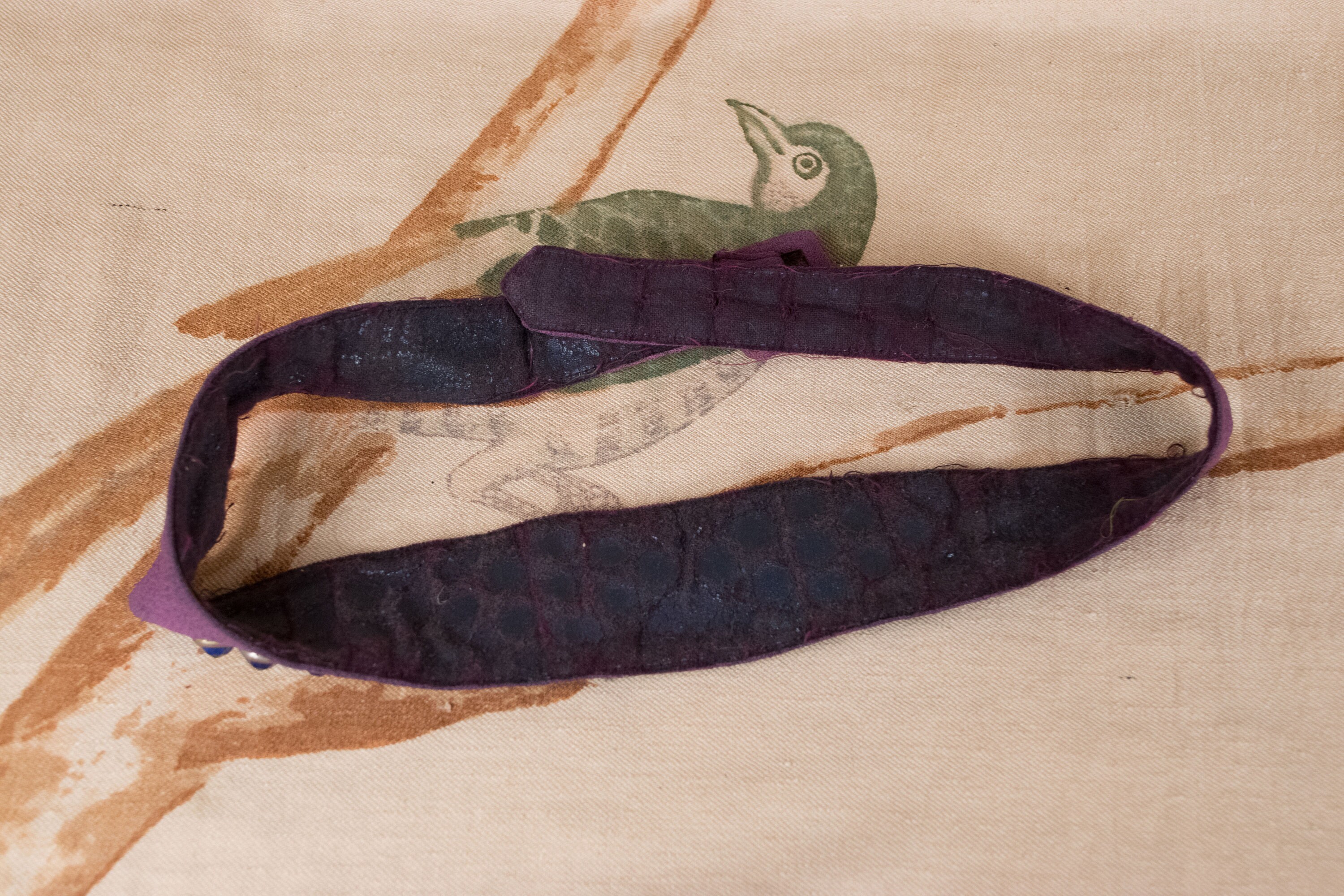 The rayon is significantly and unevenly faded - it would originally have been royal blue or purple, and the treatment on the back is very worn. There's a small scuff on the left. I find no other issues to note! Gently priced due to fade
