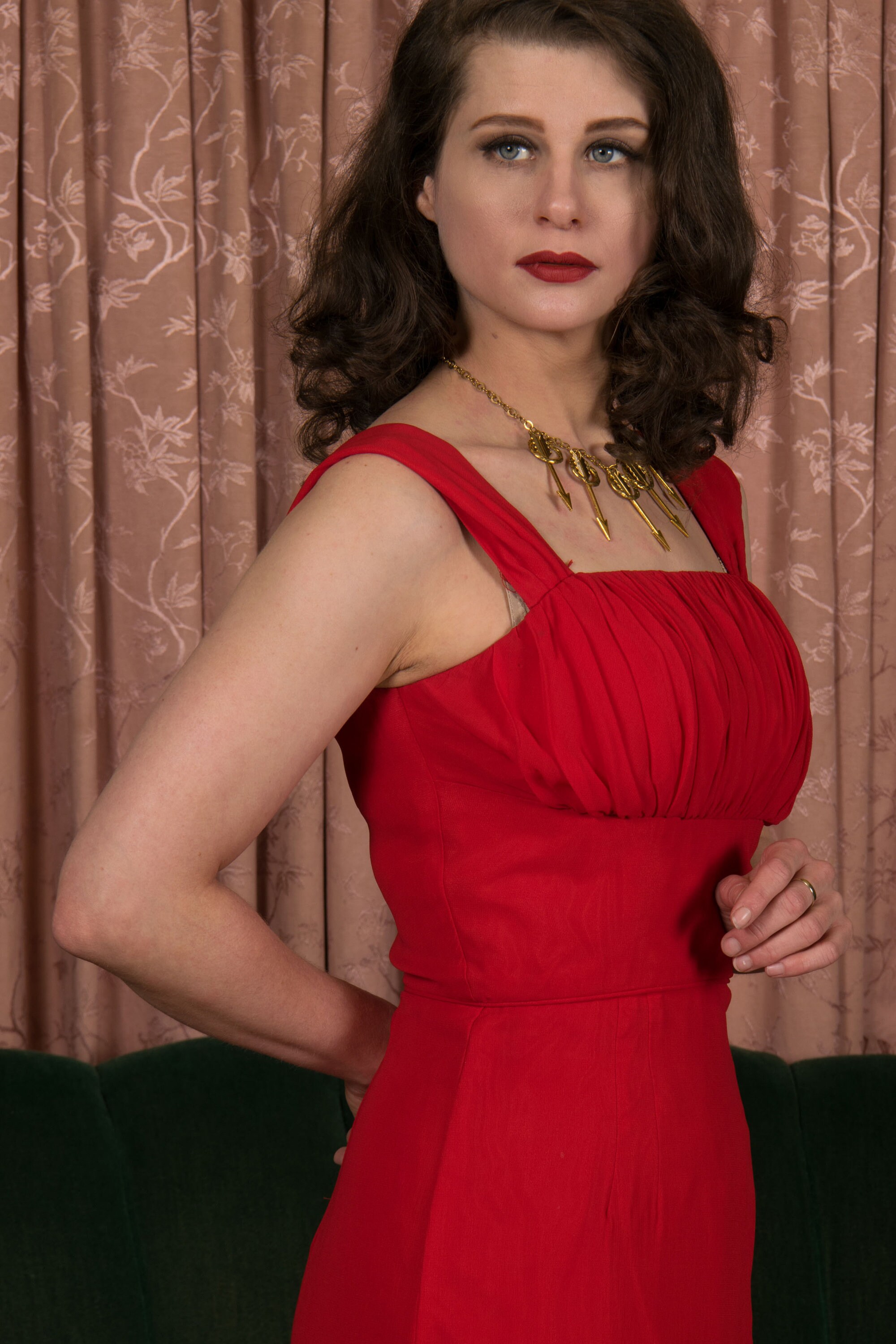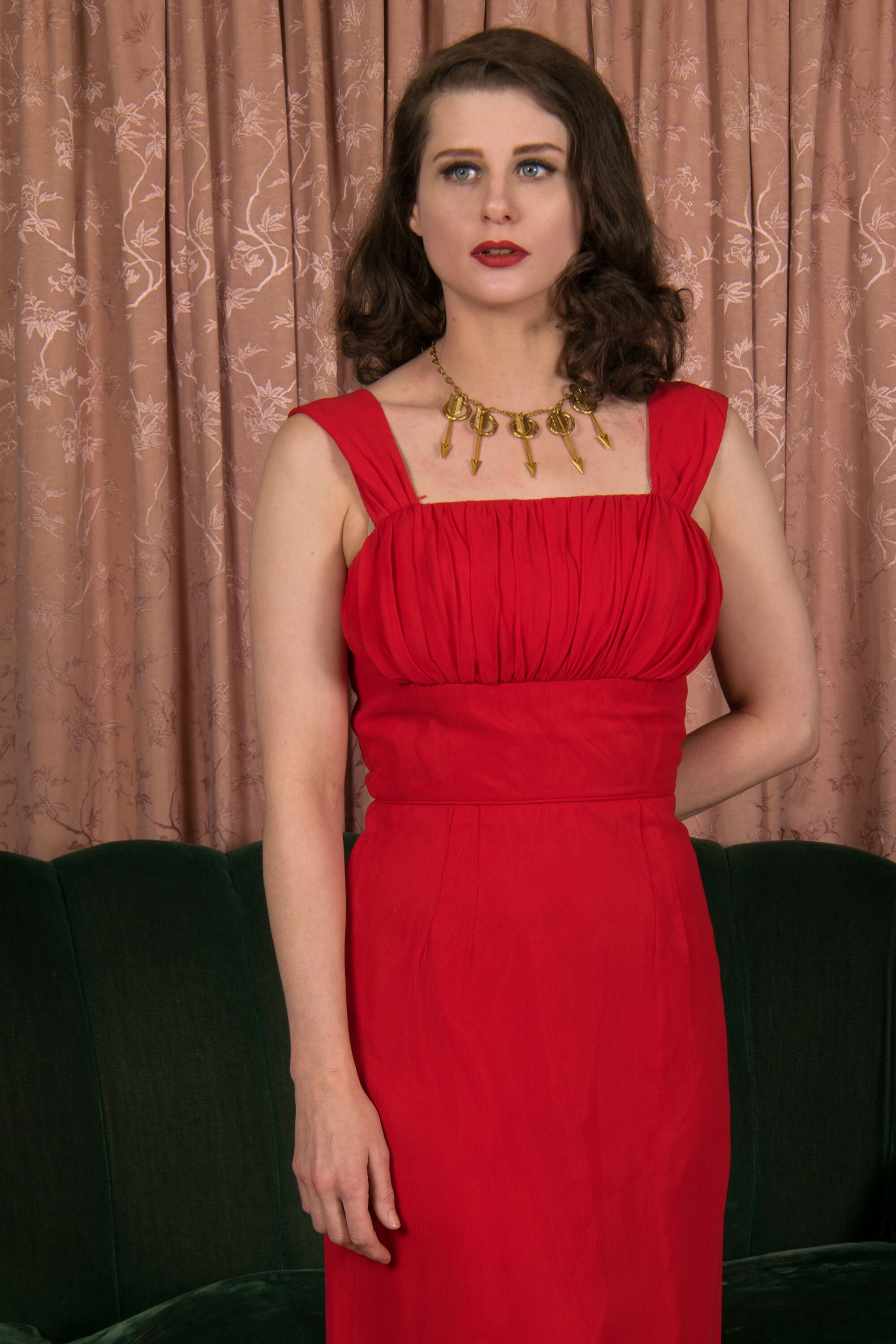 A vintage 1950s dress that's 100% bombshell, made to fit like a glove. This curve hugging dress is a brilliant lipsticky red rayon chiffon over red acetate lining. The bust is exceptional, ruched to enhance the look of full curves for an hourglass shape. A wide midwaist defines the rest of the torso, the waist defined by self-fabric piping. The skirt has long darts both front and back, with a pleated vent at the center back for ease of movement. Seasonal, spicy hot, and quintessentially sexy. This garment closes with a metal back zipper.