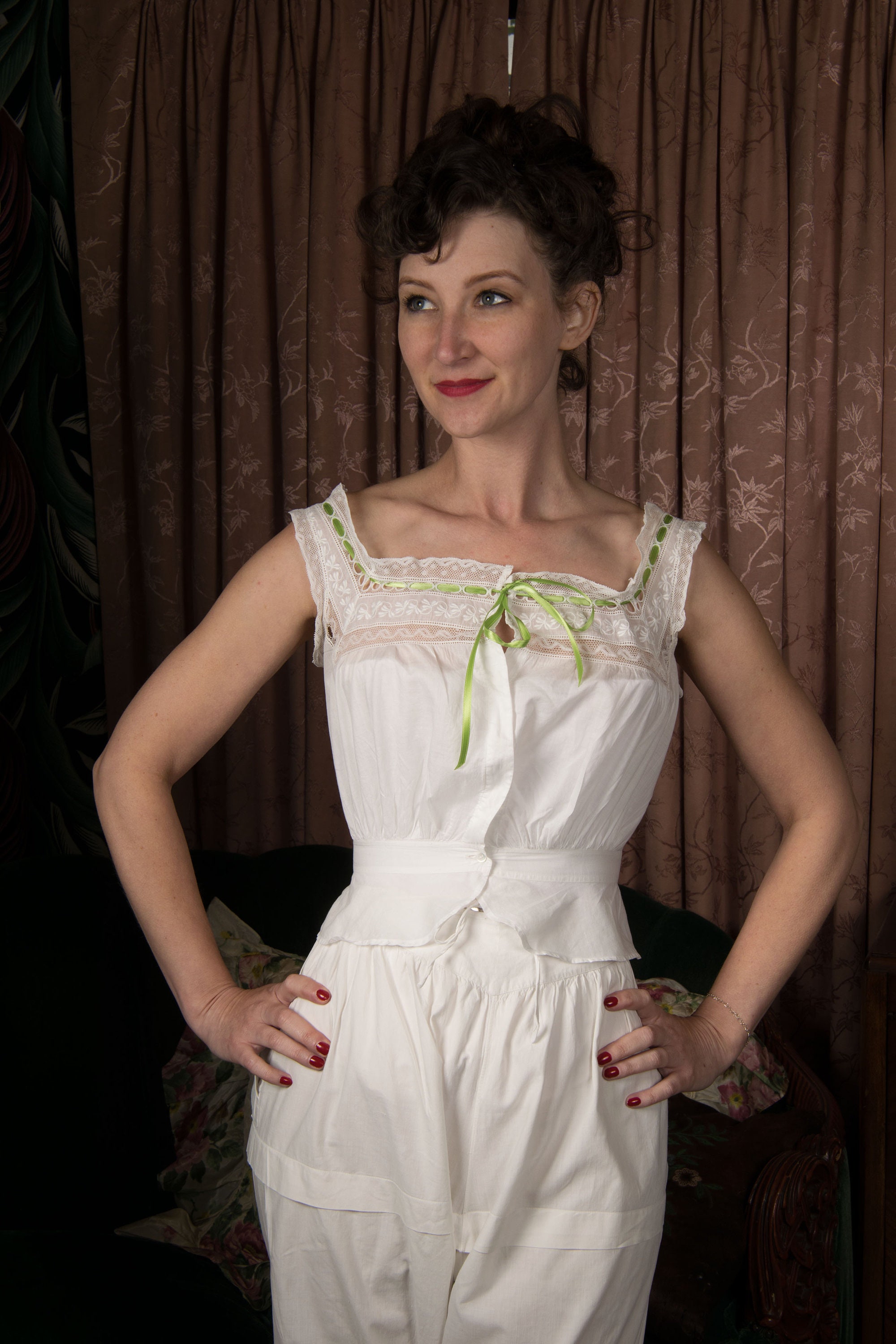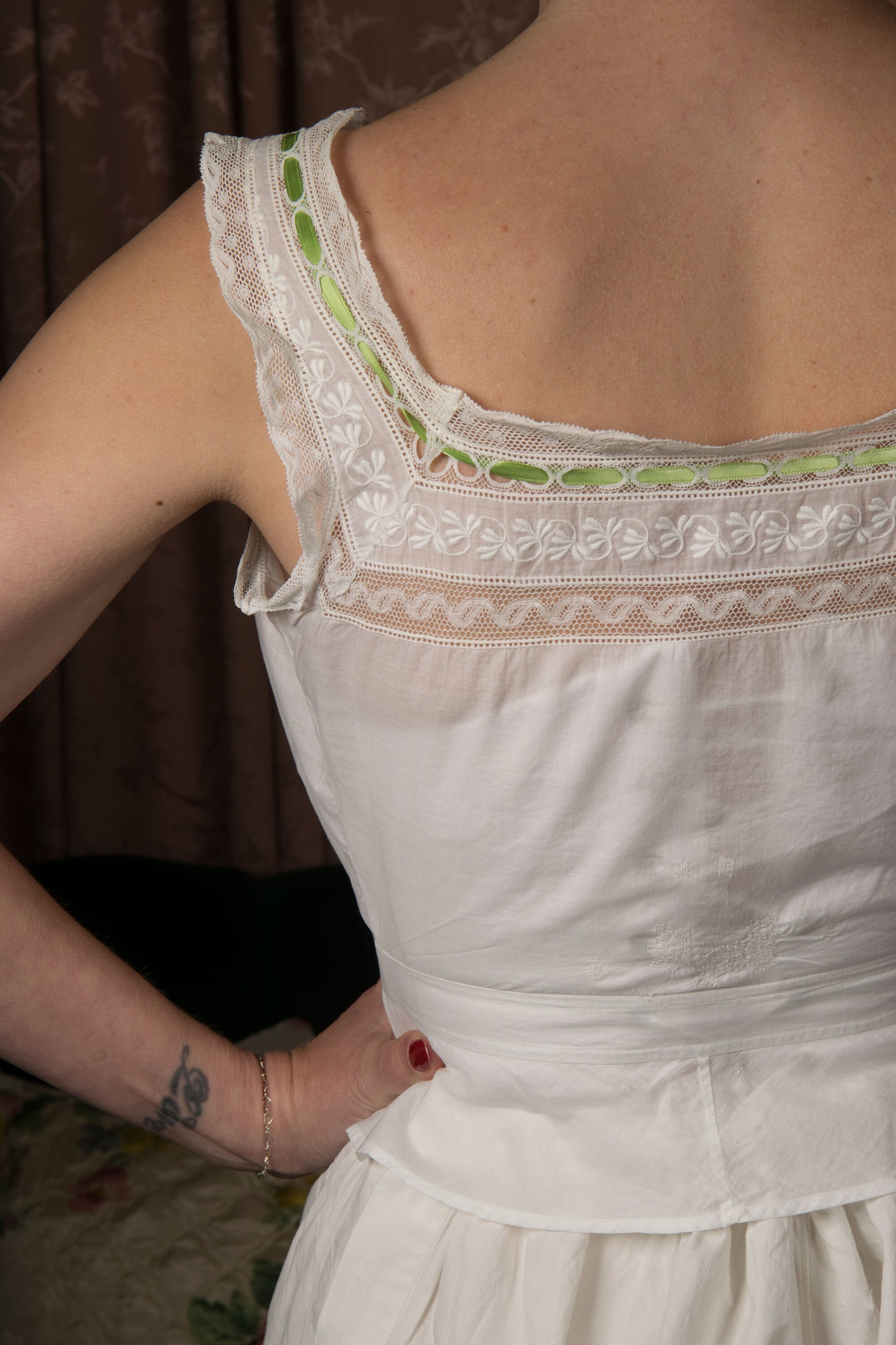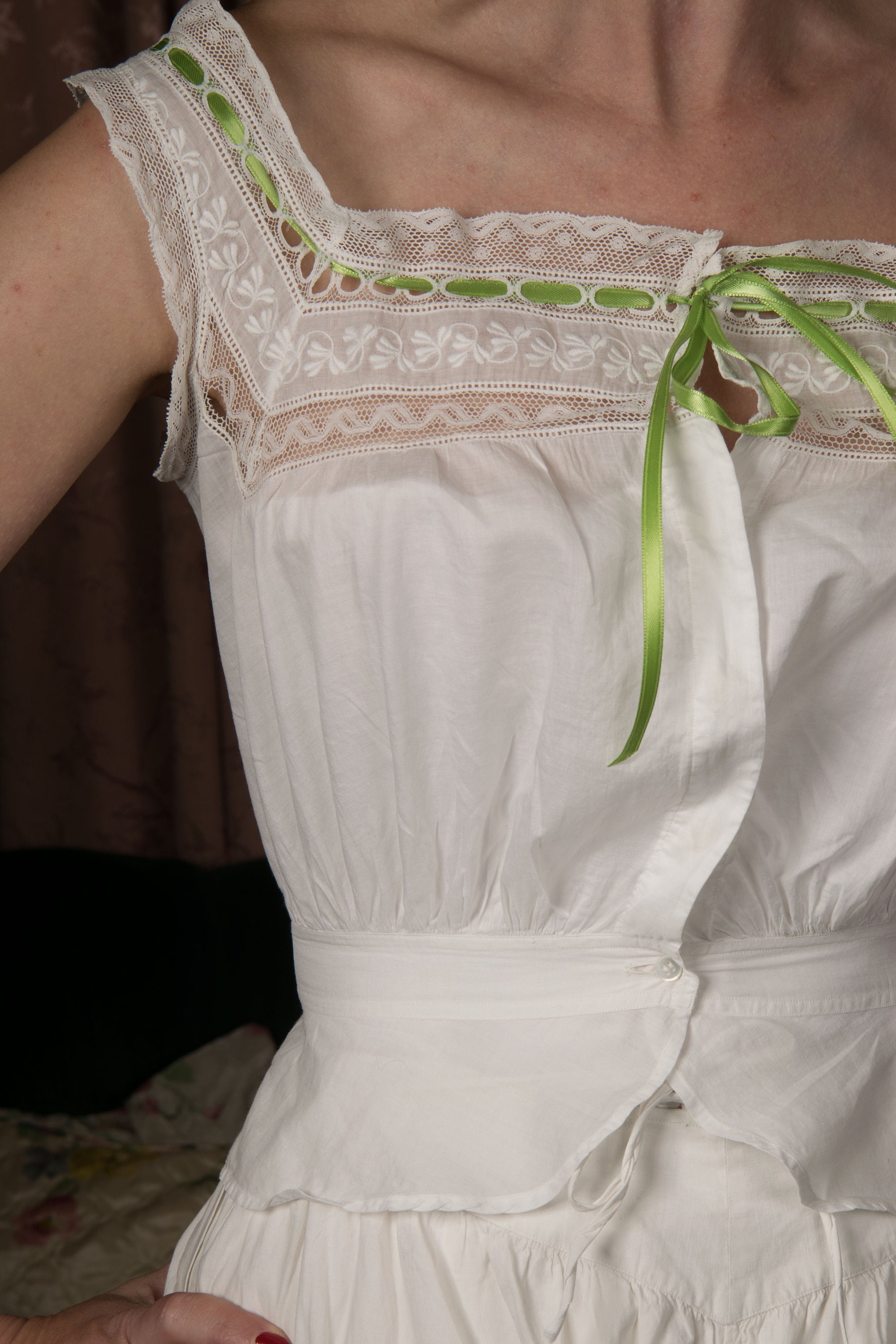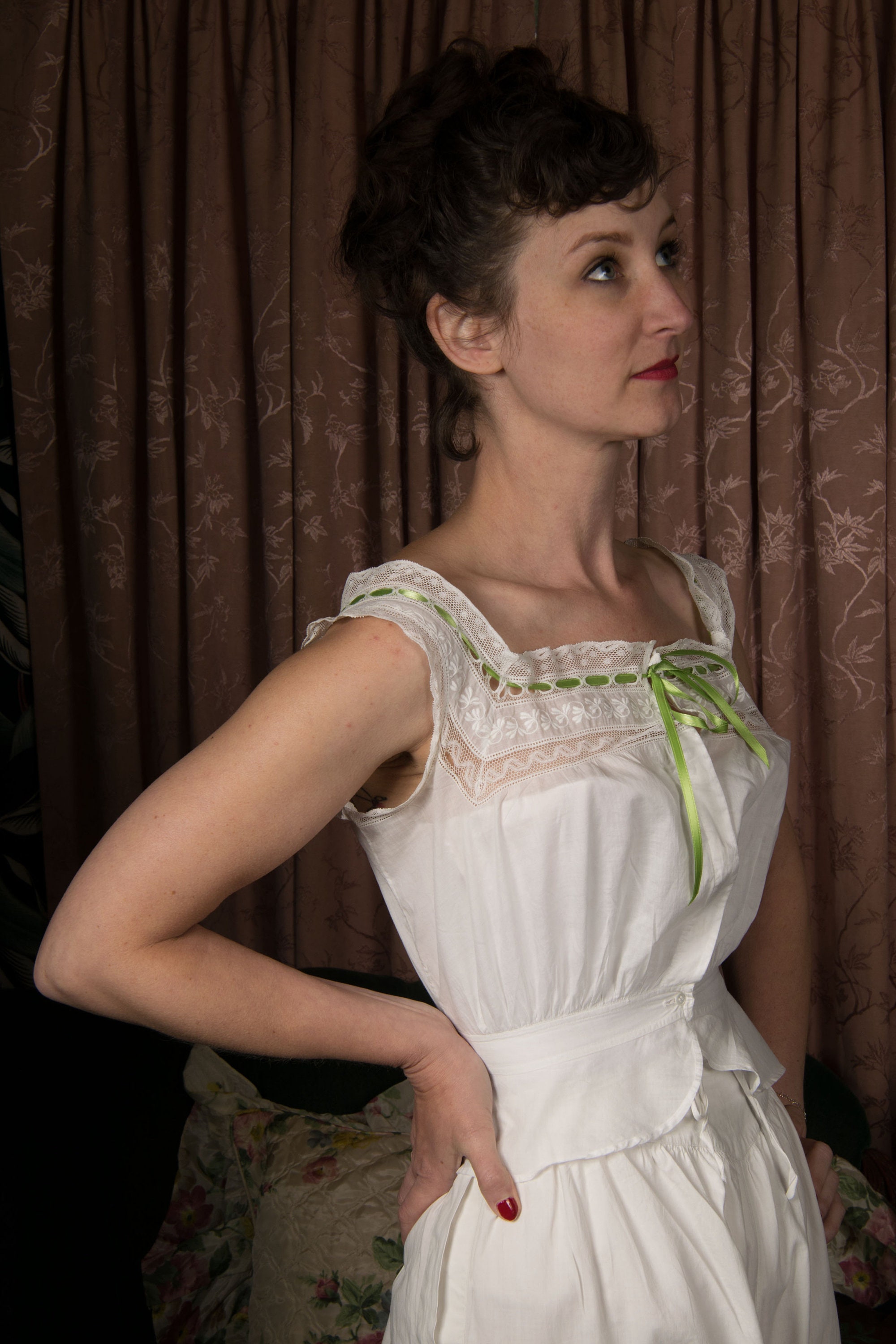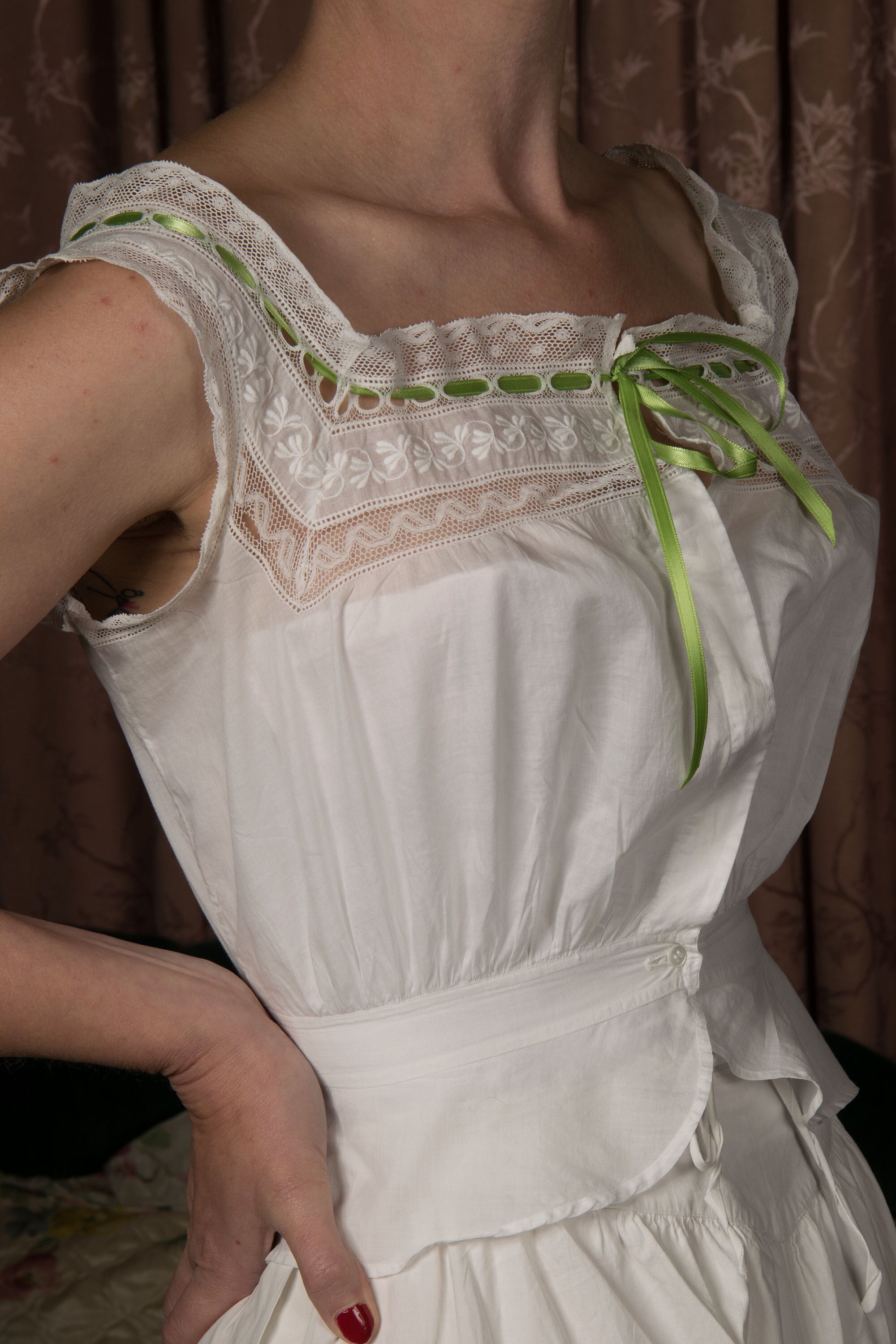 A charming vintage 1900s corset cover in white cotton batiste. This has the wide, high set arm openings of the first years of the decade, meant to be worn over an s-bend corset - but it's makes an awfully cute blouse, too. This features a squared neckline, with a new lime green ribbon woven through the open lace, then there's leafy embroidery, and then a row of net lace. This closes with hidden buttons up the front, and one more at the waist.