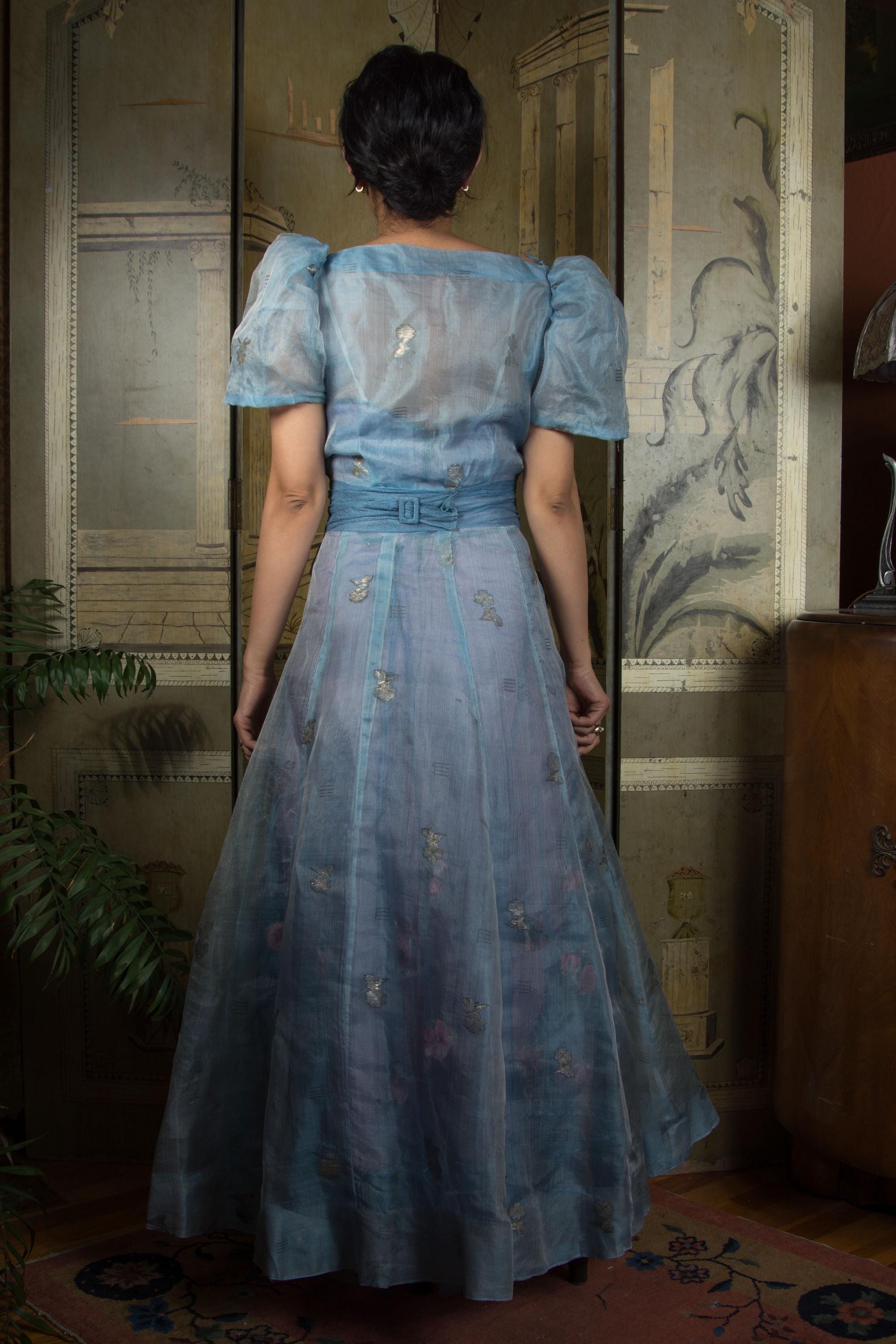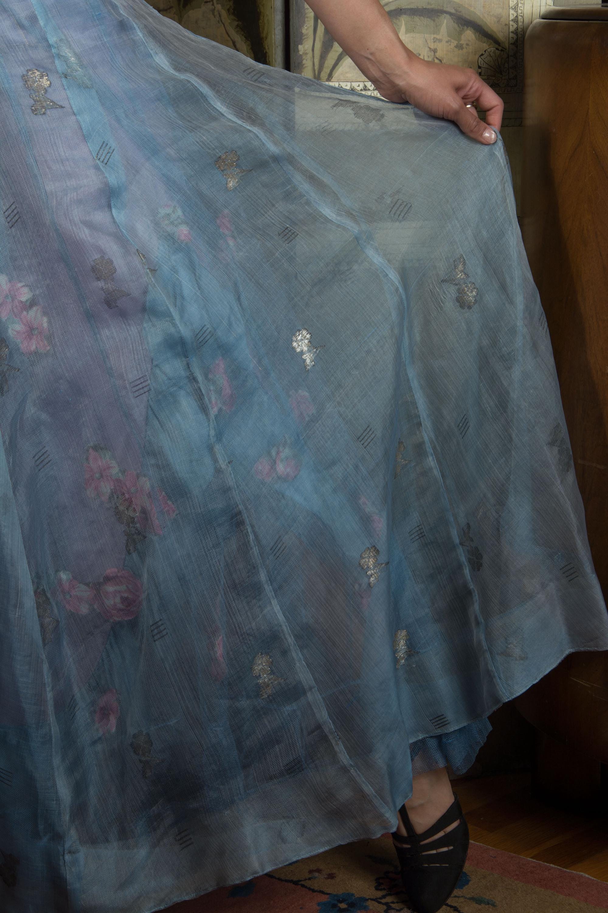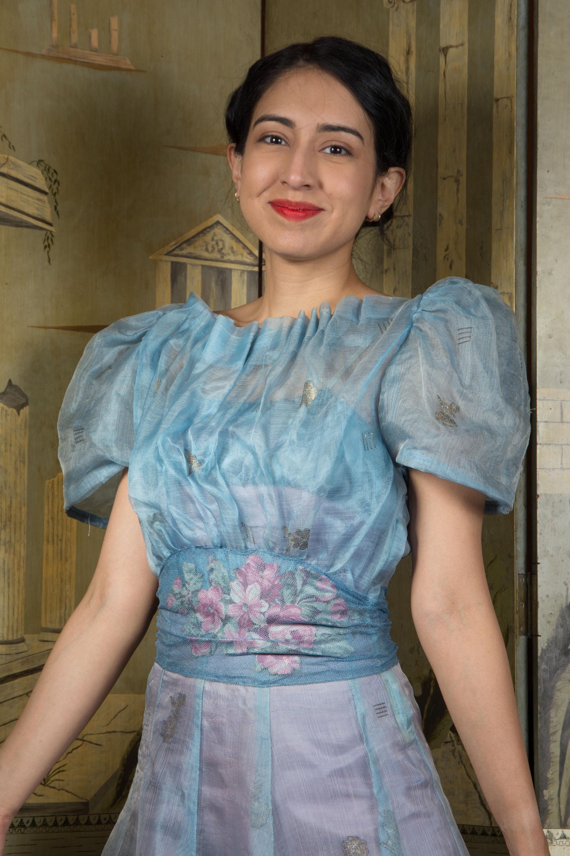 The dress itself is silk organza with a lamé brocade of flowers in silver and gold. It's incredibly fine, crisp and lustrous. The wide puffed sleeves are terno inspired, but the family I got this from had none of that heritage. The neckline is gathered like loose cartridge pleats. The fitted waist is covered in blue tulle that matches the underskirt, and the waist is filled with the same printed flowers. The skirt has fantastic shape created by two layers of tulle at the hem, working like horsehair. I'm told the original owner about 18 when she made this.