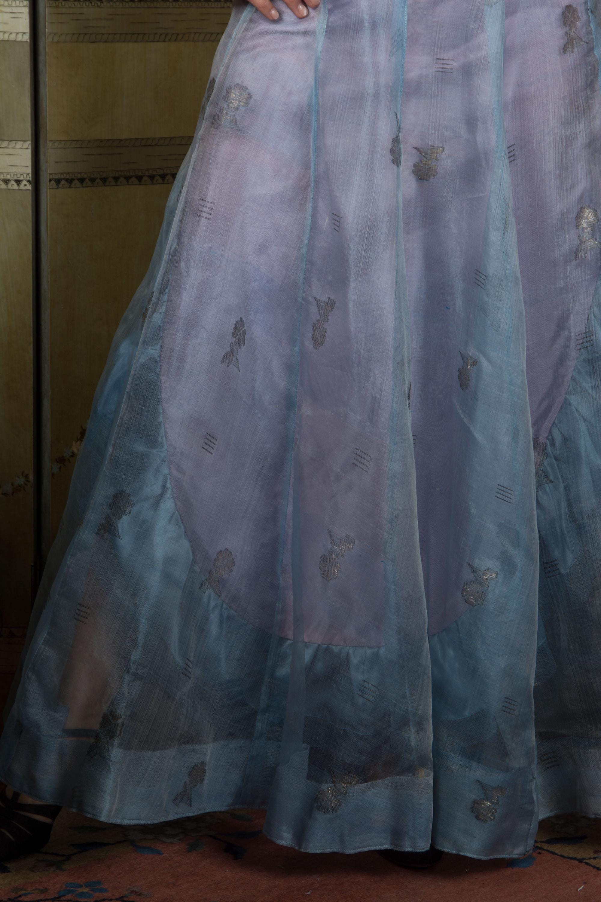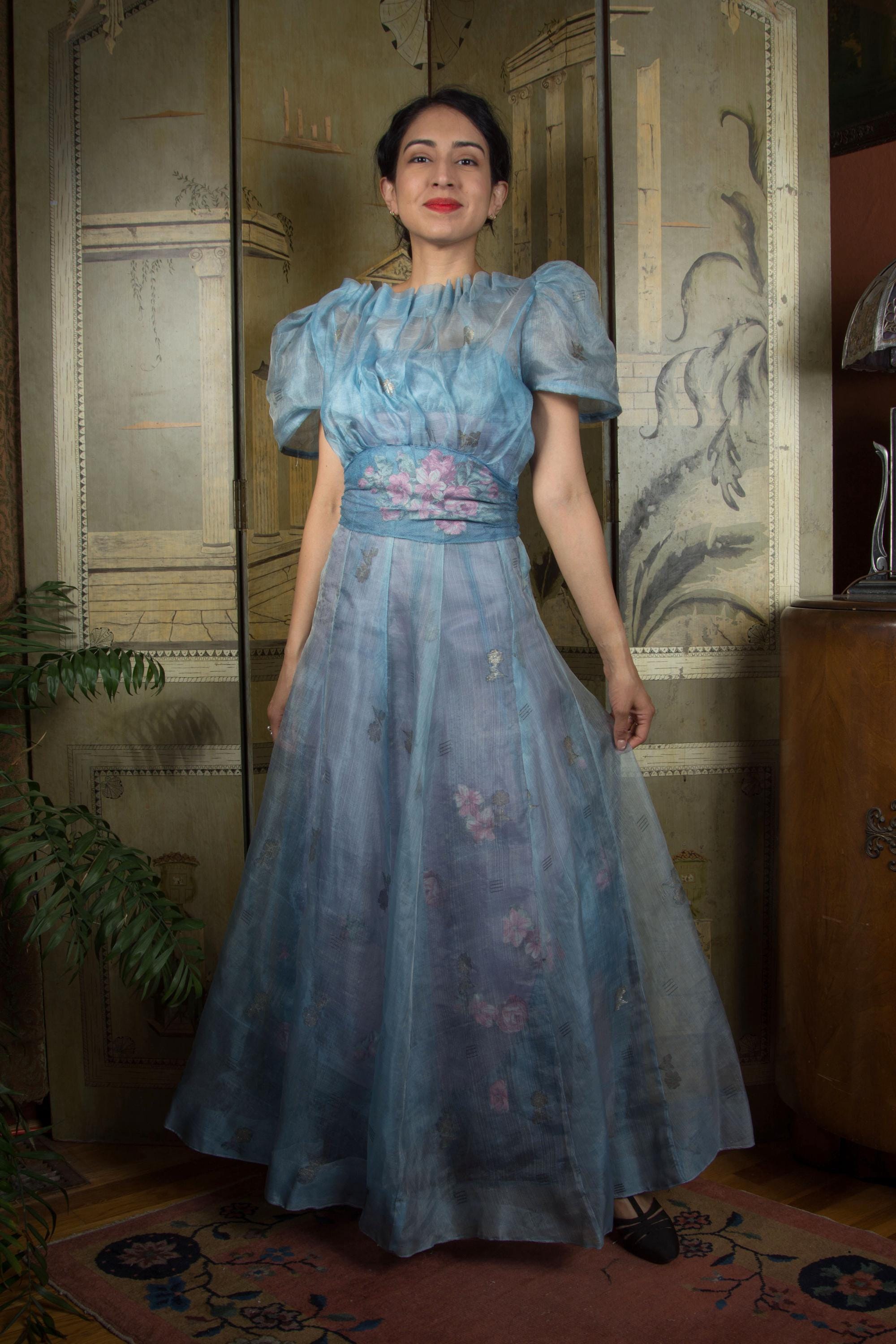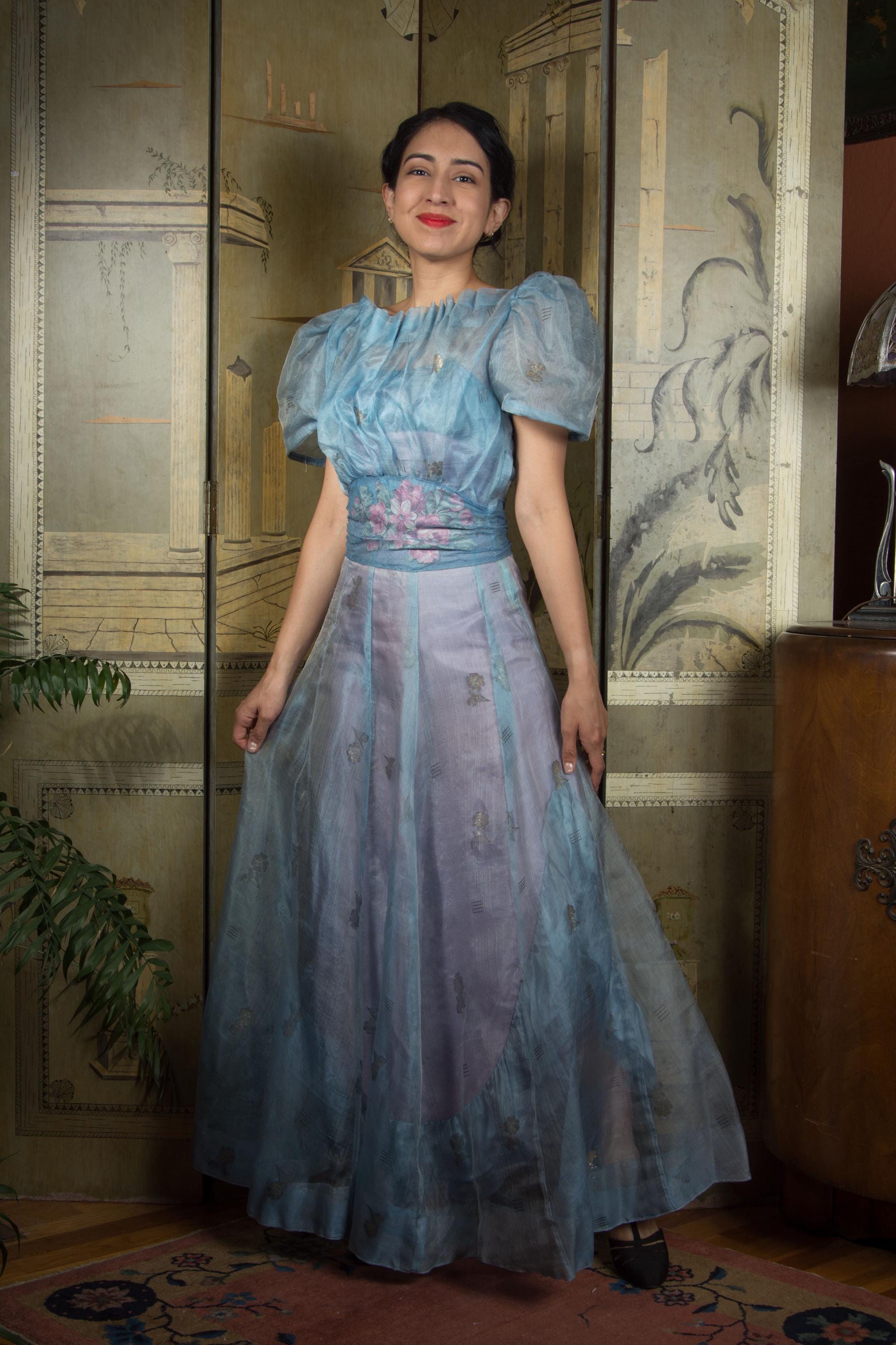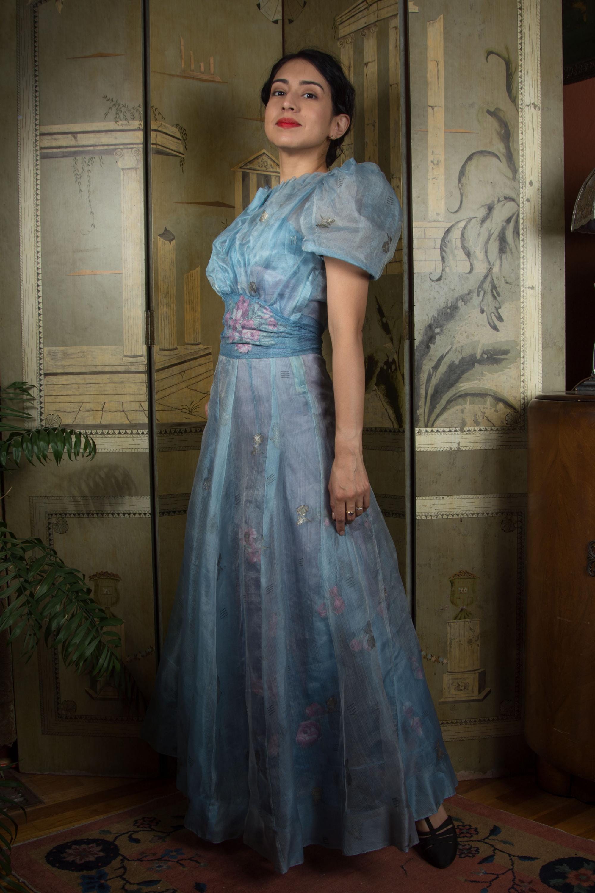 The dress itself is silk organza with a lamé brocade of flowers in silver and gold. It's incredibly fine, crisp and lustrous. The wide puffed sleeves are terno inspired, but the family I got this from had none of that heritage. The neckline is gathered like loose cartridge pleats. The fitted waist is covered in blue tulle that matches the underskirt, and the waist is filled with the same printed flowers. The skirt has fantastic shape created by two layers of tulle at the hem, working like horsehair. I'm told the original owner about 18 when she made this.