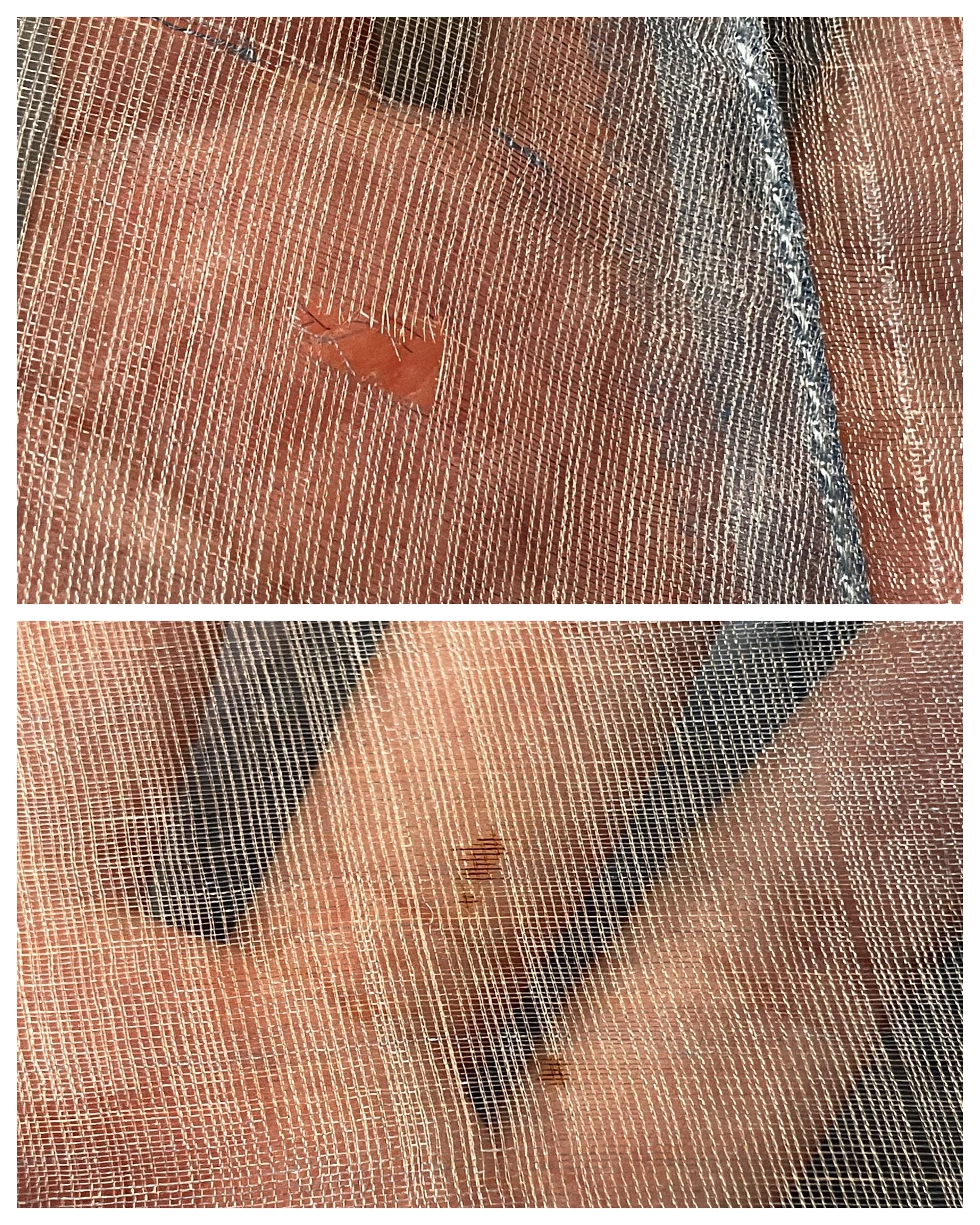 The piece is homemade, and it shows in some of the detail finishing (not on the slip, though, which is more complicated, so that might have been made by her mother.) The slip has discoloration to the purple sections and some foxing, as well as a few pin prick spots. There are some scattered holes in the net skirt, but this isn't seen when worn. The flowers are sewn on by hand and are curling a bit at the edges. On the dress, the leftmost seam at the back has a few inches of hand repair. At the center back, just the left of the center seam, there's a small hole - see photo. There's two small spots on the back right as well (shown.) I find no other issues to note.