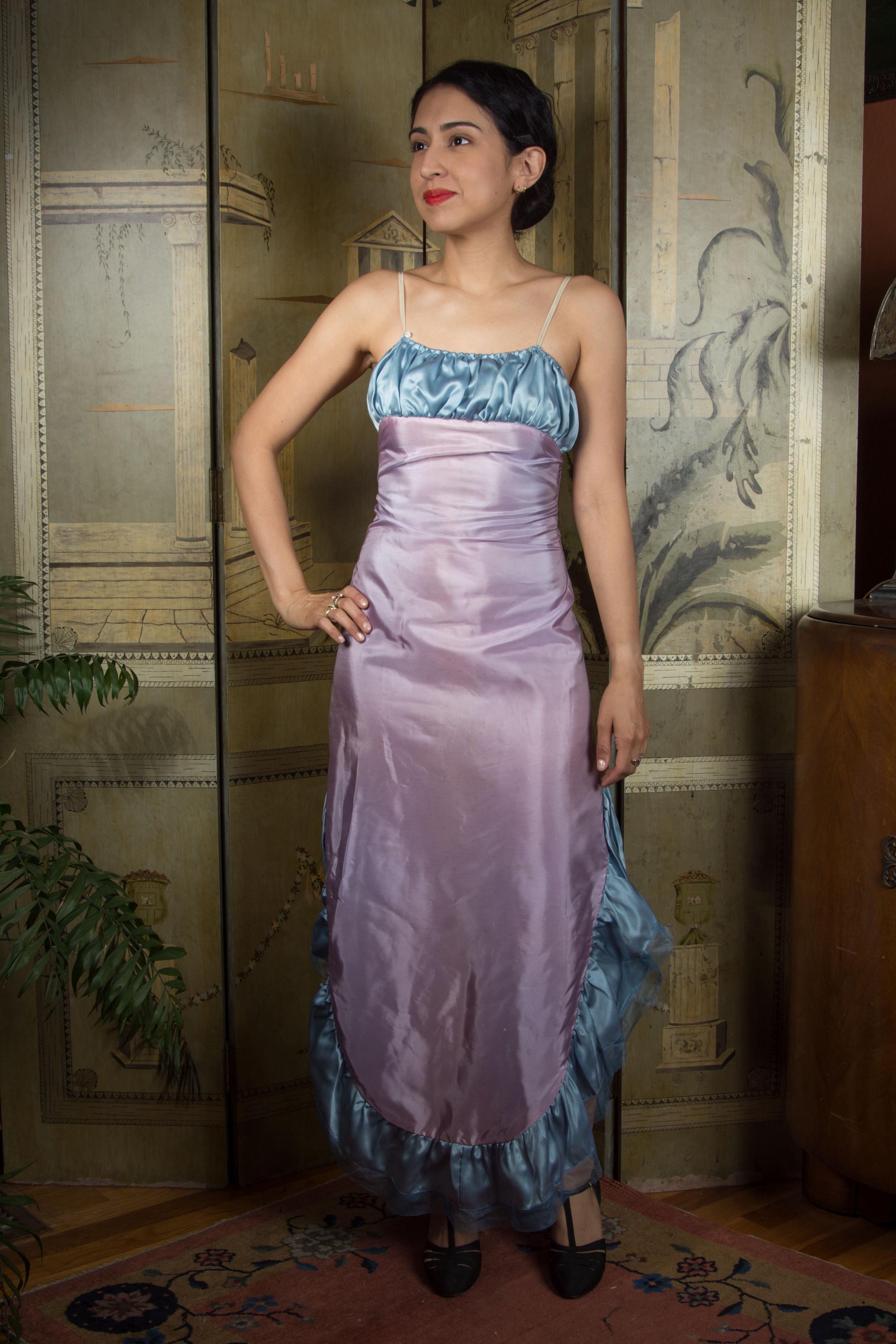 This is a really special, one of a kind homemade 1930s gown styled for a fairy if ever I've seen on. The dress is made up of three pieces - first, a slip, in purple acetate with a gathered blue silk satin bust, and a matching ruffled hem that curves to split to above the knee at each side. You can see this through the exterior dress, which is really fun. Then, there's an optional layering skirt. (Photo 1 is with the underskirt, photo 2 is without.) It's made of a fine cornflower blue net, and it has printed flowers cut from cotton appliqued with a hand stitch. This is definitely meant to go under the dress, and give it structure. And the dress!