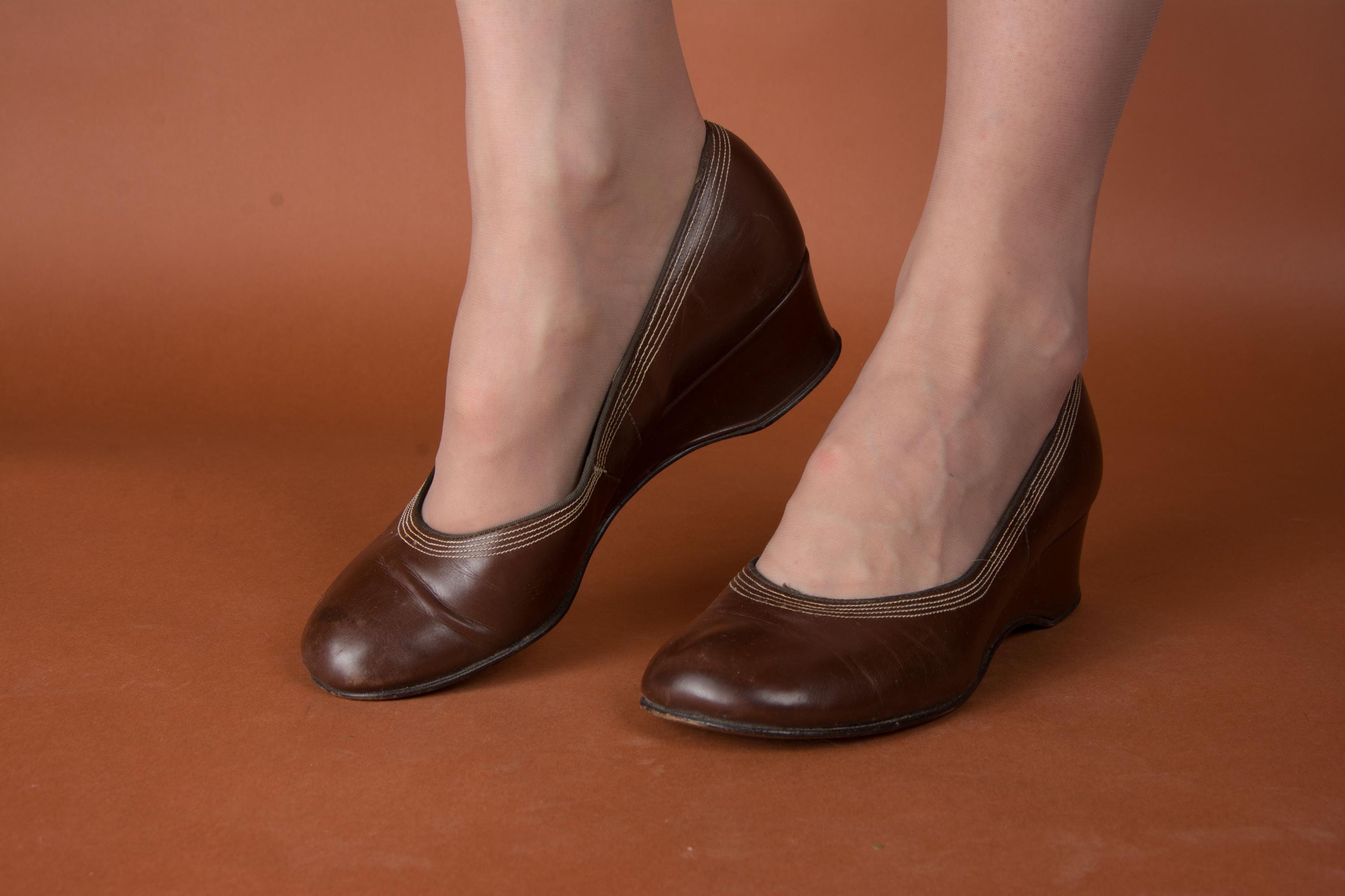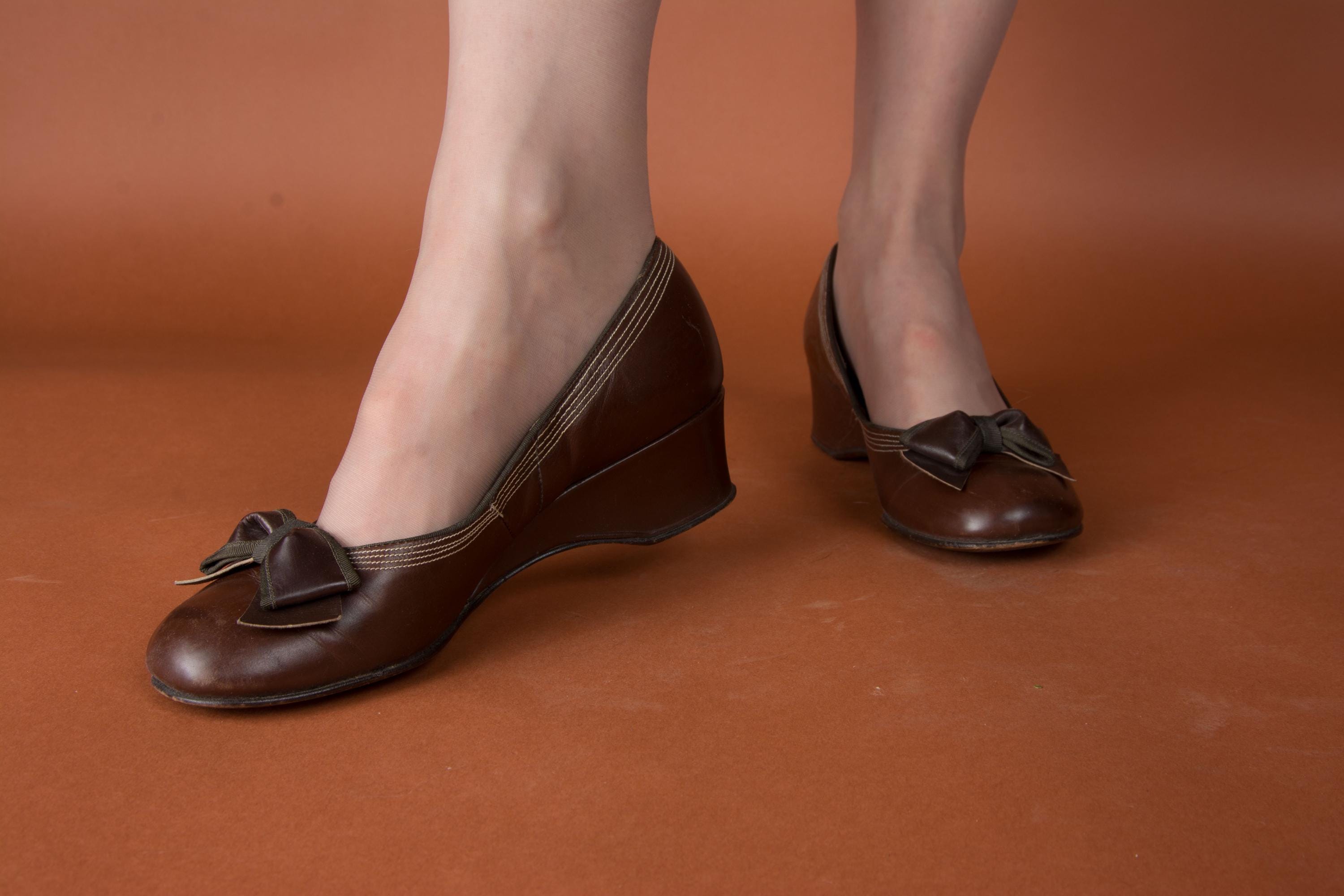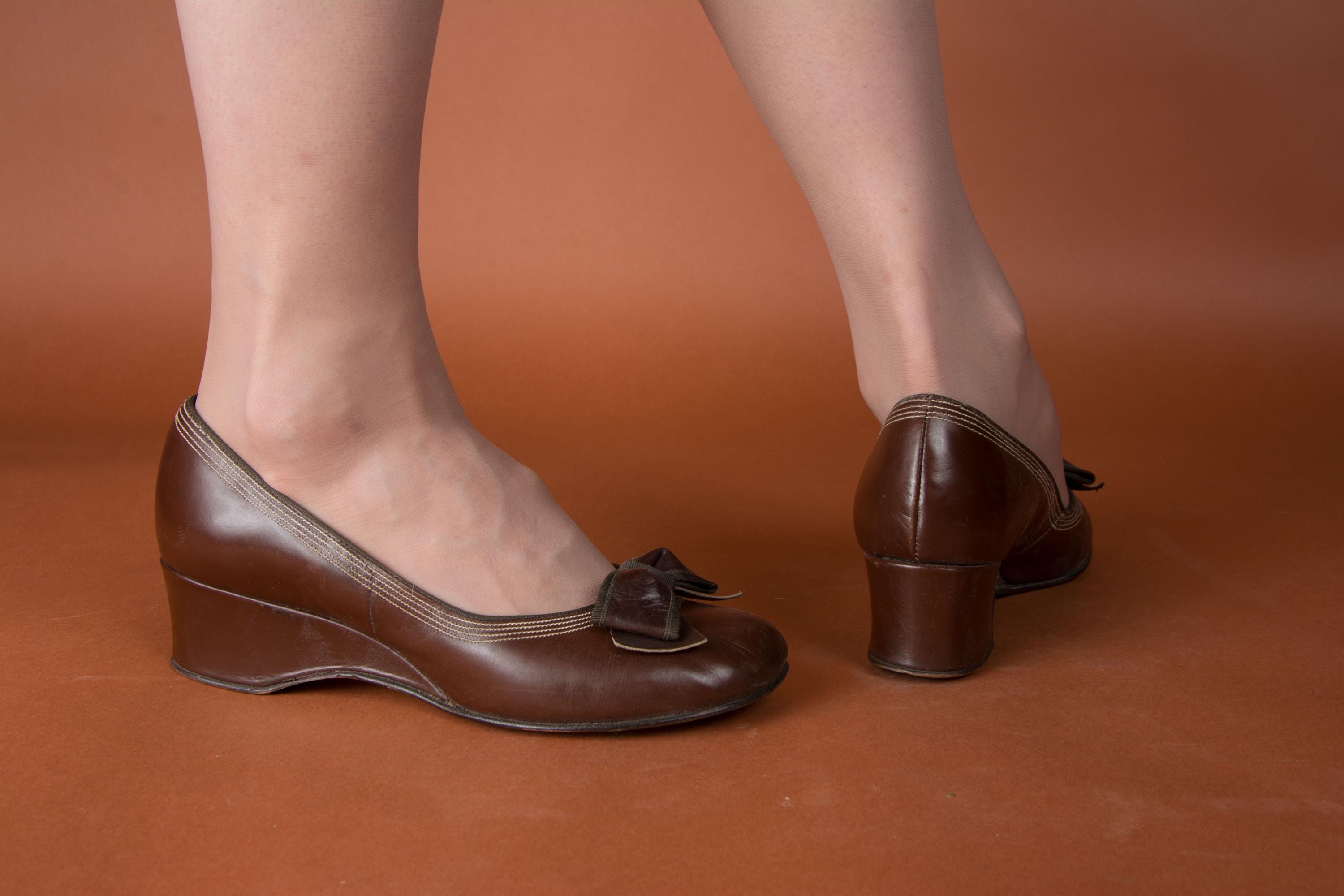 An incredibly modern looking pair of 1950s wedges in a chocolatey brown leather. These have a low wedge and very rounded toe. Four rows of white top stitching circle the foot, with a finishing edge of grosgrain. Somehow, the original bow shoe clips are still present, finished with the same grosgrain. These sporty flats are have leather lining through the heel and faille at the front, leather insoles and man made soles.