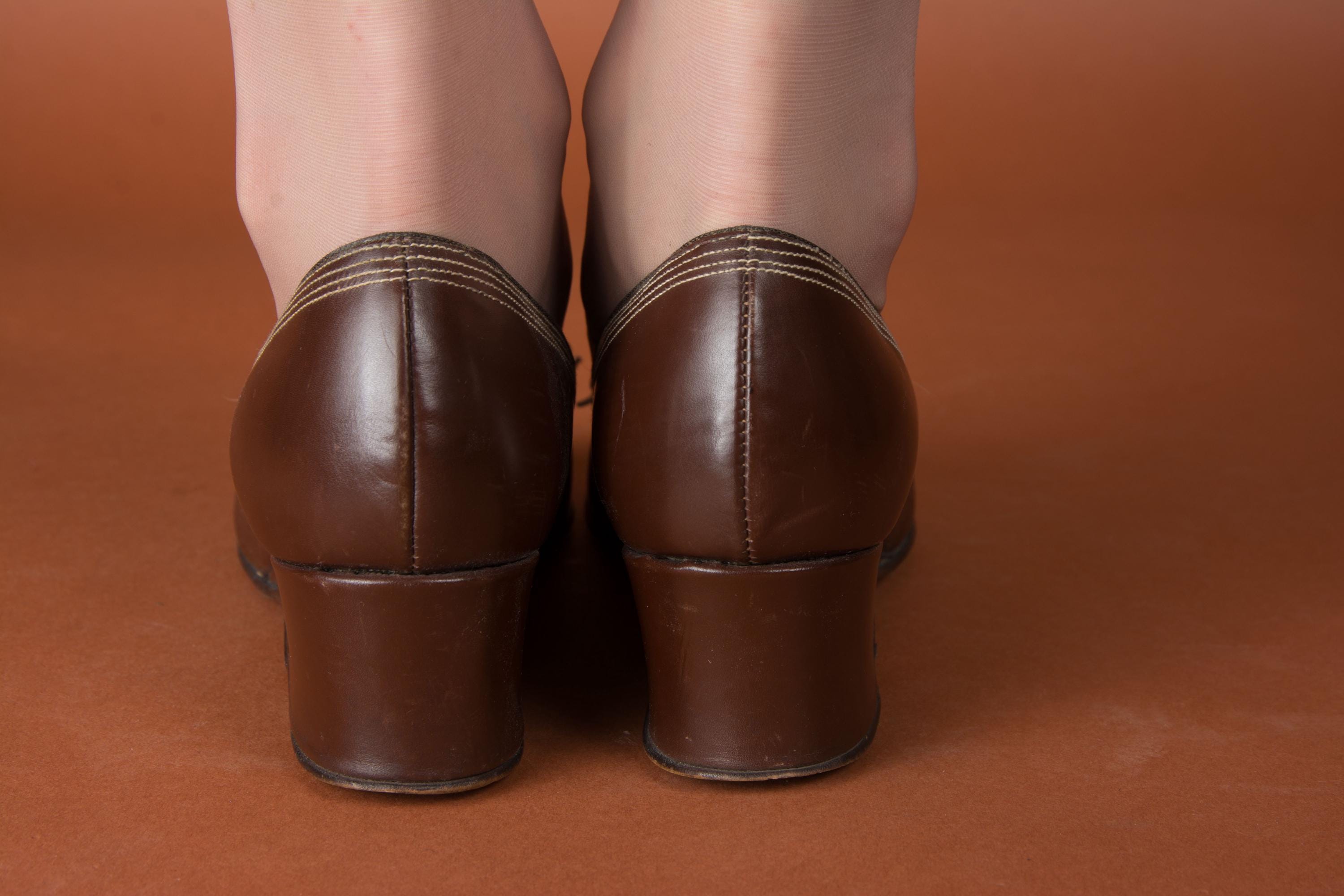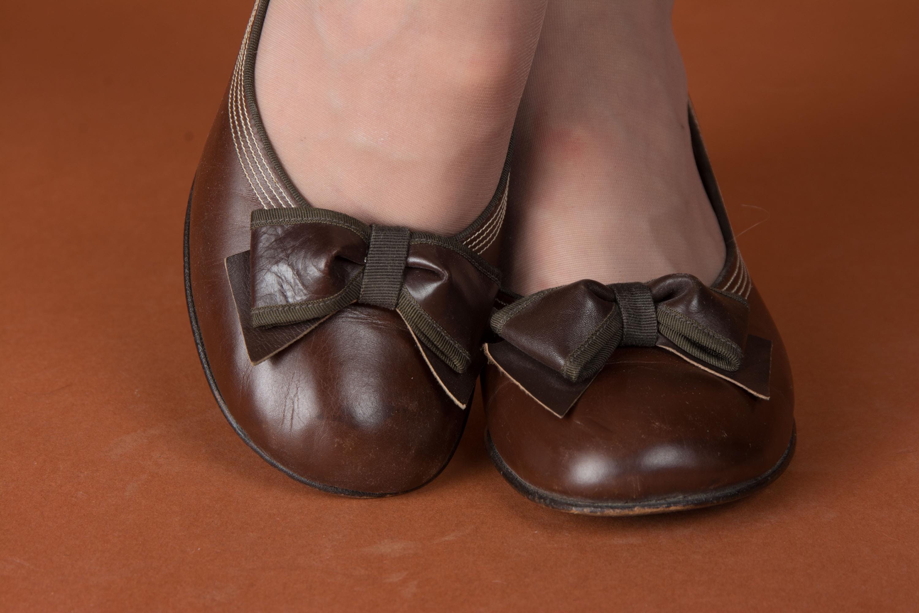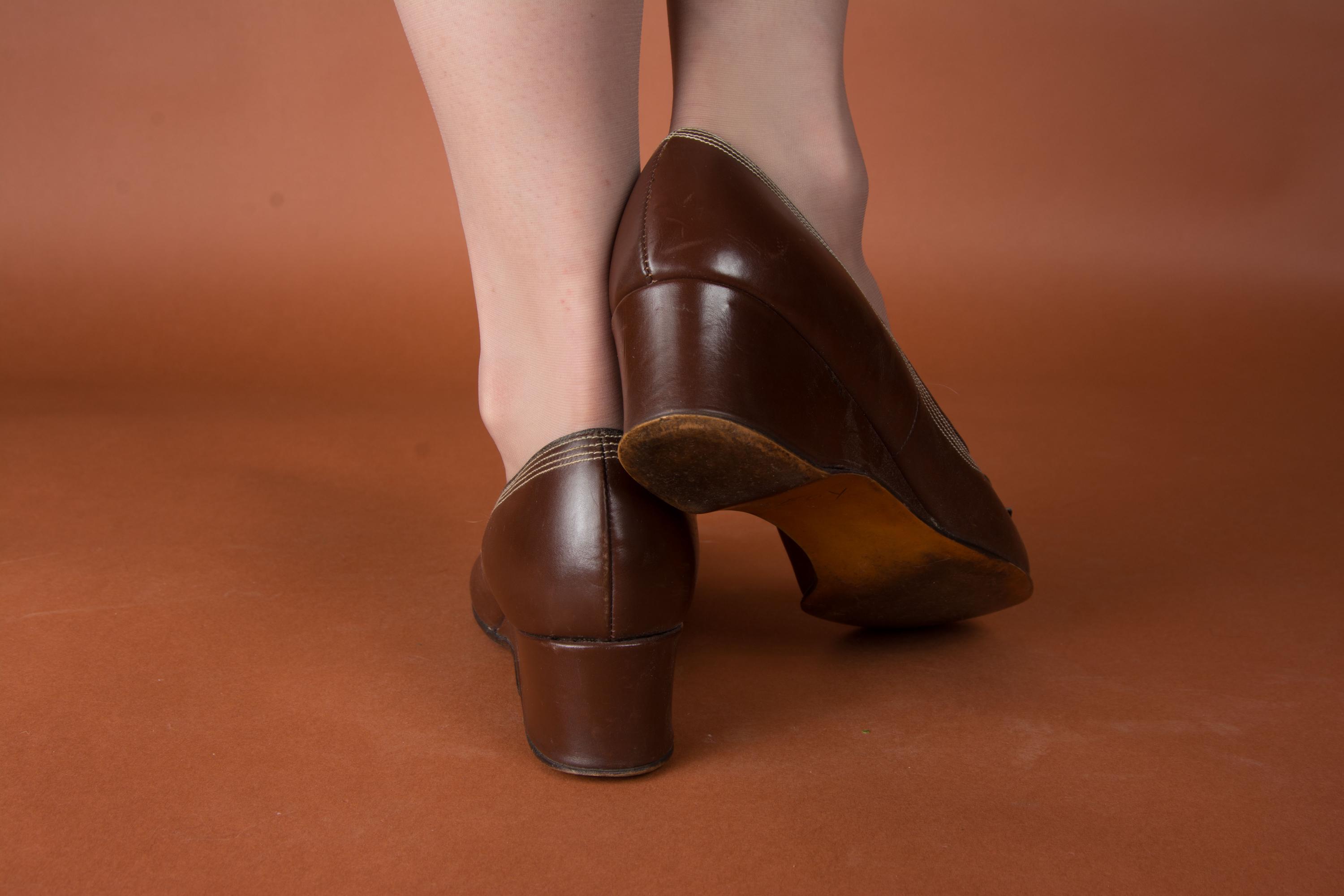 An incredibly modern looking pair of 1950s wedges in a chocolatey brown leather. These have a low wedge and very rounded toe. Four rows of white top stitching circle the foot, with a finishing edge of grosgrain. Somehow, the original bow shoe clips are still present, finished with the same grosgrain. These sporty flats are have leather lining through the heel and faille at the front, leather insoles and man made soles.