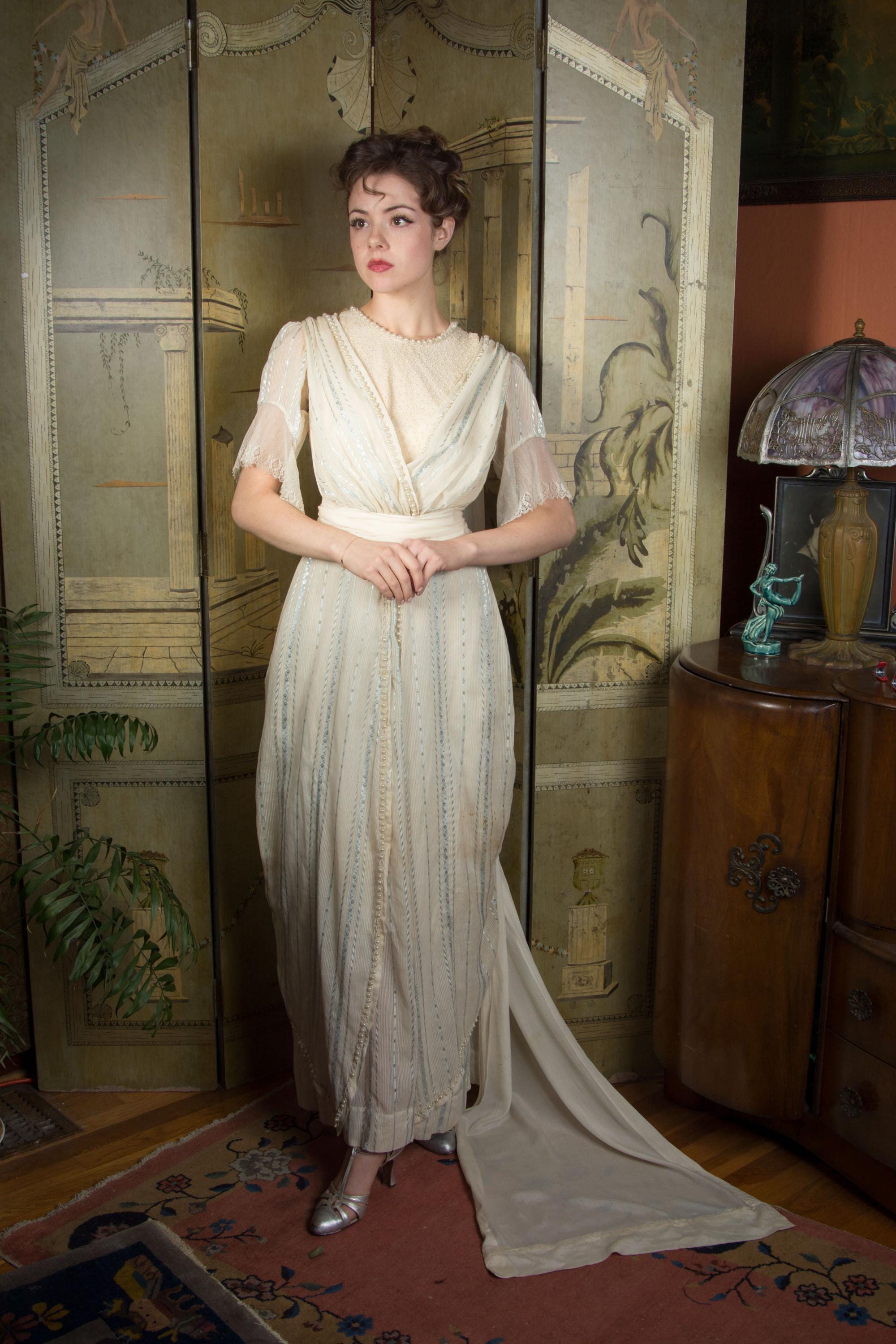 A spectacular and rare Edwardian wedding gown or tea dress, this beauty is draped romance. A 1911 style, the silhouette is quintessential to it's time - a high waisted bodice with elegant draping, and a layered skirt. We don't have the right underpinnings, so this isn't perfectly representative of the original intended silhouette. The primarily material is a lingerie cotton with woven stripes of lustrous silk brocade in pale blue throughout. The bodice has an internal lining of cotton and silk. Where it is exposed, it features a texturally unique lace - it has almost a boucle effect. The striped sleeves, finished in gossamer fine lace, are attached to this underlayer. The gathered surplice of striped material is worn over it, gathered in pinch pleats into the fitted waistband. At the back, a silk watteau train is suspended at the back of the shoulders. The skirt features a fairly full base layer with two petals that run from the center front, to the sides of the back where they meet the body with three deep pleats, that create the bud like shape you see here. The design elements are all ringed with hollow glass pearls, around the neck, across the shoulders, down the surplice layers, and all the way down the petals of the skirt, running down the center, then along the pointed hem. This closes with a complicated assortment of hooks and snaps - you'll need someone to help you do up the closures.