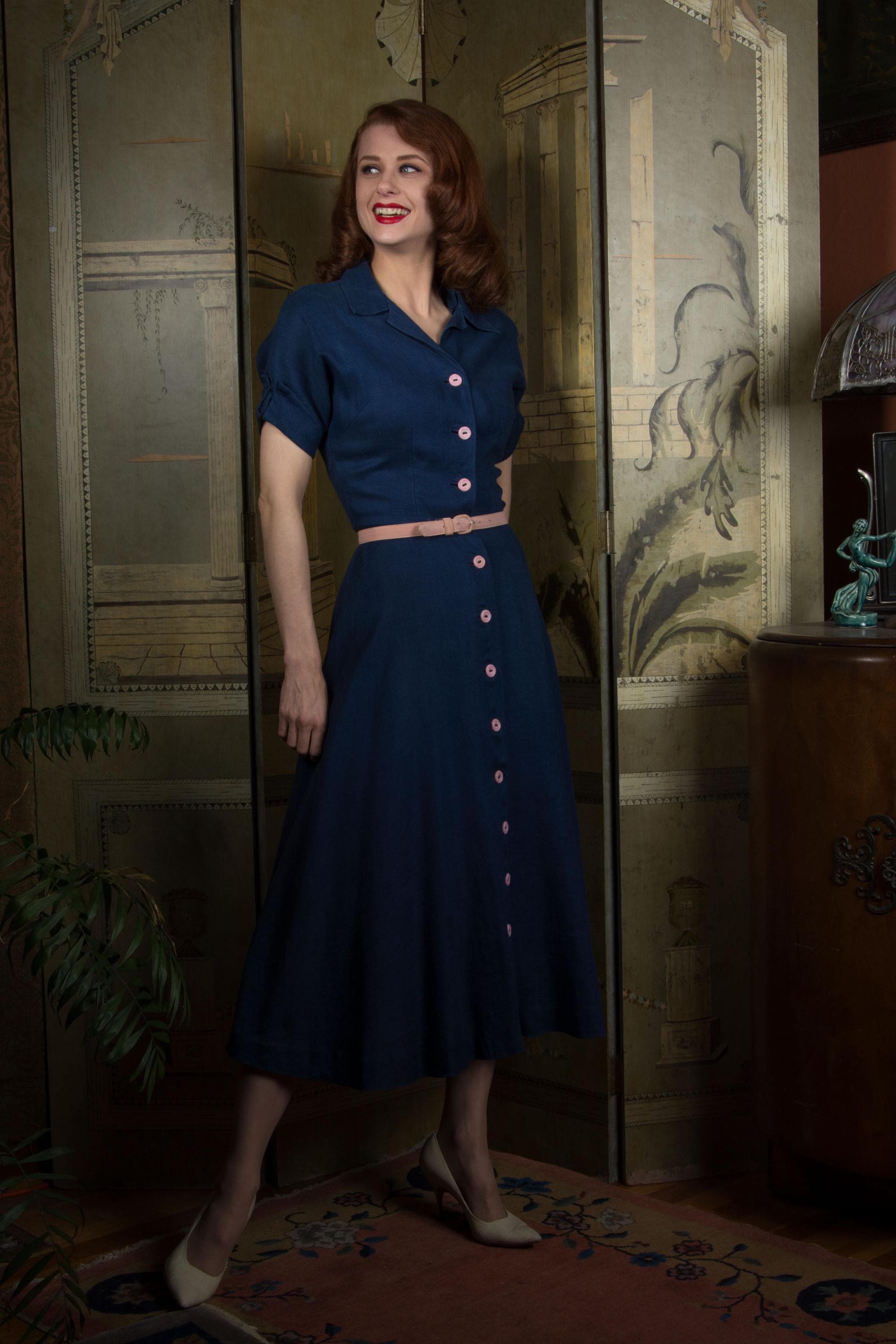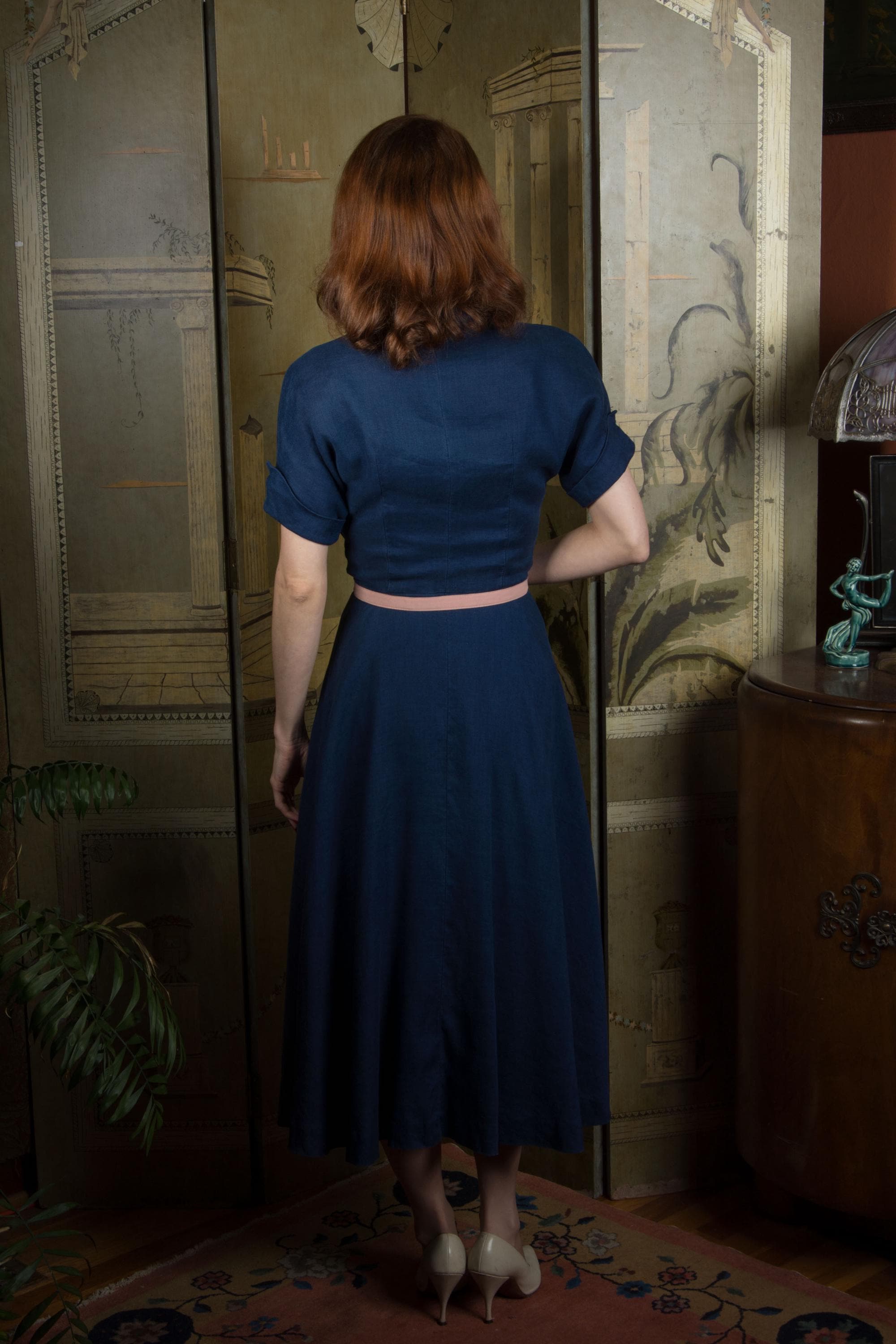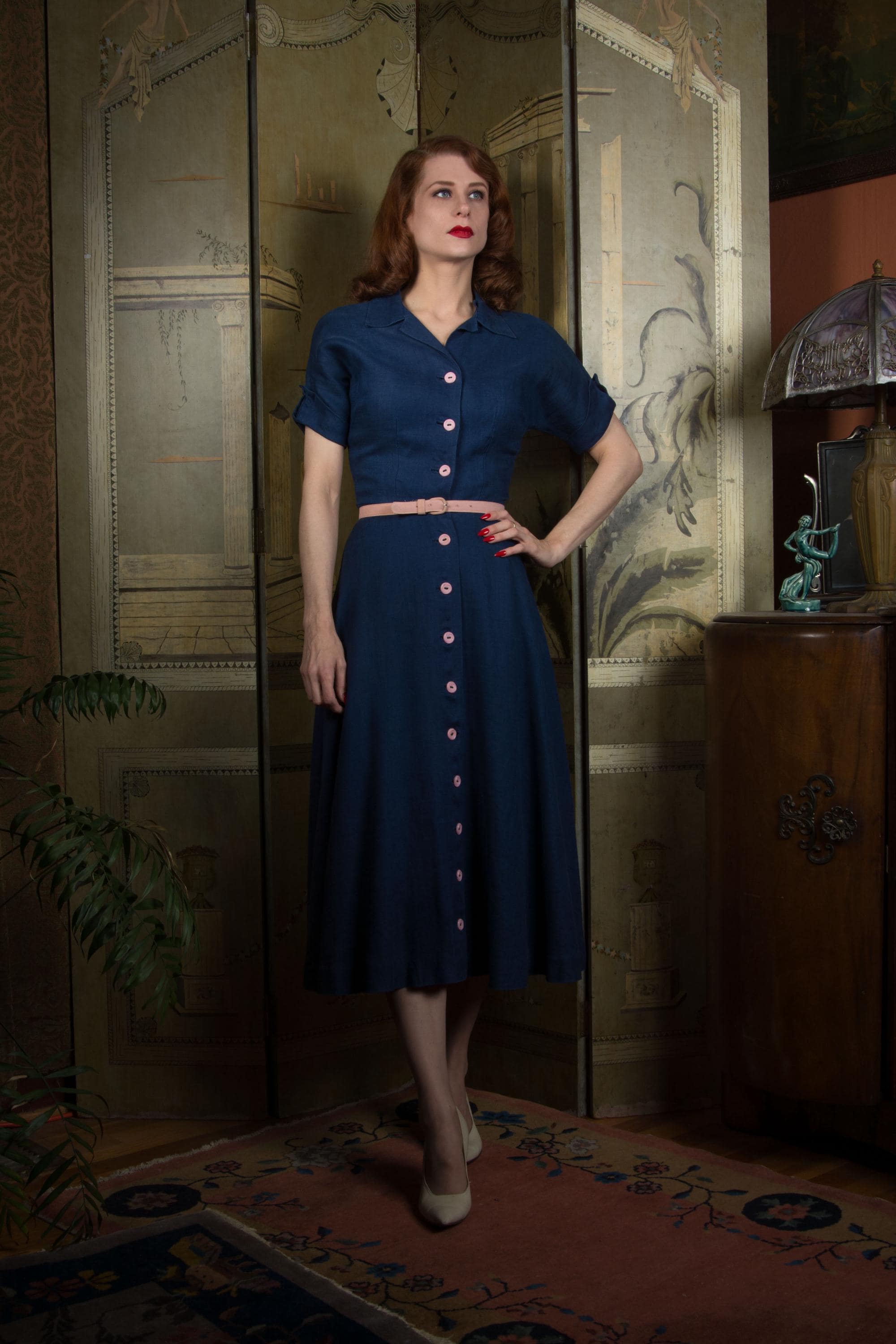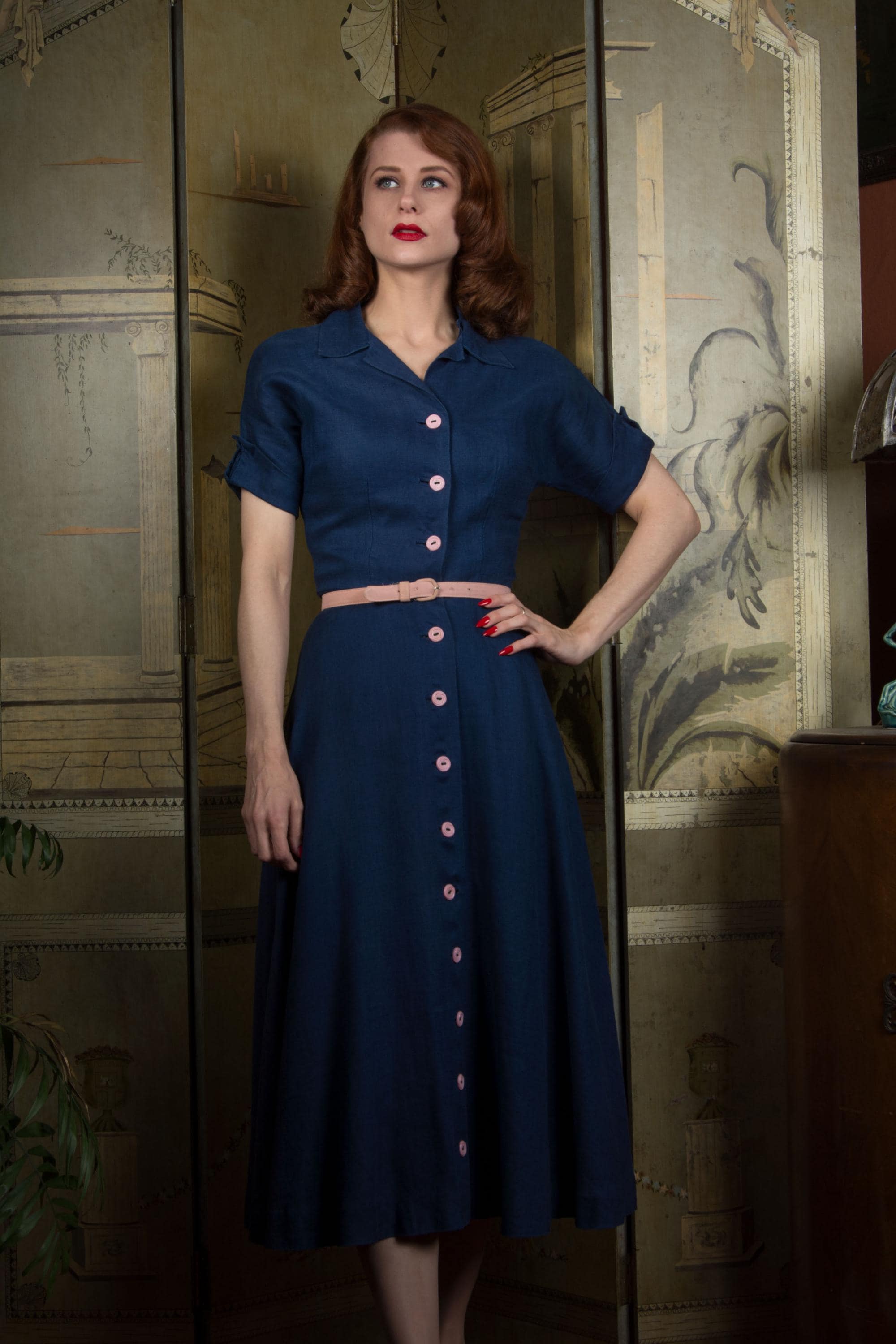 Natural fibers are all the rage right now for a reason - and this linen dress is really a perfectly styled 1950s casual day dress, with a cut so timeless it would wear well in any year. This features a smart collar, cuffed short sleeves and a button front. The skirt panels are bias cut - too slim for a crinoline, but they fall perfectly draped. This closes up the front with pink buttons sewn on with yarn.