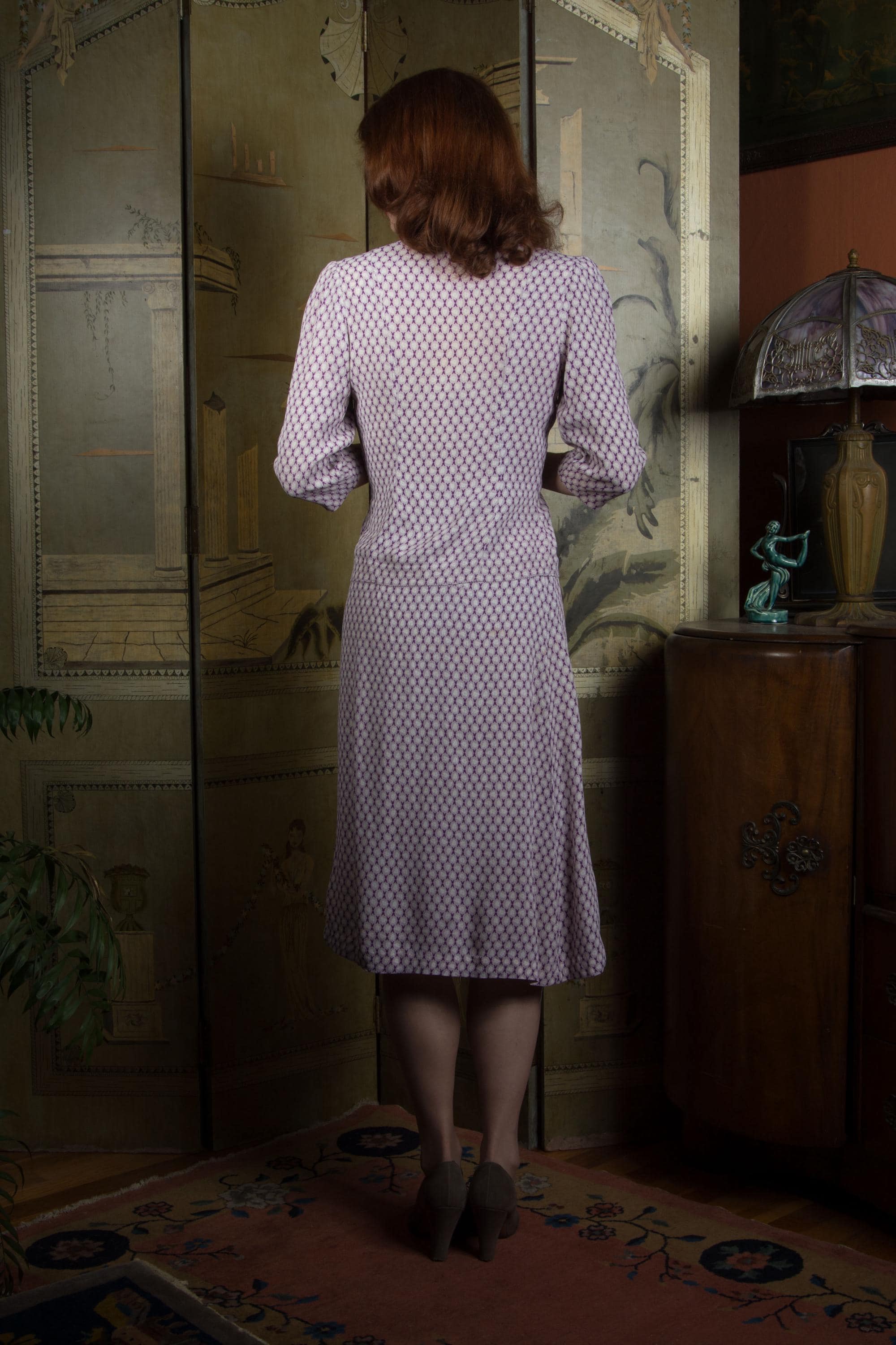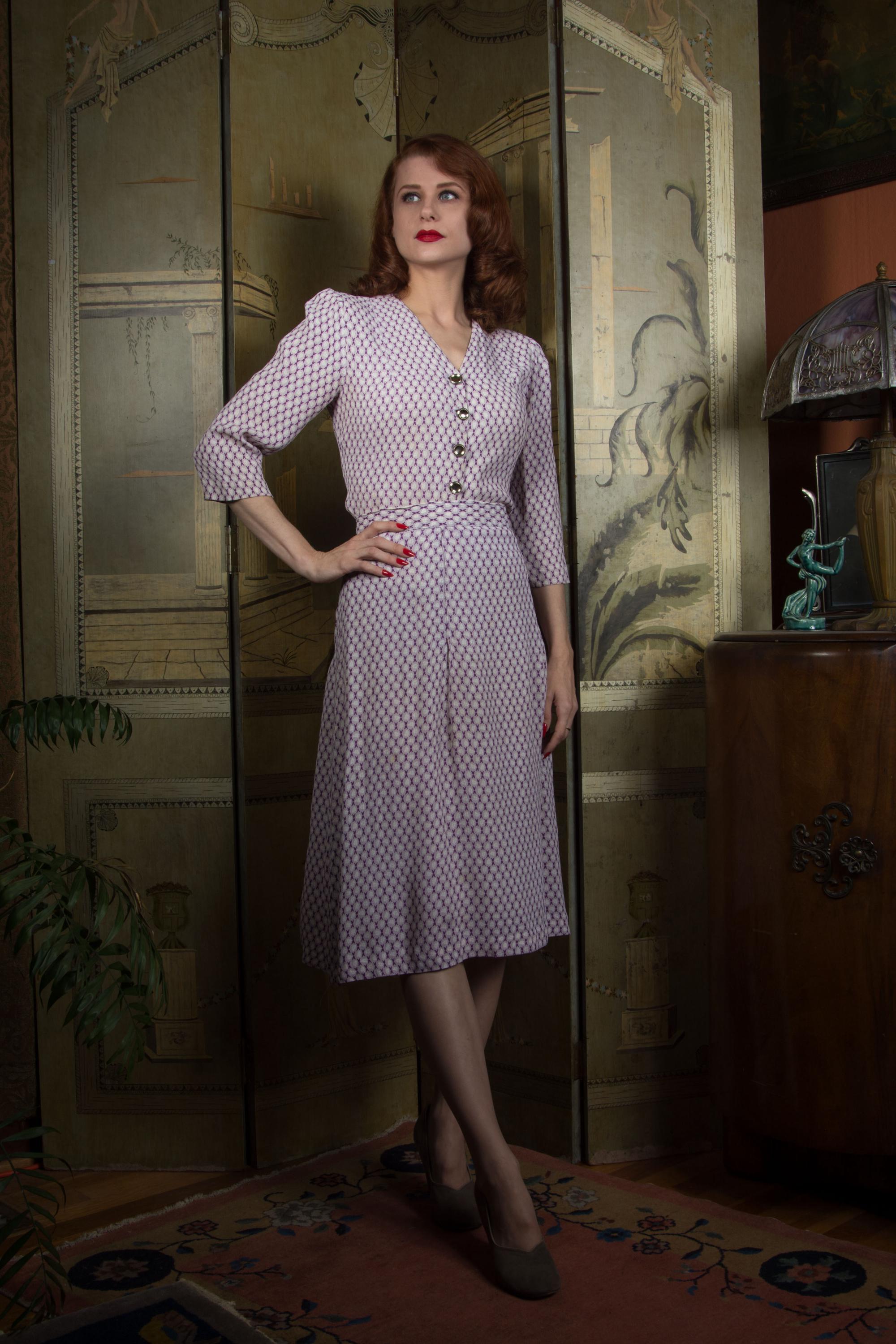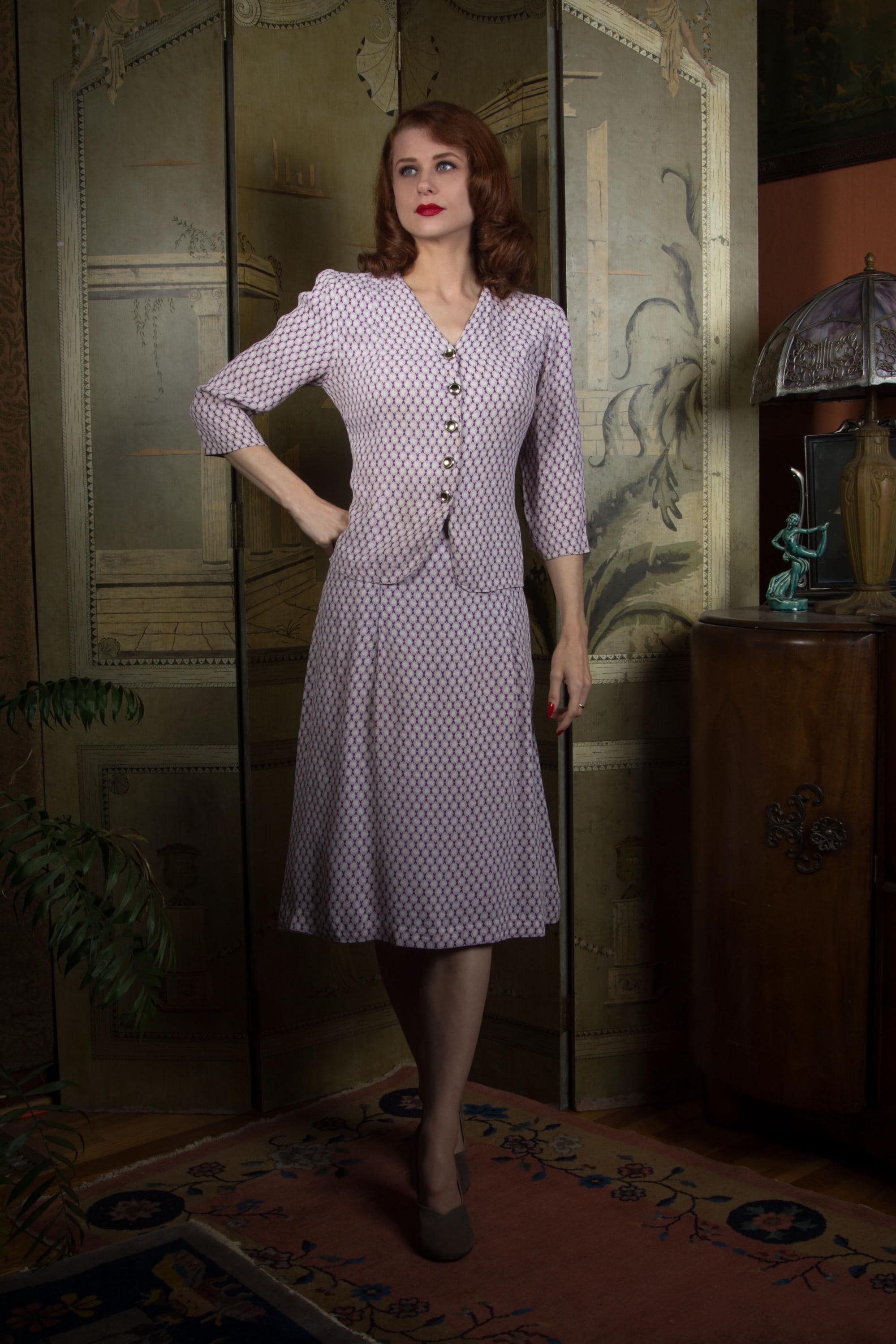 Vintage early 1940s suit can be worn together as a "dress" or worn separately to great effect. A versatile fashion in rayon crepe, the repeating print is a wallpaper of lavender and white grape motifs with darker purple accents. The shoulders are lightly padded, and the sleeves are three quarter length, ending just past the elbow. The a-line swingy and free. It closes with snaps along the left side, while the top closes with newer silver tone buttons. The top is lightweight enough you can wear it tucked in as a blouse or out as a jacket, either one.