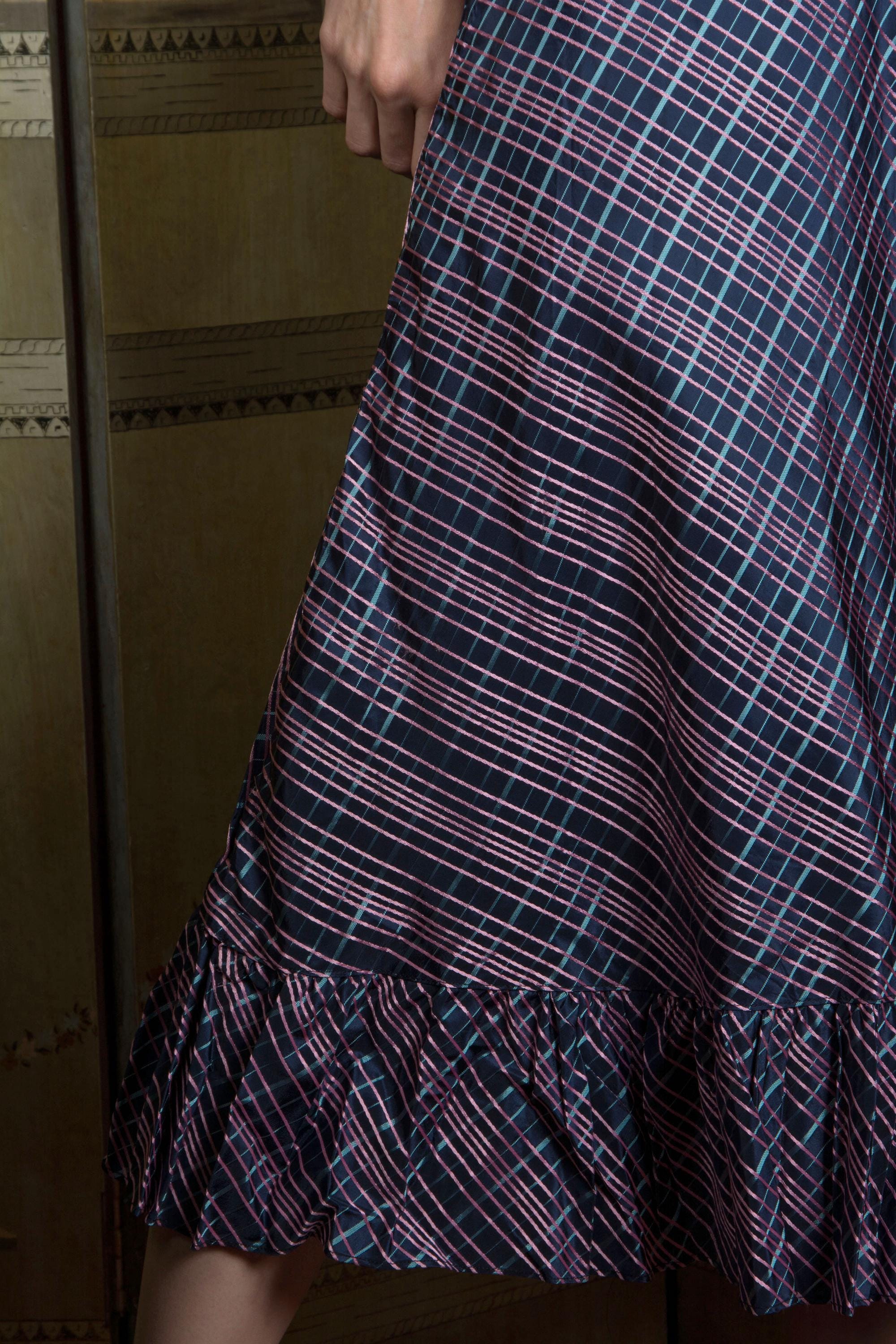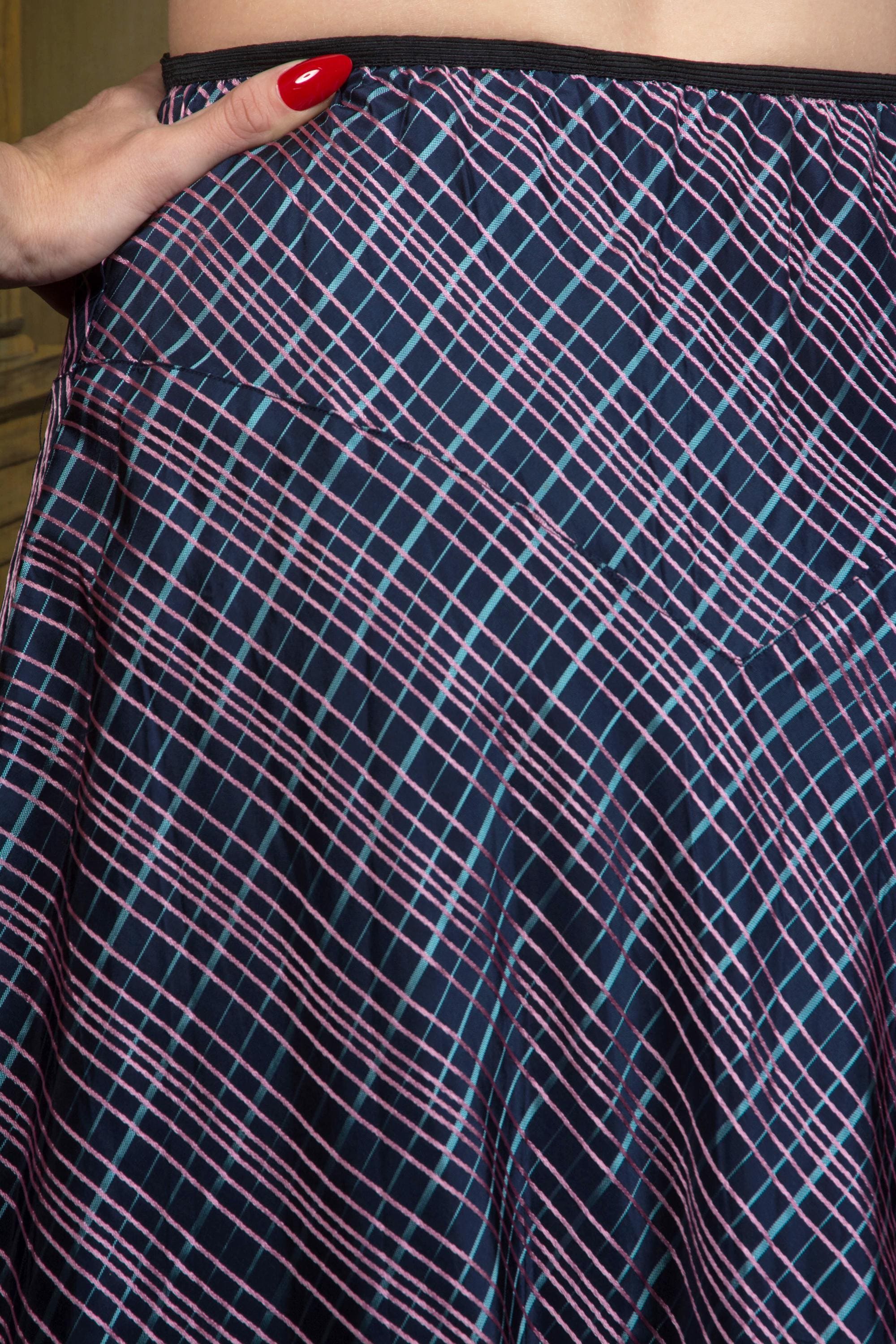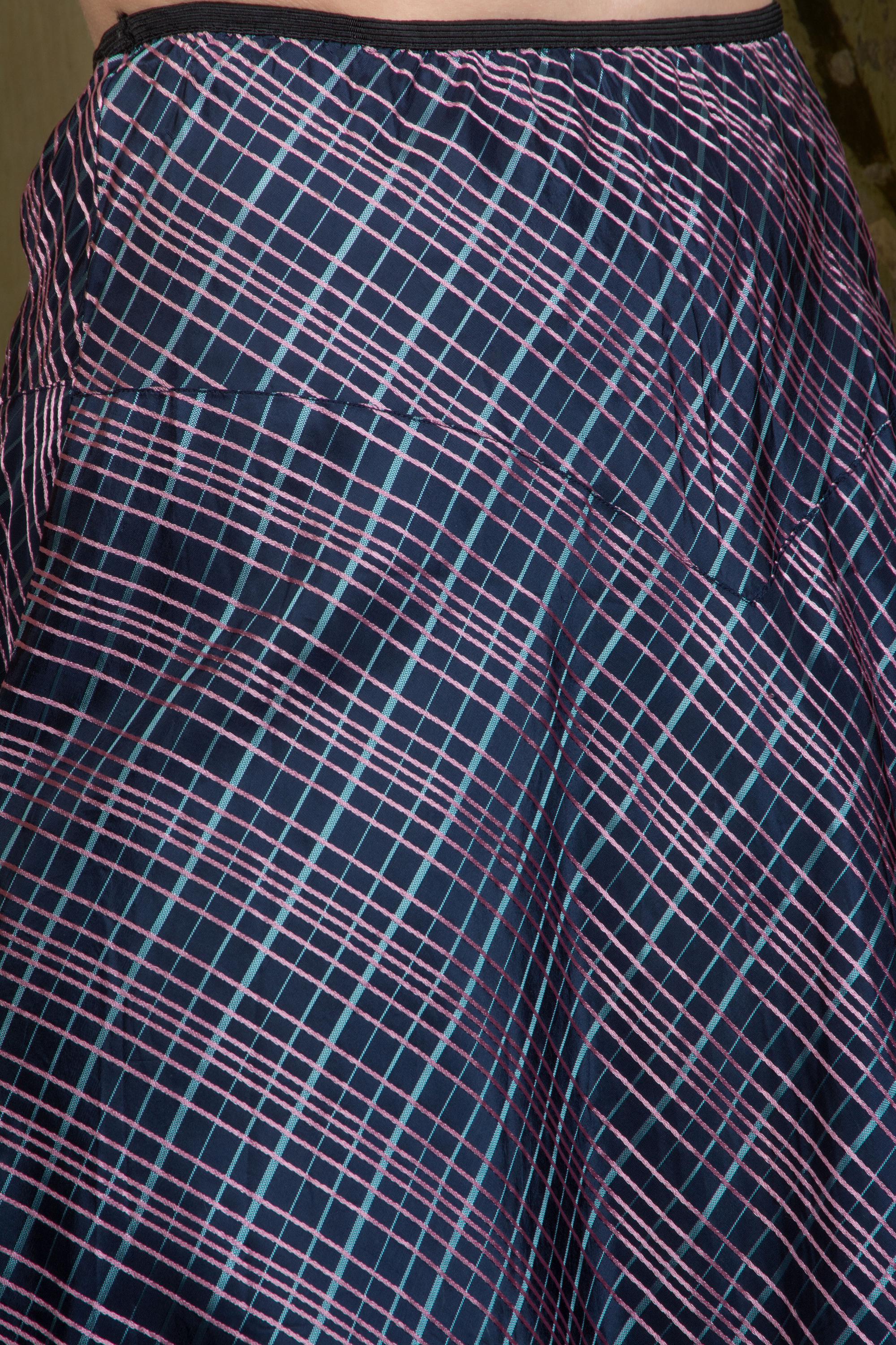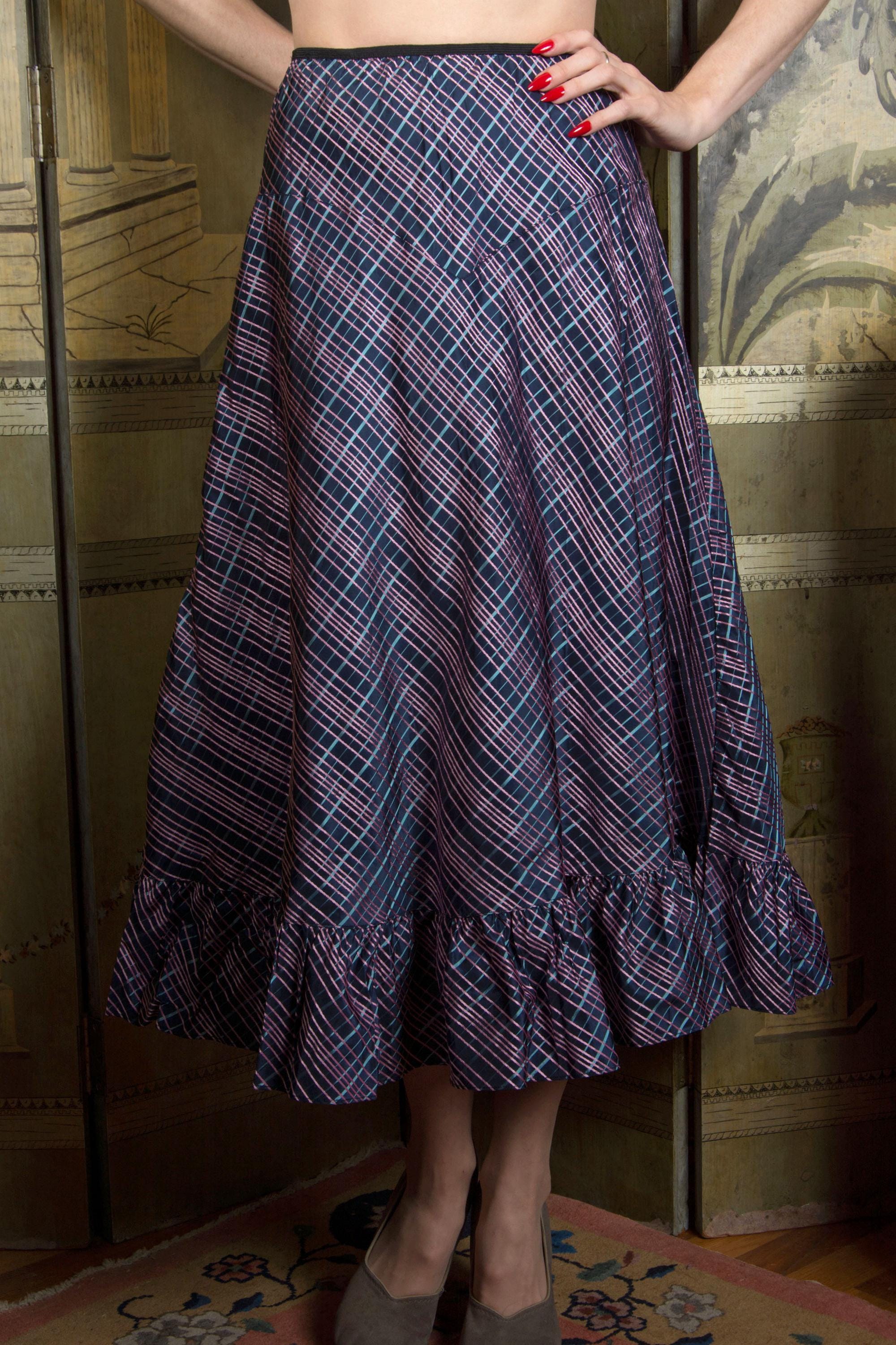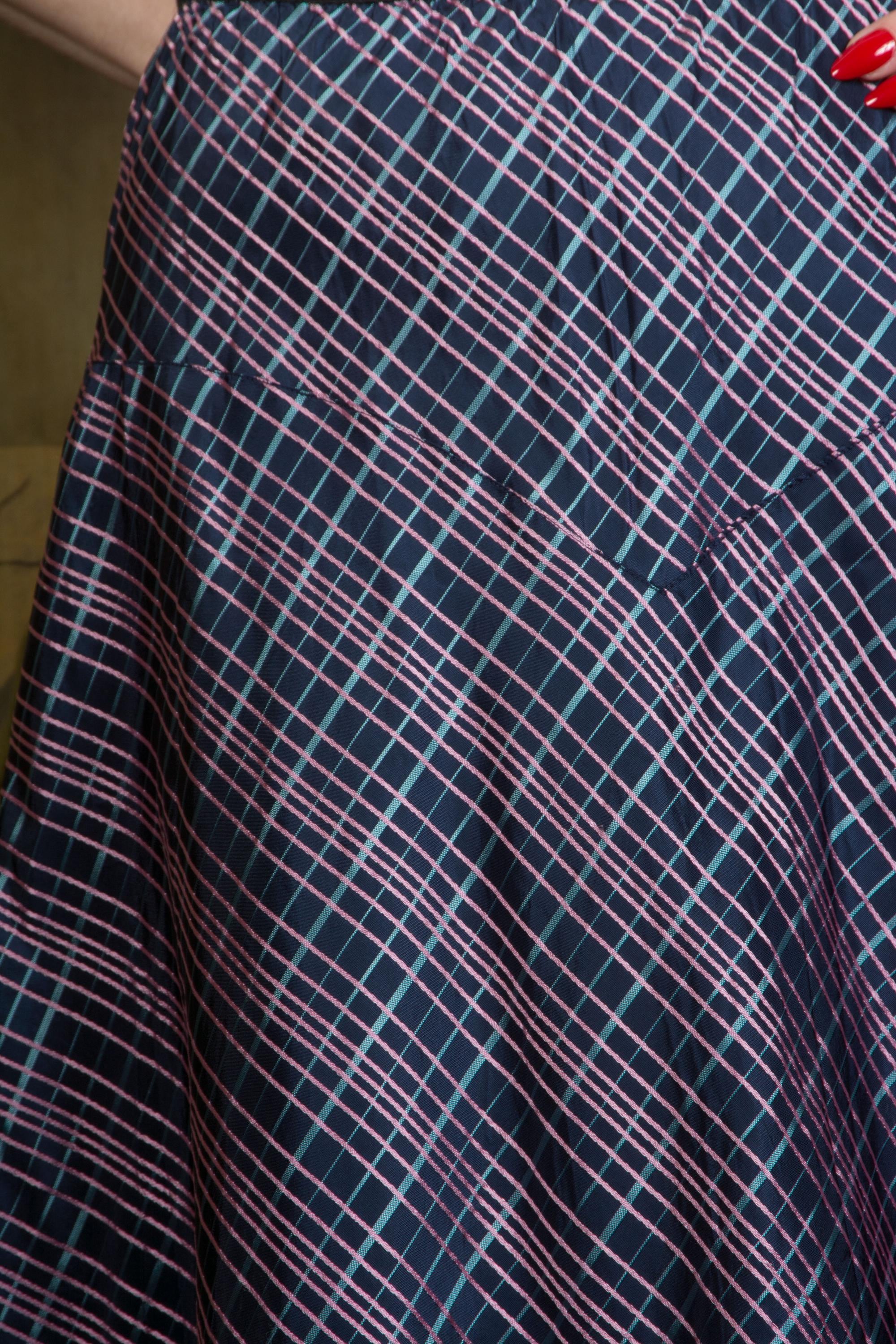 Here's a gorgeous little separate! Made as a slip once upon a time, but more than pretty enough to wear as skirt. This has an elastic banded waist, over a basque gusset at both front and back. The bias cut rayon taffeta is cut full, and is absolutely stunning in a pink overplaid, with stripes of light blue behind, and the deep navy ground. There's a wide ruffle all around the hem. It's perfect for offering just a bit of structure to a look, or add a belt and wear it solo.