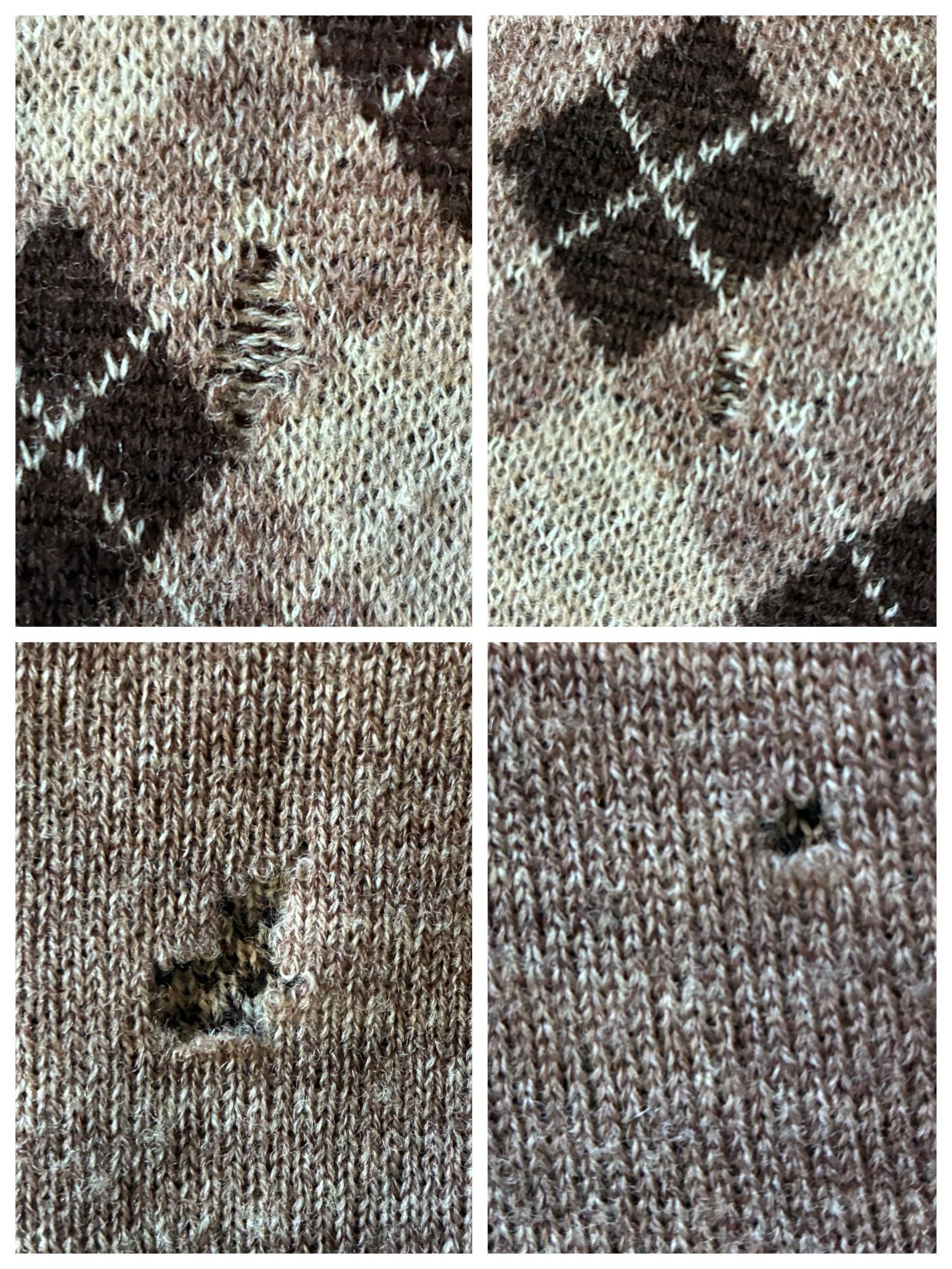 This vest is clean and ready to wear. The argyle side has two chews that created laddering on the far right side of the front, and some other scattered nips - the fact that it has a second layer to make it reversible makes these hard to see. The reverse side has one larger moth chew on the back, and a few smaller. See last collage for details.