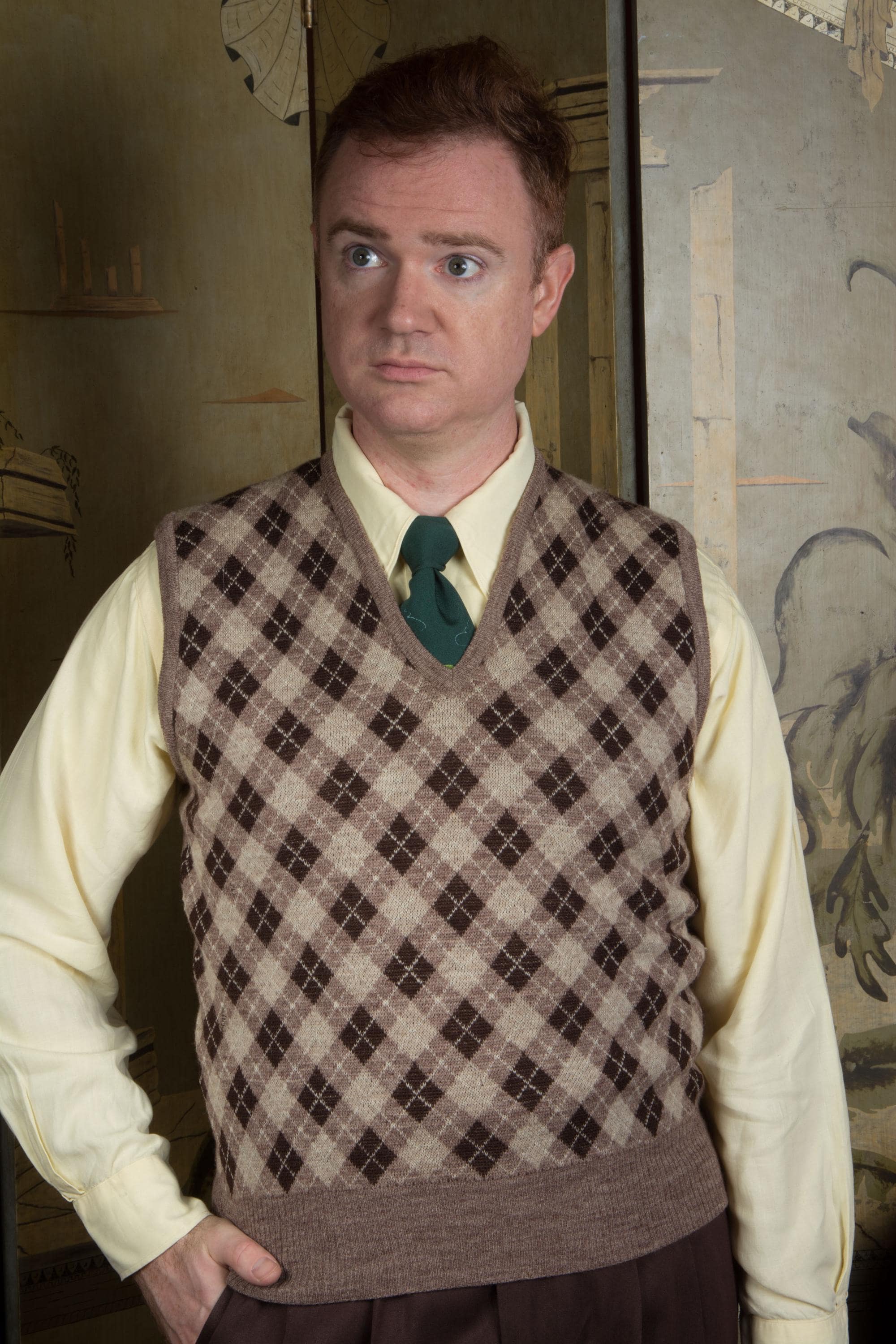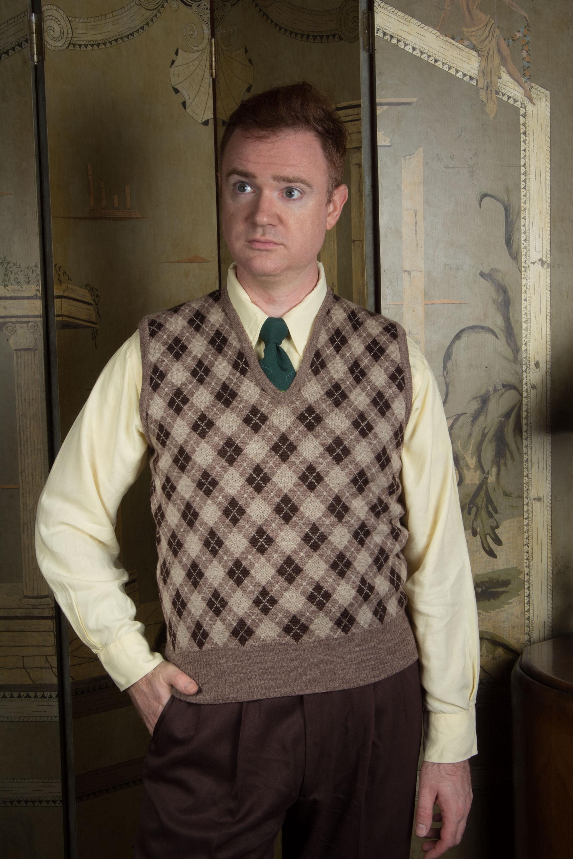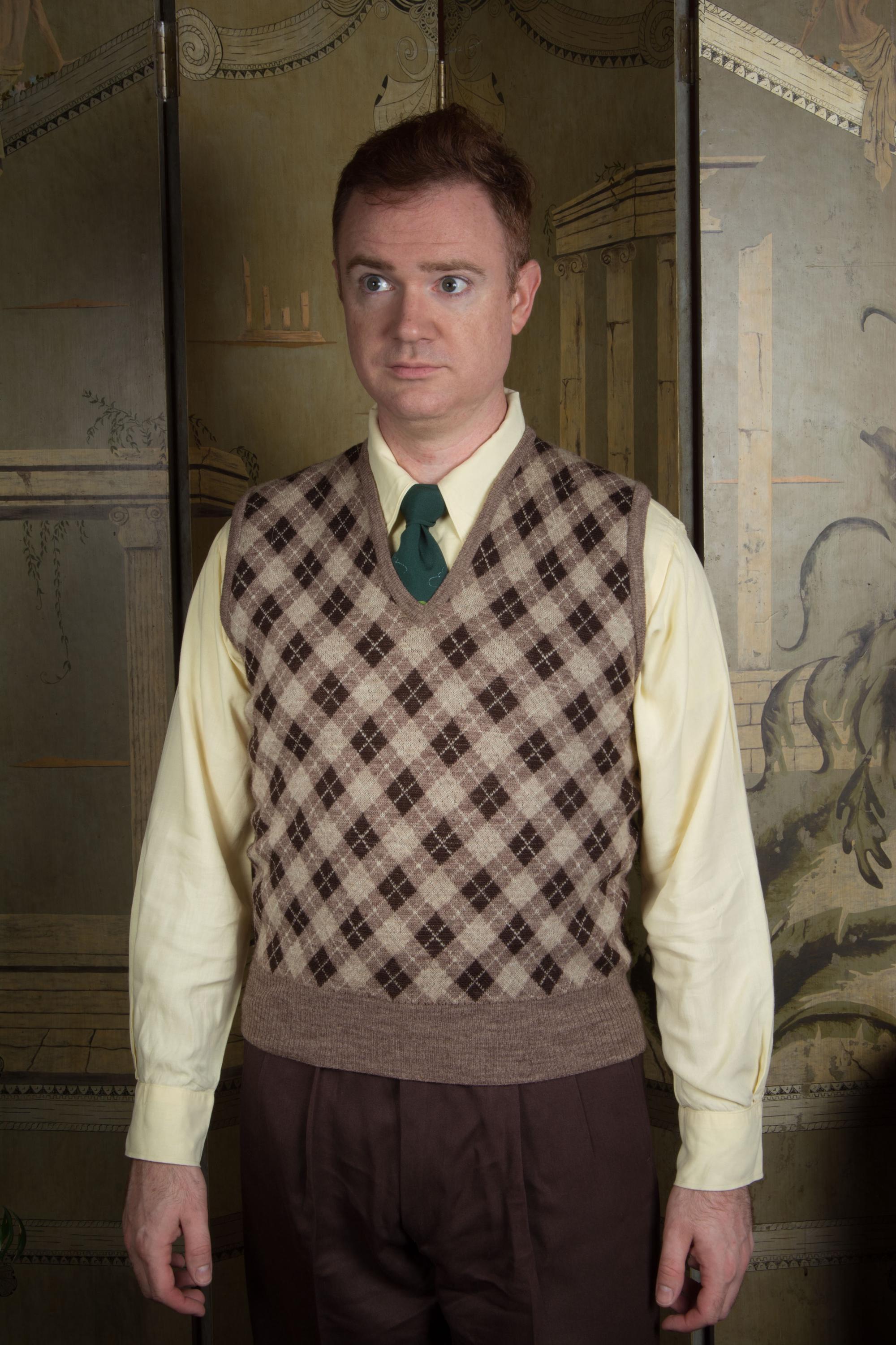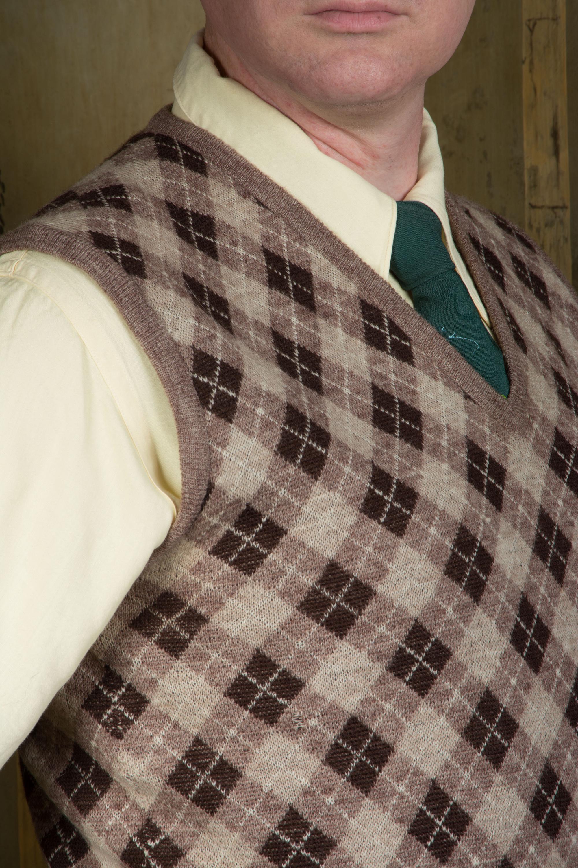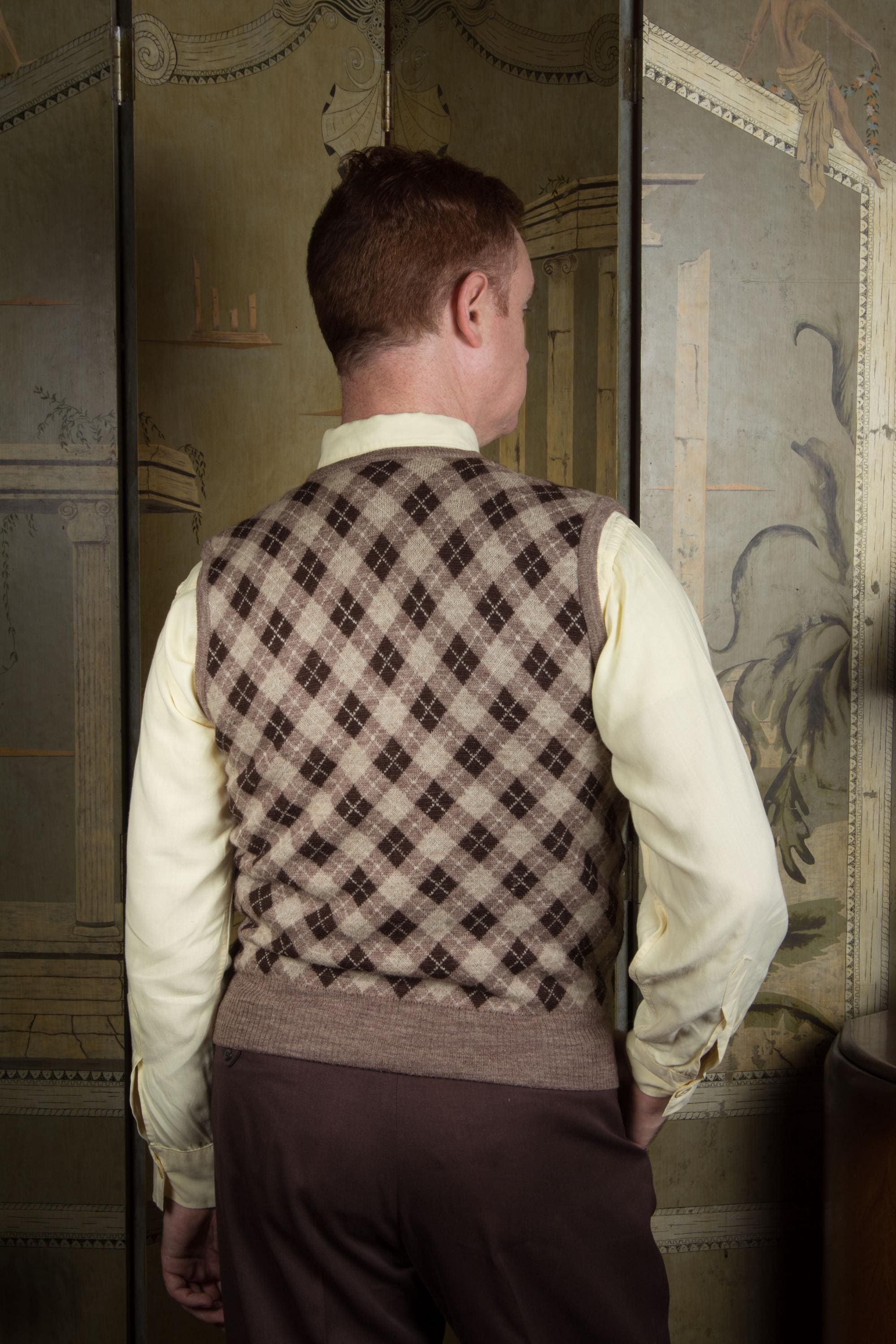 It's hard to be totally confident on the date for such a classic item when there's no tag, but the knit of this handsome vest feels most like late 1950s-1960s wool knits to me. The arygle is done in very cool brown tones -sand, taupe, dark and white. The primary side is that classic plaid, while the reversible interior is heathered taupe brown. I didn't realize it reversed until we were done with photos. The hem, arm openings and neckline are banded.