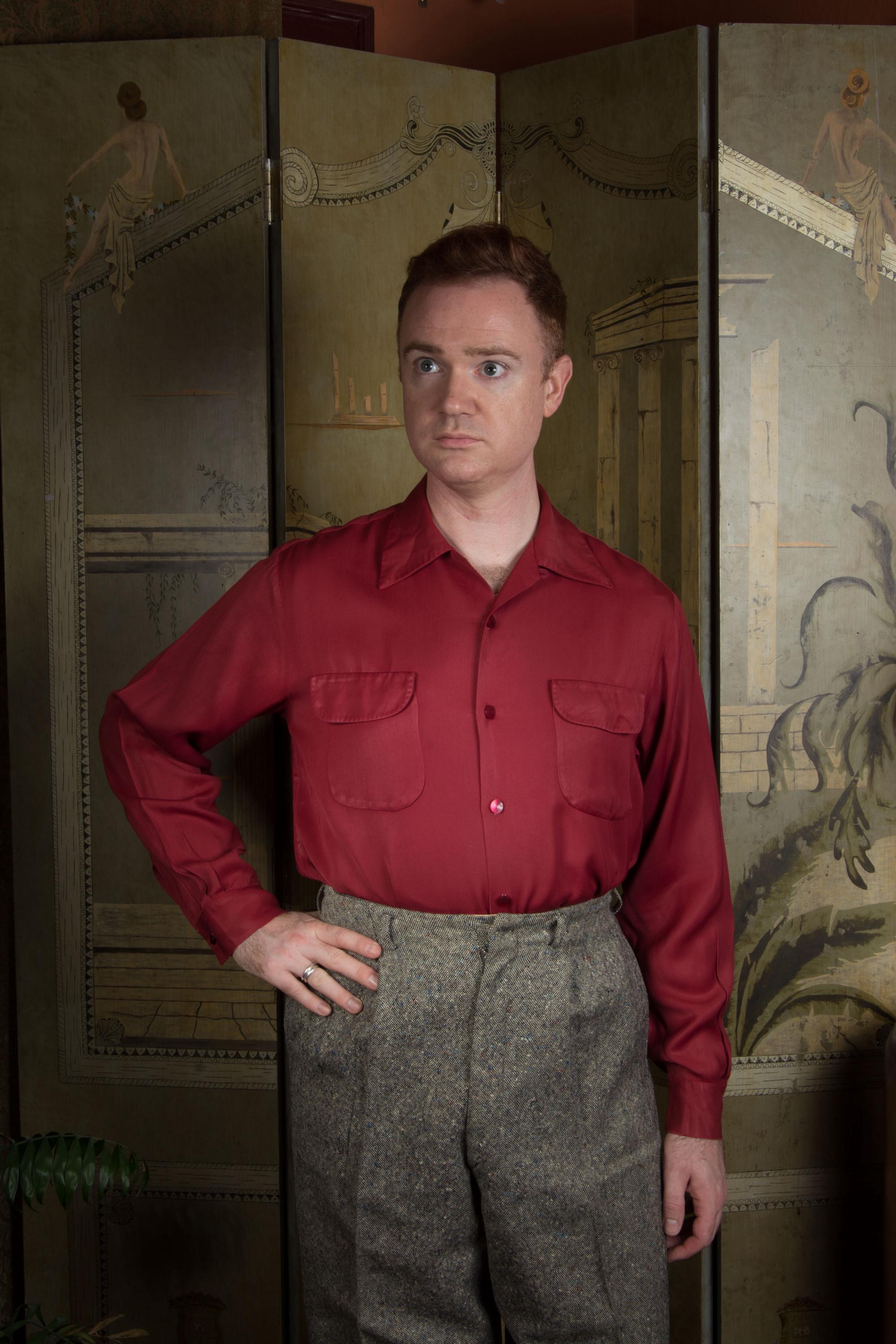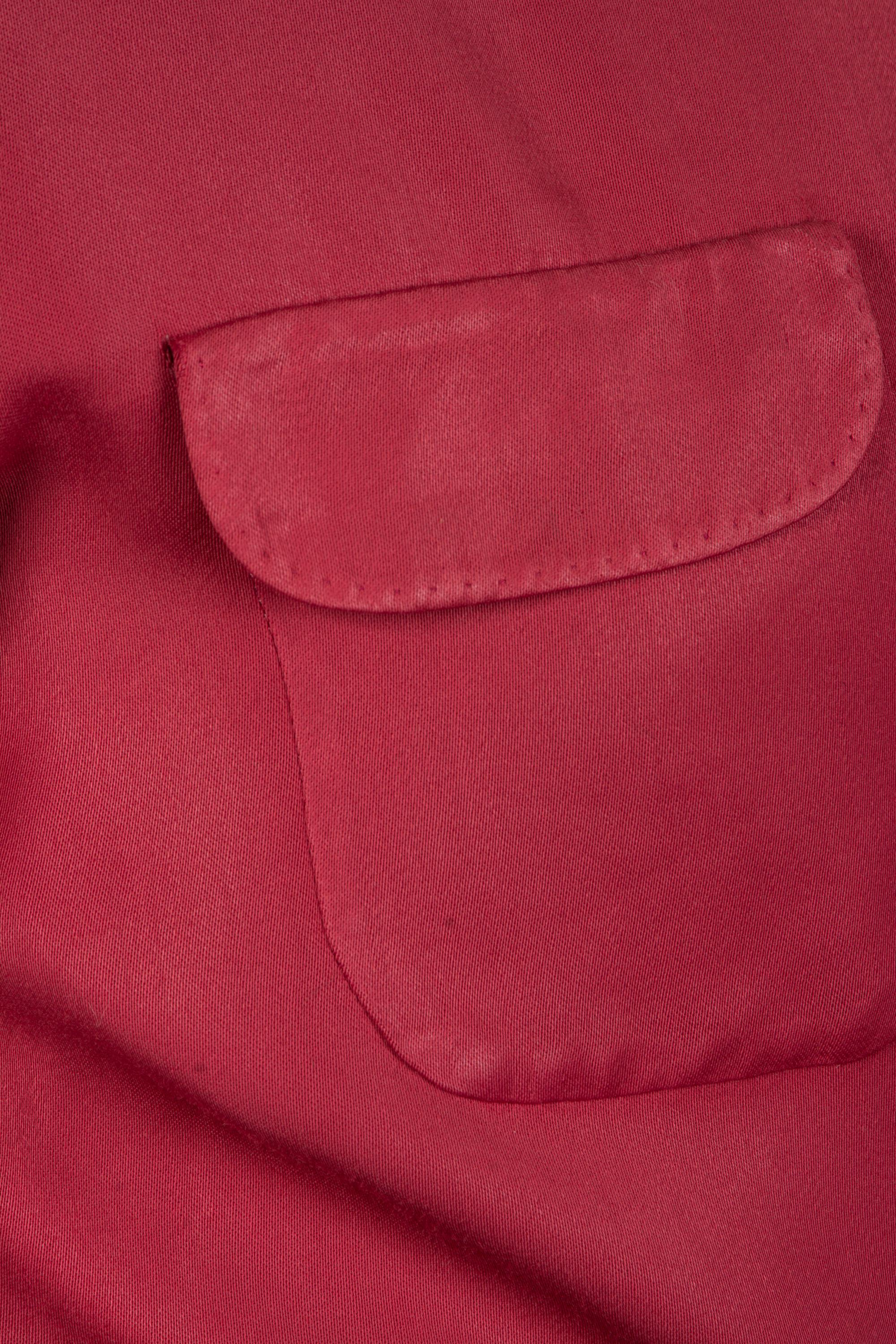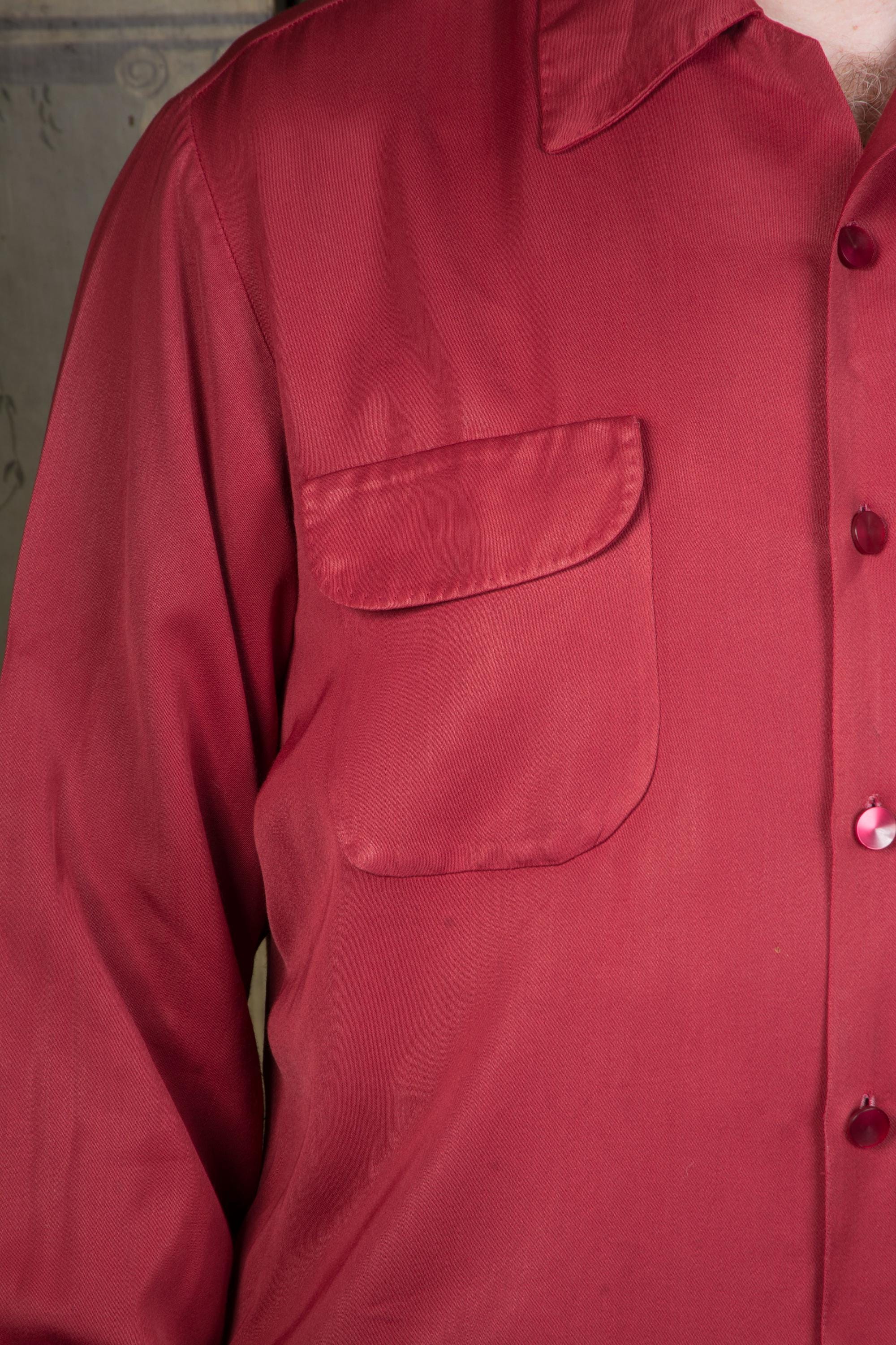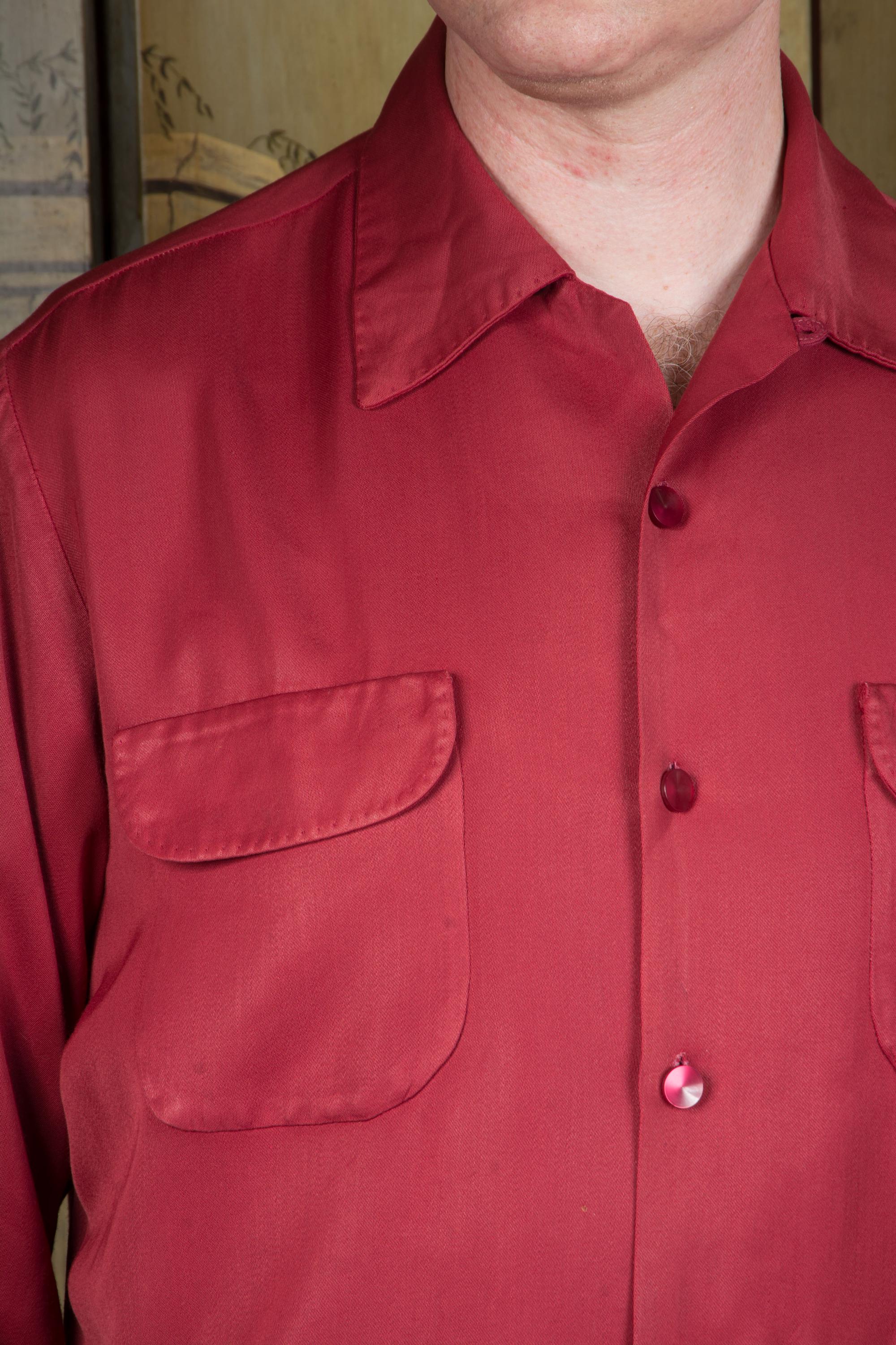 Vintage 1940s gabardine sportshirt from California Sportsman in a classic, autumnal burgundy hue. This has a notable wider late 40s collar, with loop closure. The gabardine has an incredible, heavy but soft and sleek feel. This has two flap pockets, and full length sleeves. The collars and pocket feature a tone on tone top stitched accent. There is a self-fabric yoke lining through the upper back of the shirt.