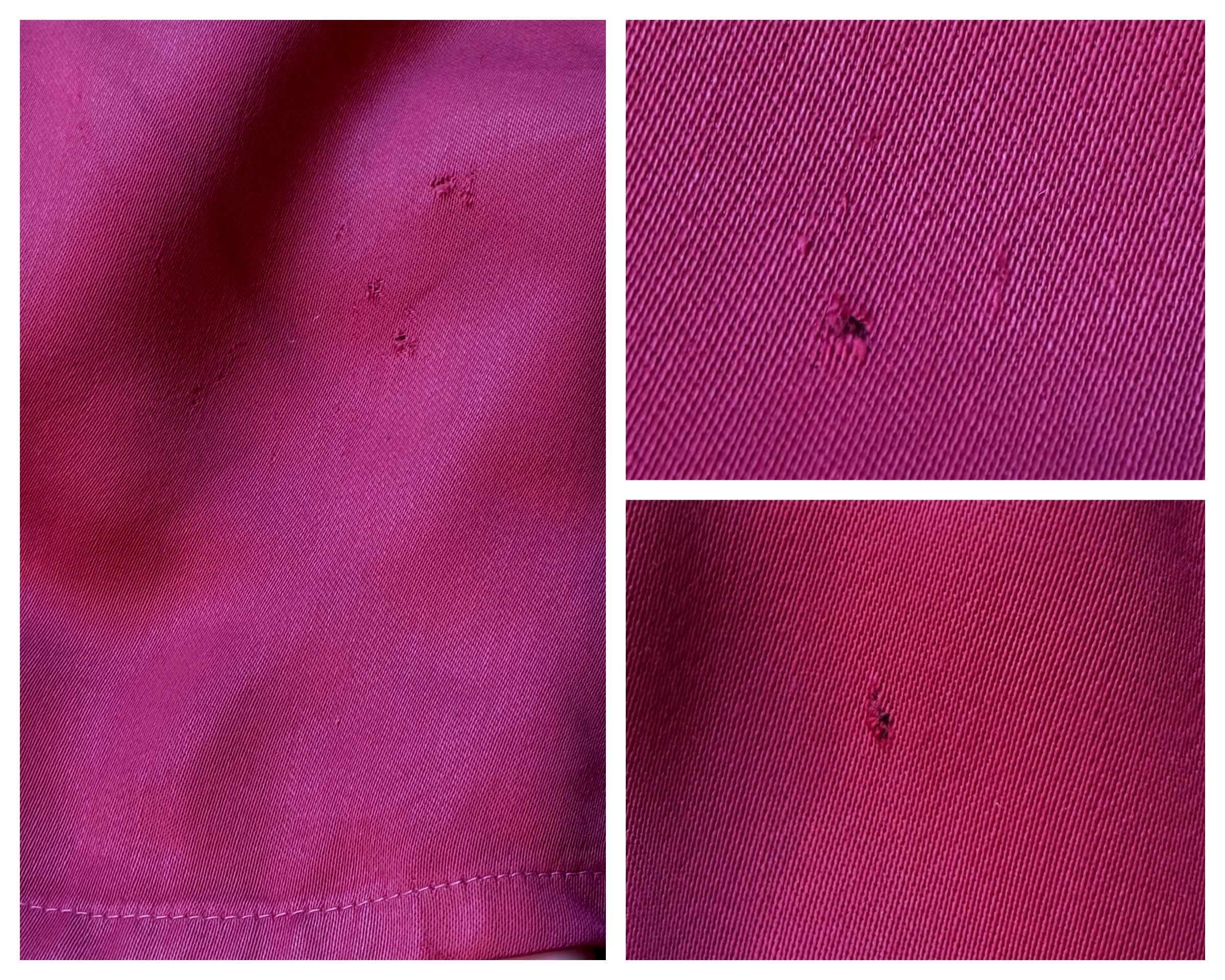 This has been gently hand laundered, and is fresh and ready to wear. There's some pressing sheen on pocket flaps and some seams/edges, but the whole shirt is slightly lustrous so it doesn't stand out. The front buttons are period replacements, which don't match the loop or cuff buttons. There's scattered small moth bits - tiny holes and some surface chews - on the back, mostly back lower left. See example photos. Priced with flaws in mind.