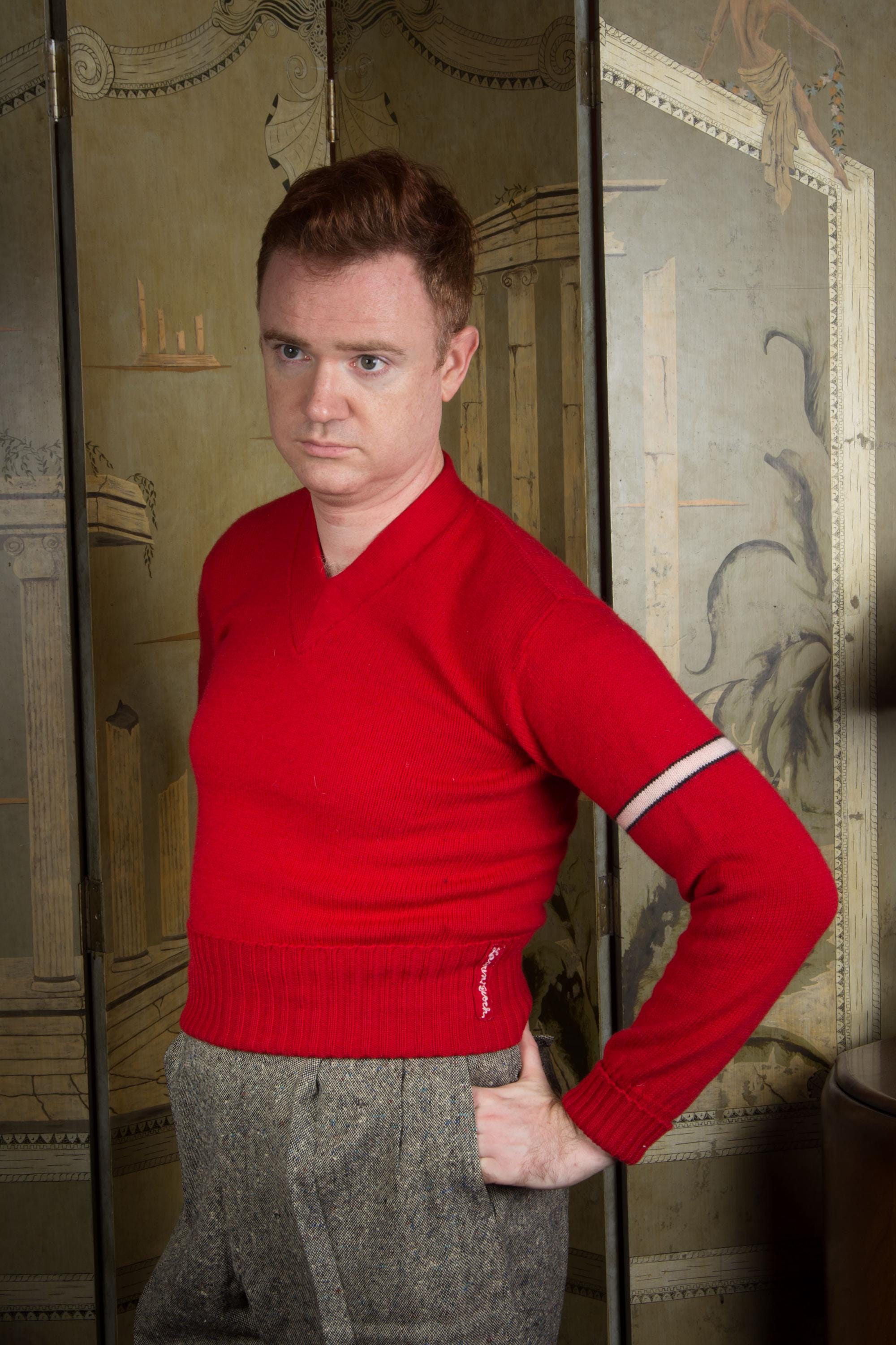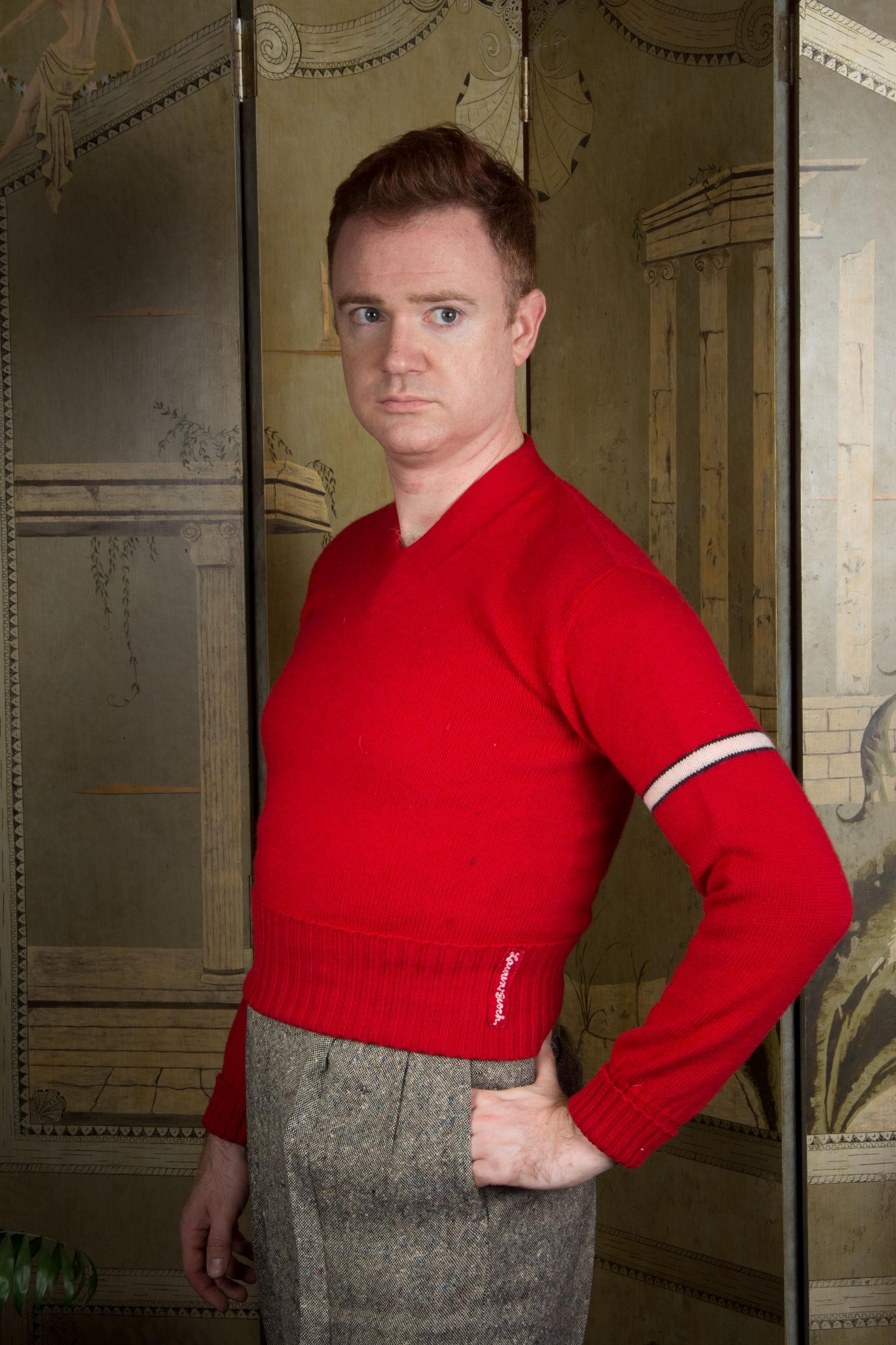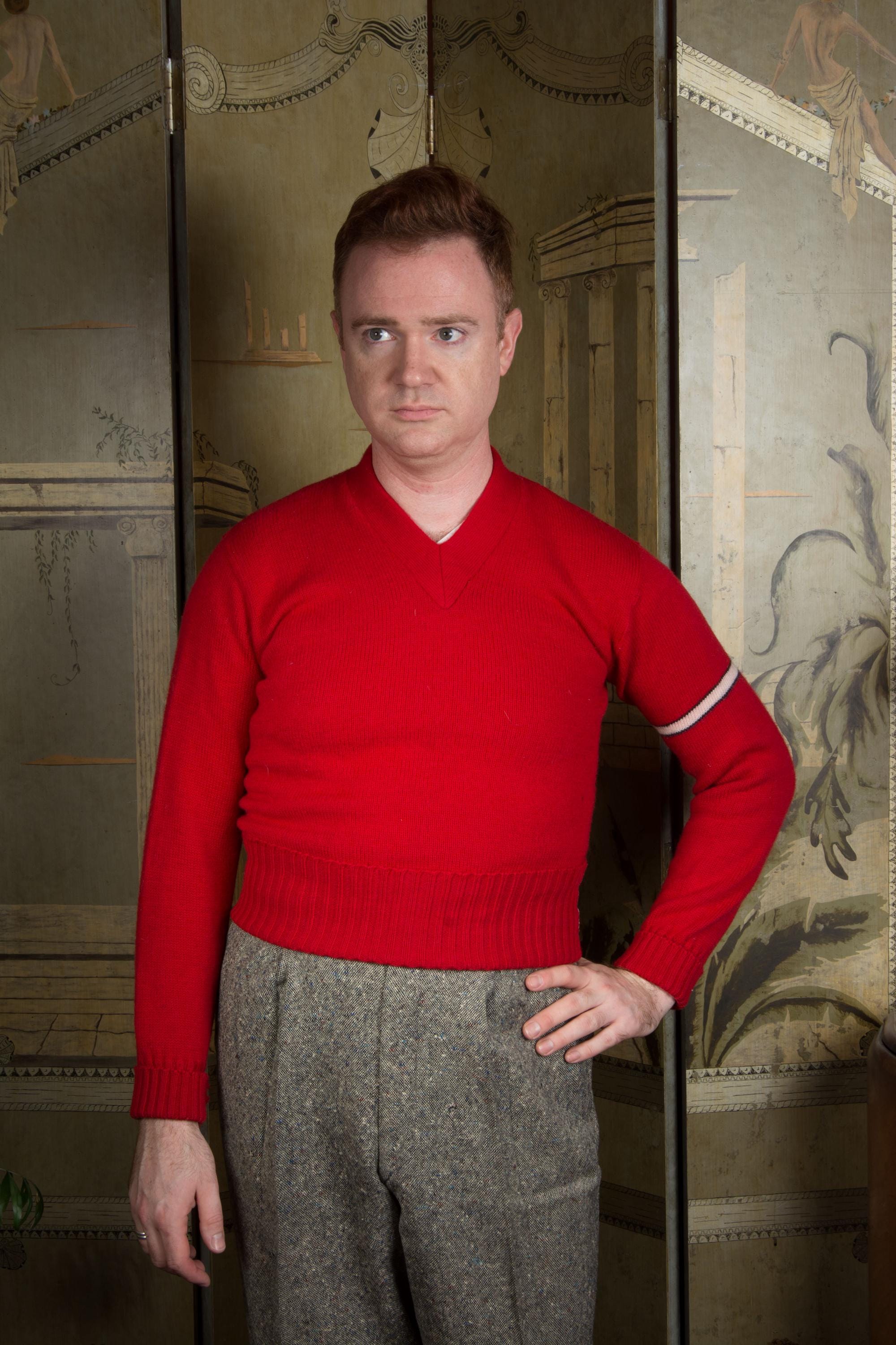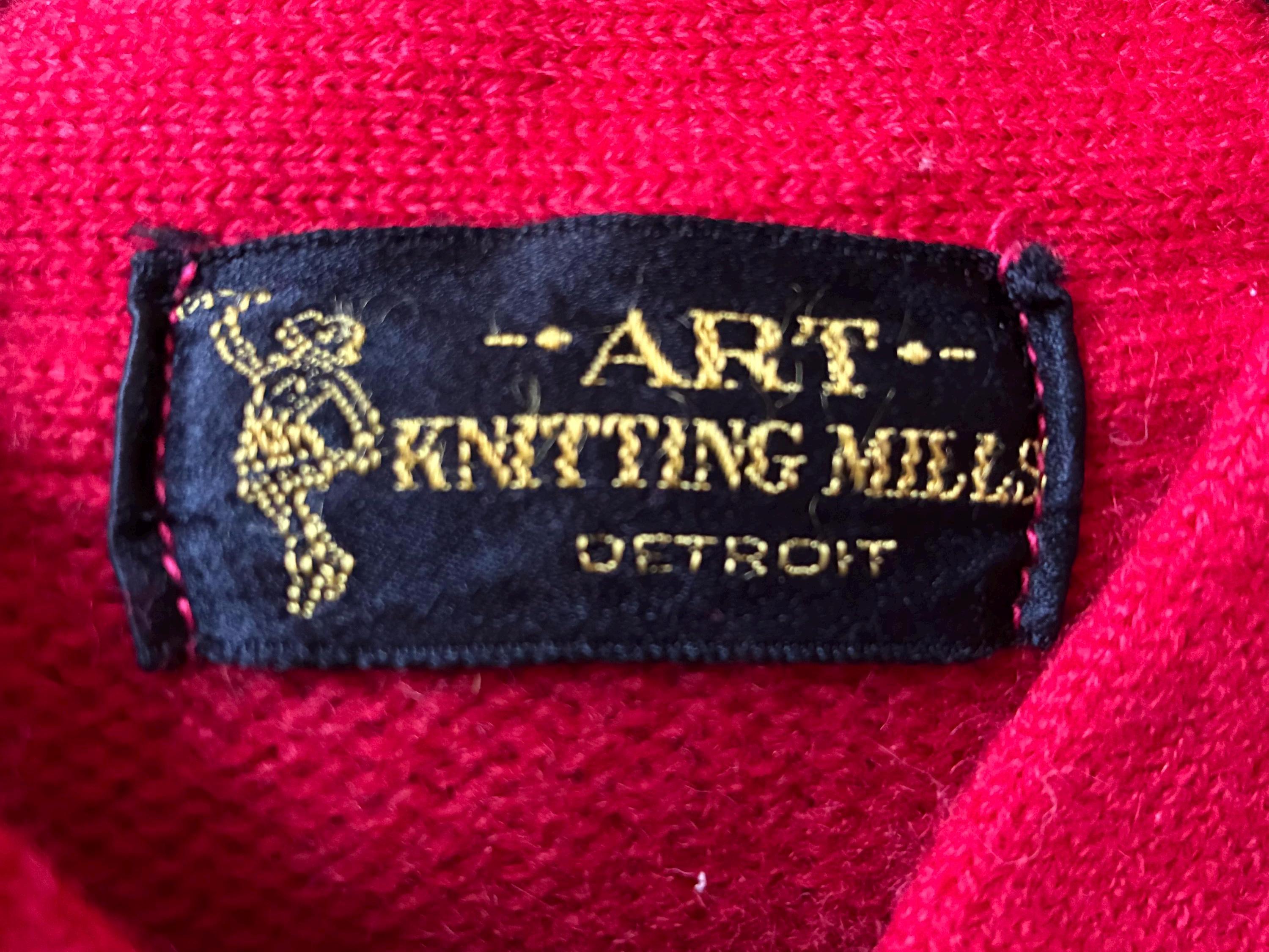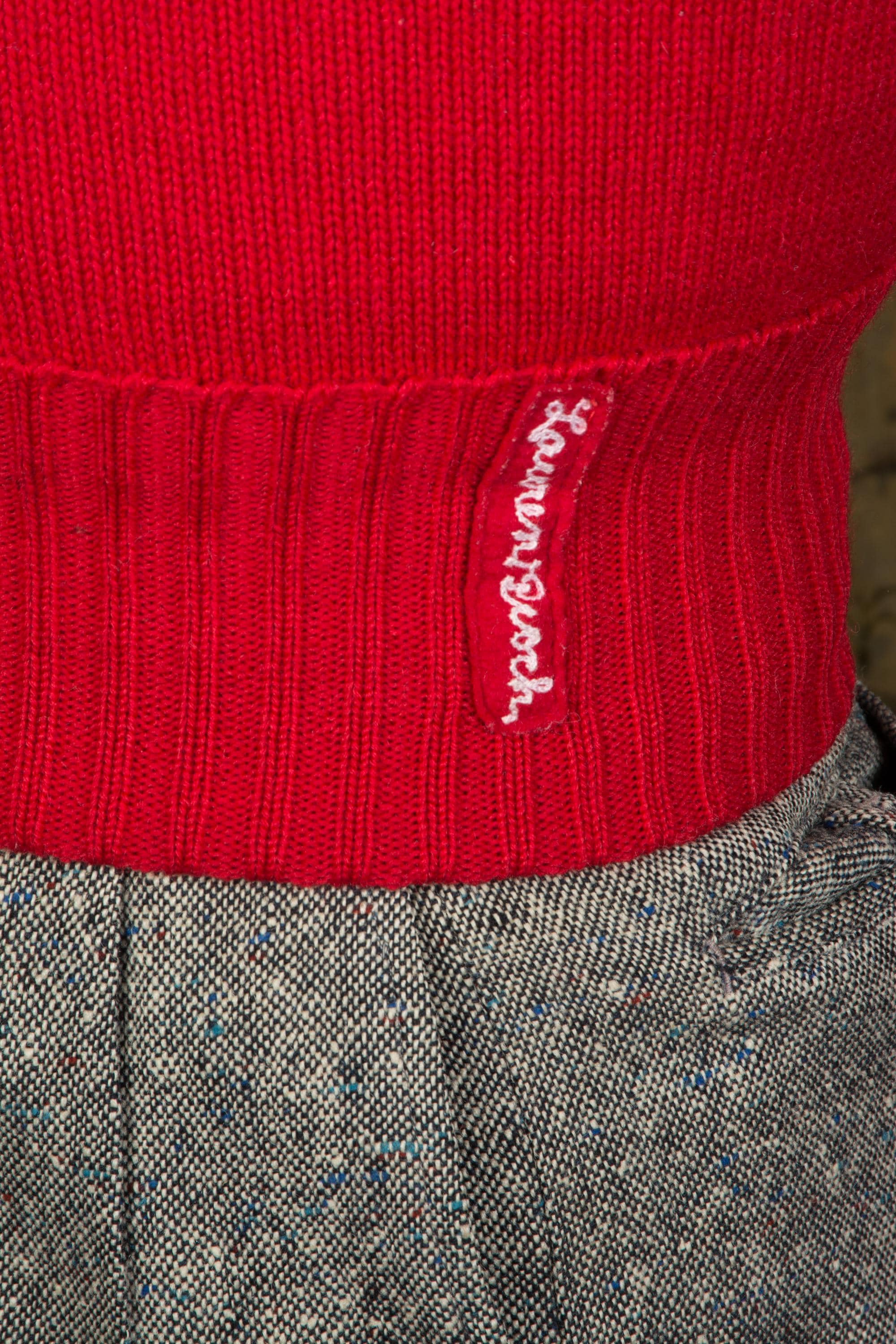 Vintage 1960s varsity pullover is sporty and smart, styled with an extra wide banded hem that can be worn flipped up in a 1930s style, or turned down. This is a true red, with a single band of white bordered with black on the left sleeve. Has wide knit cuffs. Pulls over the head and has a high v neckline.