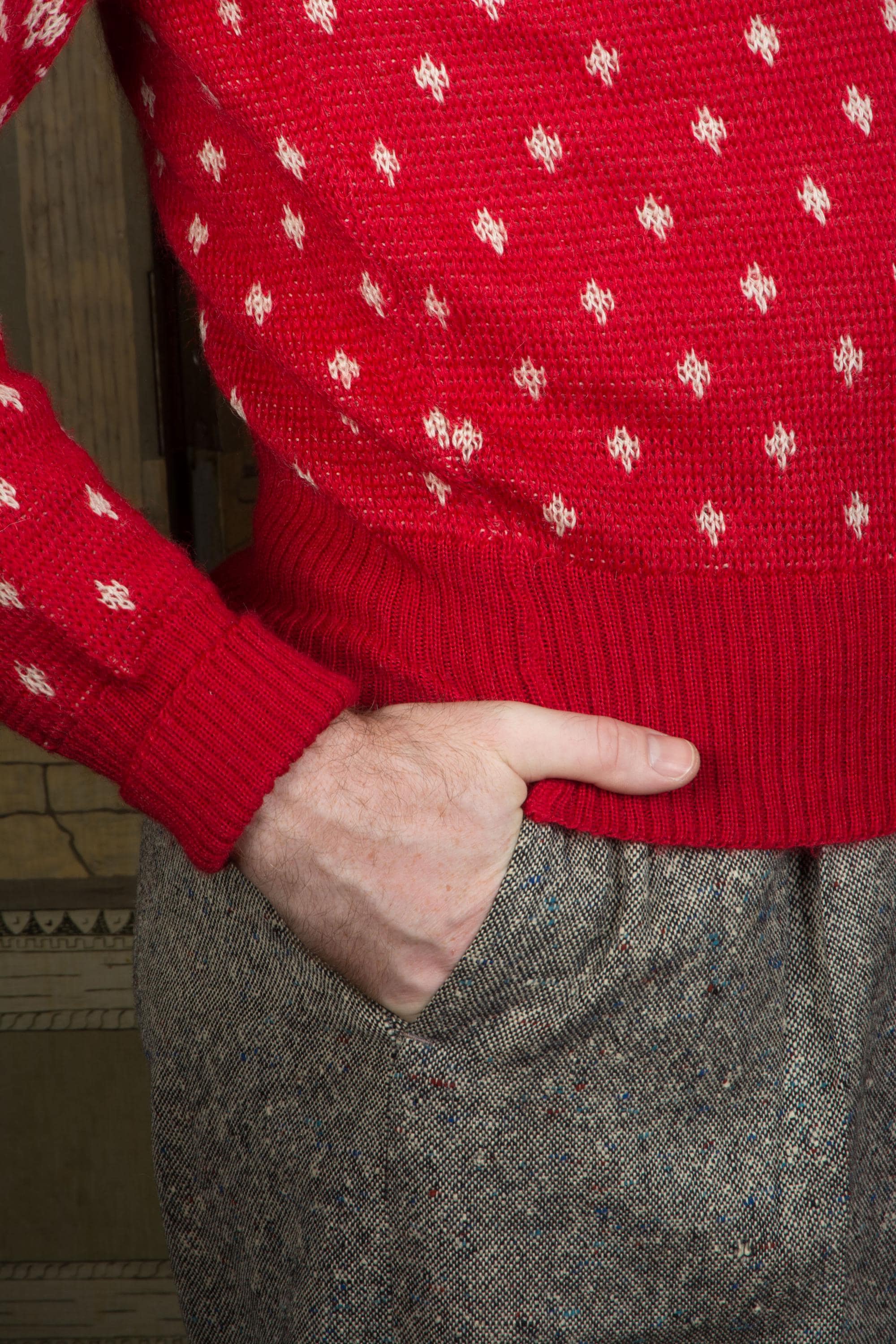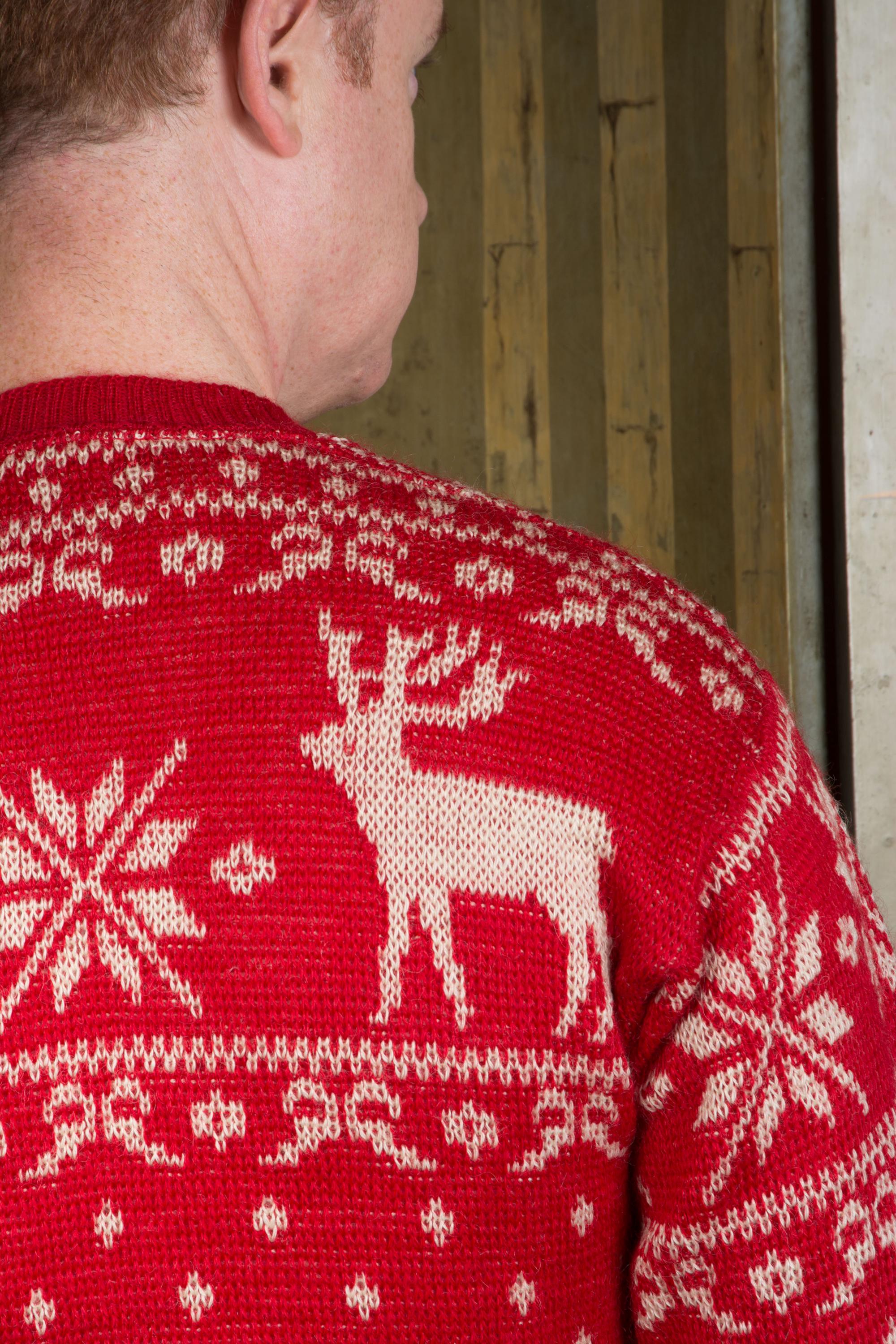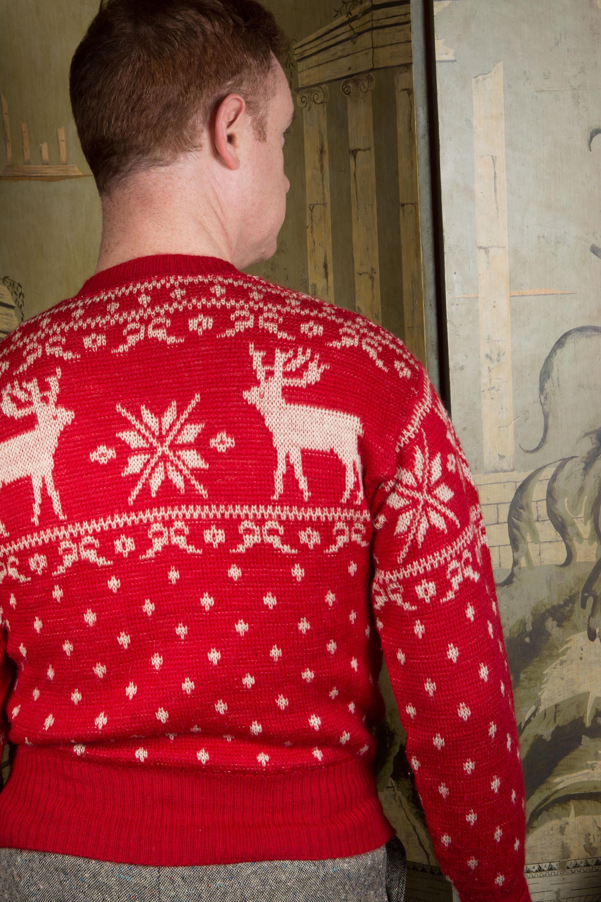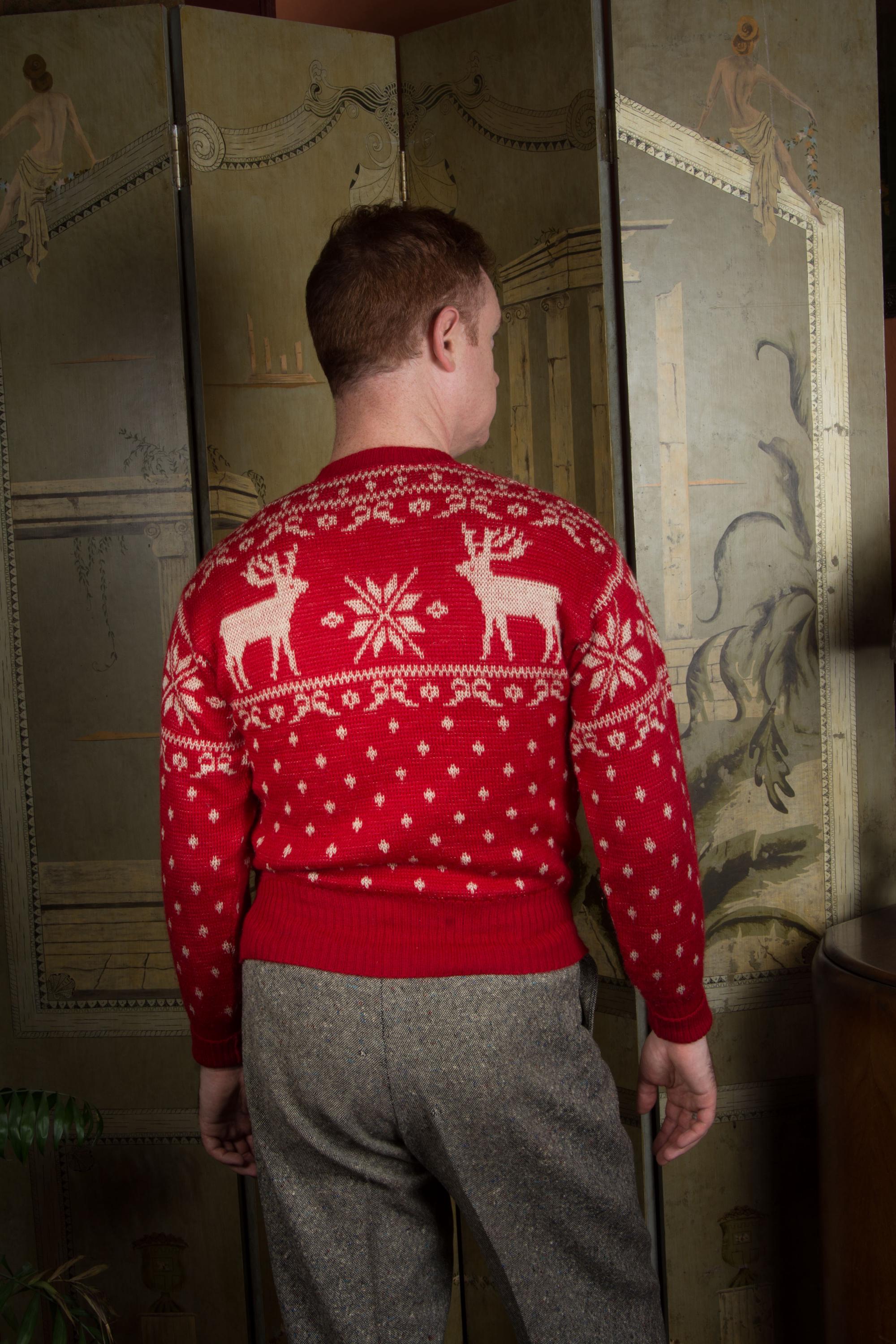 Vintage 1940s Jacquard sweater by Jantzen in one of their most popular designs. It's a really lovely, soft wool that hasn't become dry or brittle. It's a very true, bright holiday red, woven with white snowflakes and moose at the yoke. The collar, cuffs and hem are banded. Pulls over the head and has excellent stretch.