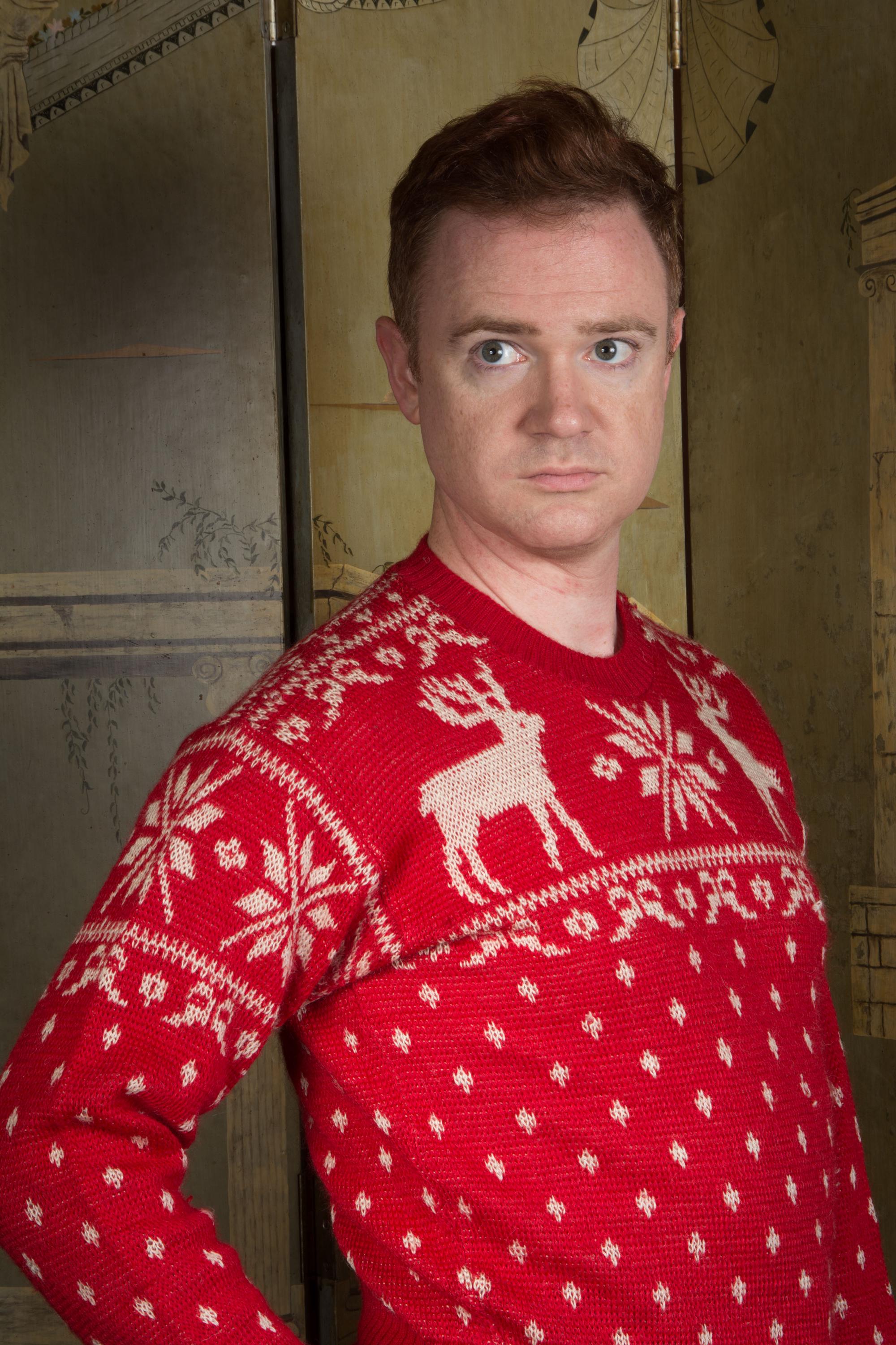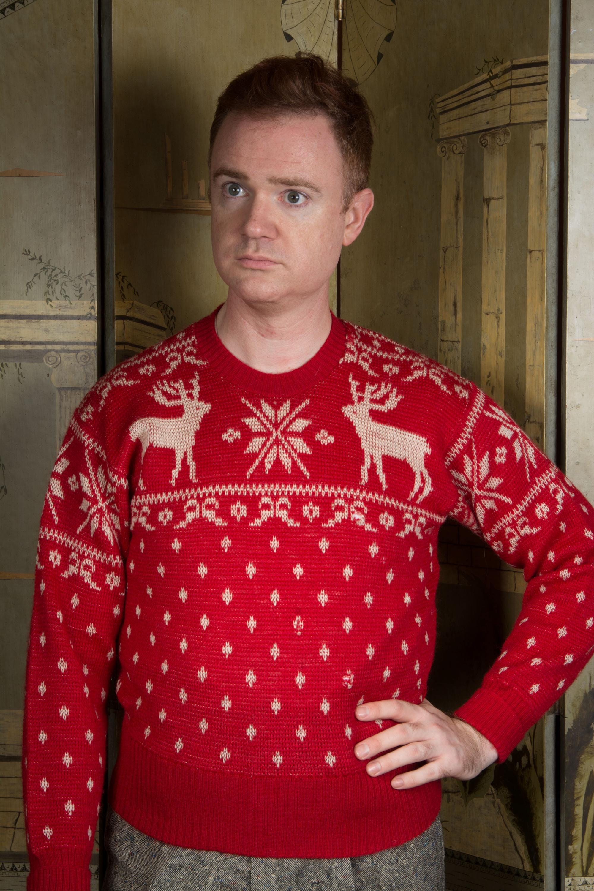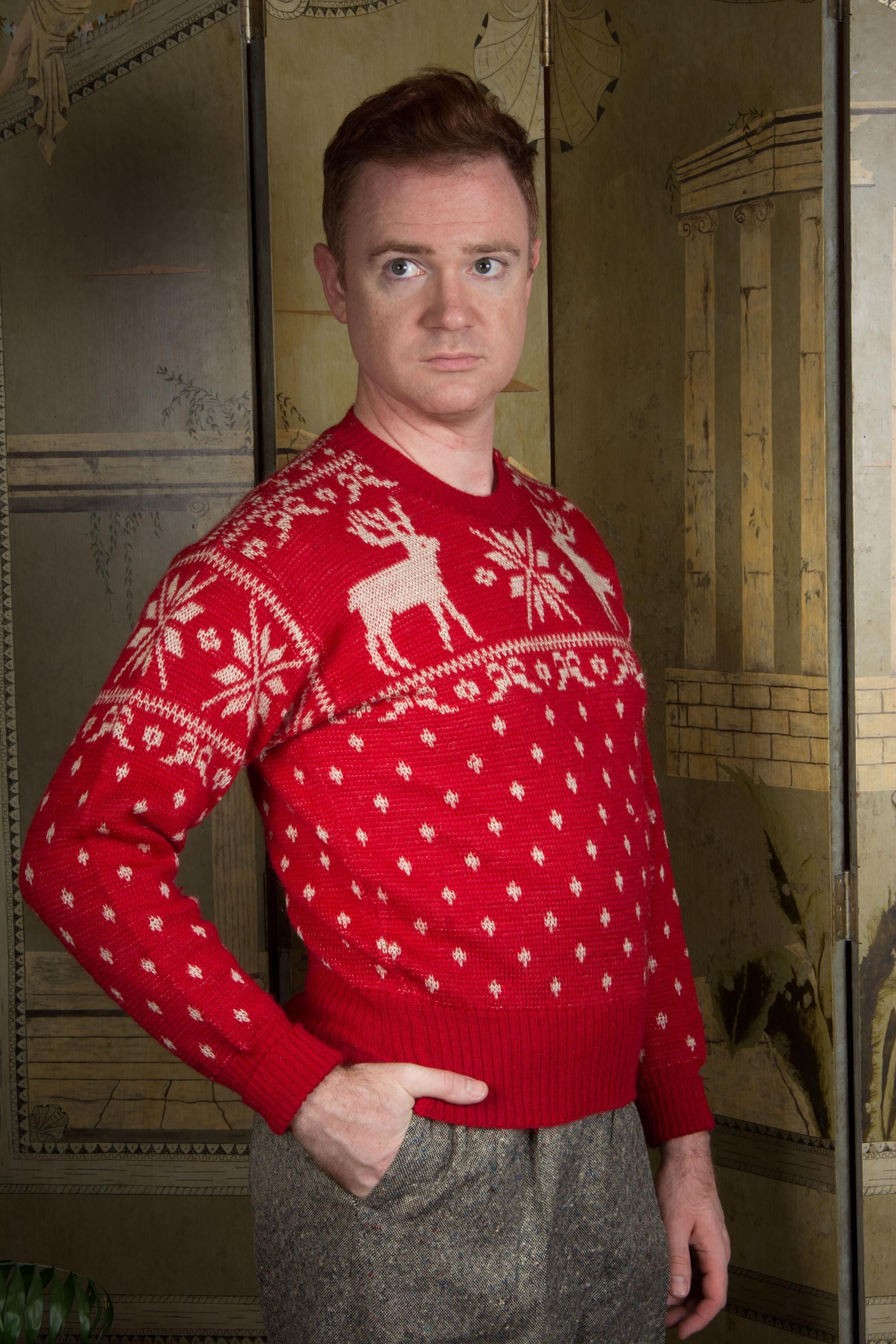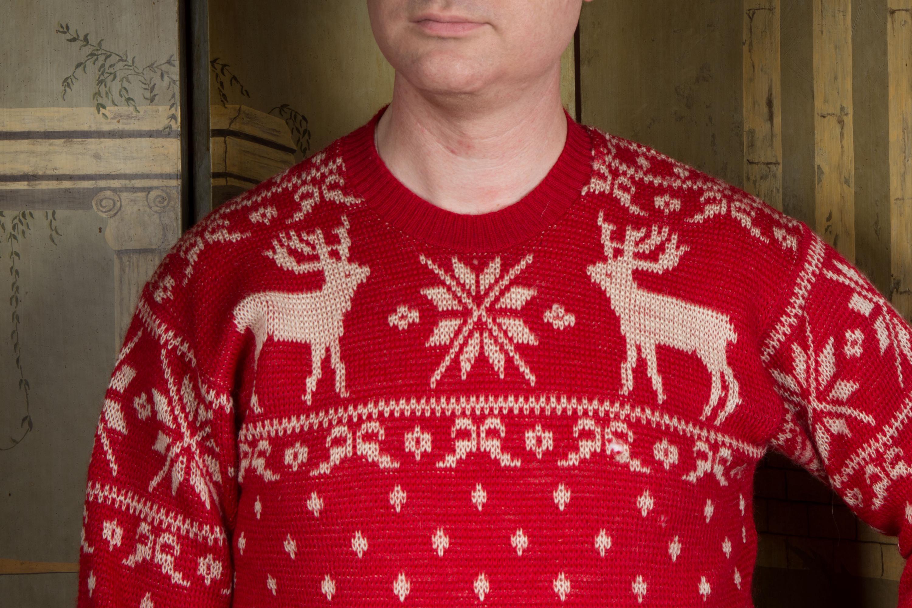 Vintage 1940s Jacquard sweater by Jantzen in one of their most popular designs. It's a really lovely, soft wool that hasn't become dry or brittle. It's a very true, bright holiday red, woven with white snowflakes and moose at the yoke. The collar, cuffs and hem are banded. Pulls over the head and has excellent stretch.