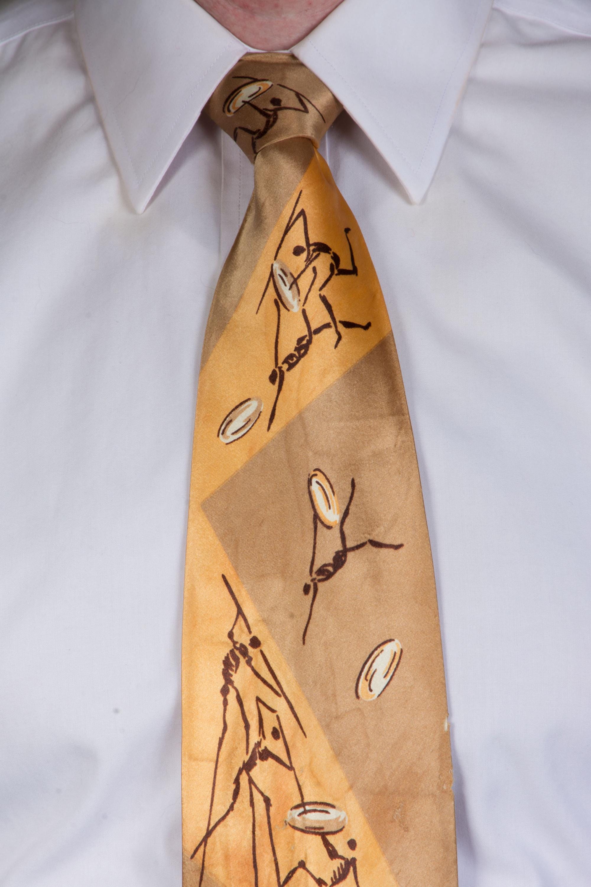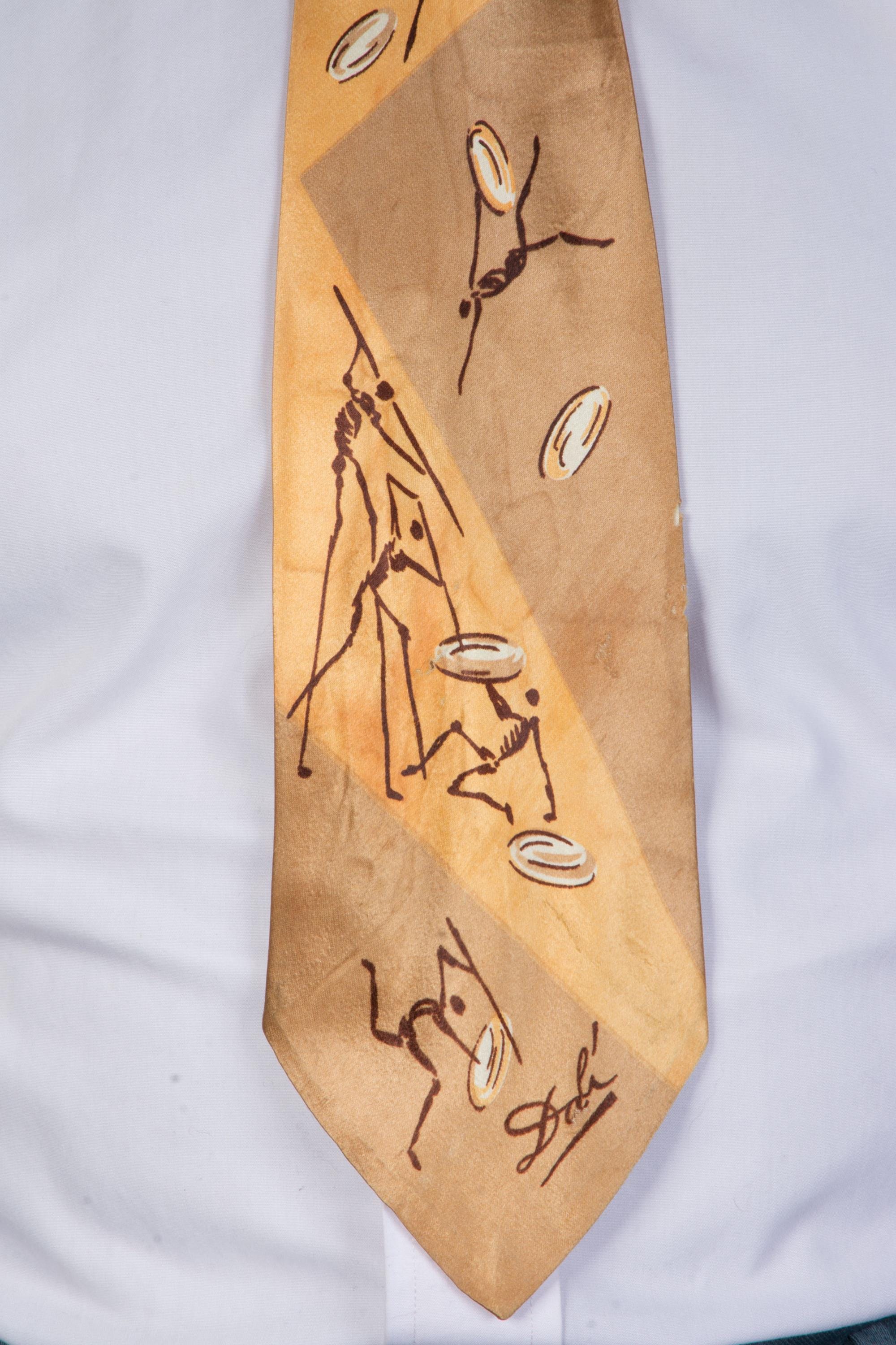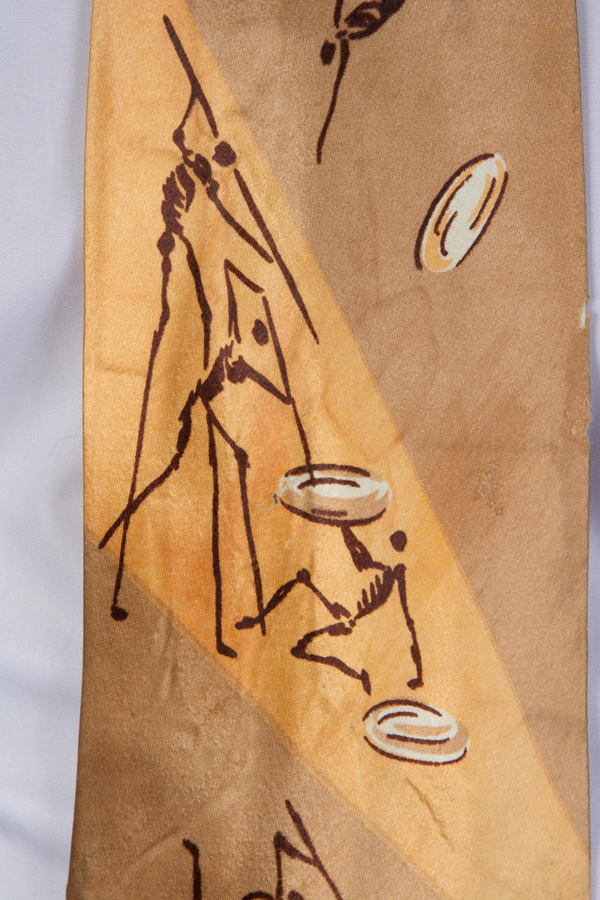 One of vintage neckwear's holiest of Grails - an authentic 1940s surrealist Dali necktie produced by Fashion Craft. This tie isn't named, but it's classically Dali. This is a really great theme, with elongated, almost stick figure skeletal warriors armed with spears and round shields, all against a zig zag ground in gold and taupe. There are enough warriors that they stay unique up to the knot.