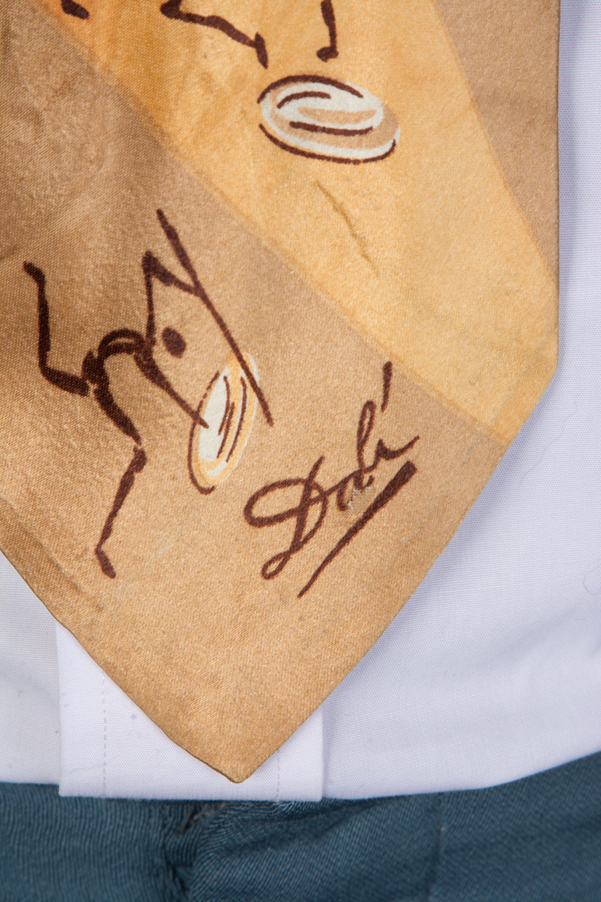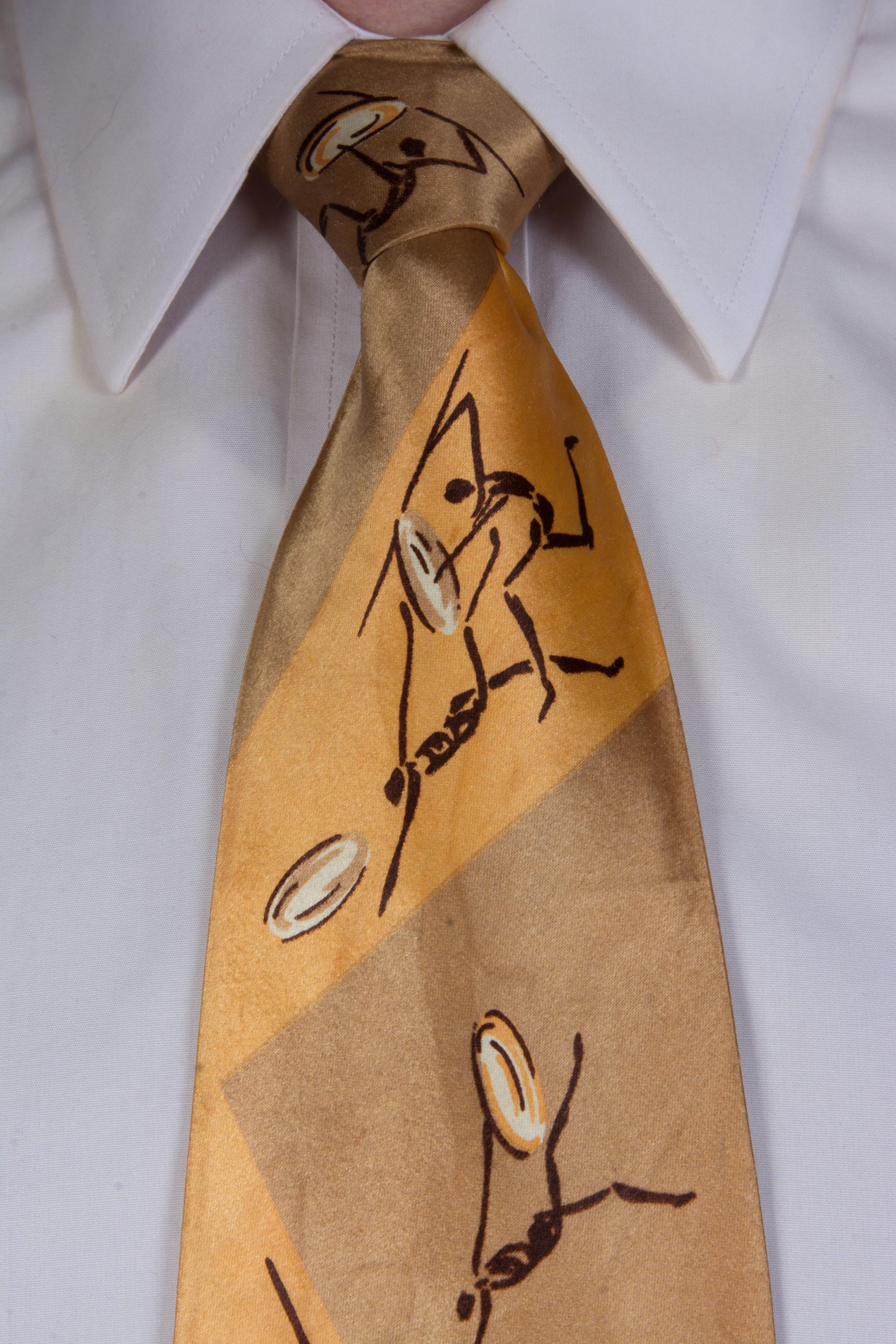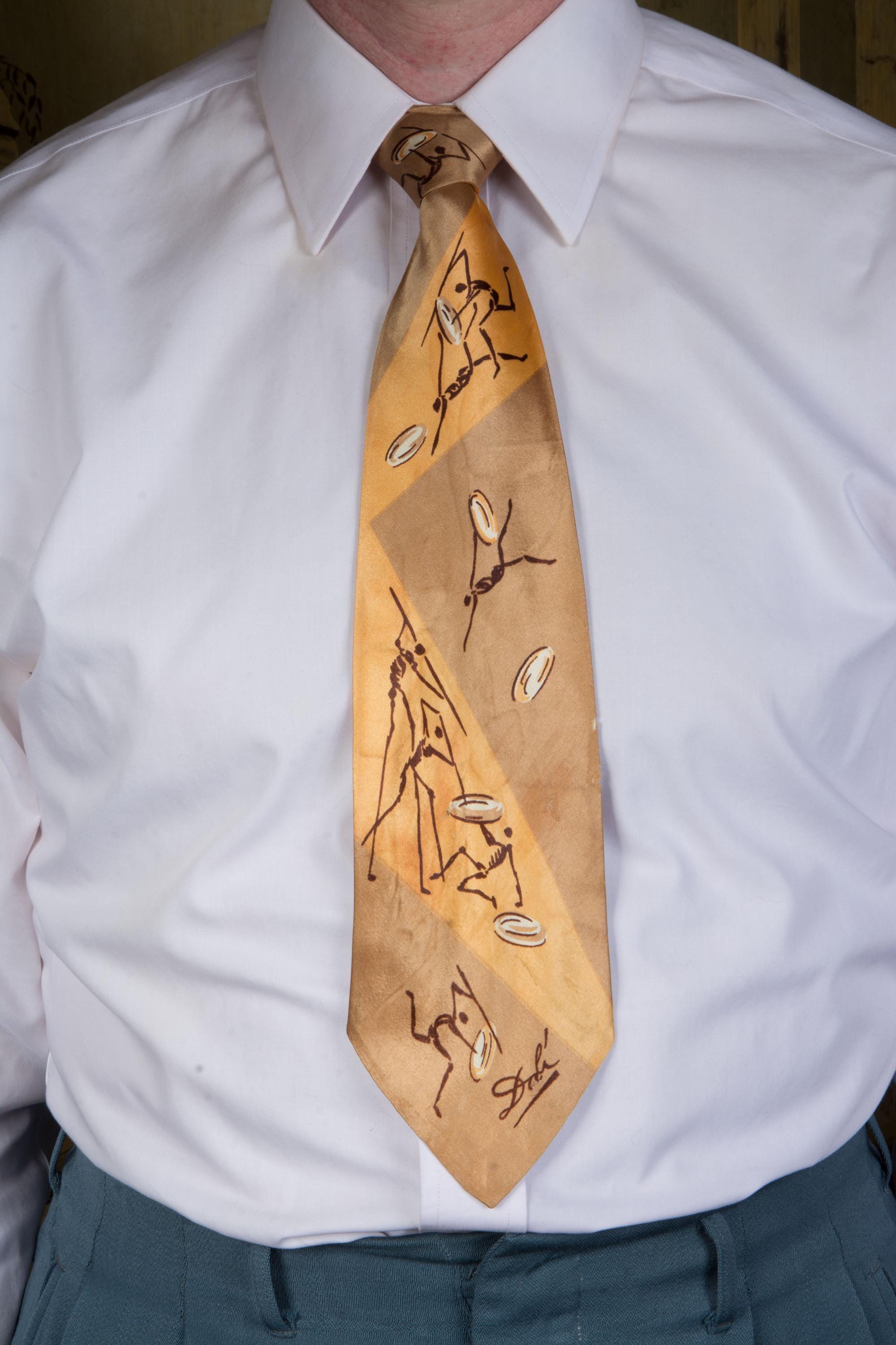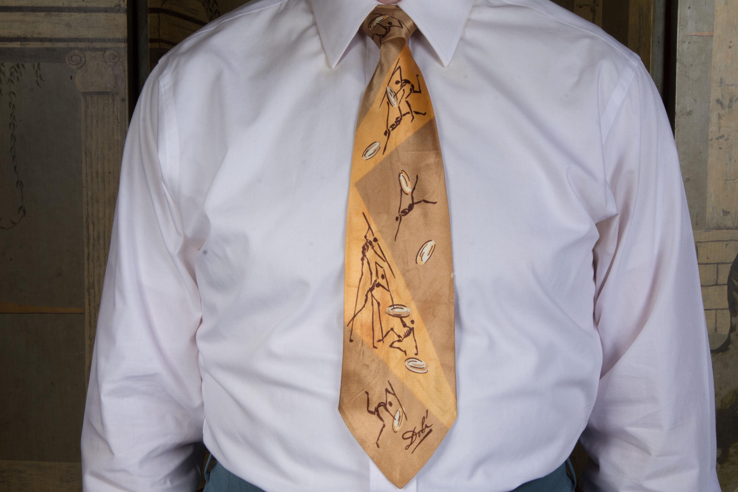 One of vintage neckwear's holiest of Grails - an authentic 1940s surrealist Dali necktie produced by Fashion Craft. This tie isn't named, but it's classically Dali. This is a really great theme, with elongated, almost stick figure skeletal warriors armed with spears and round shields, all against a zig zag ground in gold and taupe. There are enough warriors that they stay unique up to the knot.