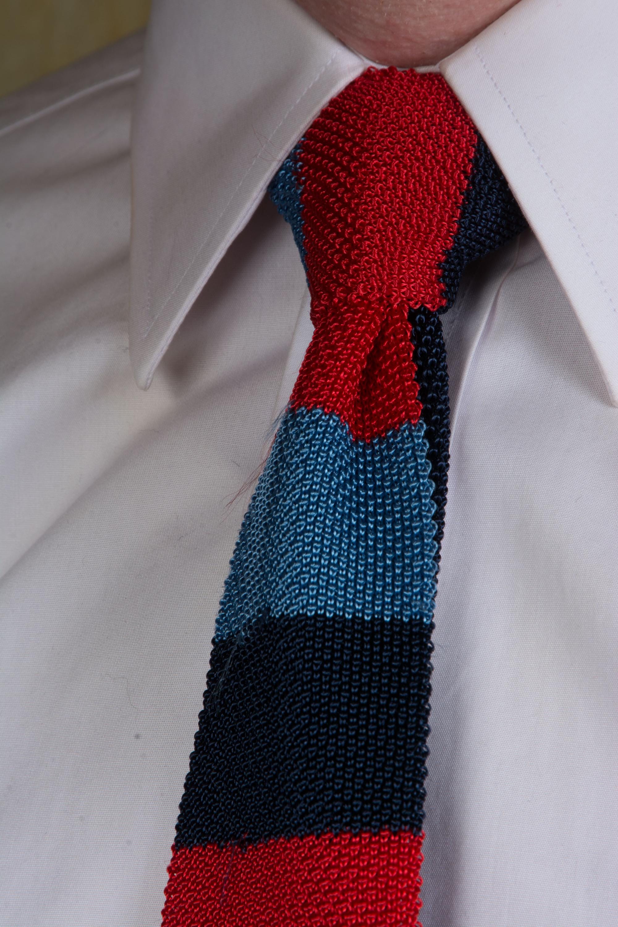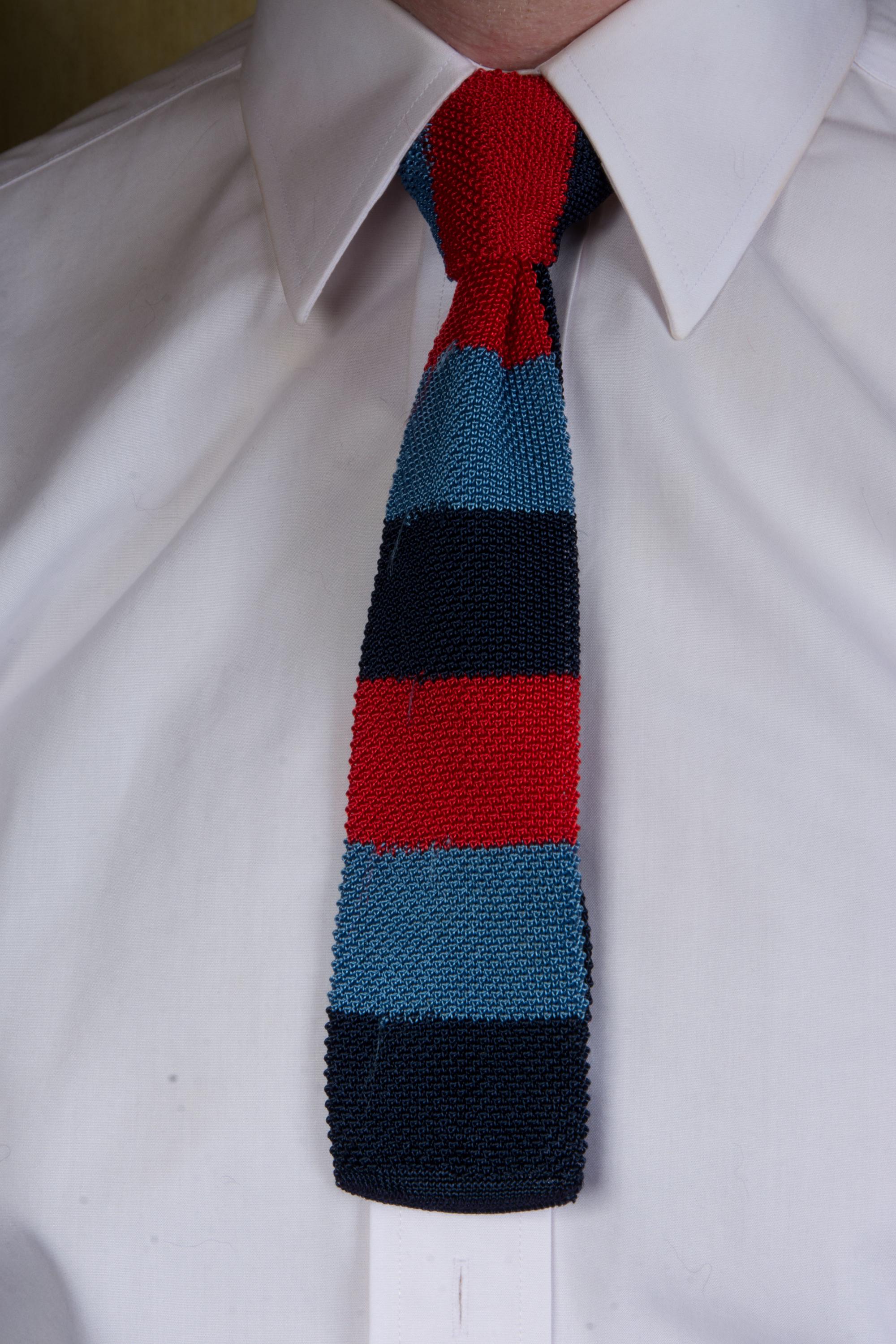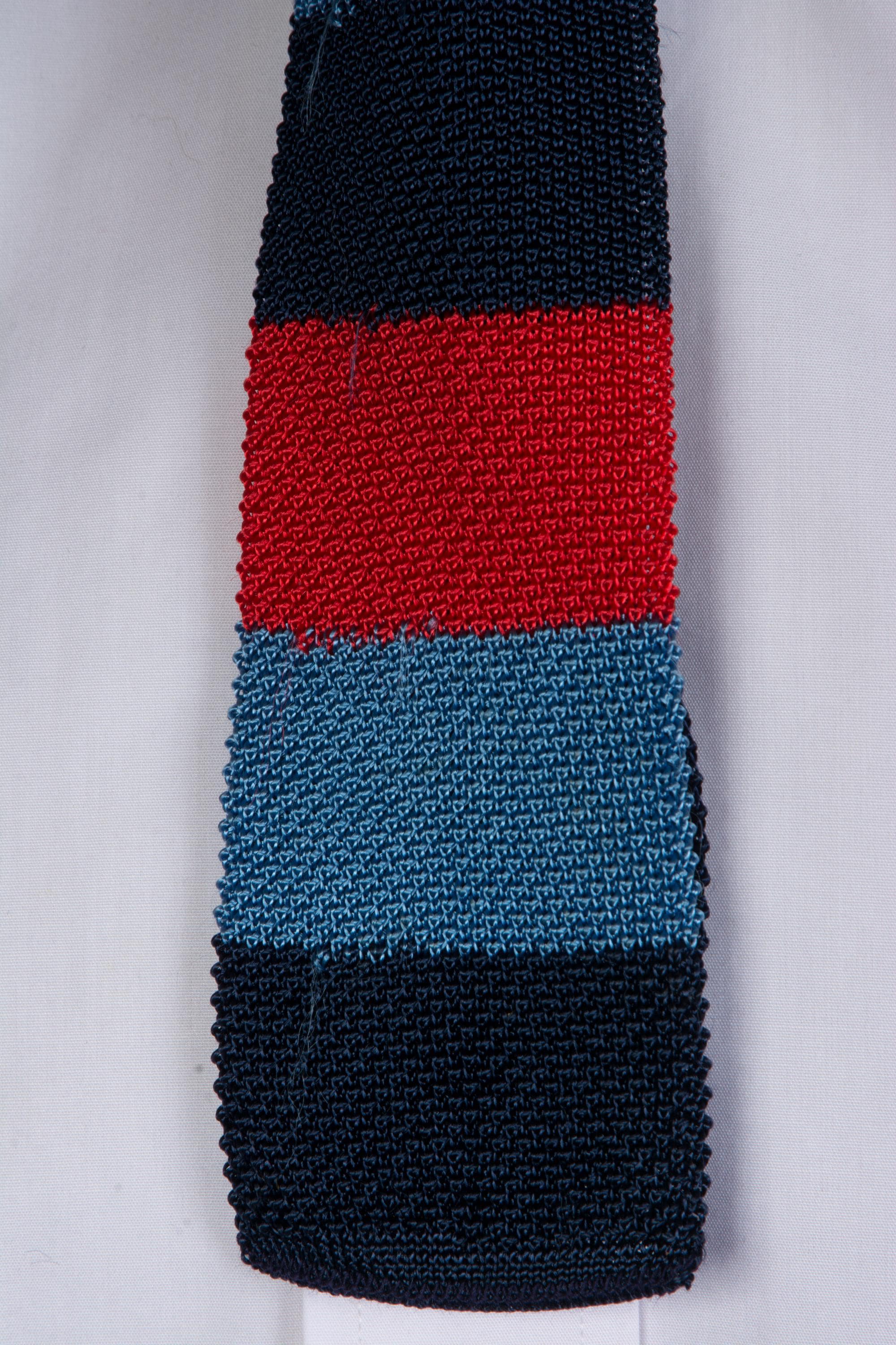 I suspect this tie is actually for a young man/boy, but it could also be a sporty collegiate fad. This classic knit feels like a rayon blend yard, and has wide bands of red, bright blue and navy. The neck and tail are navy. Two layers of knit, unlined