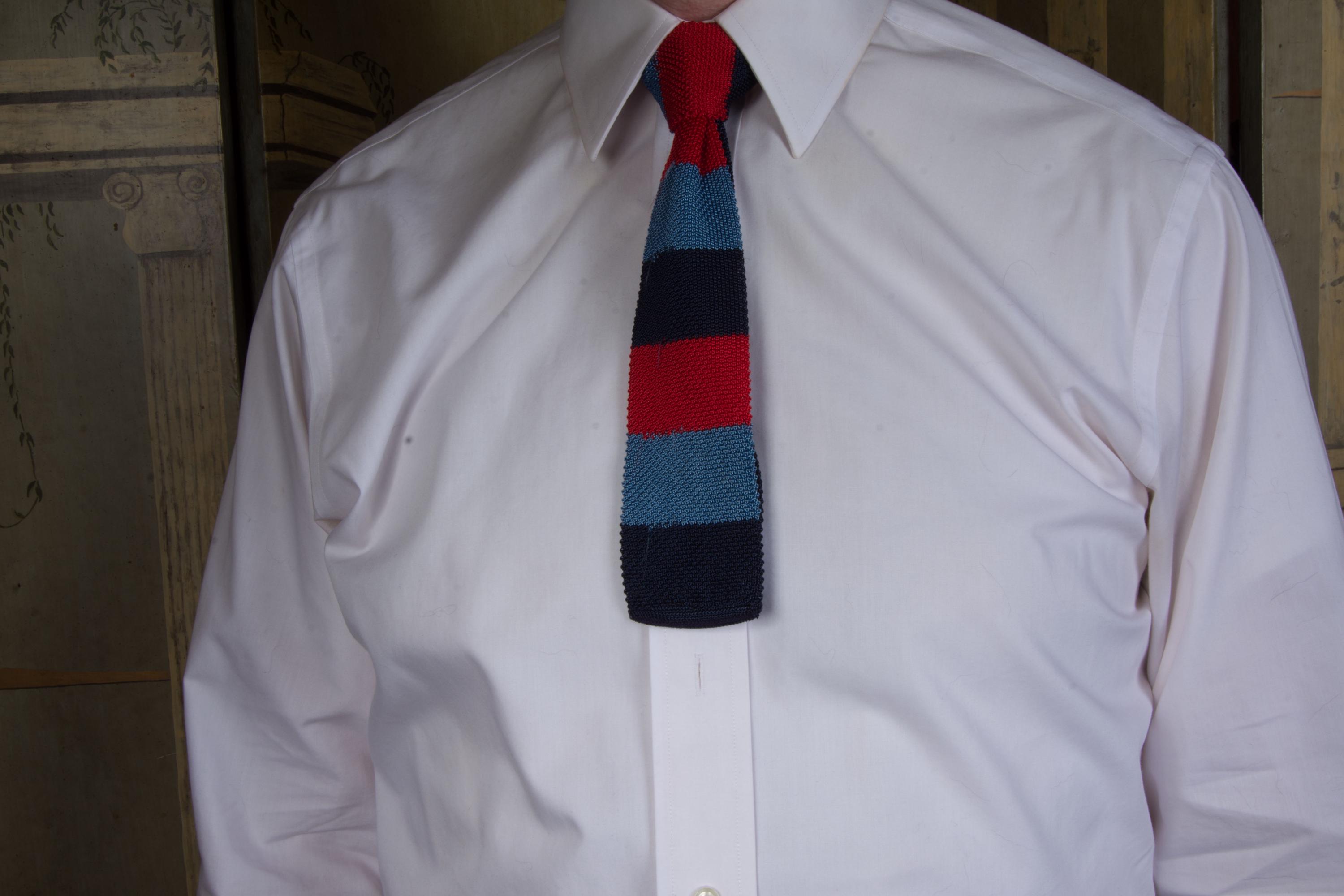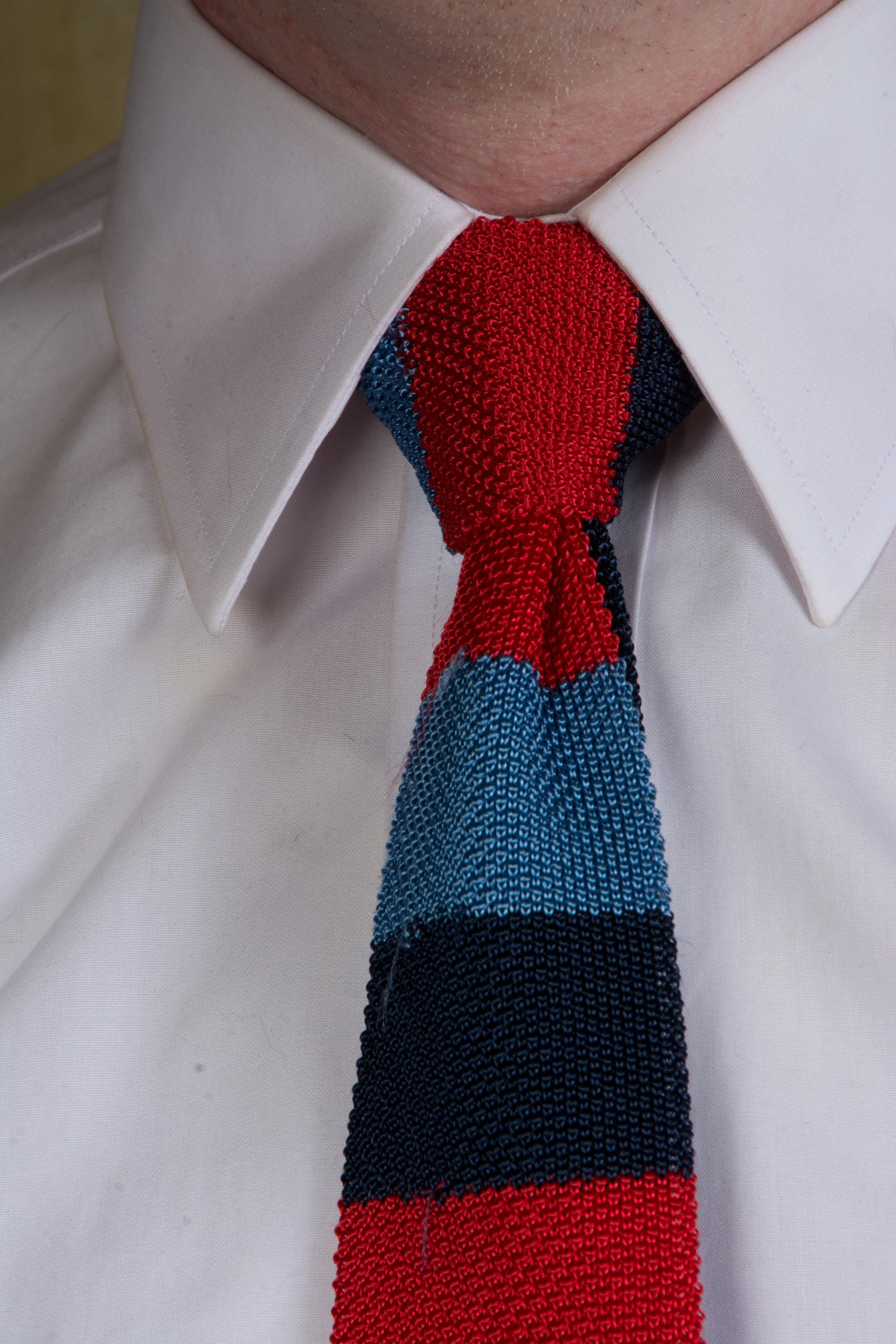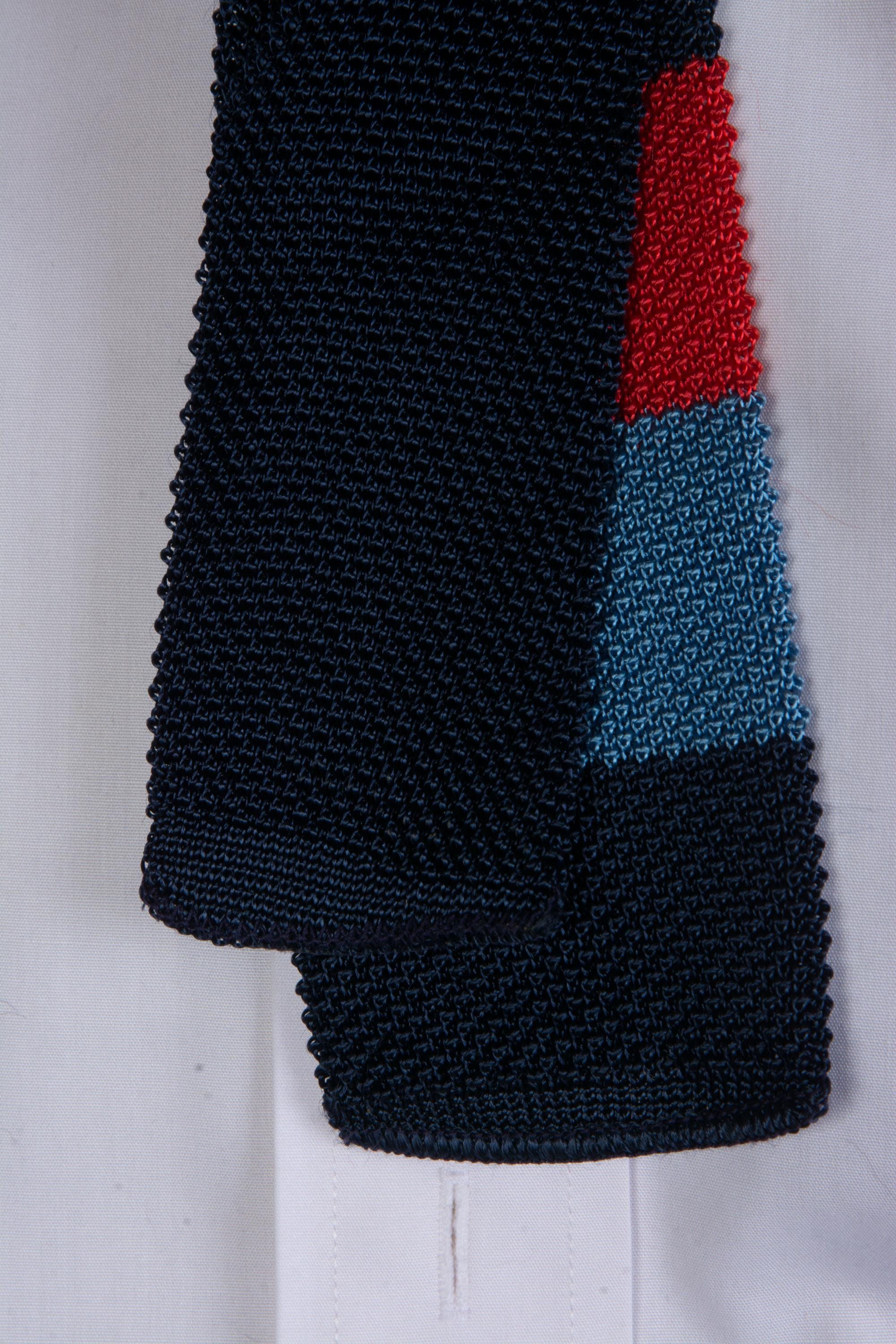 I suspect this tie is actually for a young man/boy, but it could also be a sporty collegiate fad. This classic knit feels like a rayon blend yard, and has wide bands of red, bright blue and navy. The neck and tail are navy. Two layers of knit, unlined