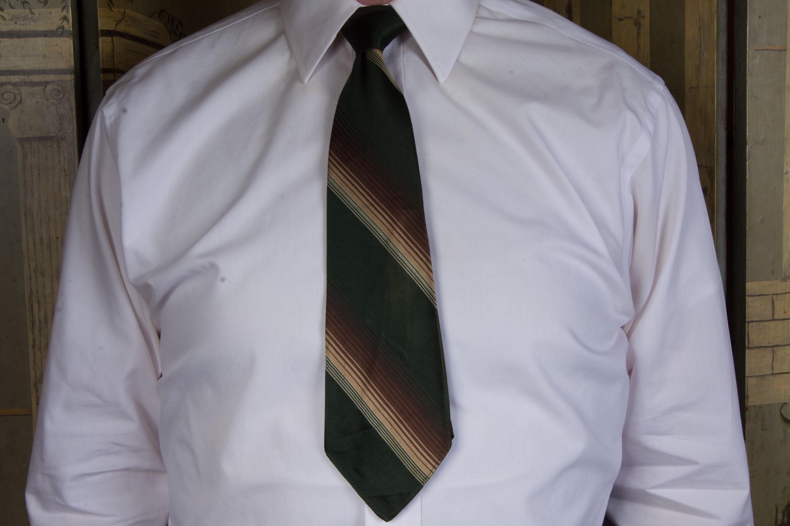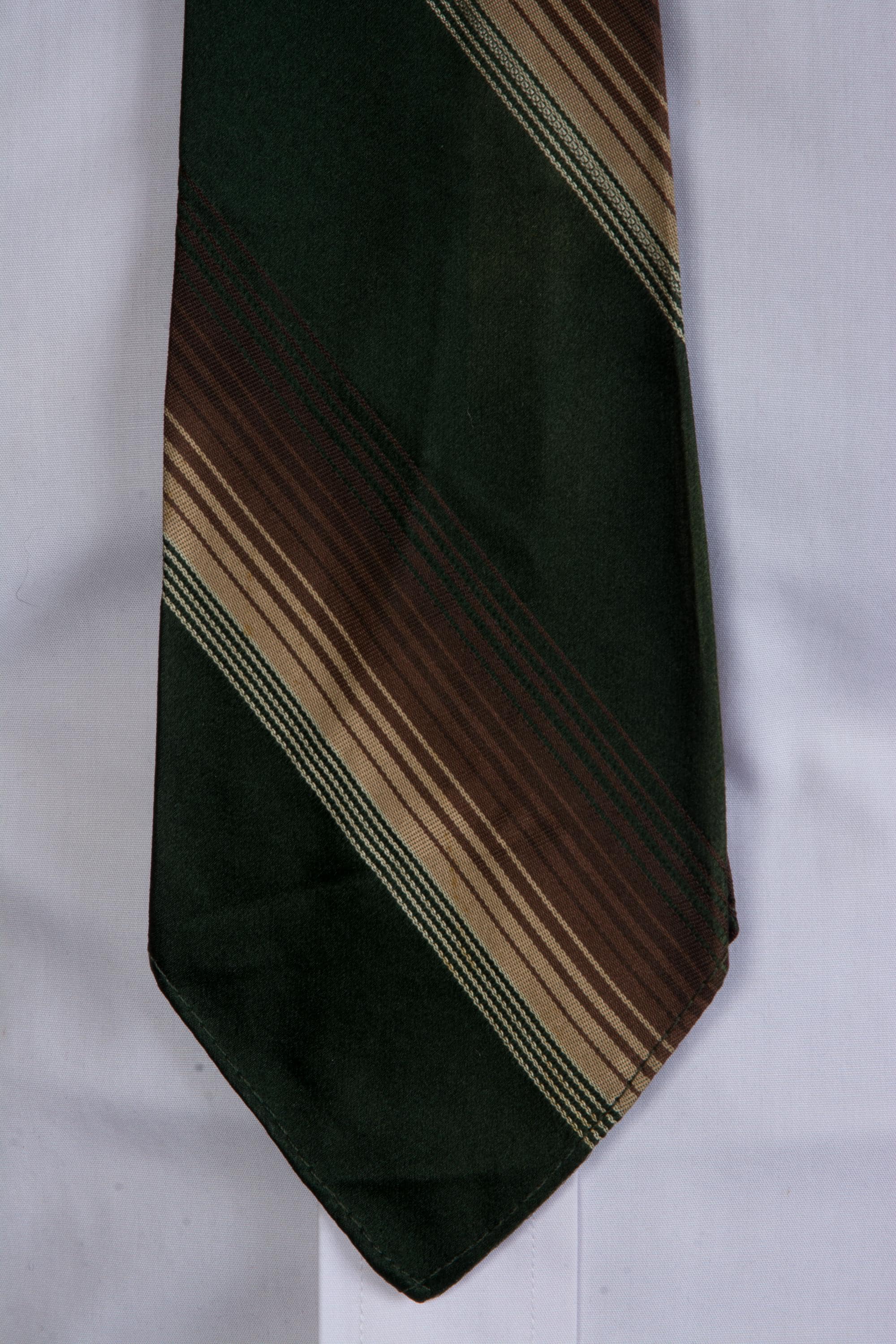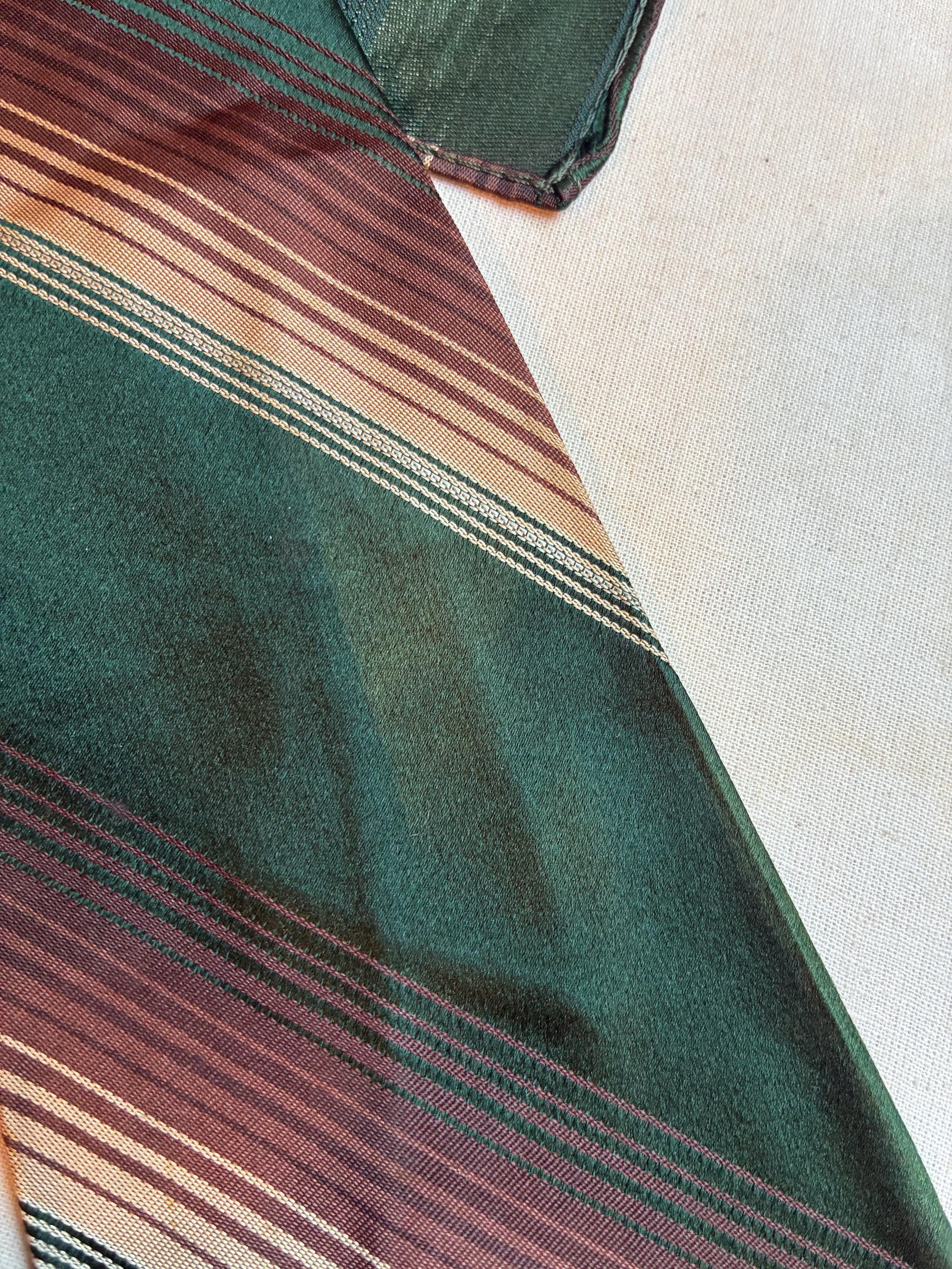 An excellent 1930s in a really lovely green silk, with a brocaded diagonal stripe motif, working as an ombre from white, to tan to dark brown. Cut on the bias, this is unlined, and can make a really excellent knot.