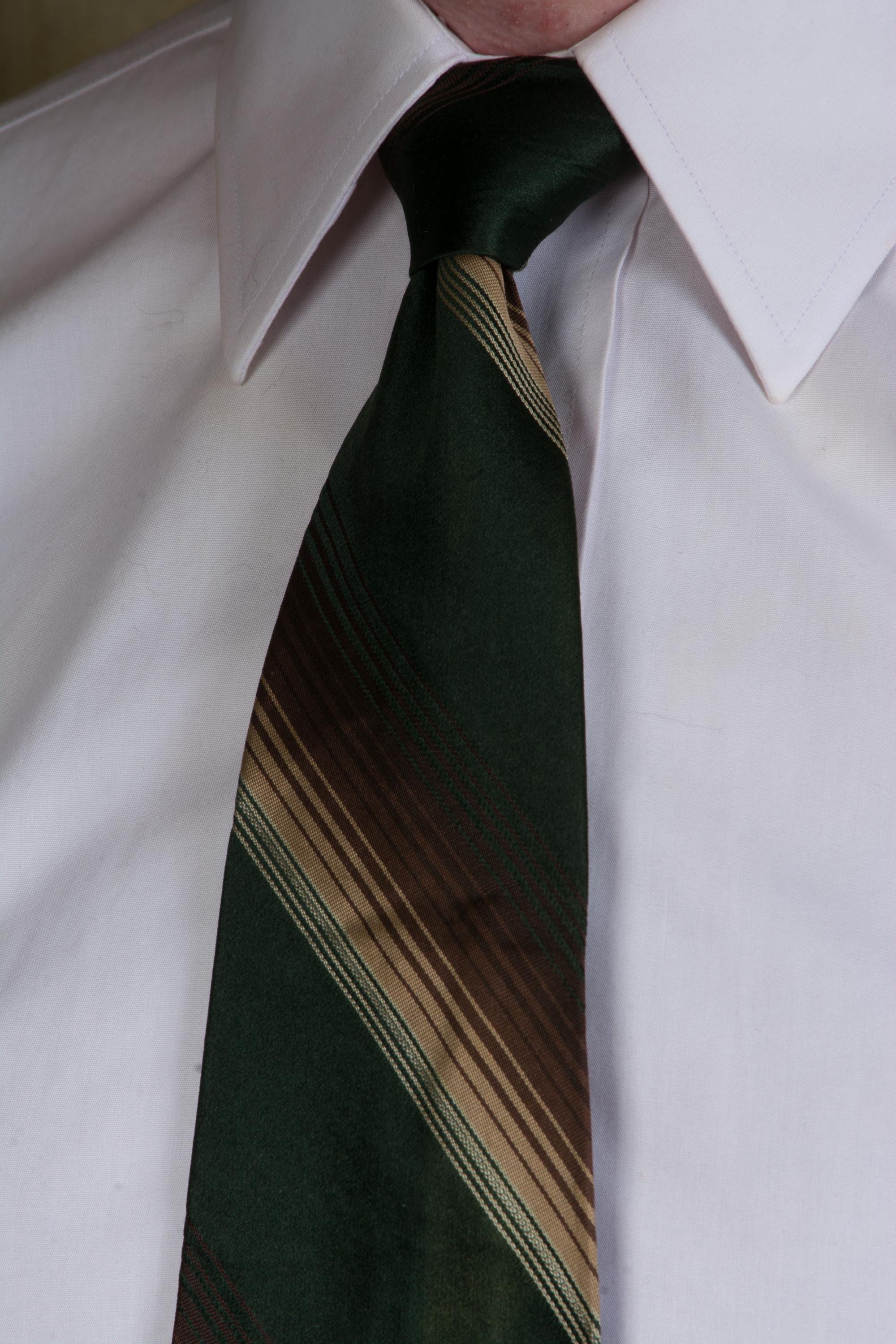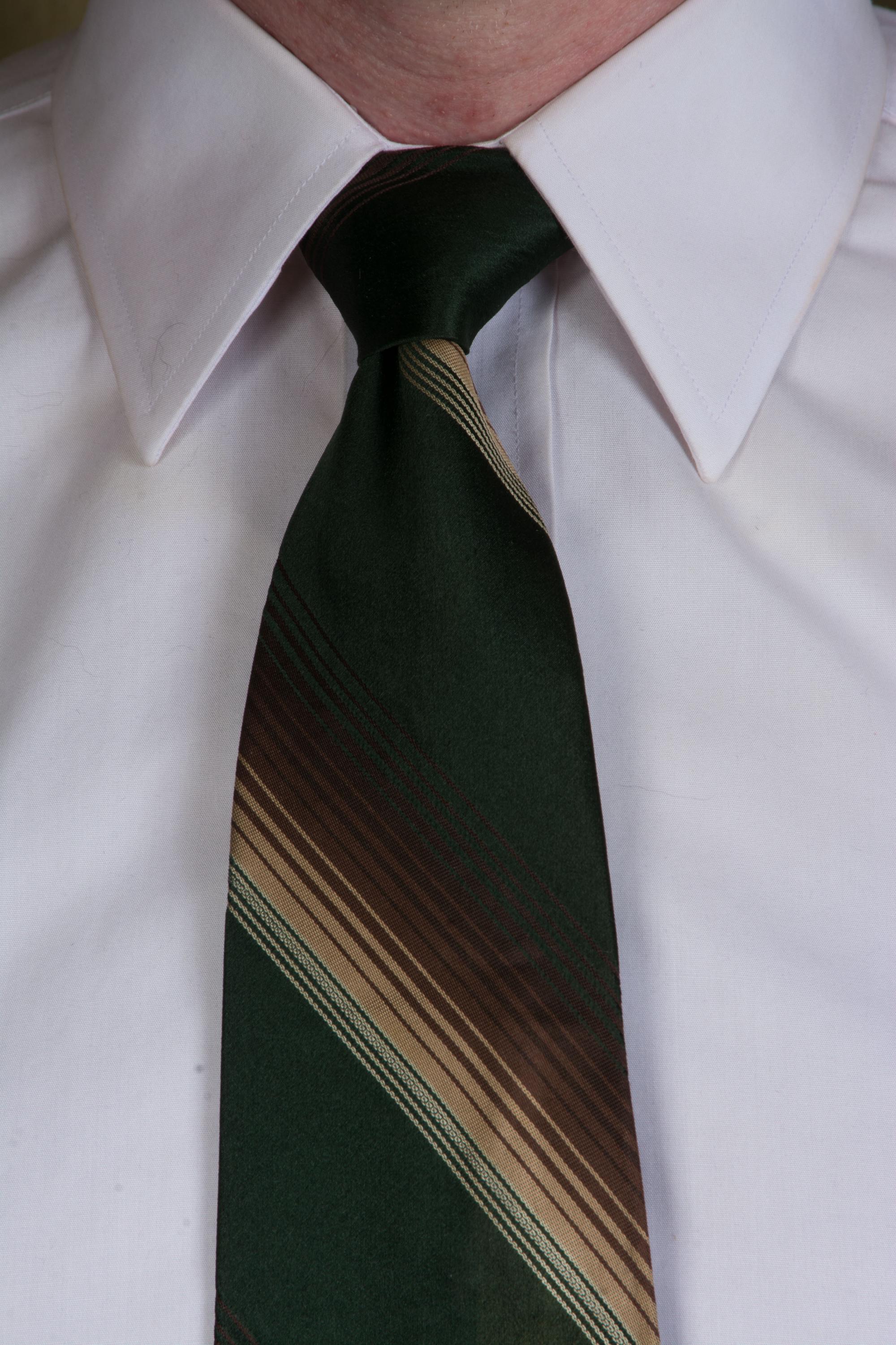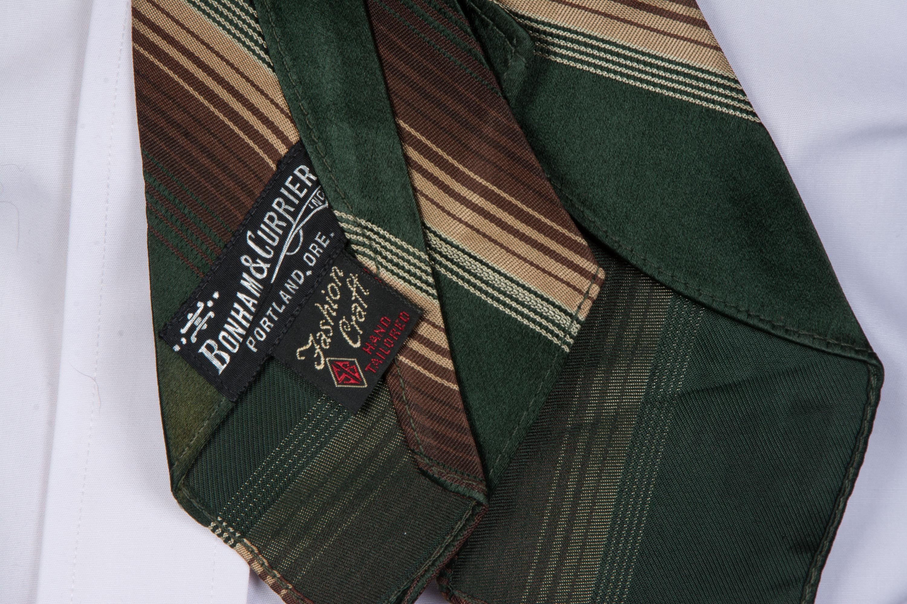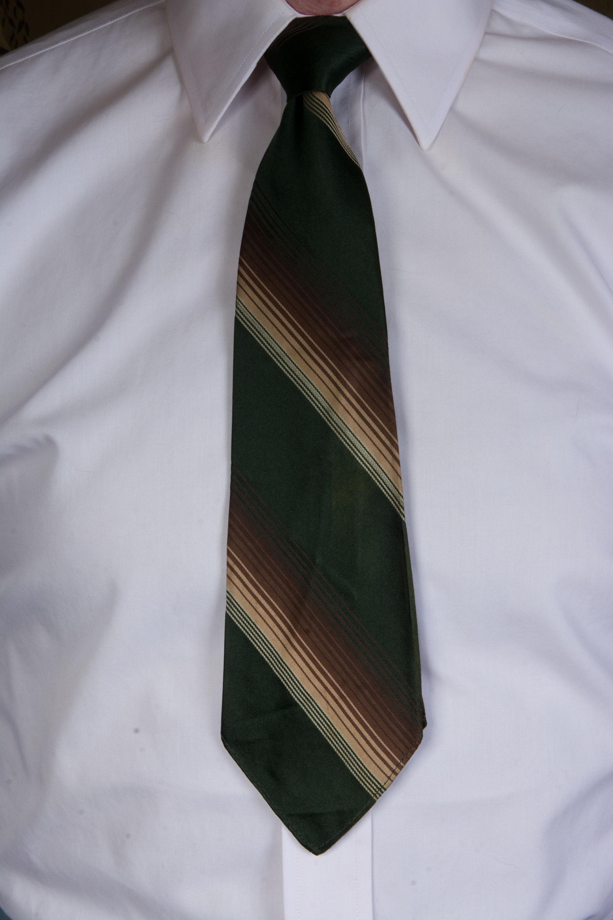 An excellent 1930s in a really lovely green silk, with a brocaded diagonal stripe motif, working as an ombre from white, to tan to dark brown. Cut on the bias, this is unlined, and can make a really excellent knot.