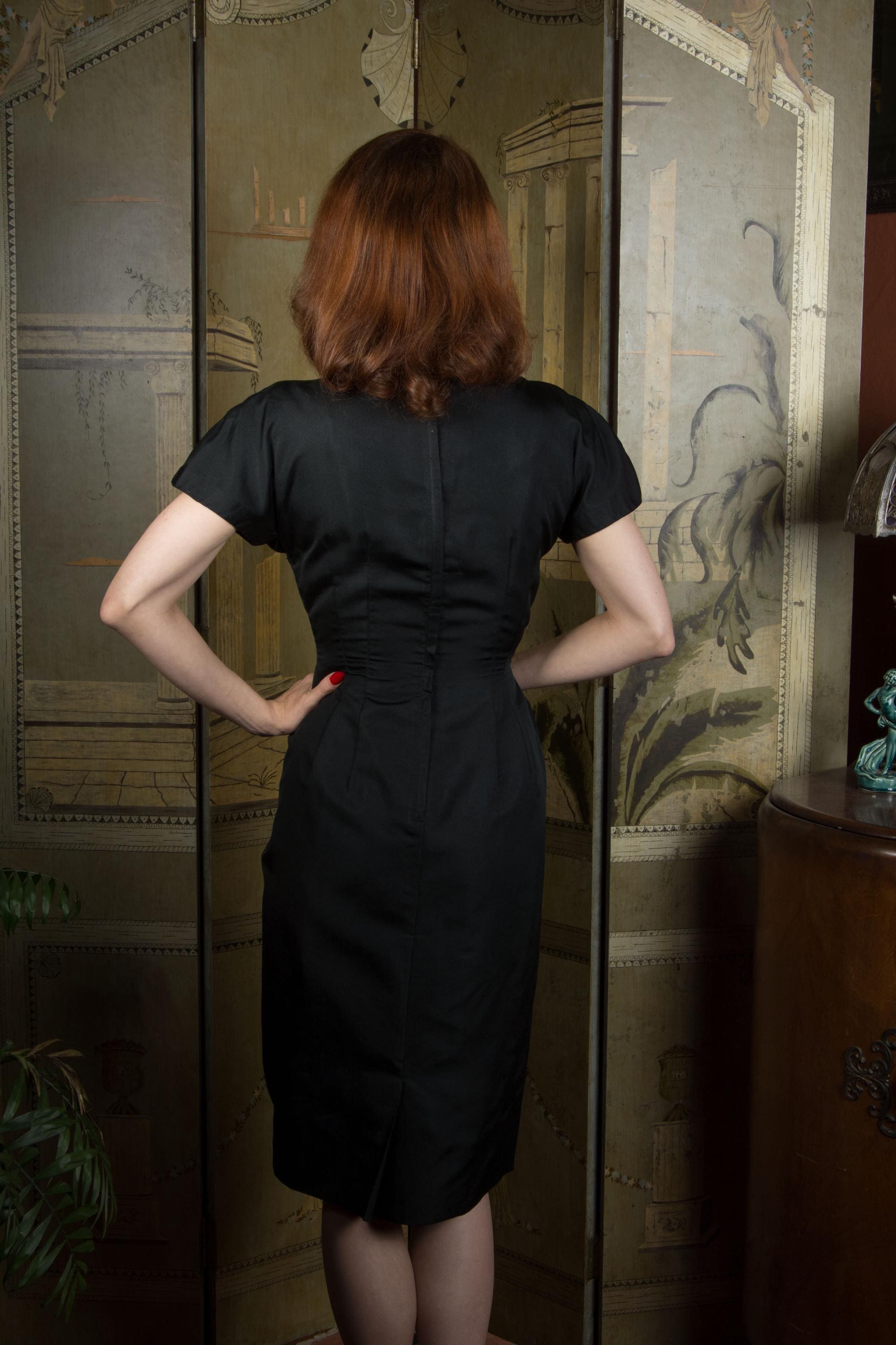 A sultry 1950s cocktail dress, this black silk baby features fabulous styling. The neckline is a unique funnel shape - wider at the neck, and curving softly to a narrow but very deep v, just enough to show tantalizing hints. The bust is pleated for fullness - it's made for curves. The bust is underlined by an empire seam, then long princess seaming shapes this dress close to your curves, running to the hips. A handpleated rosette is the finishing touch, just below that exceptional neckline. This sleekly styled dress closes up the back with a long metal zipper.