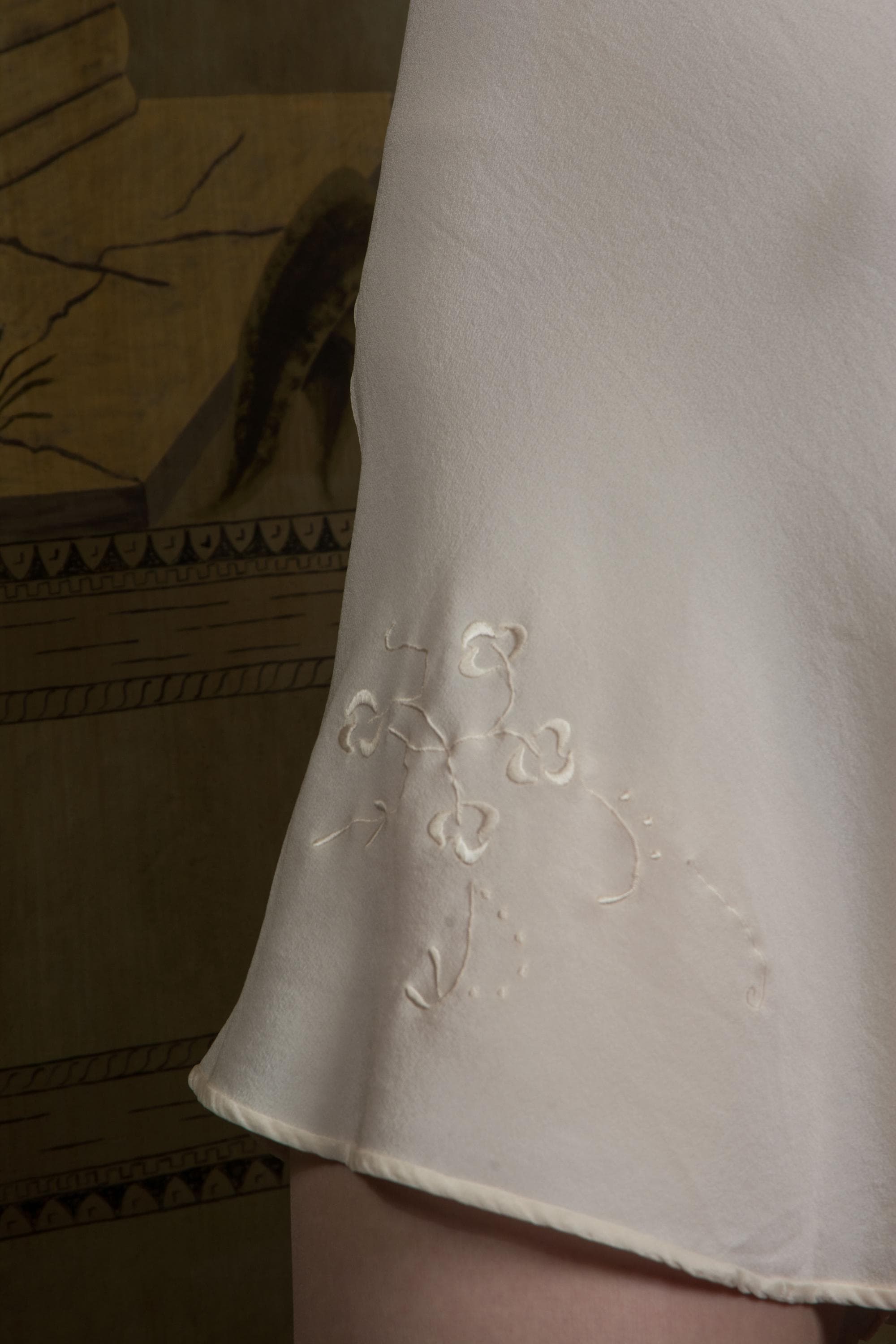Antique luxury lingerie, made by the renowned Mingtoy silk brand. These 1930s french knickers or tap pants are made of an incredibly soft silk crepe, cut on the bias. These have sides that are higher than the crotch when laid flat. Glossy silk embroidery embellishes each leg. They close on the side with buttons.