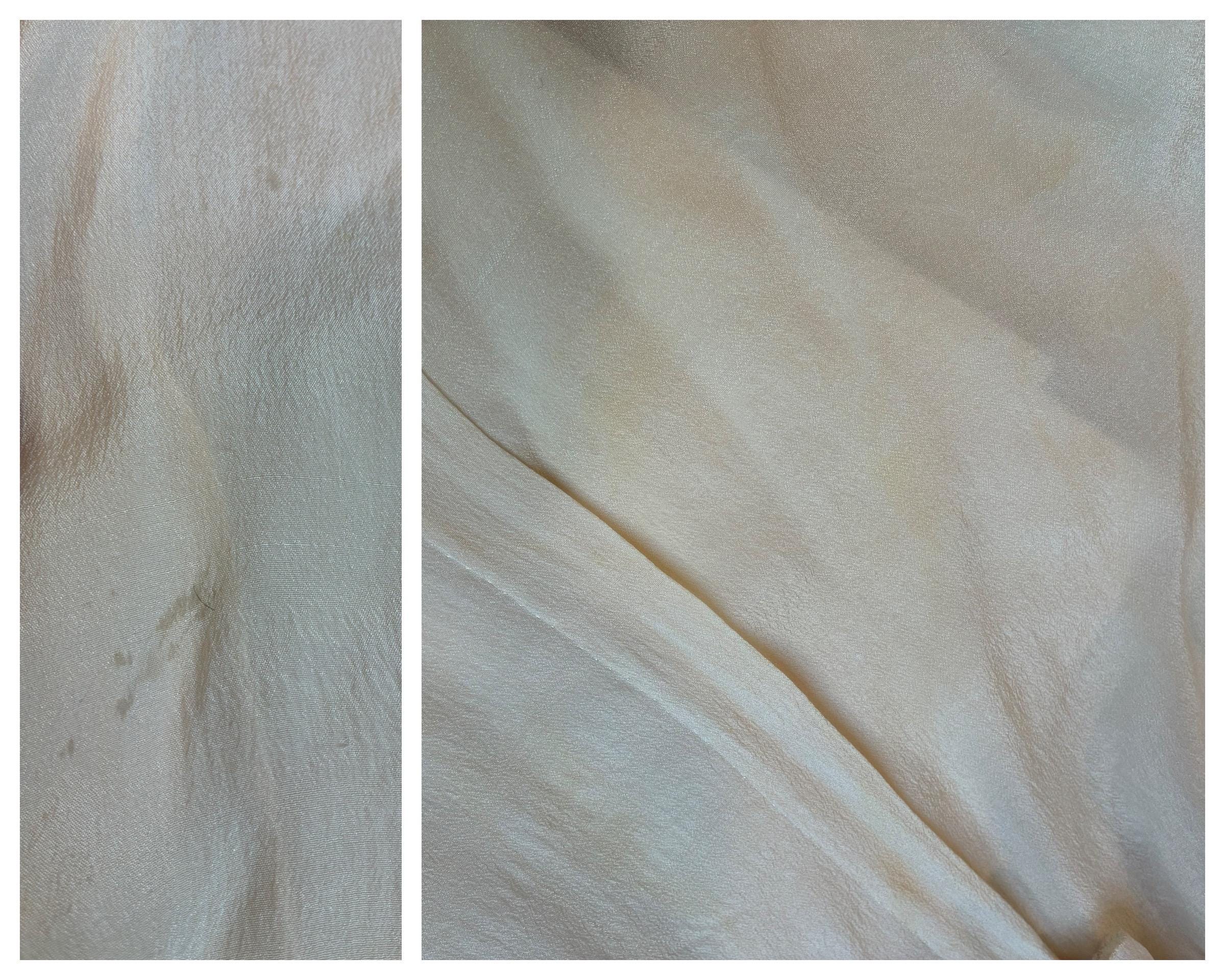 This blouse is has been gently hand laundered and is ready to wear. The underarms are very slightly yellowed, but you'd only notice when folding to compare with another area. There's other subtle yellowing on the front - see photos. You sort of have to be looking for it. There's some spots on the lower right front (shown) that are from some heat gun glue that I managed to remove. I find no other issues to note.