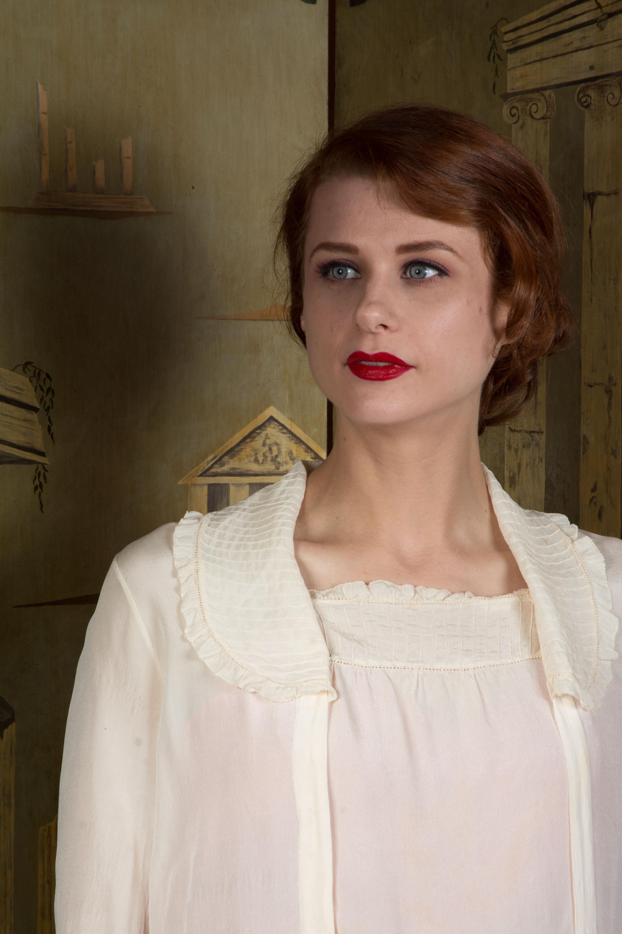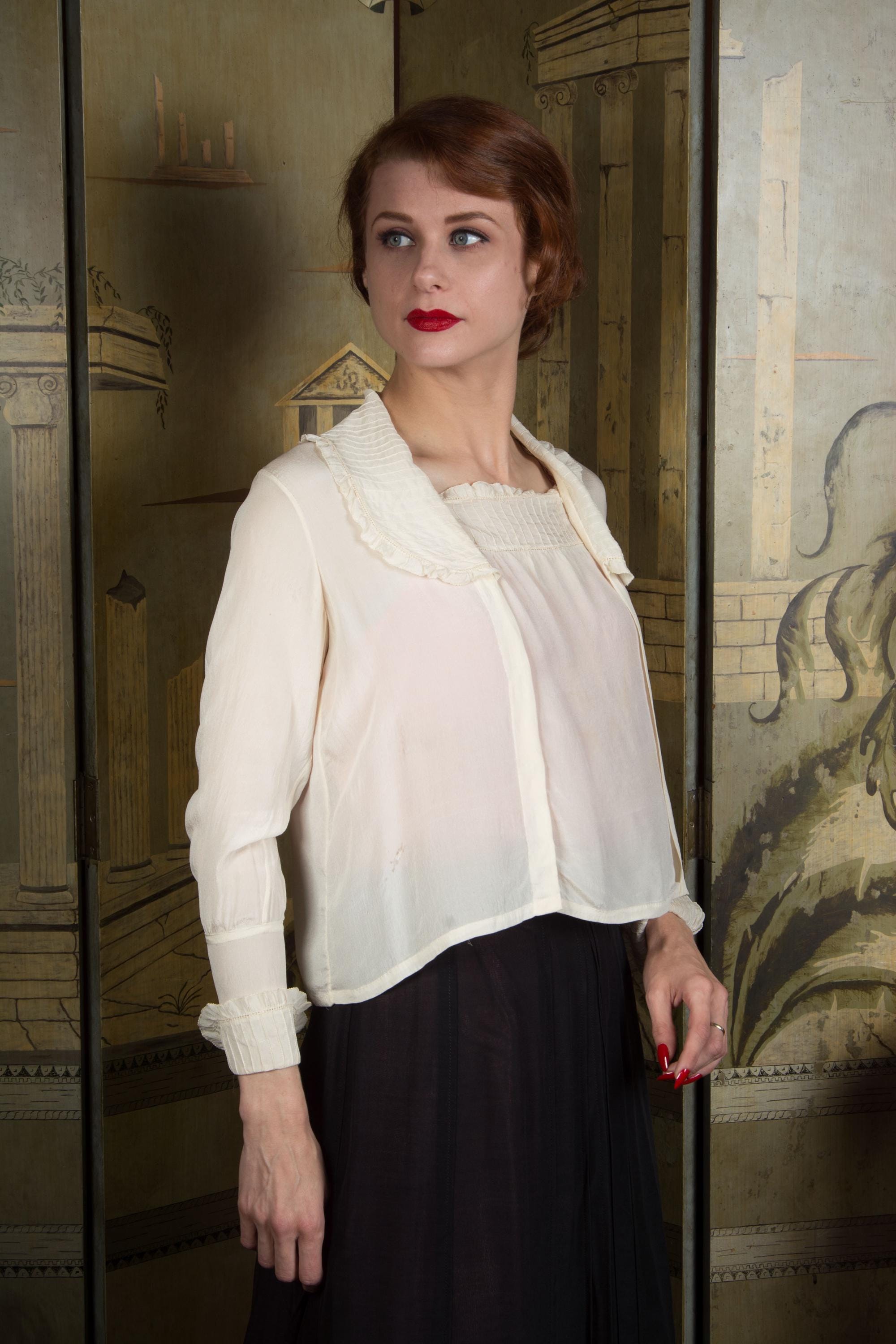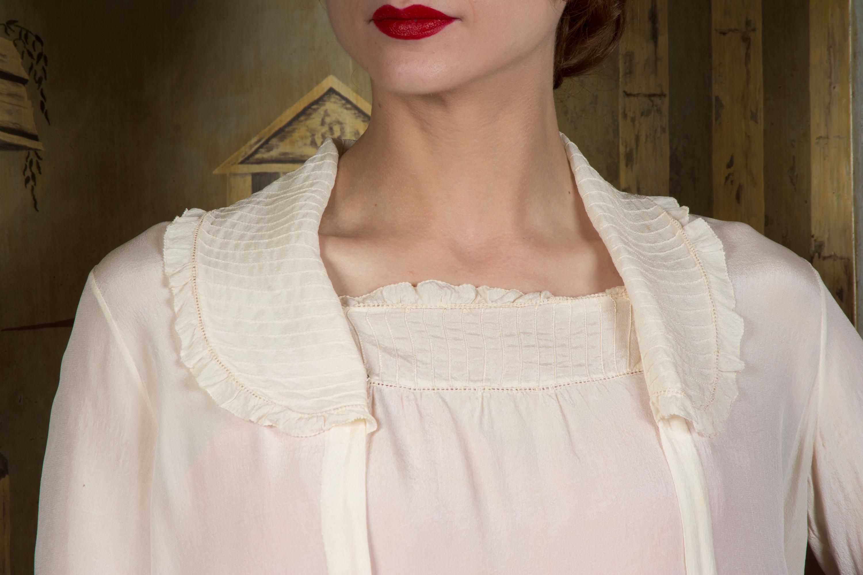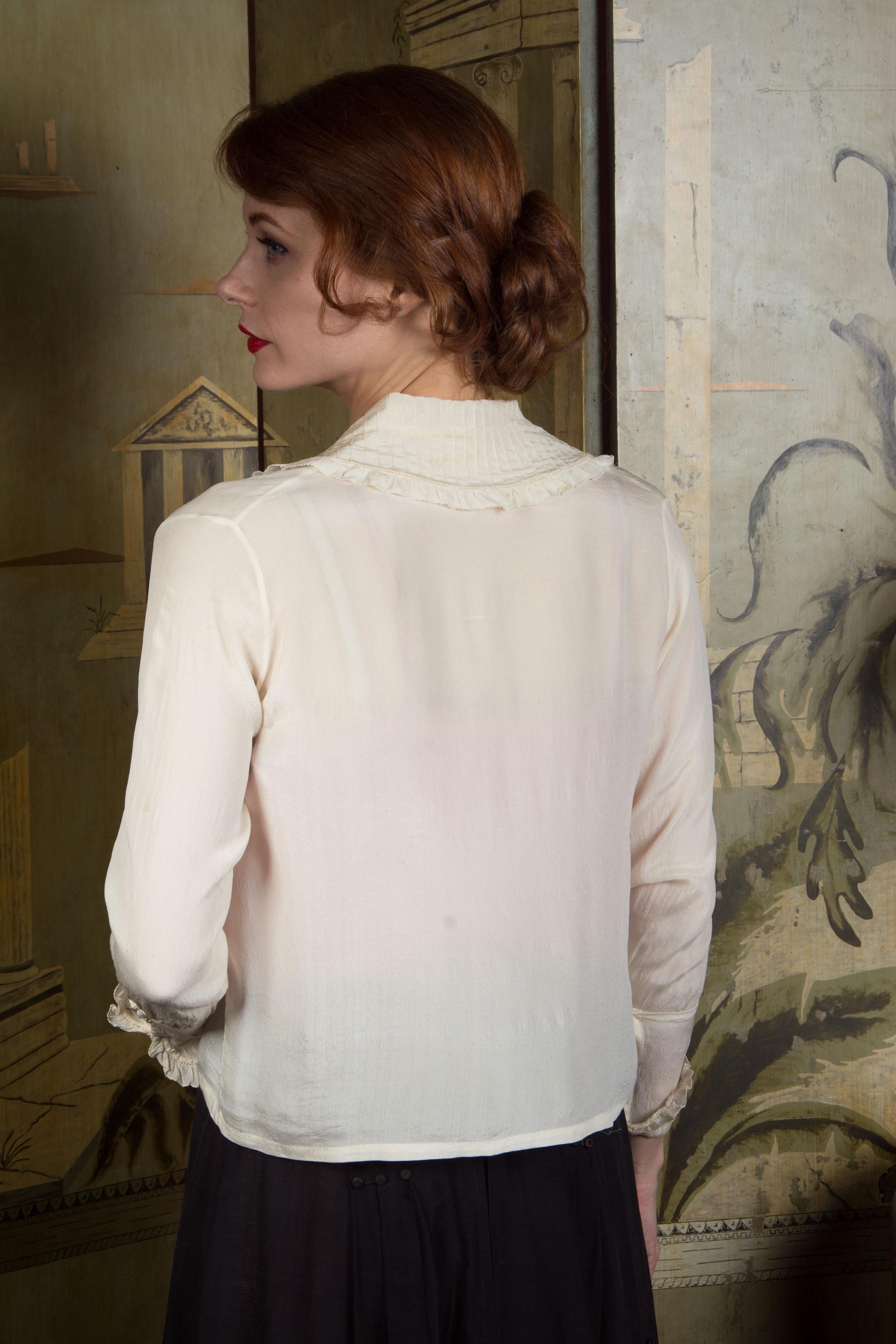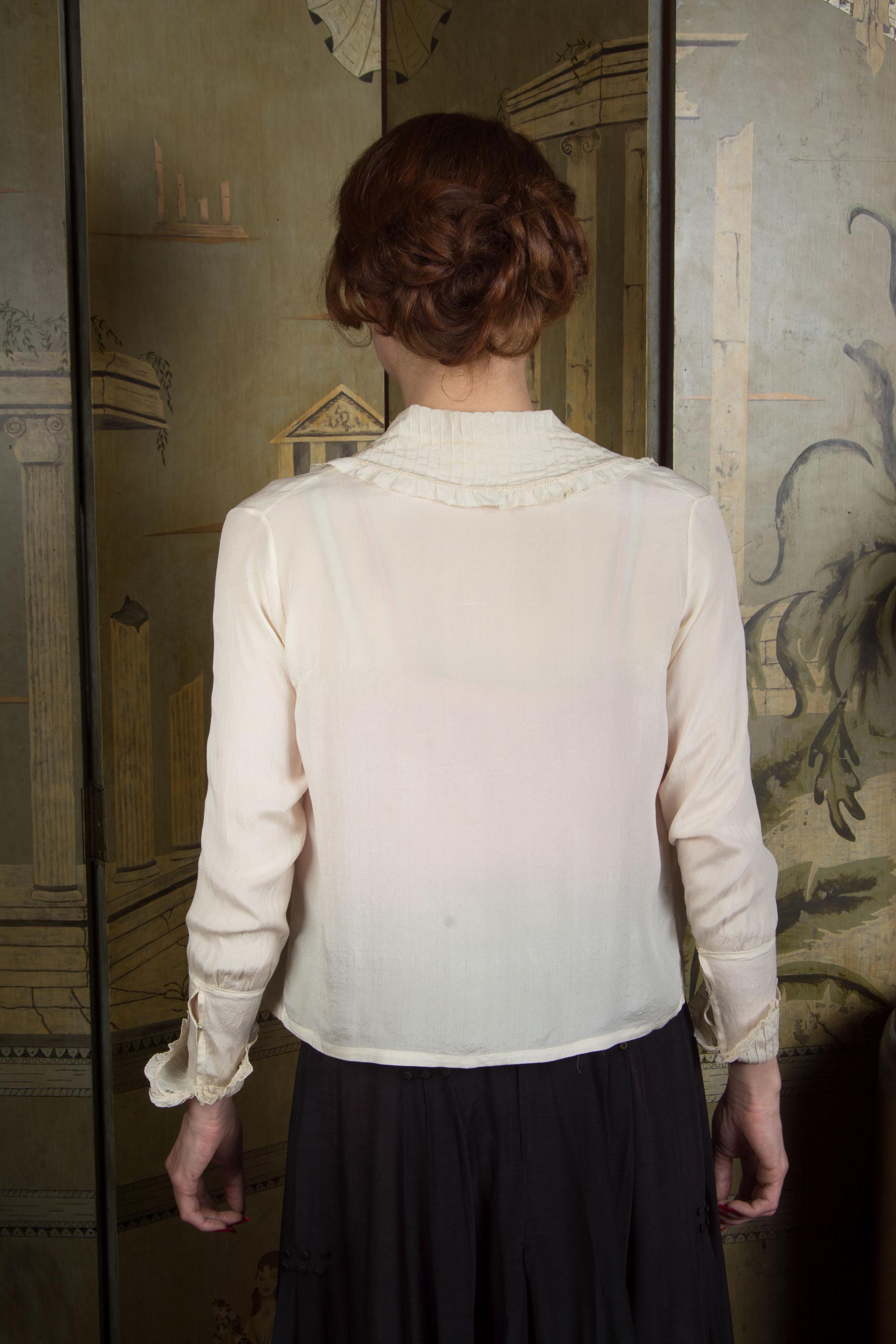 Antique Edwardian blouse in the most lightweight, ultra sheer and *soft* ivory silk crepe. This diaphanous piece is finished with bands of pintucks and lace faggot stripes along the neckline, collar and cuffs collar. The cut is a squared middy cut with snaps to close hidden along the right front pleat. The sleeves are full length and have turned cuffs that match the collar.