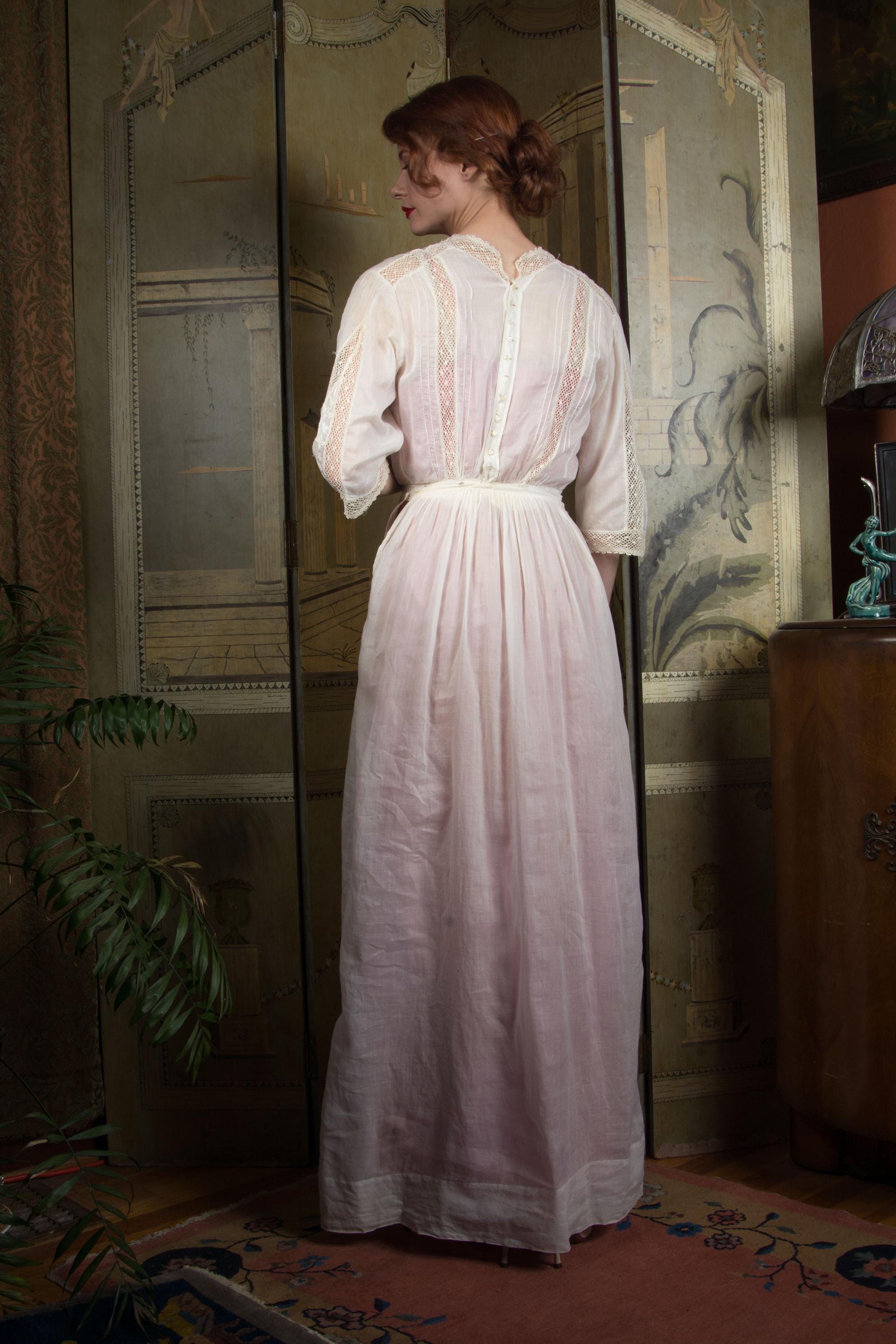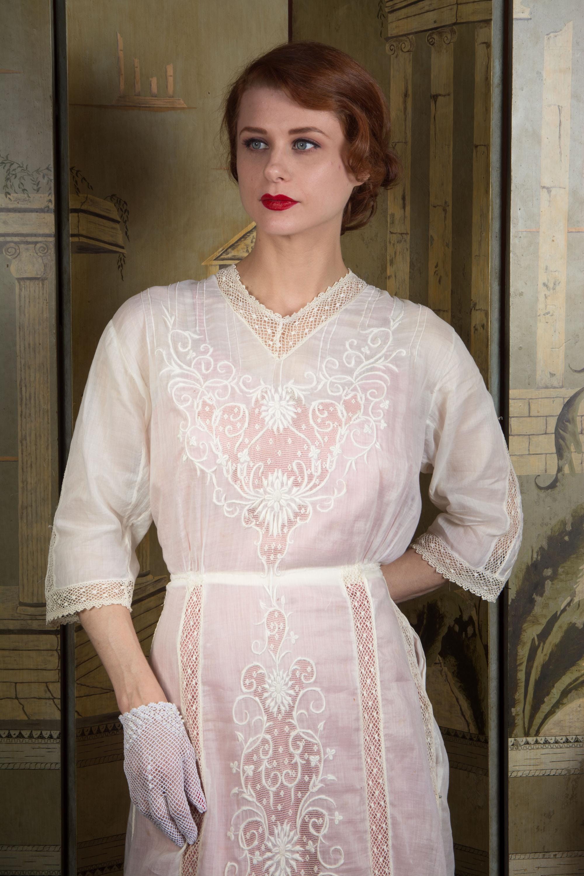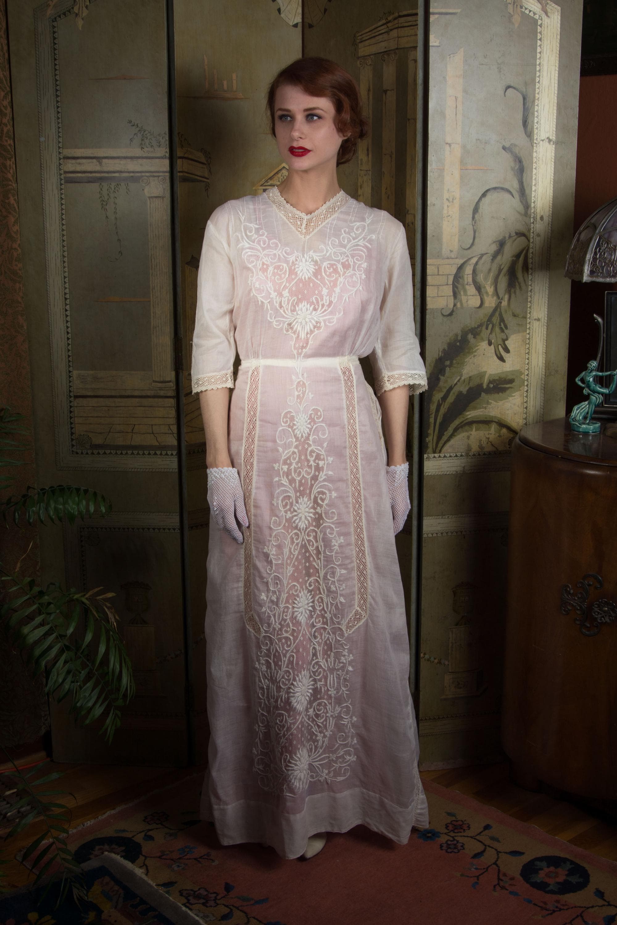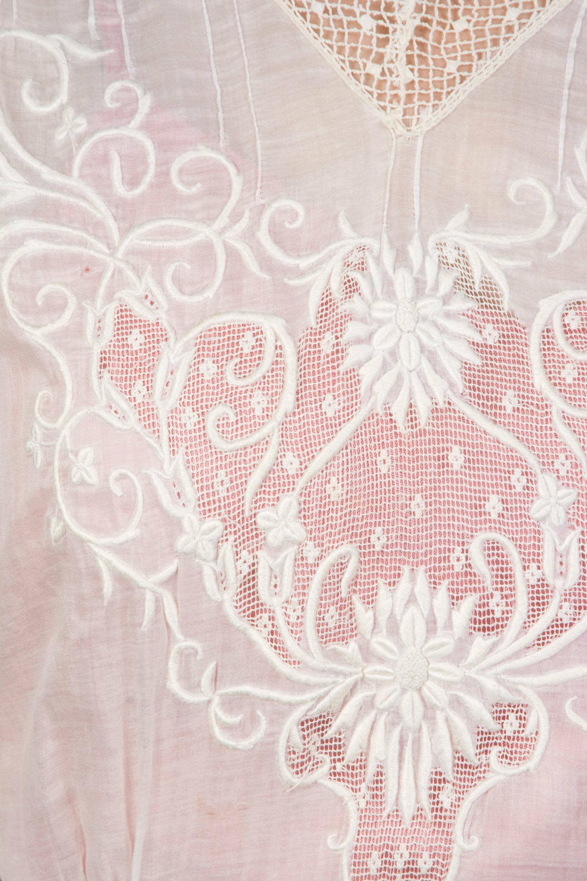 An ethereal Edwardian dress of light soft lingerie cotton and fine open lace with embroidery. A classic earlier 1910s piece, this has a high, but not extended, neckline, which is trimmed with a net lace. The same net runs down the sides of the skirt. At the center of the bodice and skirt both is large insets of filet lace, which is covered in expert floral white work that continues onto the cotton. The detailing is echoed on the sleeves. This closes down the back of the bodice with buttons, then across the left side of the waist with snaps, and hooks down the left side to the hip.