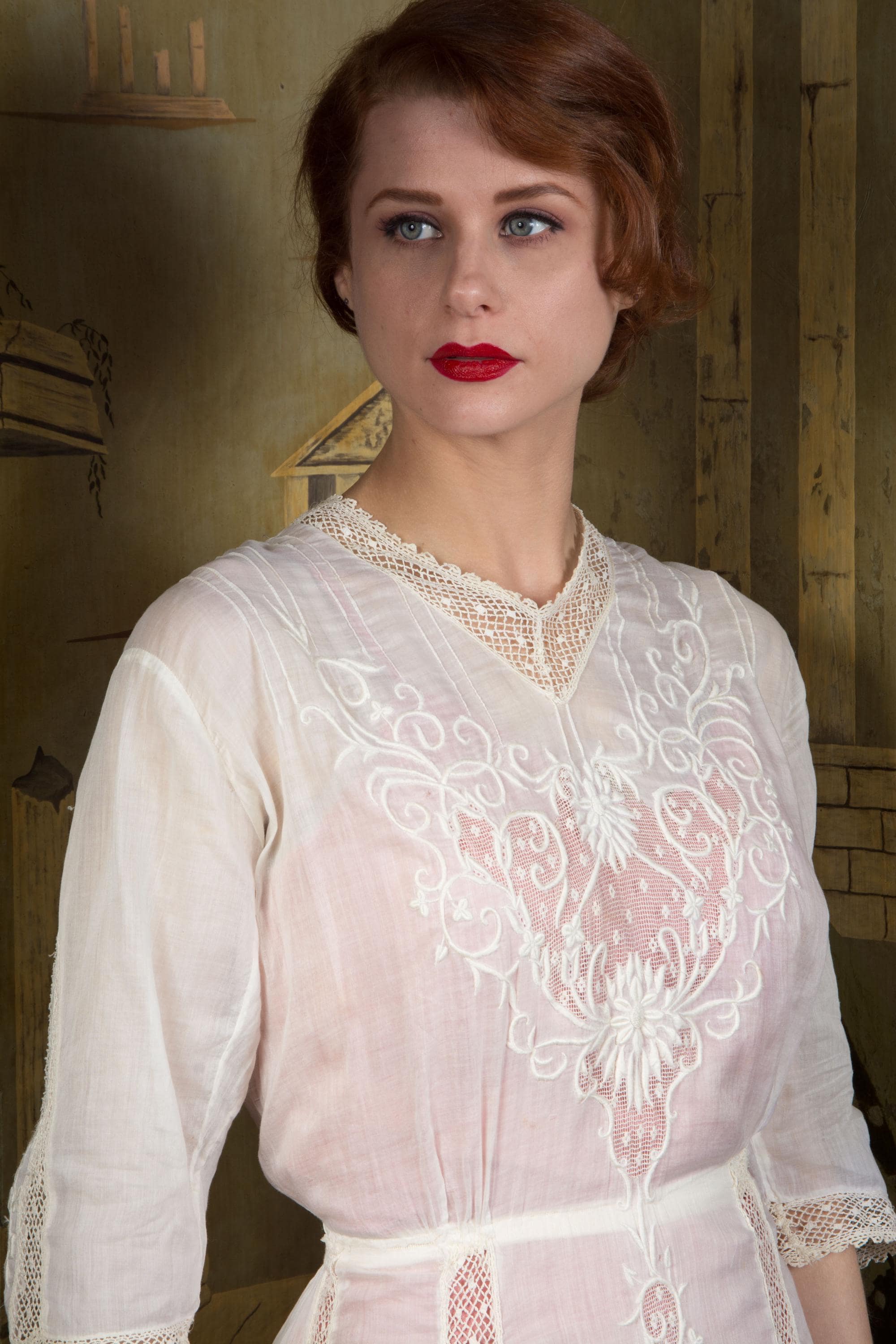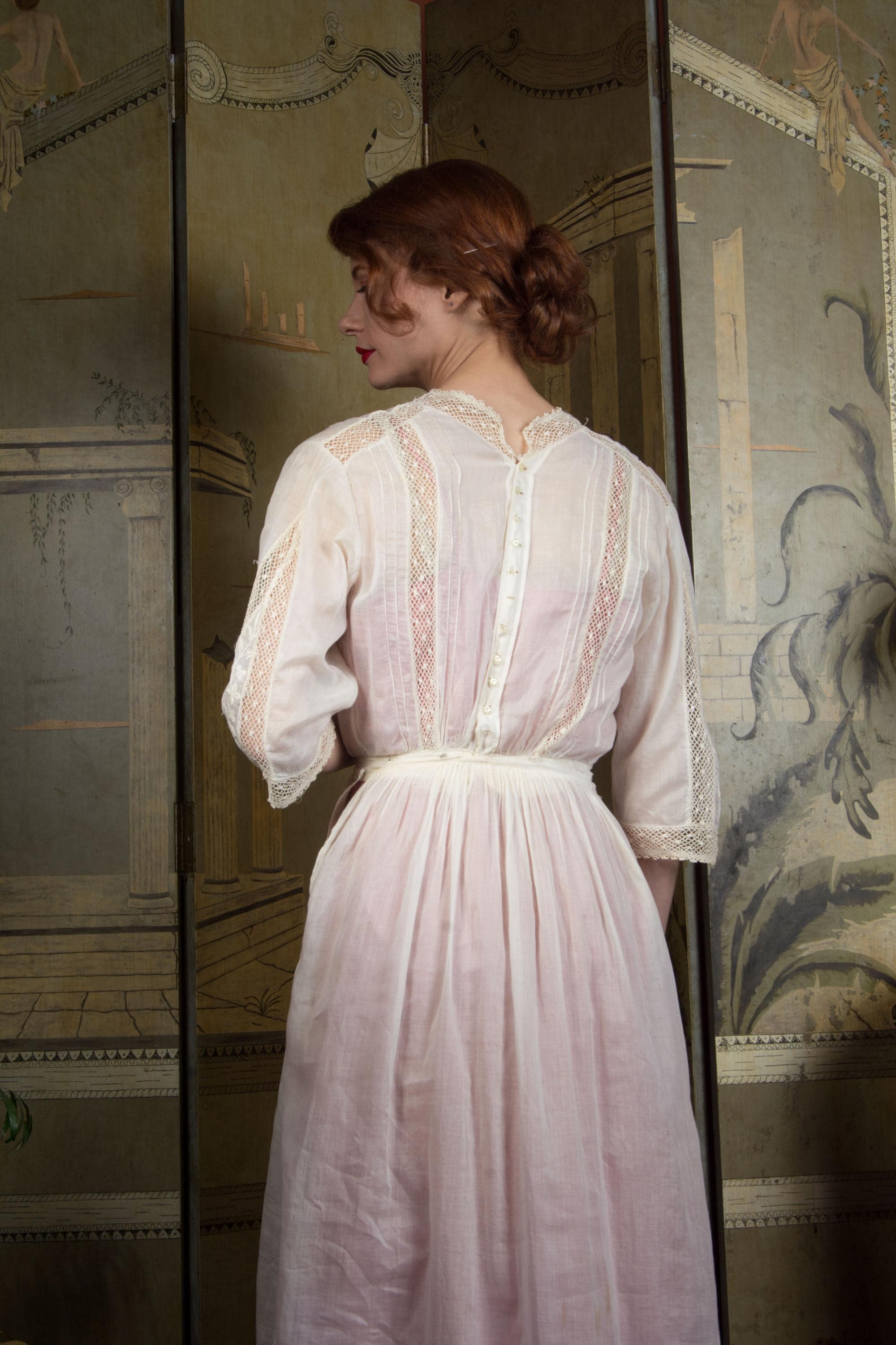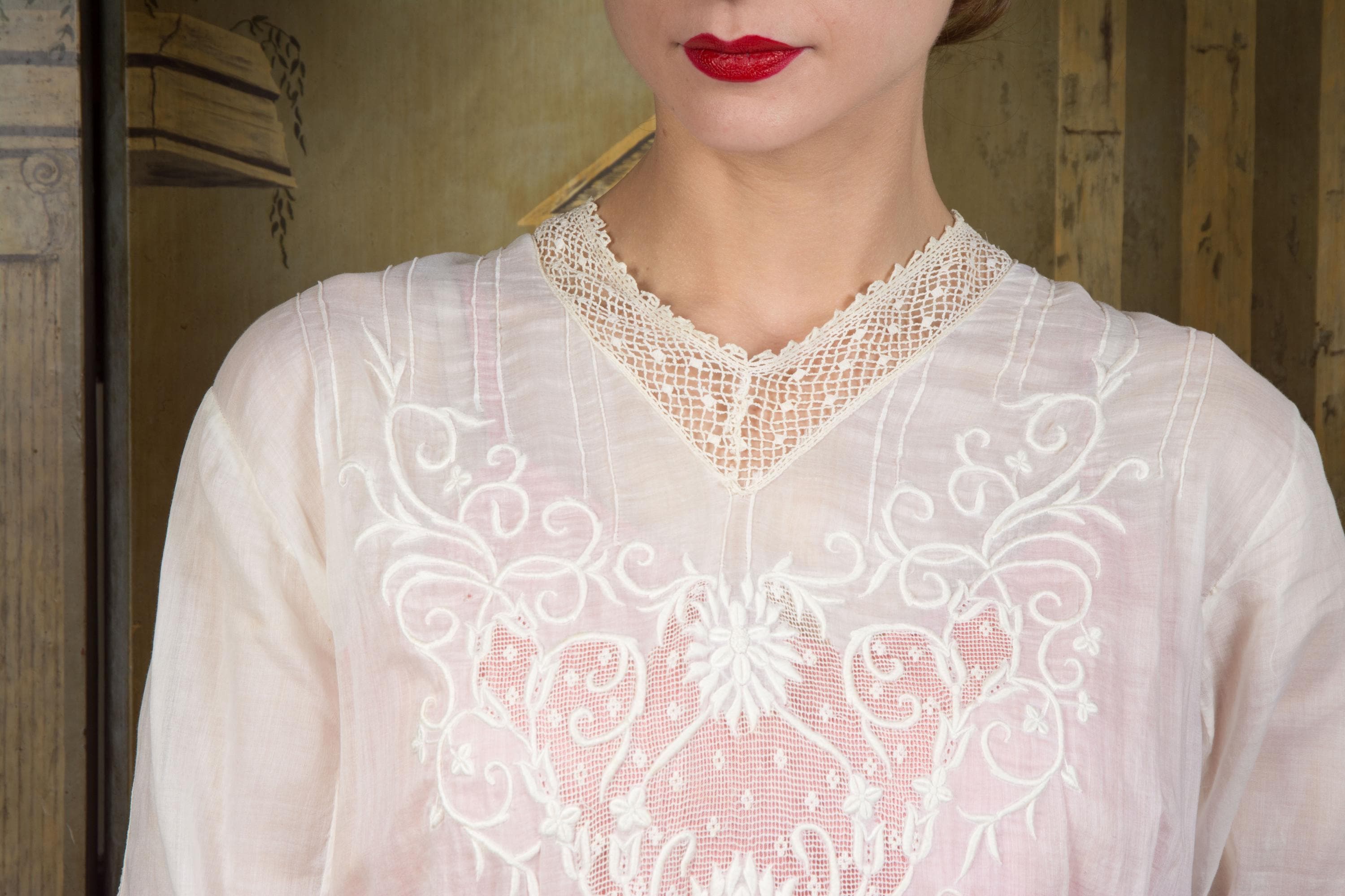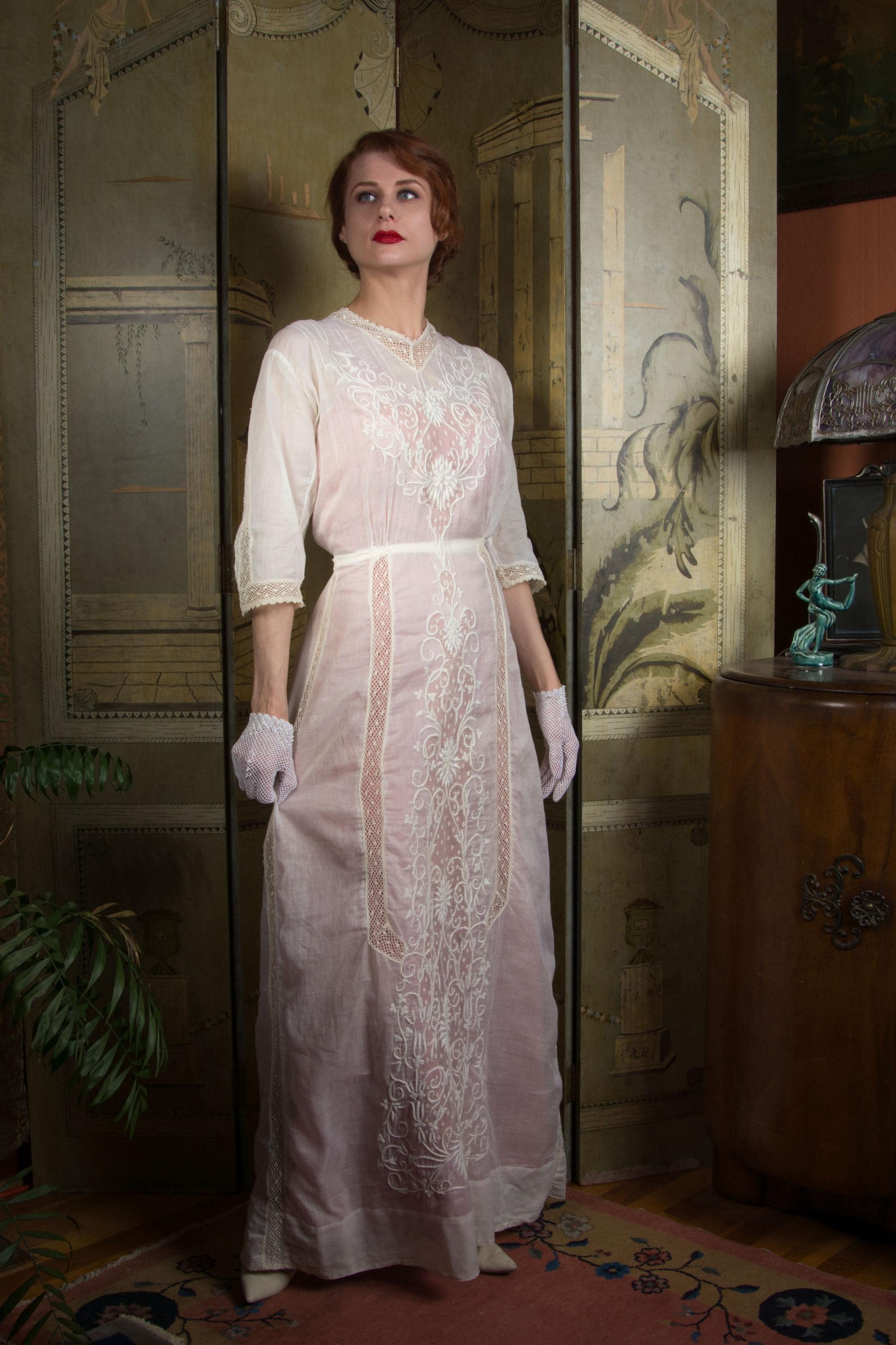 An ethereal Edwardian dress of light soft lingerie cotton and fine open lace with embroidery. A classic earlier 1910s piece, this has a high, but not extended, neckline, which is trimmed with a net lace. The same net runs down the sides of the skirt. At the center of the bodice and skirt both is large insets of filet lace, which is covered in expert floral white work that continues onto the cotton. The detailing is echoed on the sleeves. This closes down the back of the bodice with buttons, then across the left side of the waist with snaps, and hooks down the left side to the hip.