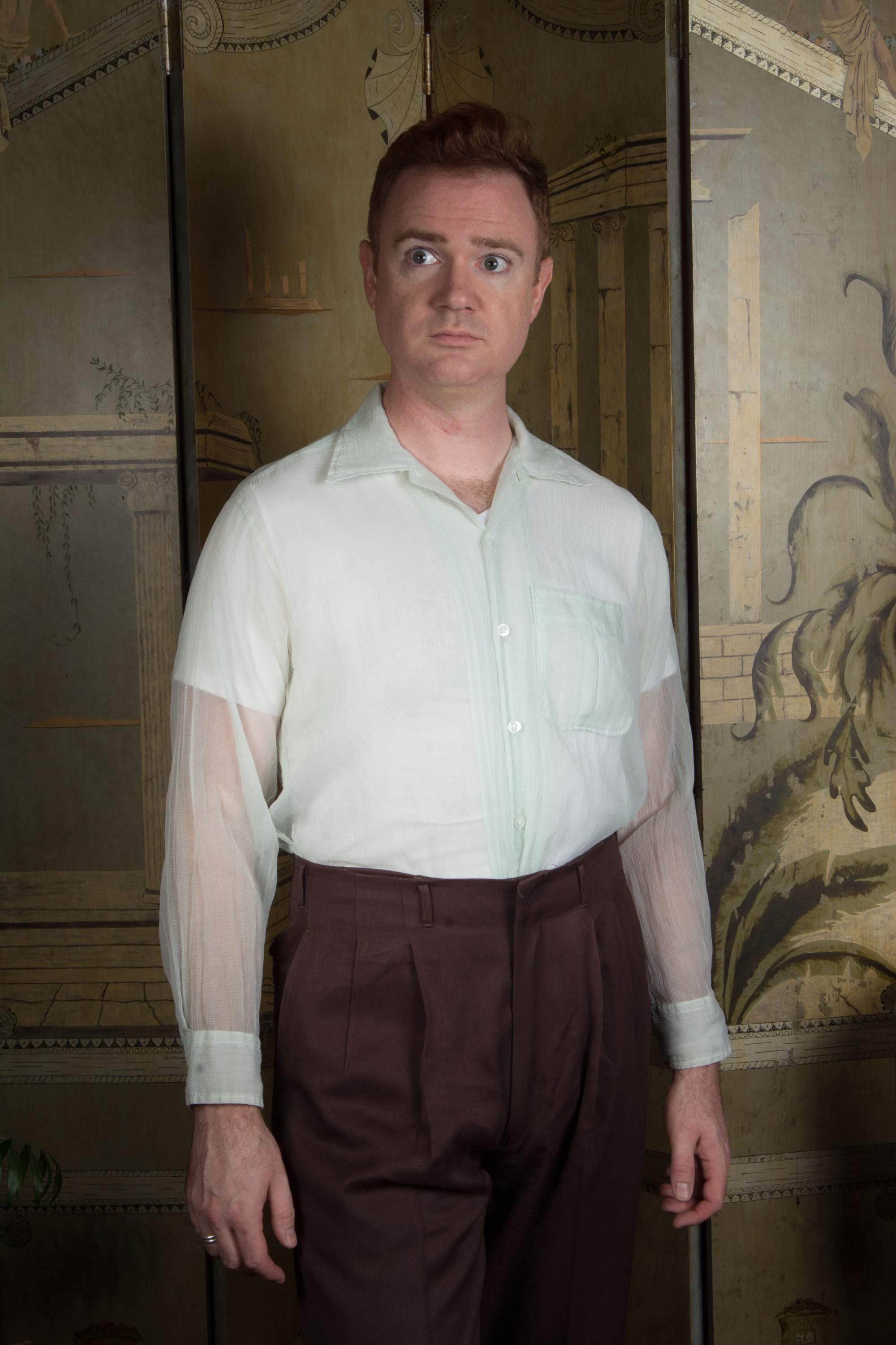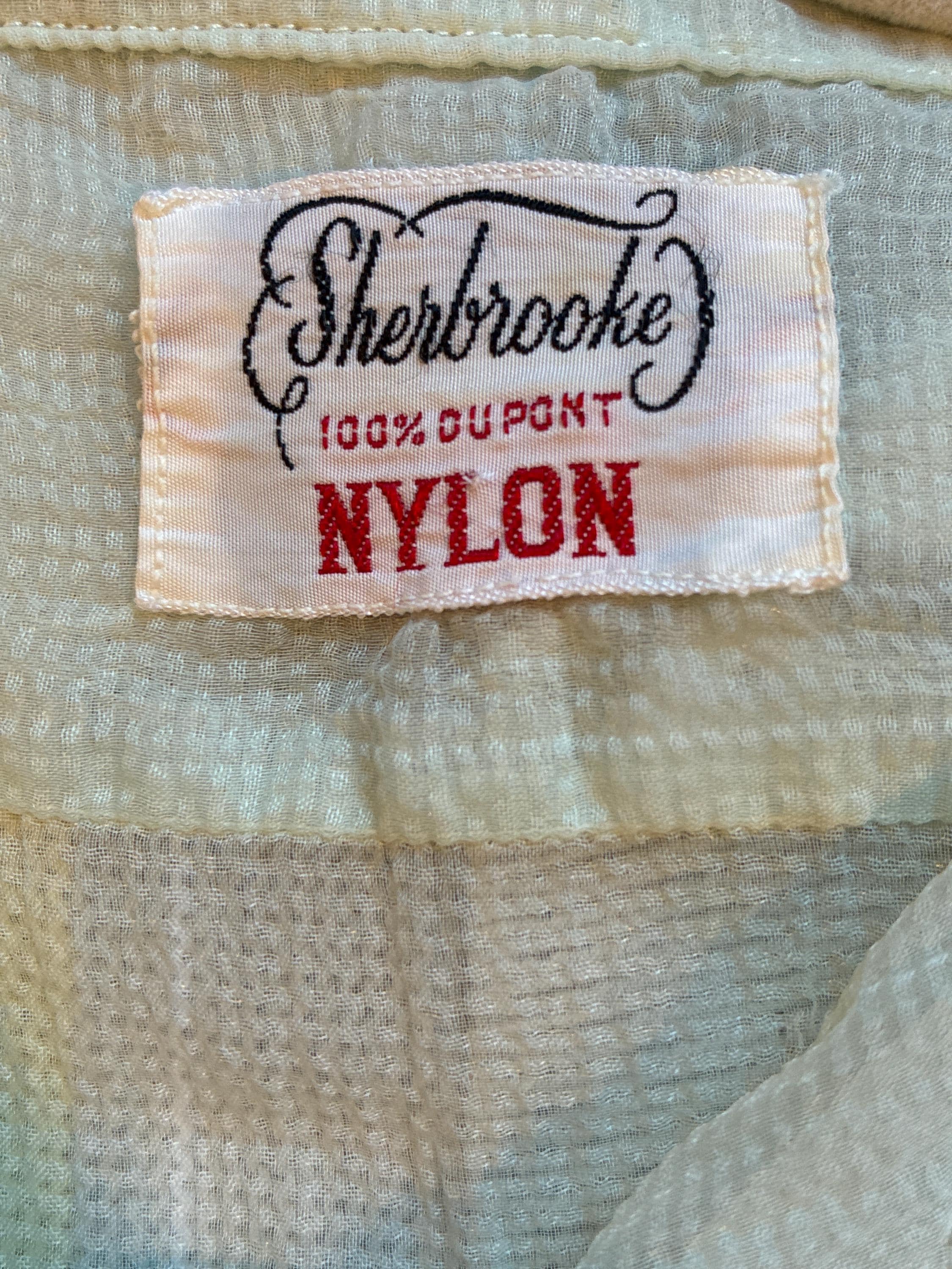 Vintage 1950s ultra sheer nylon seersucker from Sherbrook in a whisper pale mint green hue. These are harder to find in long sleeve versions. Sheer enough to see every detail of your tattoos through! Has a button up collar and dual patch pockets. The seersucker is a smaller weave, creating a micro check texture. A summer rock and roll classic.