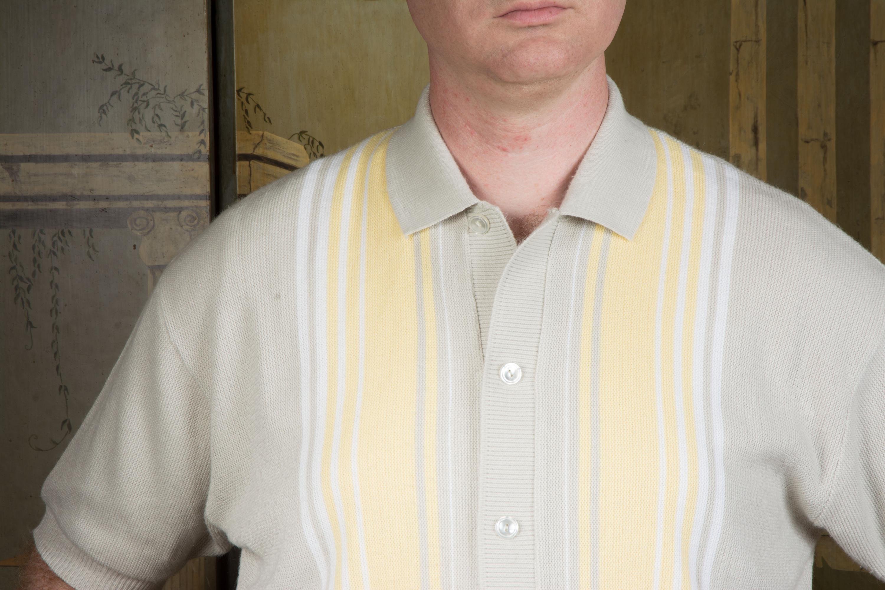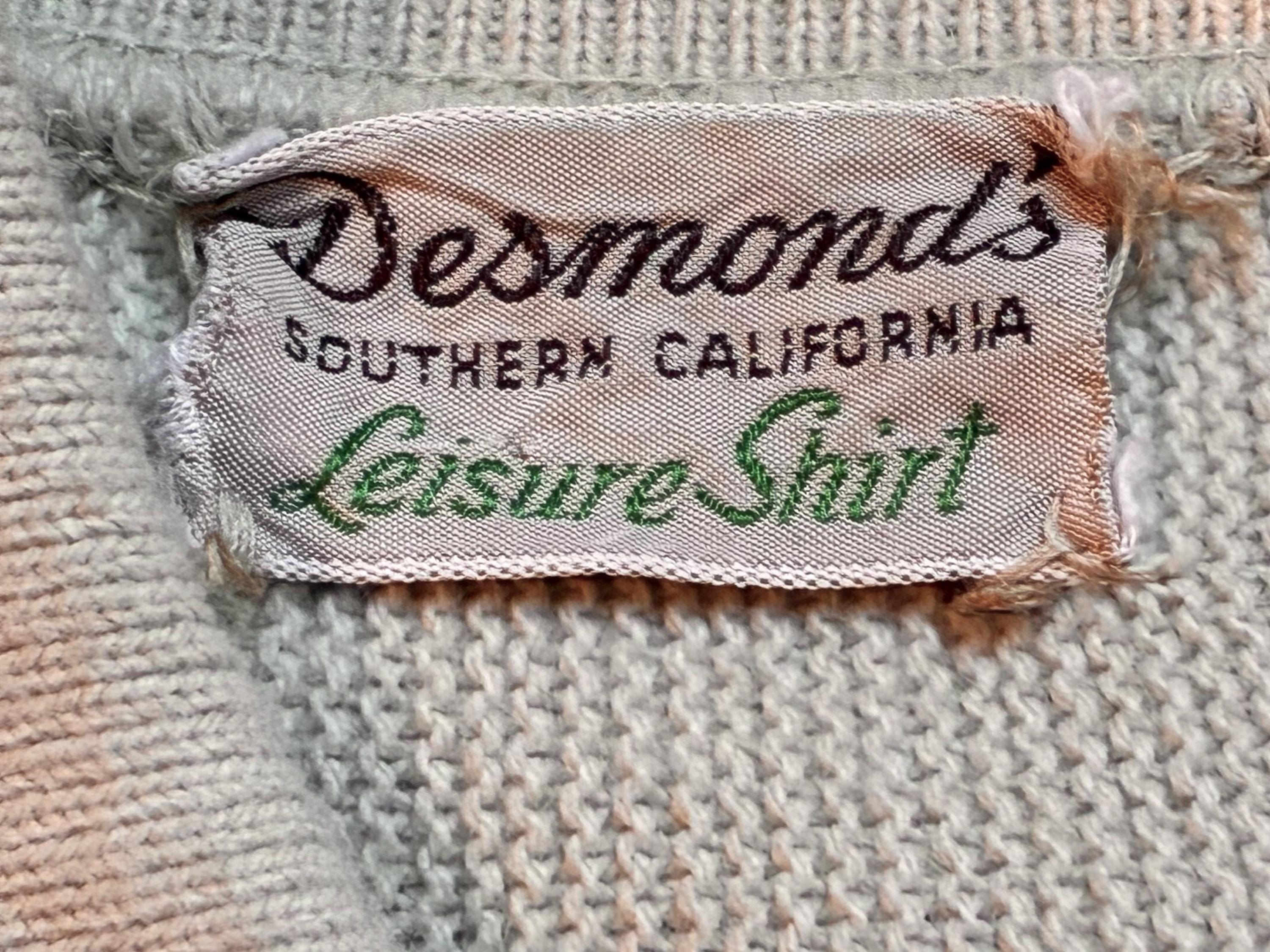 A classic vintage 1960s cardigan style knit shirt in pale grey with white and yellow striped panels at front. Definitely made of orlon acrylic, so ideal for those sensitive to wool. This has a short banded collar, banded short sleeves and a banded hem. The bright tones are a grey choice to bring a little sunshine to your autumn style, or warm up into spring.