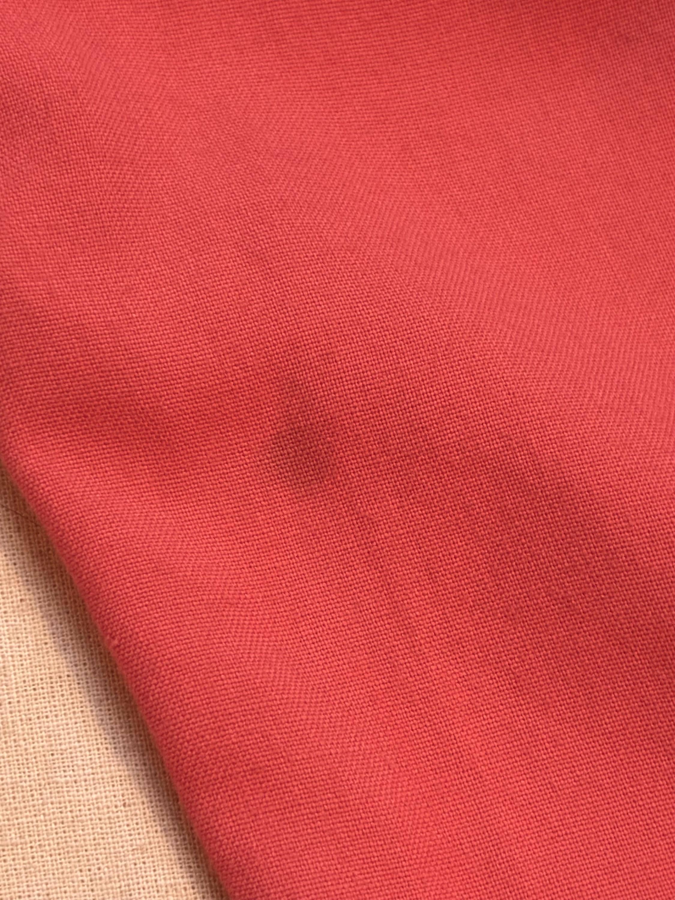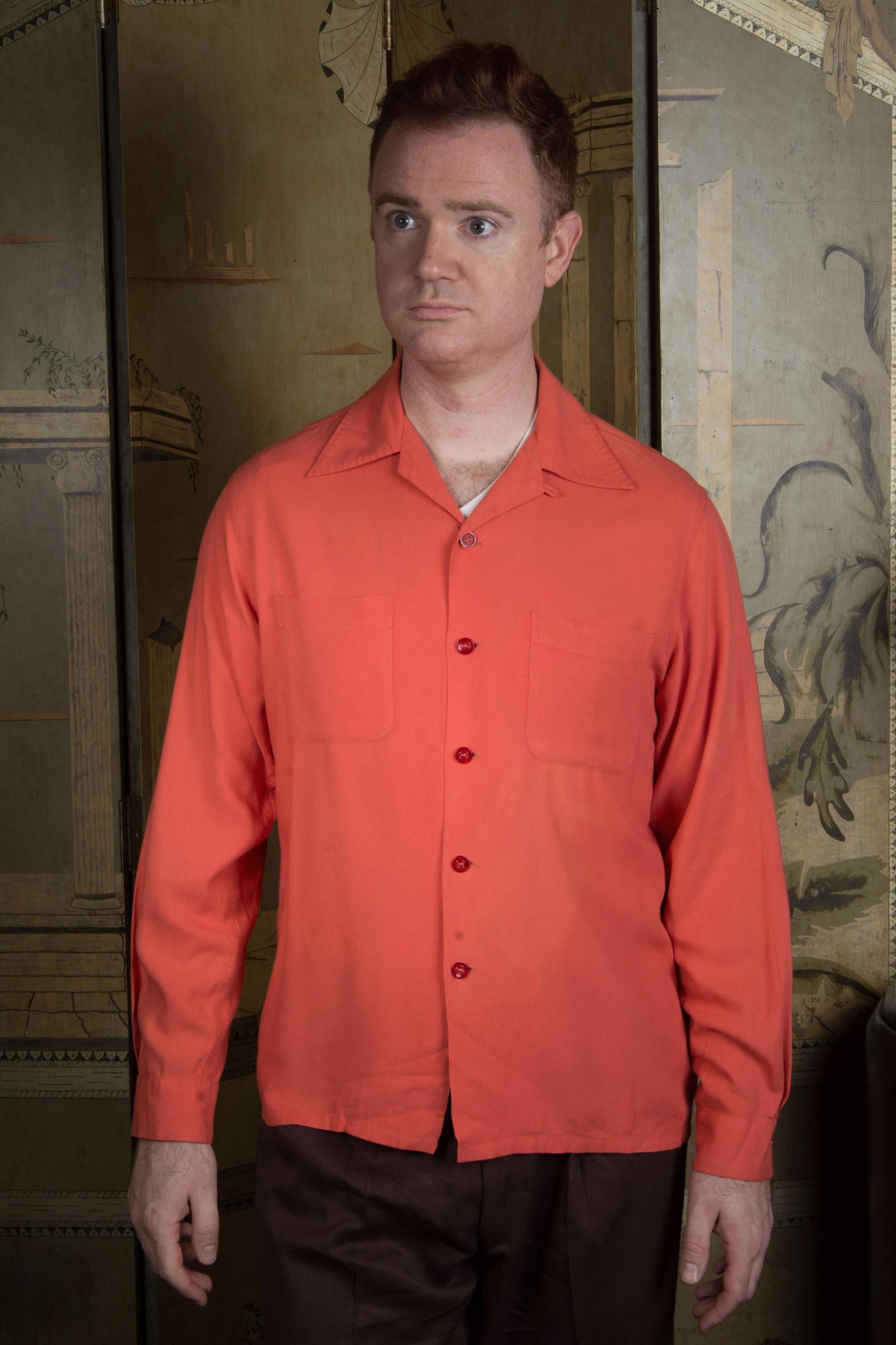 Vintage late 1950s soft rayon sportshirt from McGregor in a saturated coral or salmon hue. This could easily be mistaken for gabardine, but the weave is straight, rather than diagonal, and it is slightly lighter weigh. Has a wide collar with a loop, and two patch pockets, and full length sleeves. Killer color made of super soft, drapey rayon that you'll love to wear.