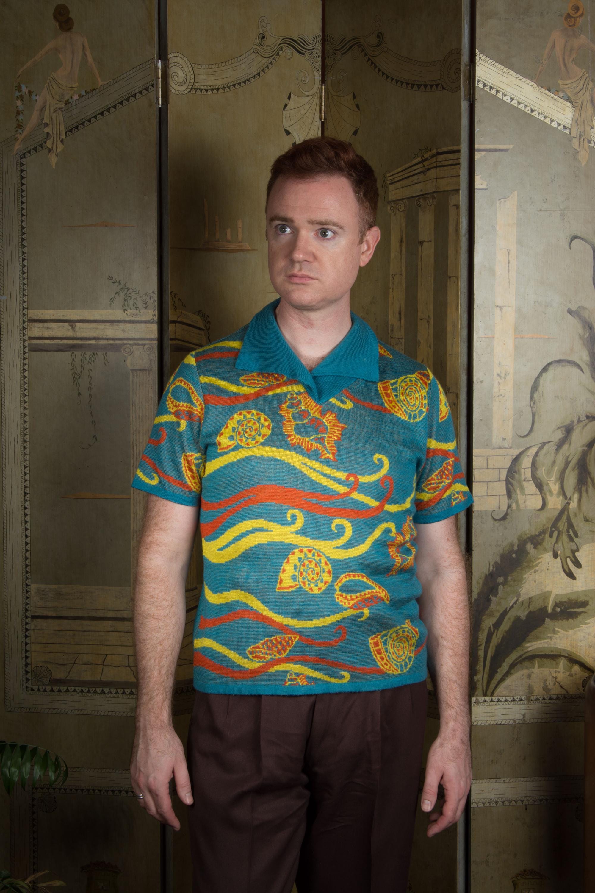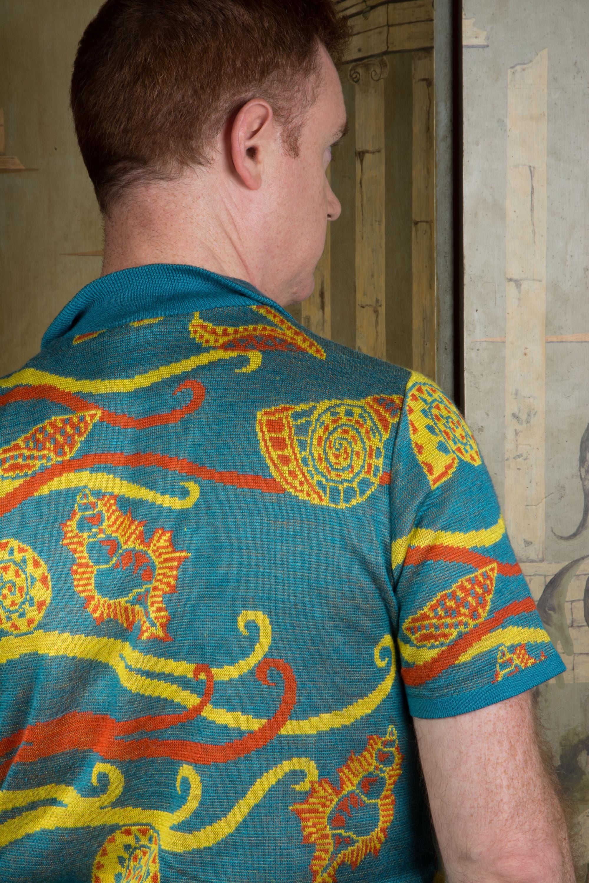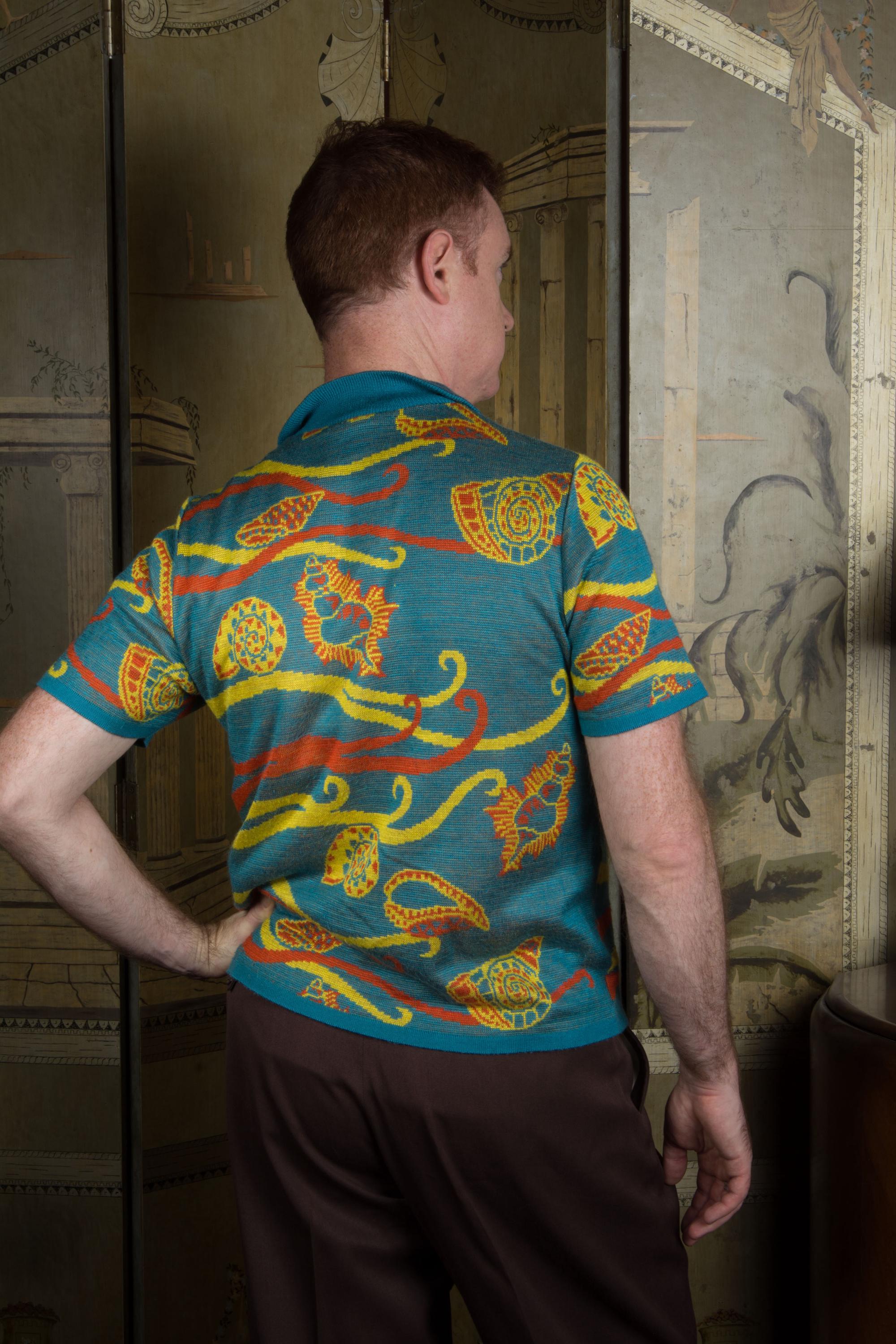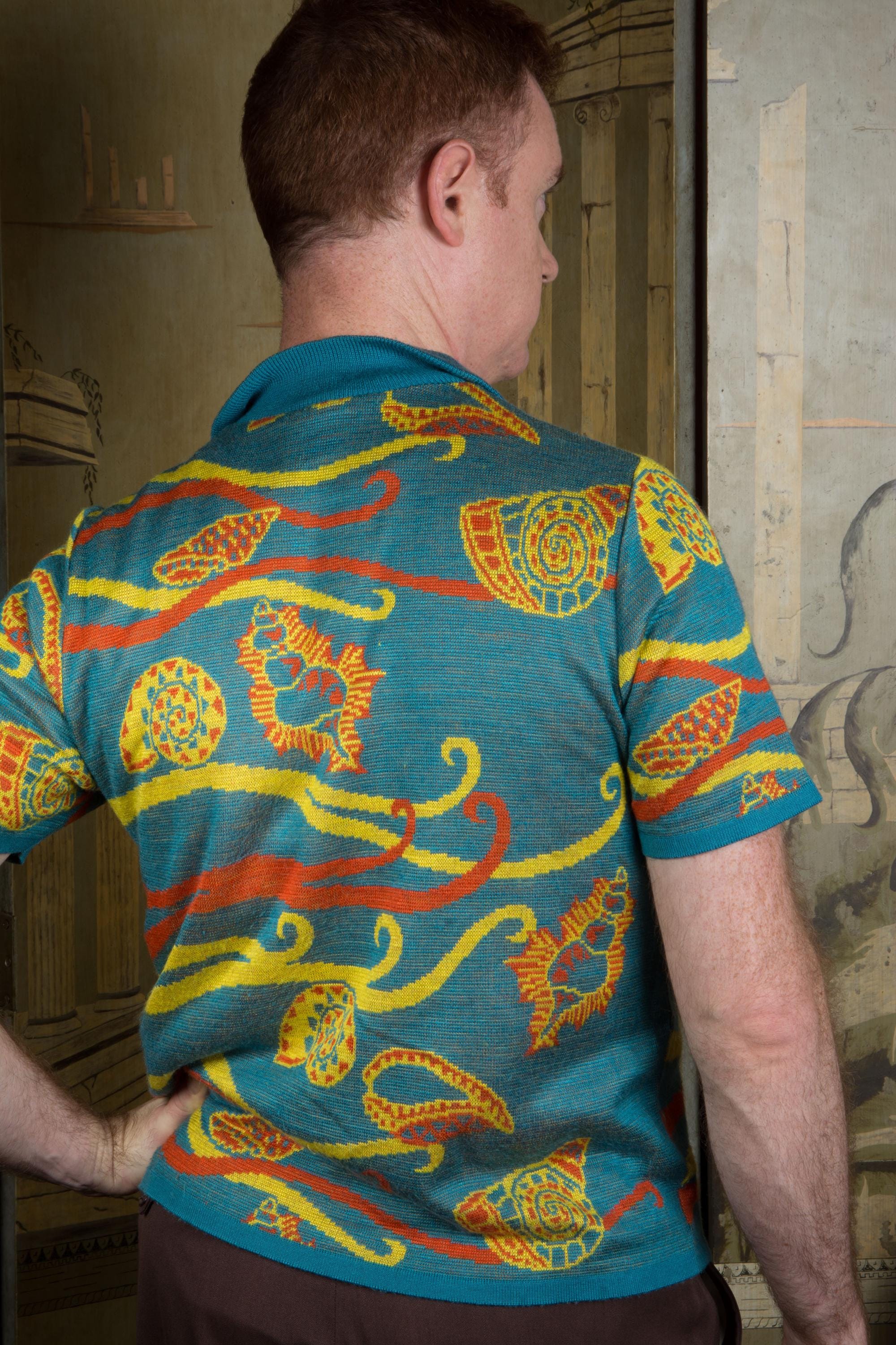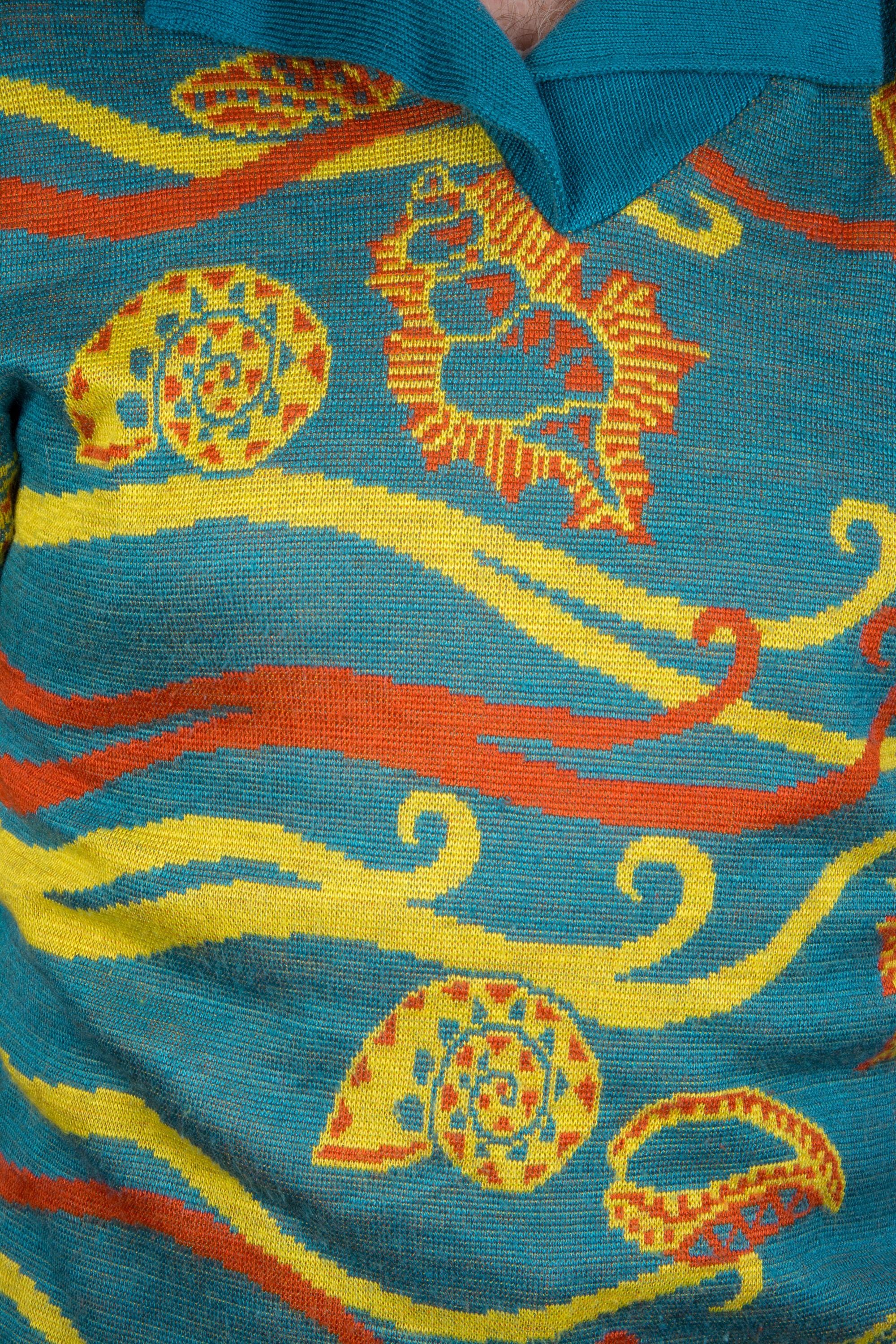 Vintage 1960s? 70s? pullover is sporty and smart with an awesome jacquard knit novelty motif of seashells in the waves, all in bright blue, yellow and orange. It's lighter weight, and feels like an orlon acyrlic, or orlon with nylon. Has a sported folded collar - not a polo, there's no buttons. Narrow banded edges at the cuffs and hem. Pulls over the head with no closures.