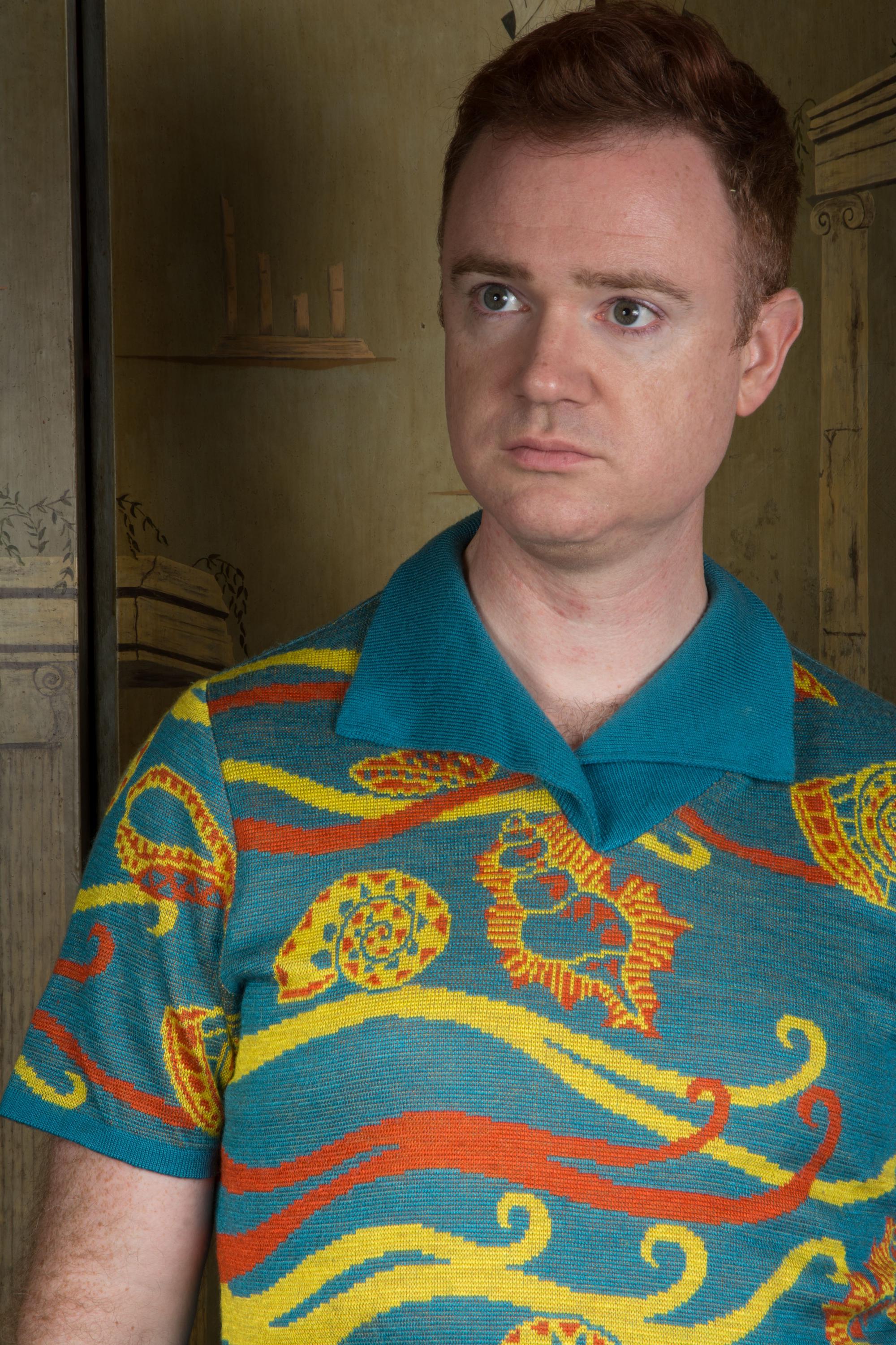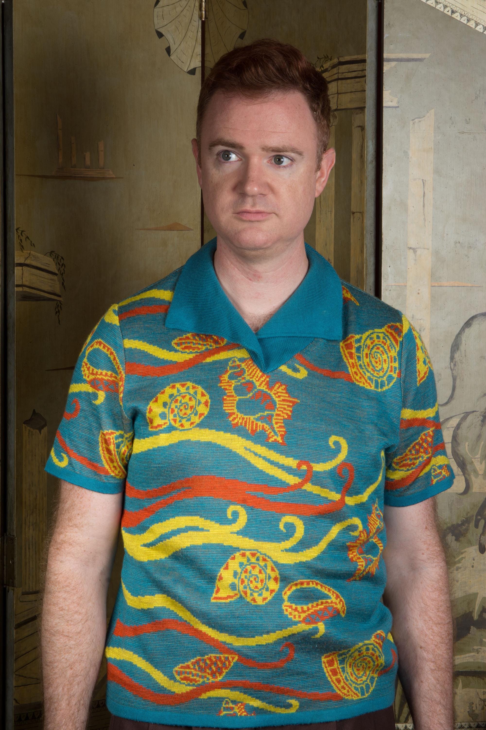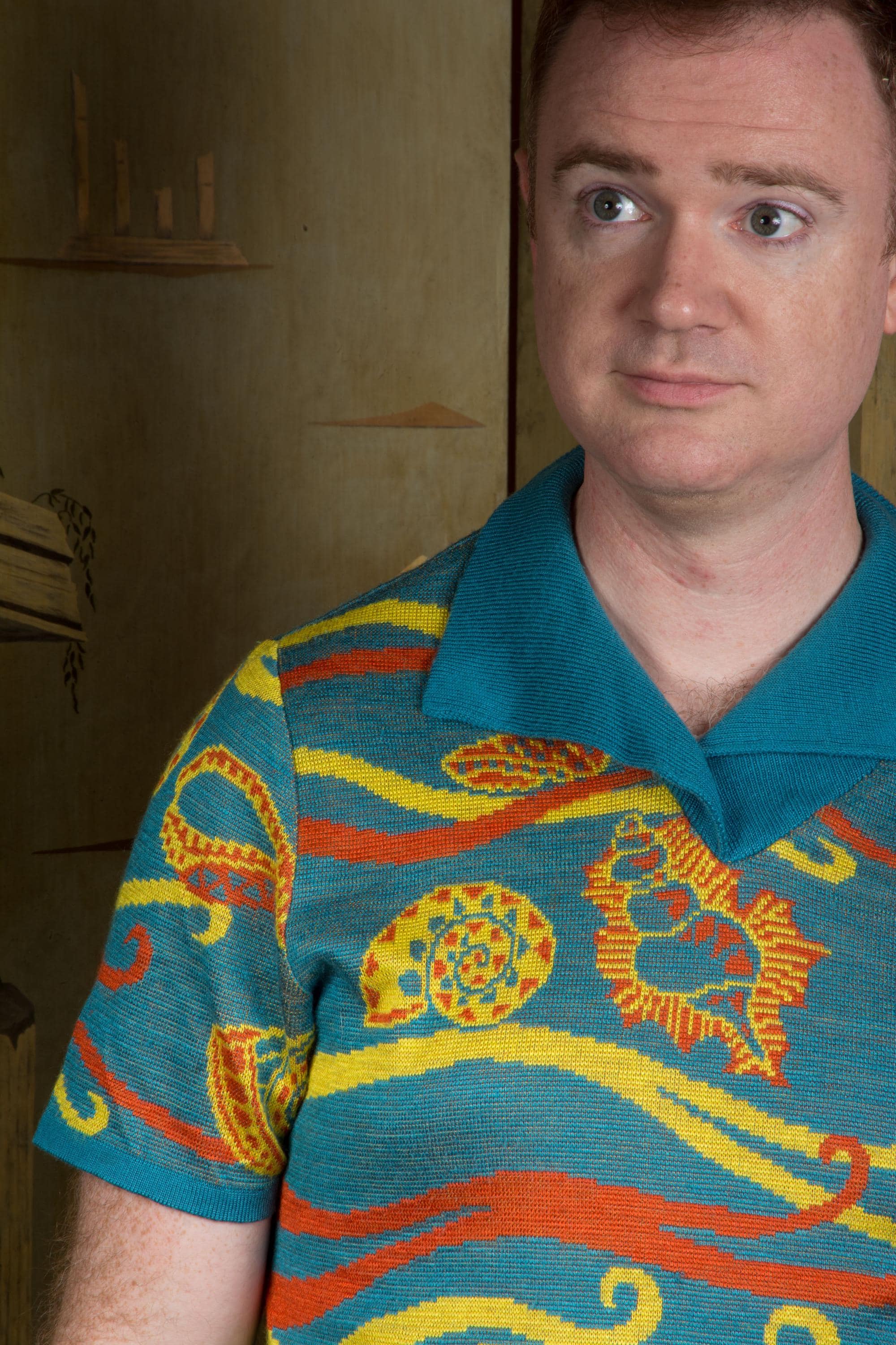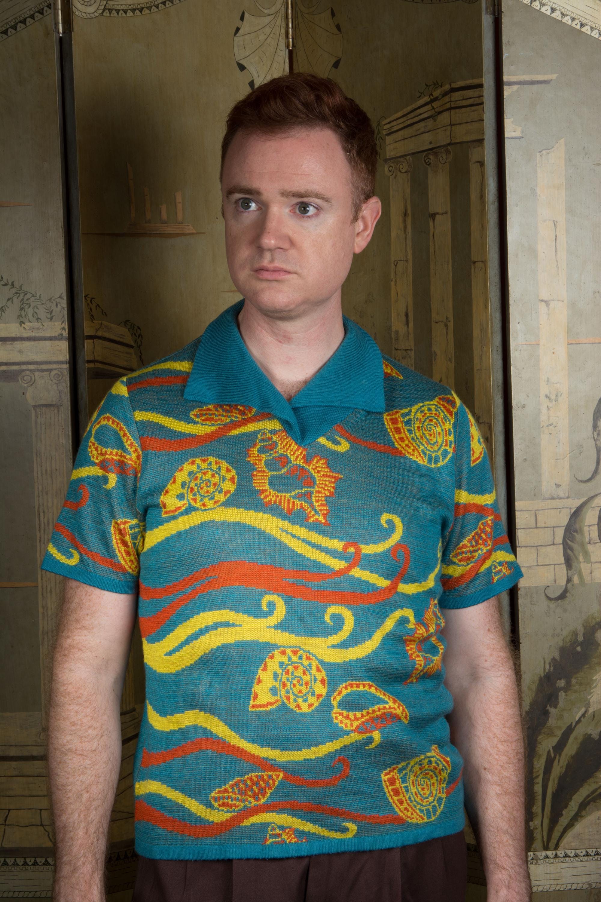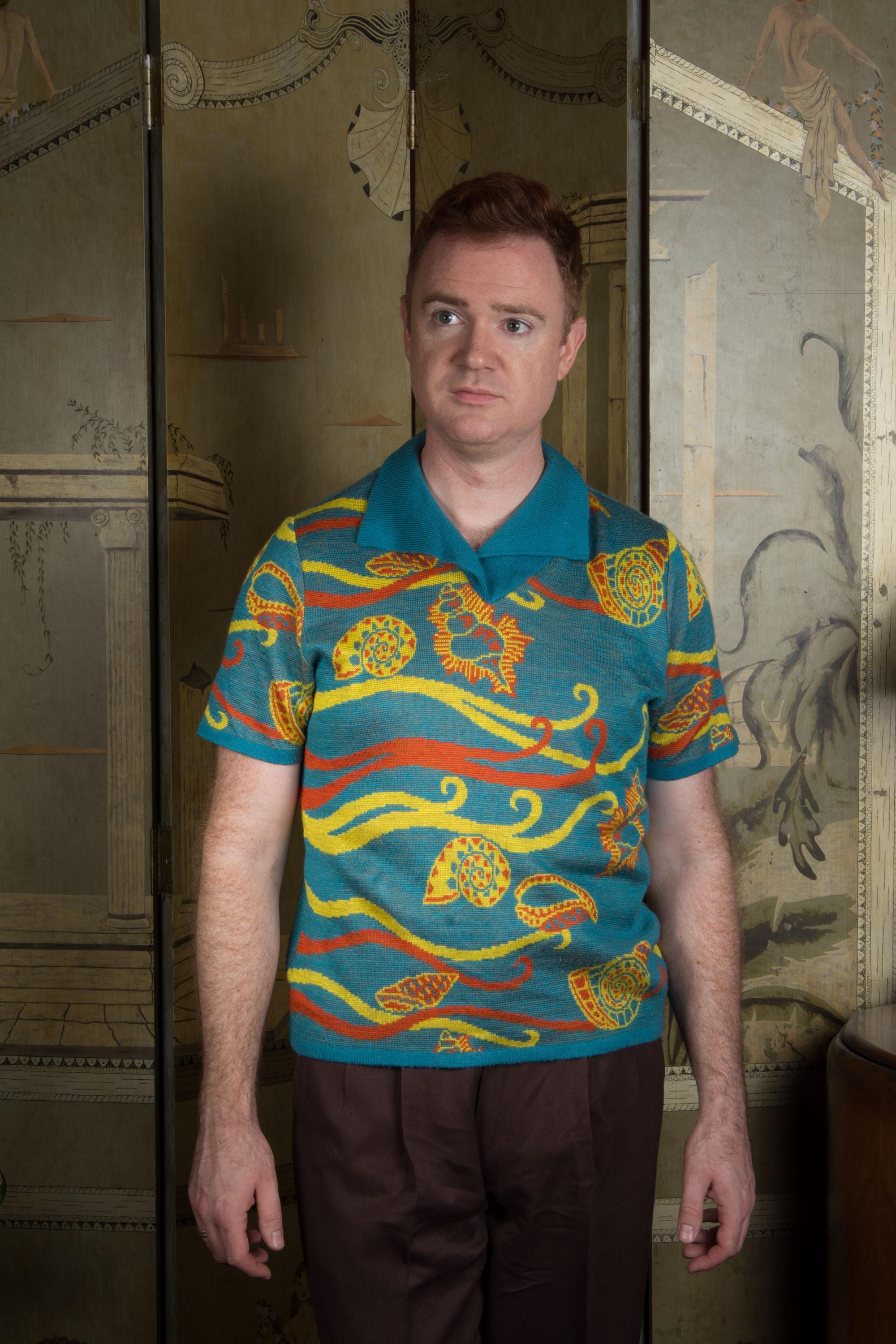 Vintage 1960s? 70s? pullover is sporty and smart with an awesome jacquard knit novelty motif of seashells in the waves, all in bright blue, yellow and orange. It's lighter weight, and feels like an orlon acyrlic, or orlon with nylon. Has a sported folded collar - not a polo, there's no buttons. Narrow banded edges at the cuffs and hem. Pulls over the head with no closures.