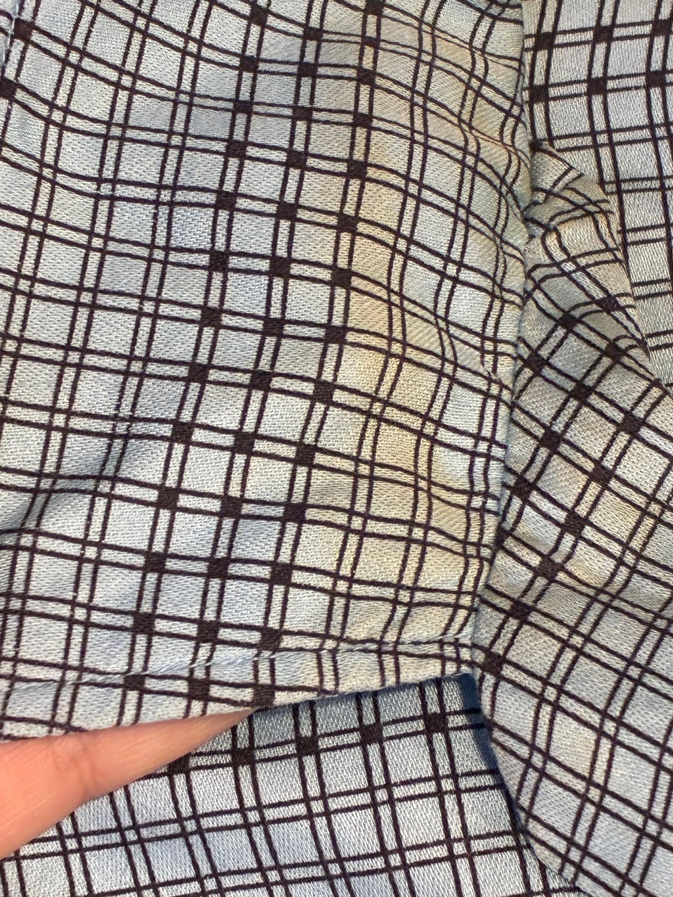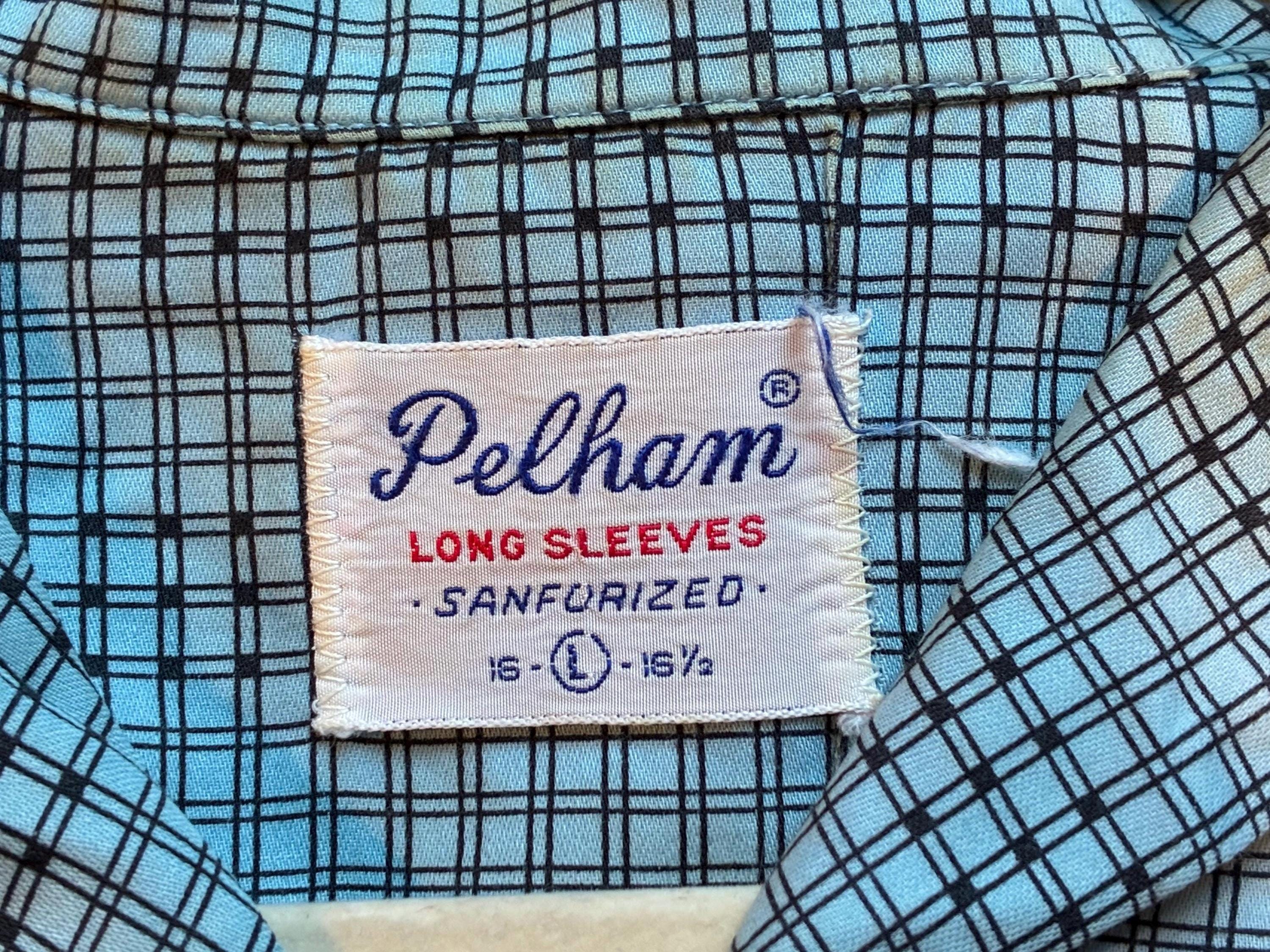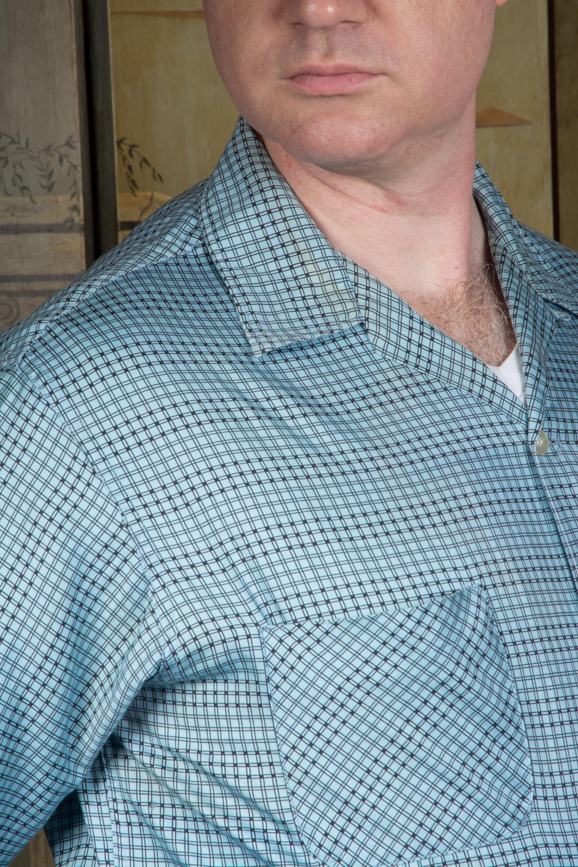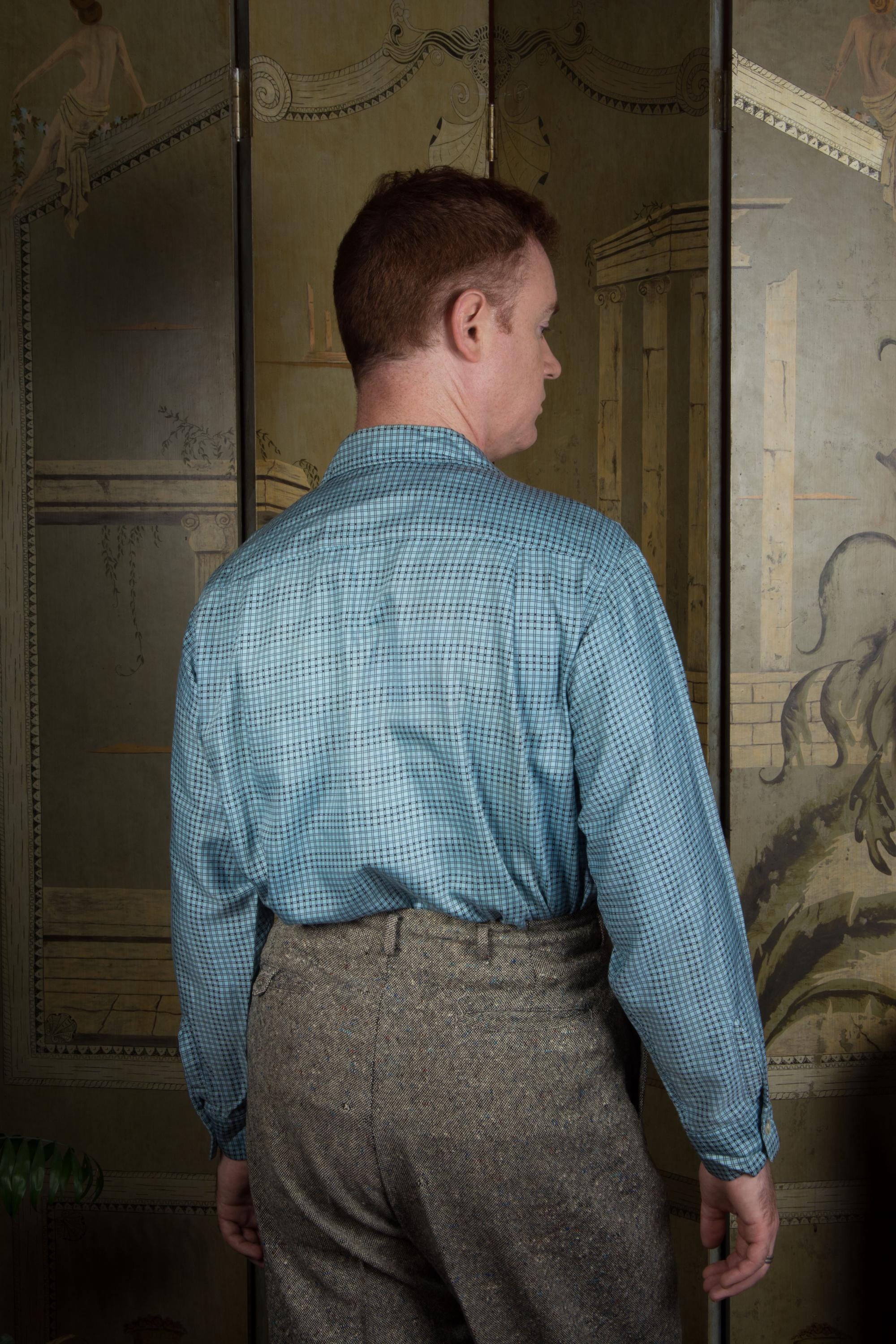I don't see cotton sateen very often in 1950s menswear - and it's such a great material, soft with a little sheen. The base color is a soft robin's egg blue, and it features a black gingham check. The patch pockets turn the print on the bias for contrast. The collar is a medium 1950s width and closes with a loop at the neck. The sleeves are full cut and comfortable. A great piece that walks the line between sportshirt and dress shirt.