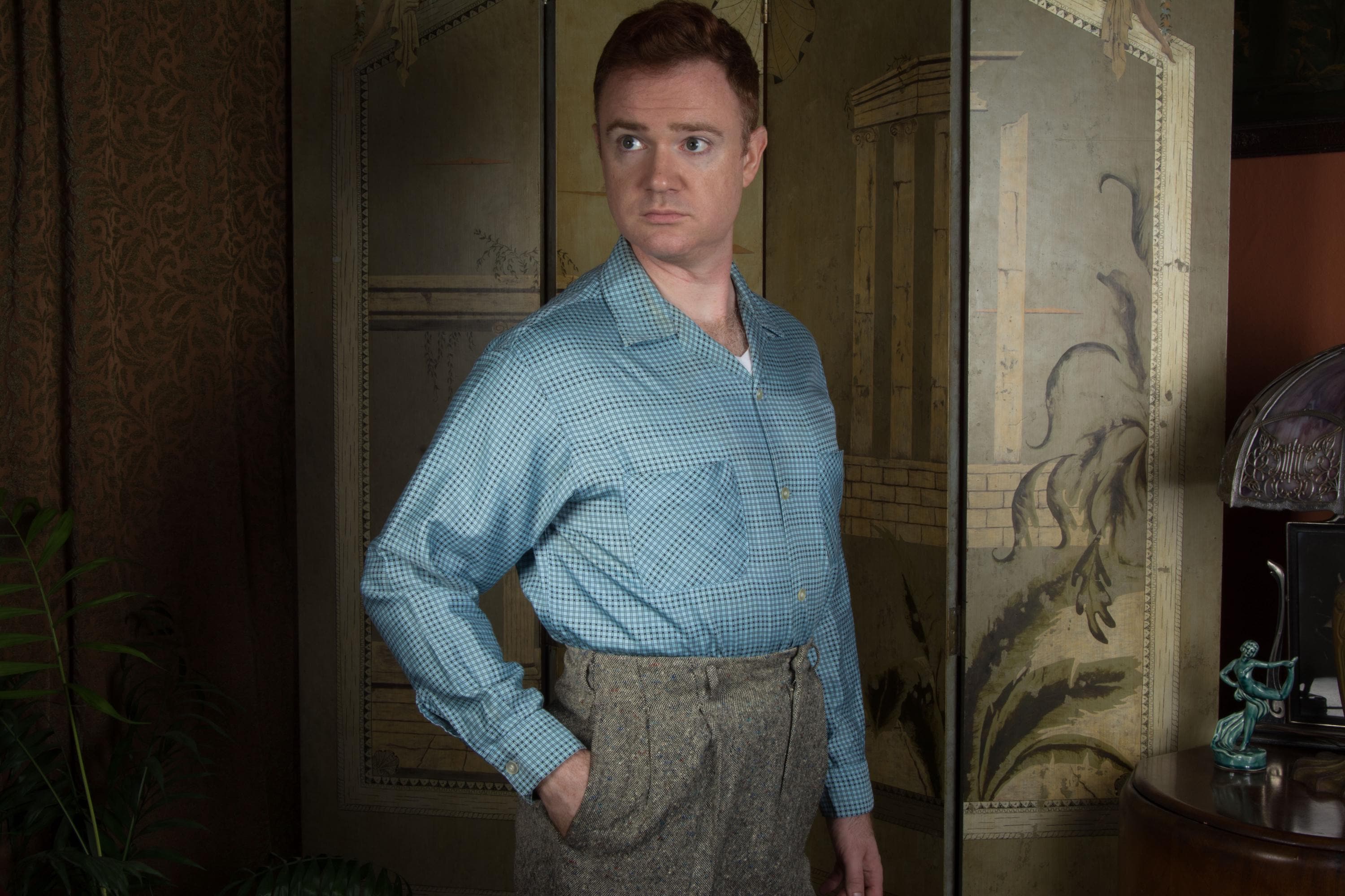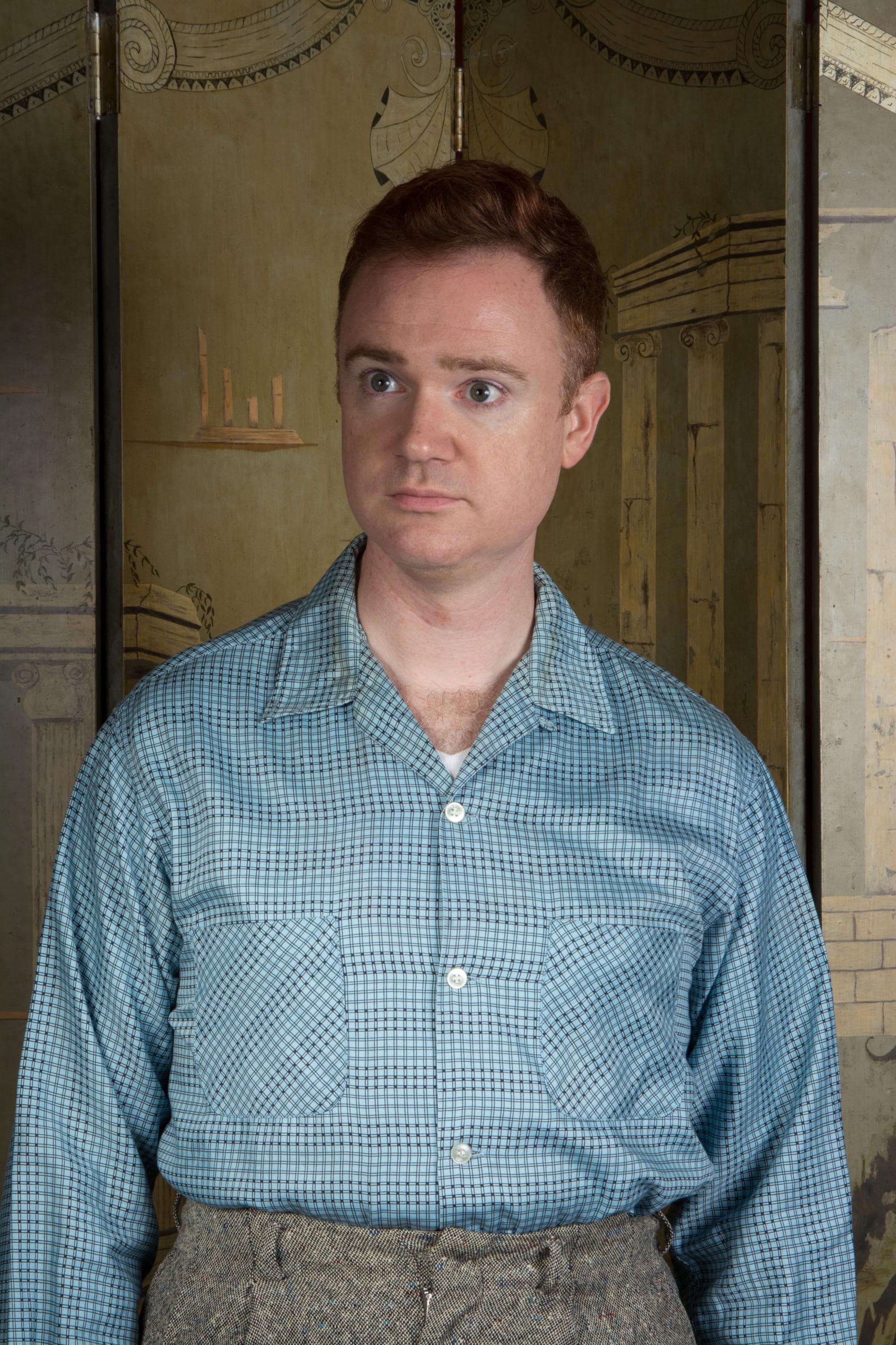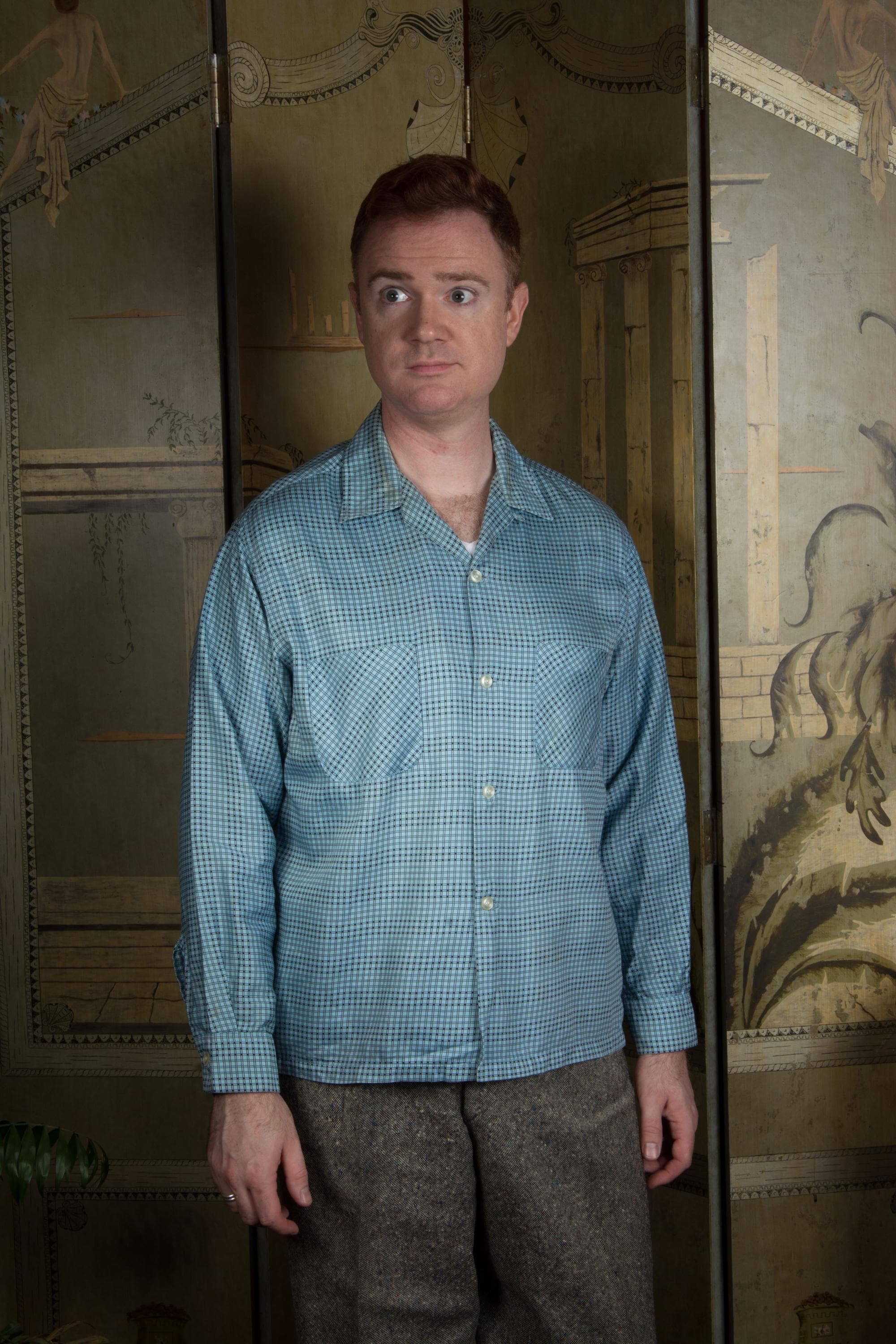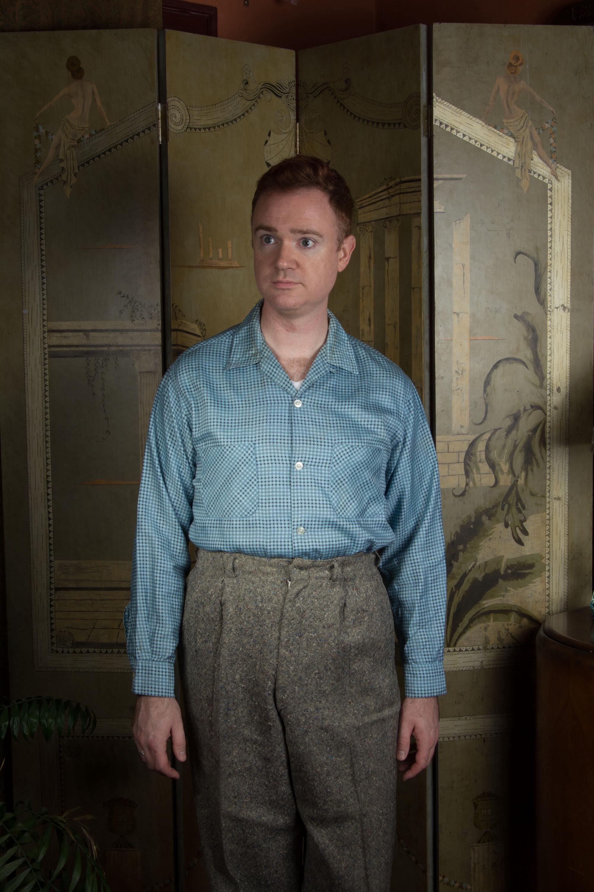 I don't see cotton sateen very often in 1950s menswear - and it's such a great material, soft with a little sheen. The base color is a soft robin's egg blue, and it features a black gingham check. The patch pockets turn the print on the bias for contrast. The collar is a medium 1950s width and closes with a loop at the neck. The sleeves are full cut and comfortable. A great piece that walks the line between sportshirt and dress shirt.