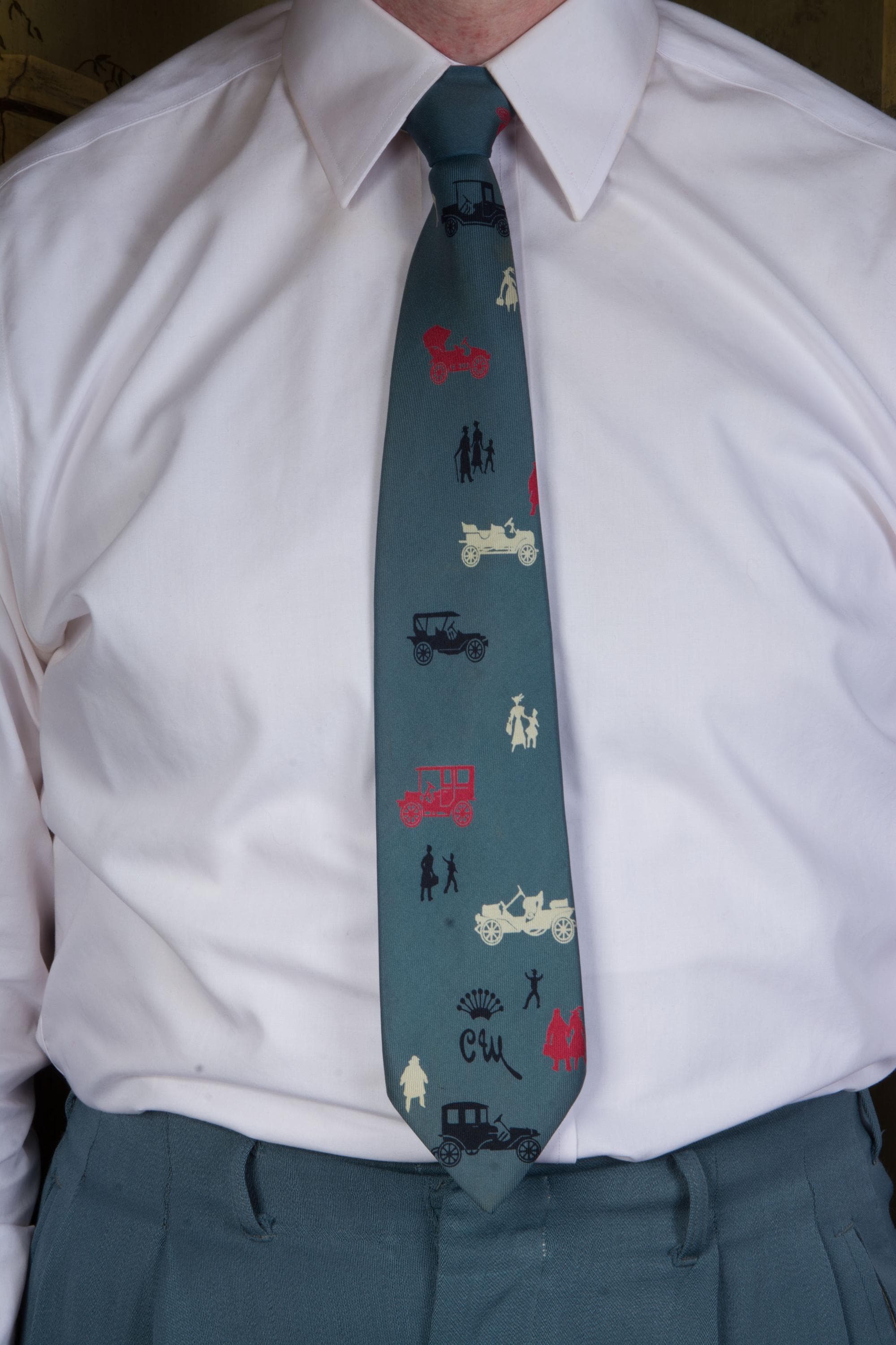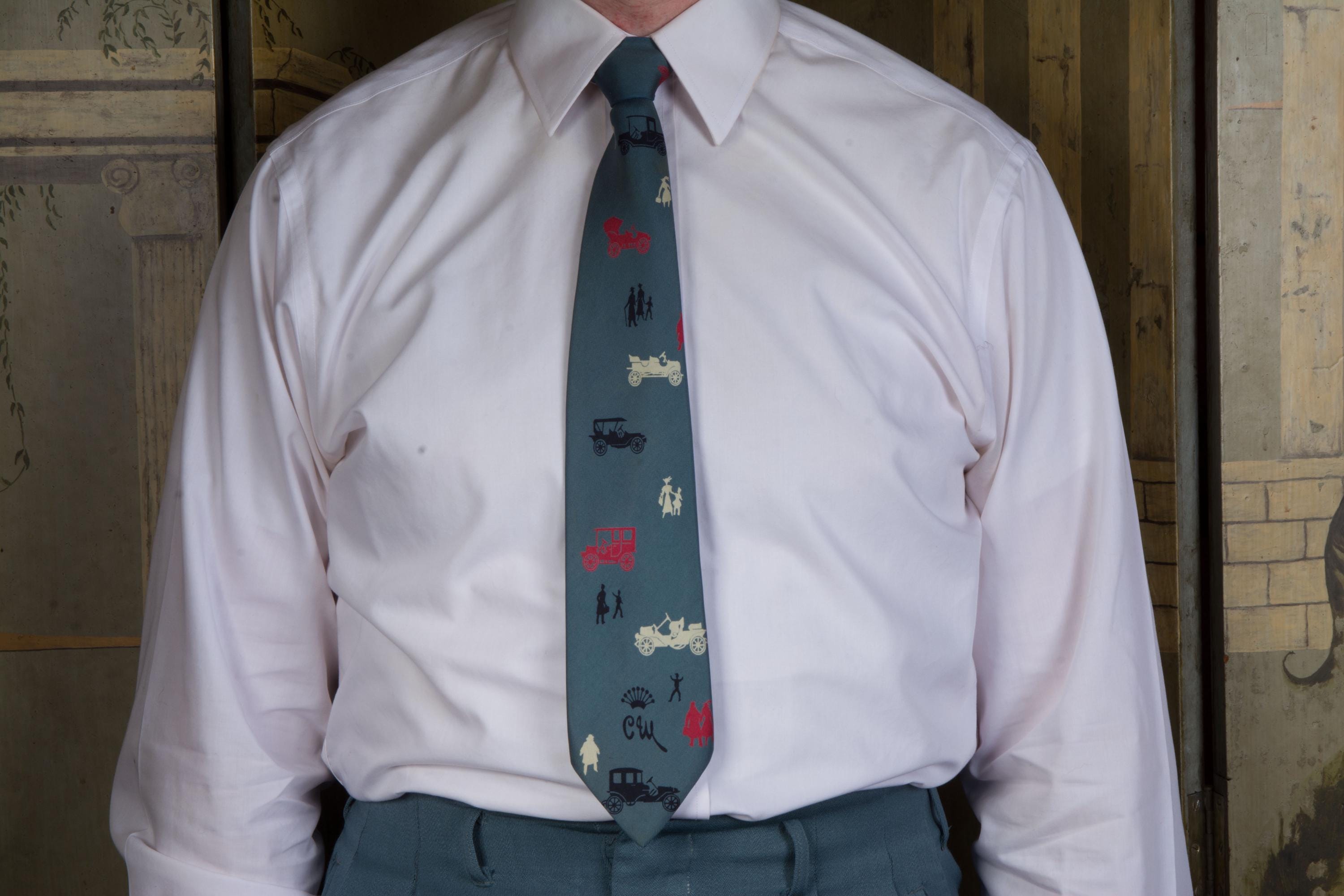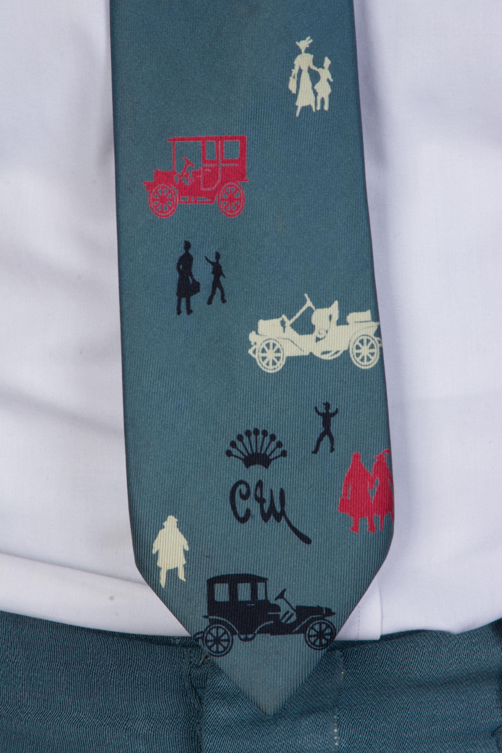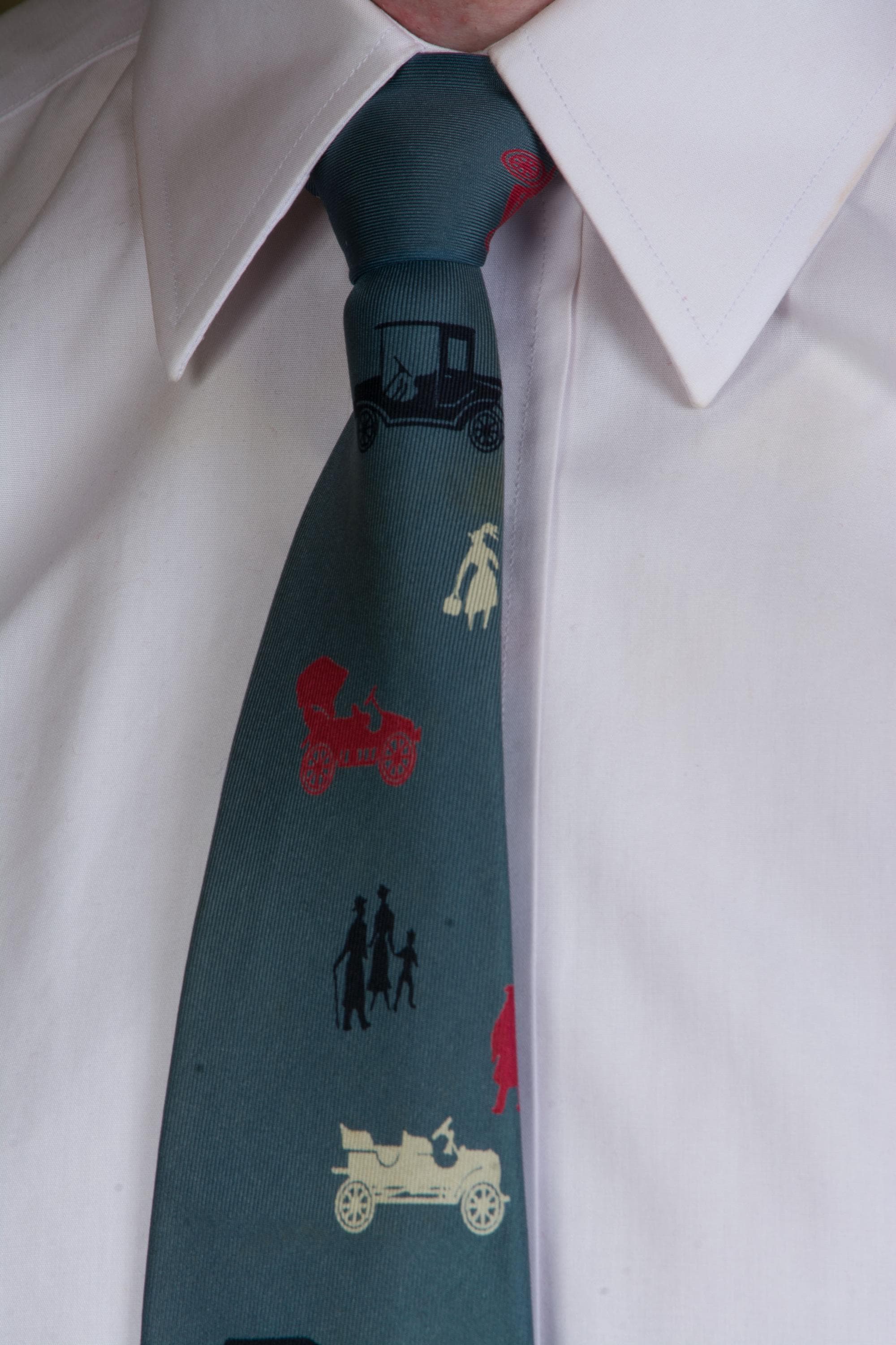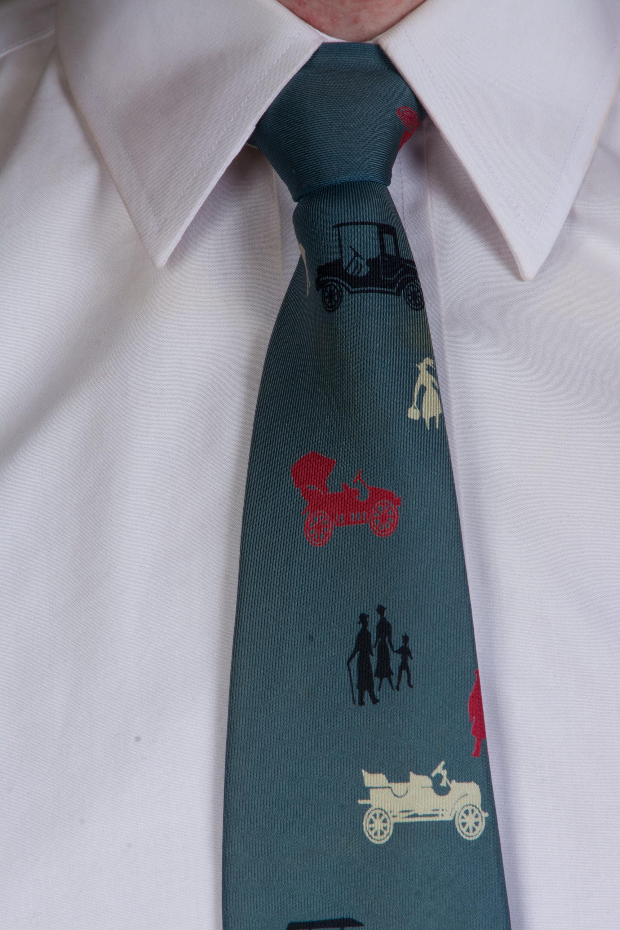 A rare novelty tie from Countess Mara. Made of the softest silk faille in a stormy grey-blue, it feaures antique autos - both covered and convertible - and travelers with their luggage in black white and red. It is fully lined in silk and has a reinforced stitch around the back of the neck.