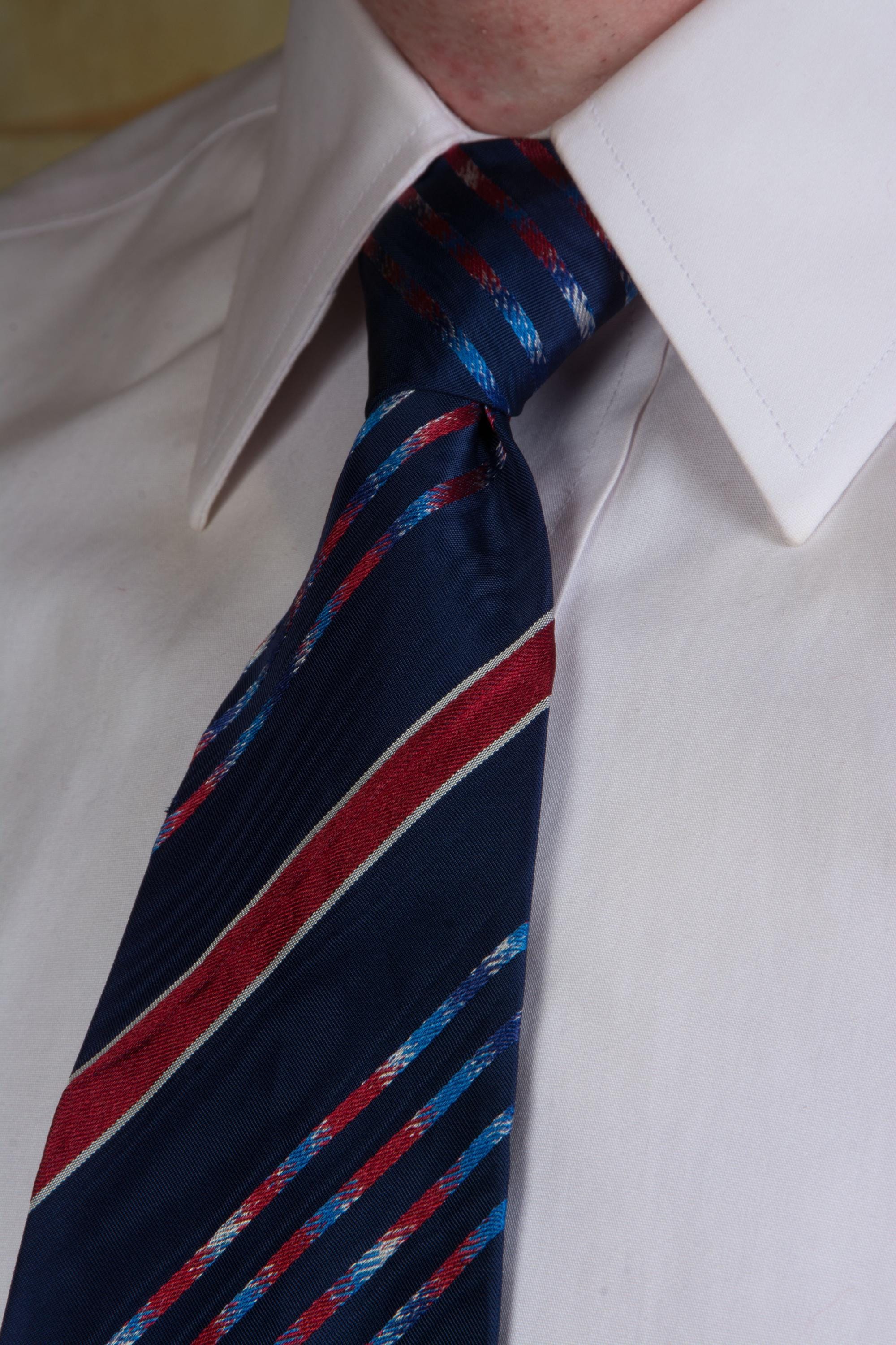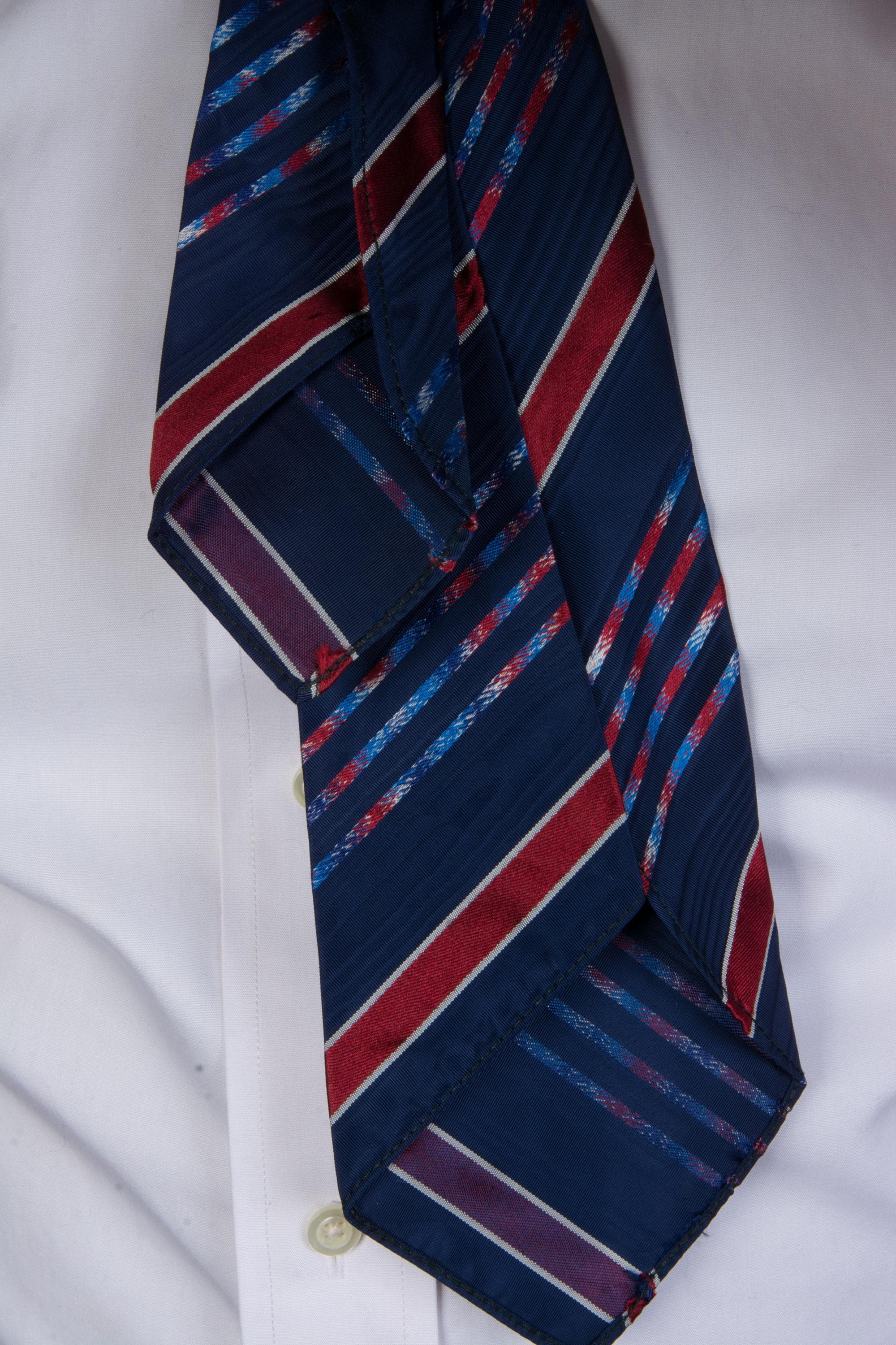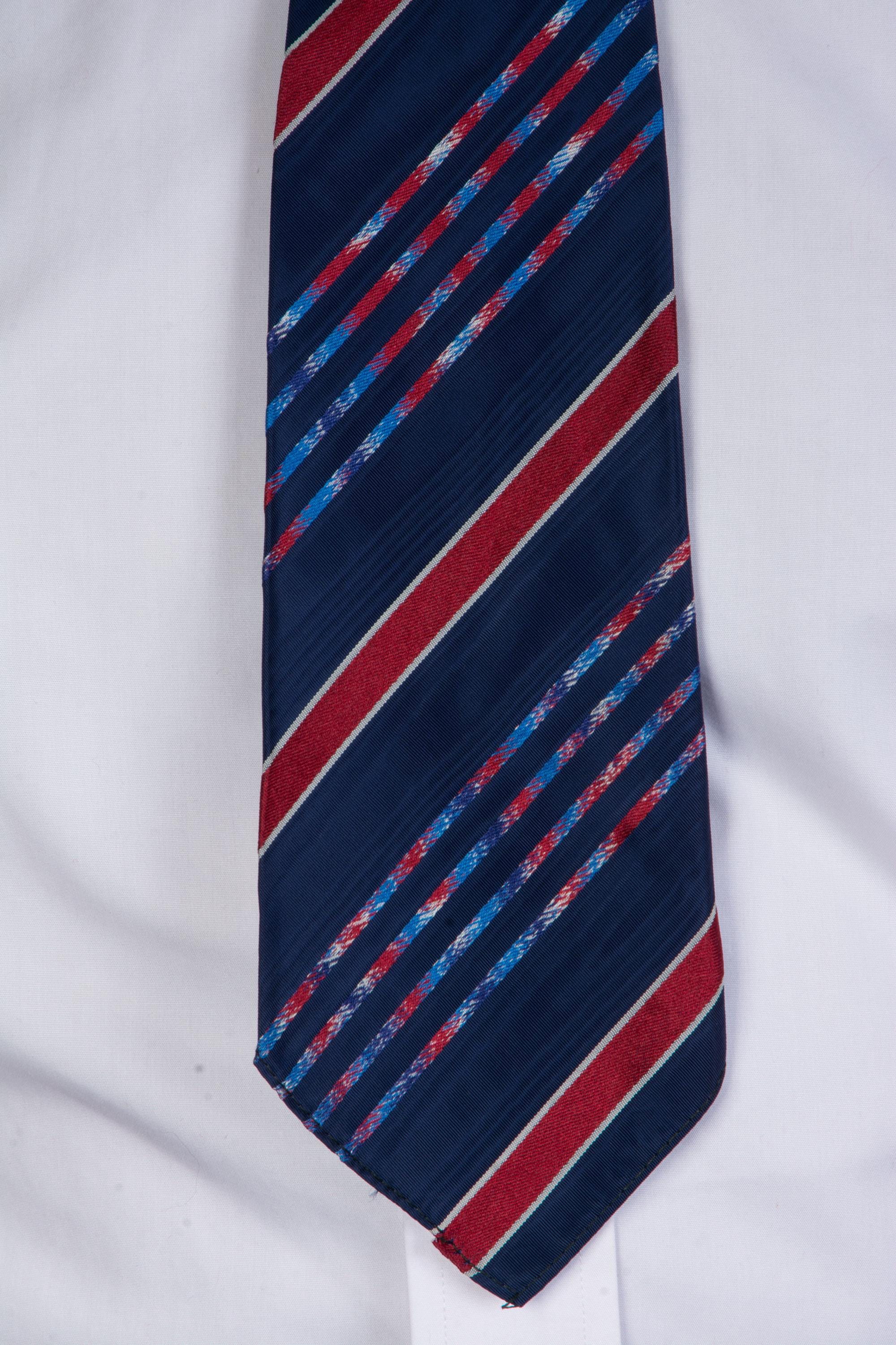 An excellent 1930s necktie in a stunning brocaded stripe, blending moiré, solid, and mixed color stripes, all cut on the bias to run diagonally. The ground is a dark navy moiré, with a texture that catches the light. Bars of deep red framed in white alternate with clusters of multi hues stripes - white, red, navy and bright blue. It's an earlier tie, short, and a real standout. Asymmetric and unlined, with a light interlining, this makes an absolutely perfect knot.