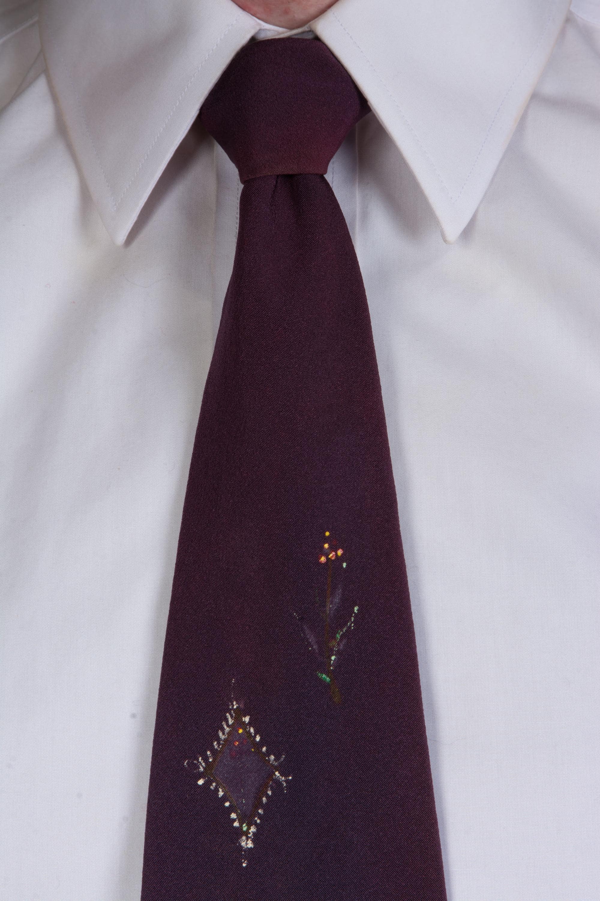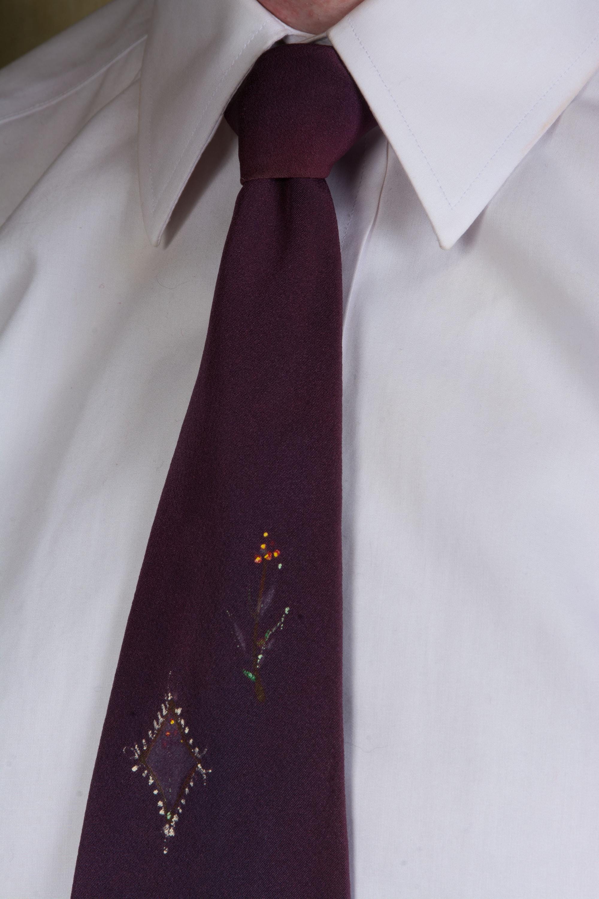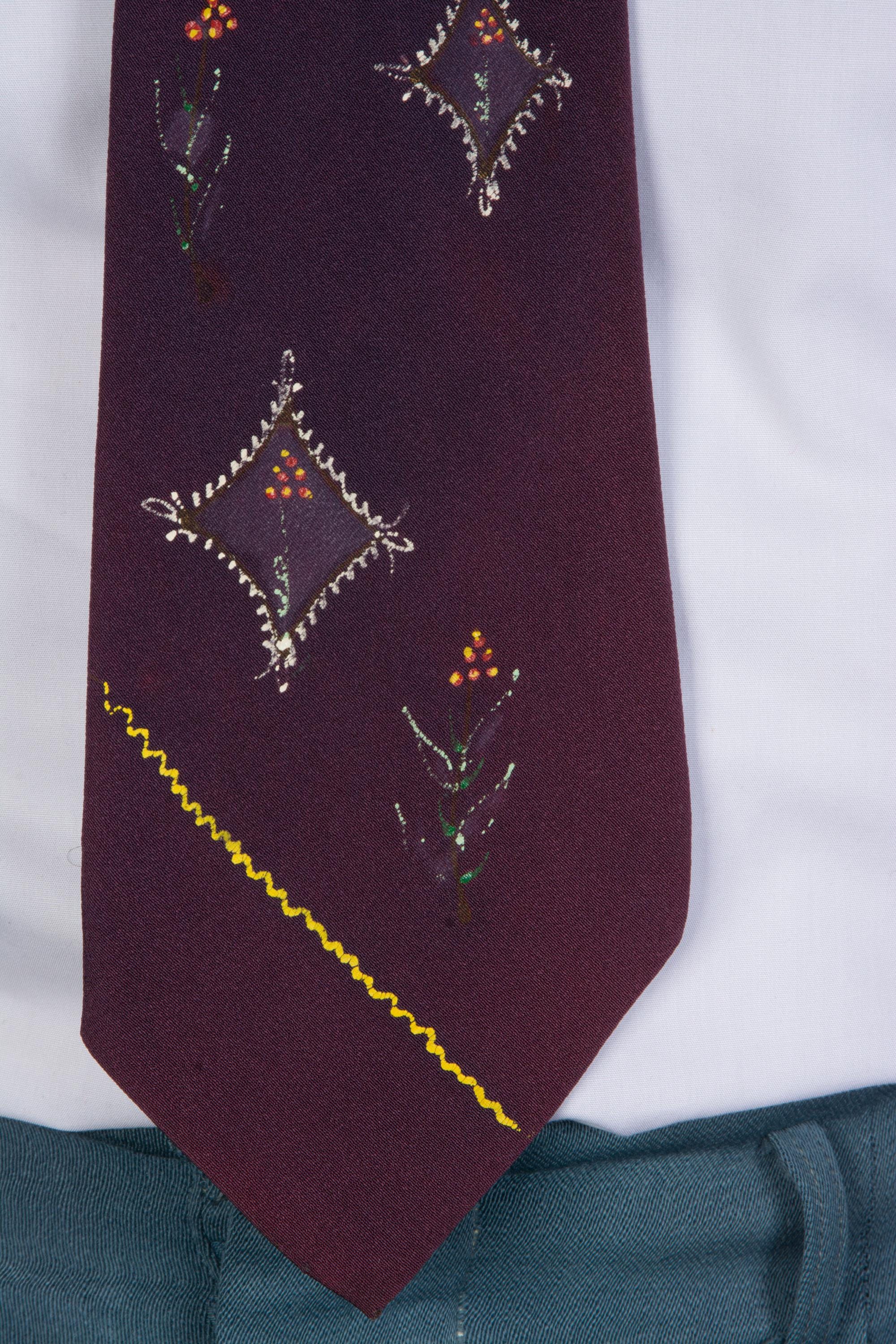A striking but imperfect late 1940s or early 50s handpainted tie. Offered because the plum color - even faded - is so scarce! This has an ombré fade. Little flowers and diamond frames climb up the front.