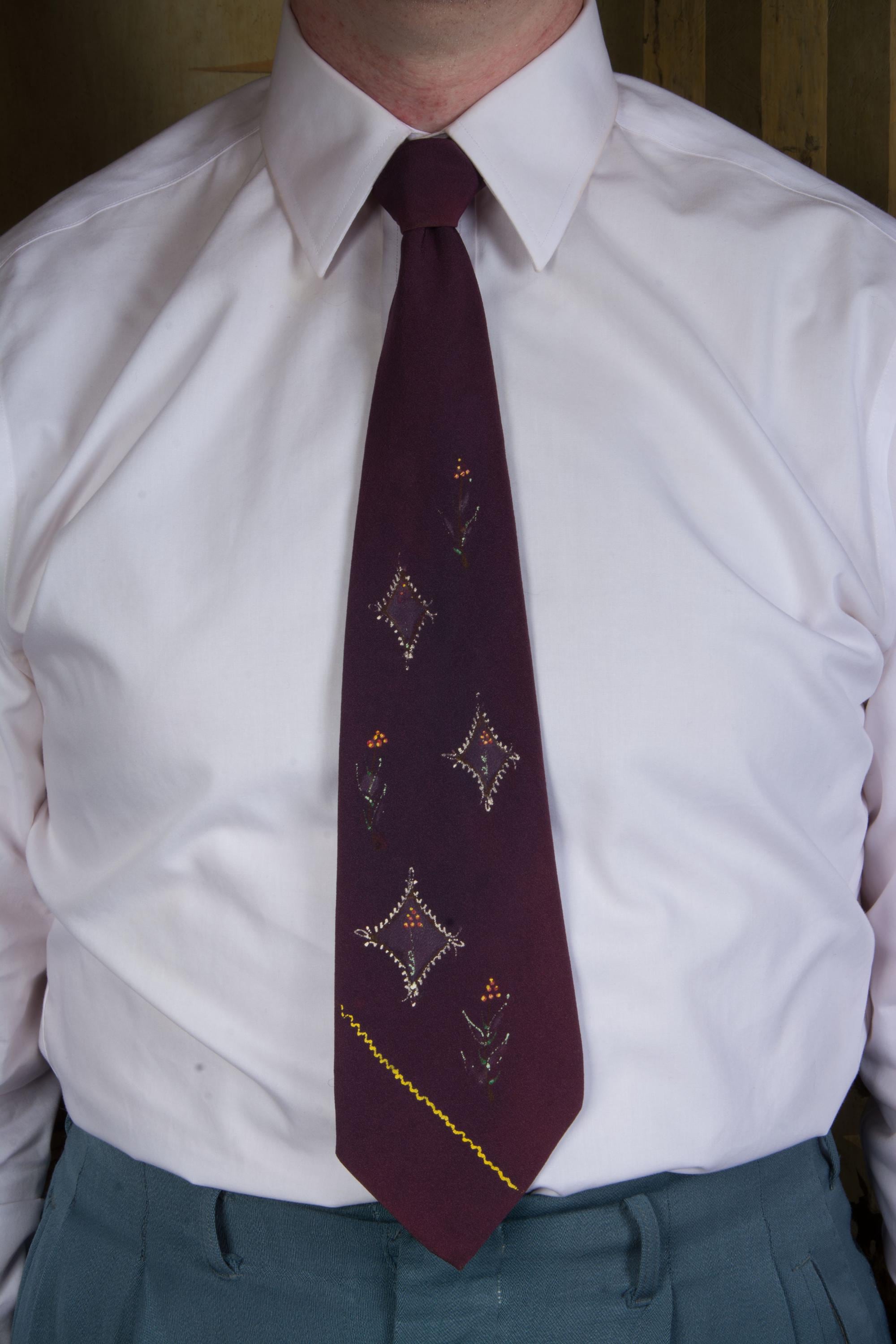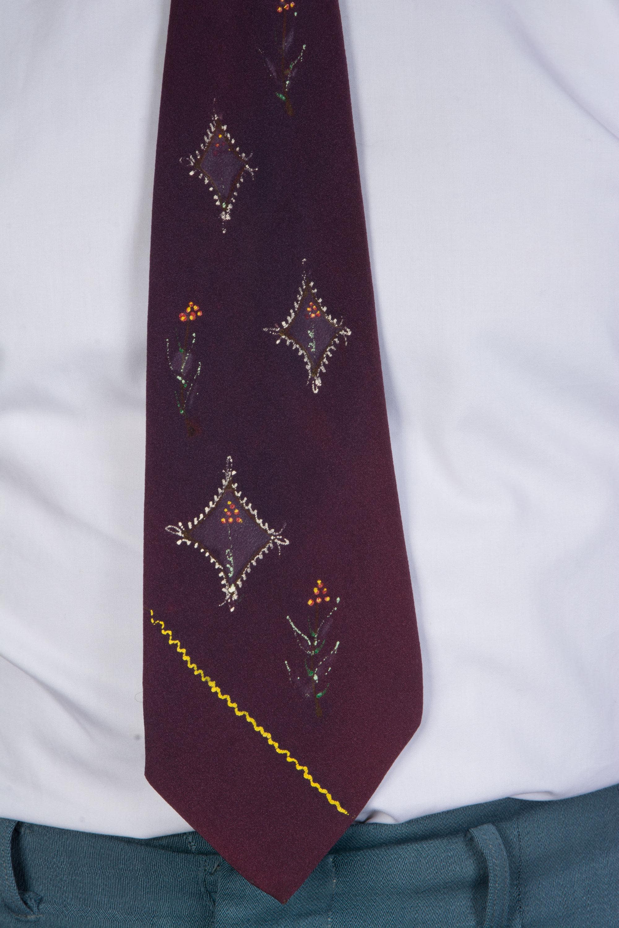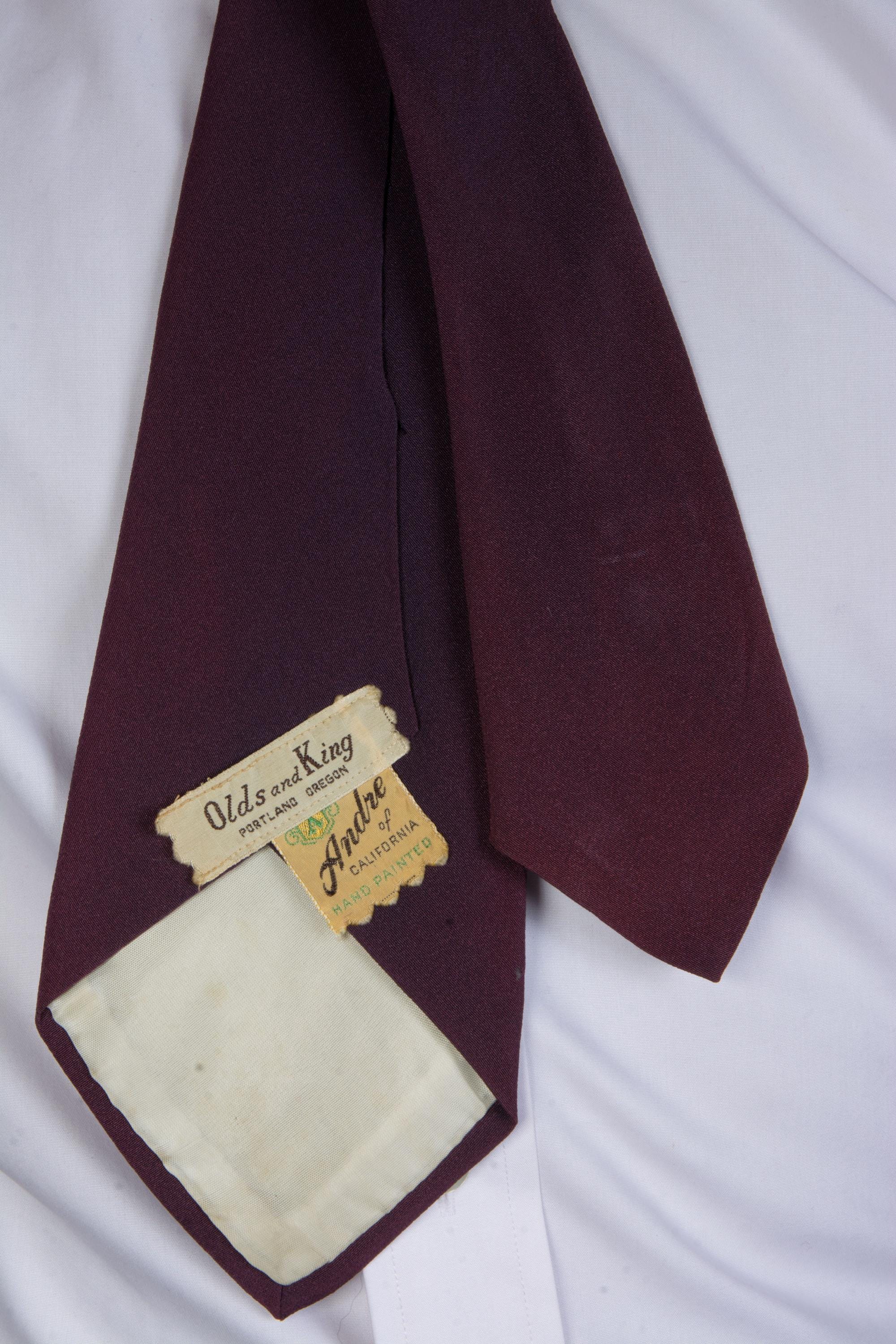 A striking but imperfect late 1940s or early 50s handpainted tie. Offered because the plum color - even faded - is so scarce! This has an ombré fade. Little flowers and diamond frames climb up the front.