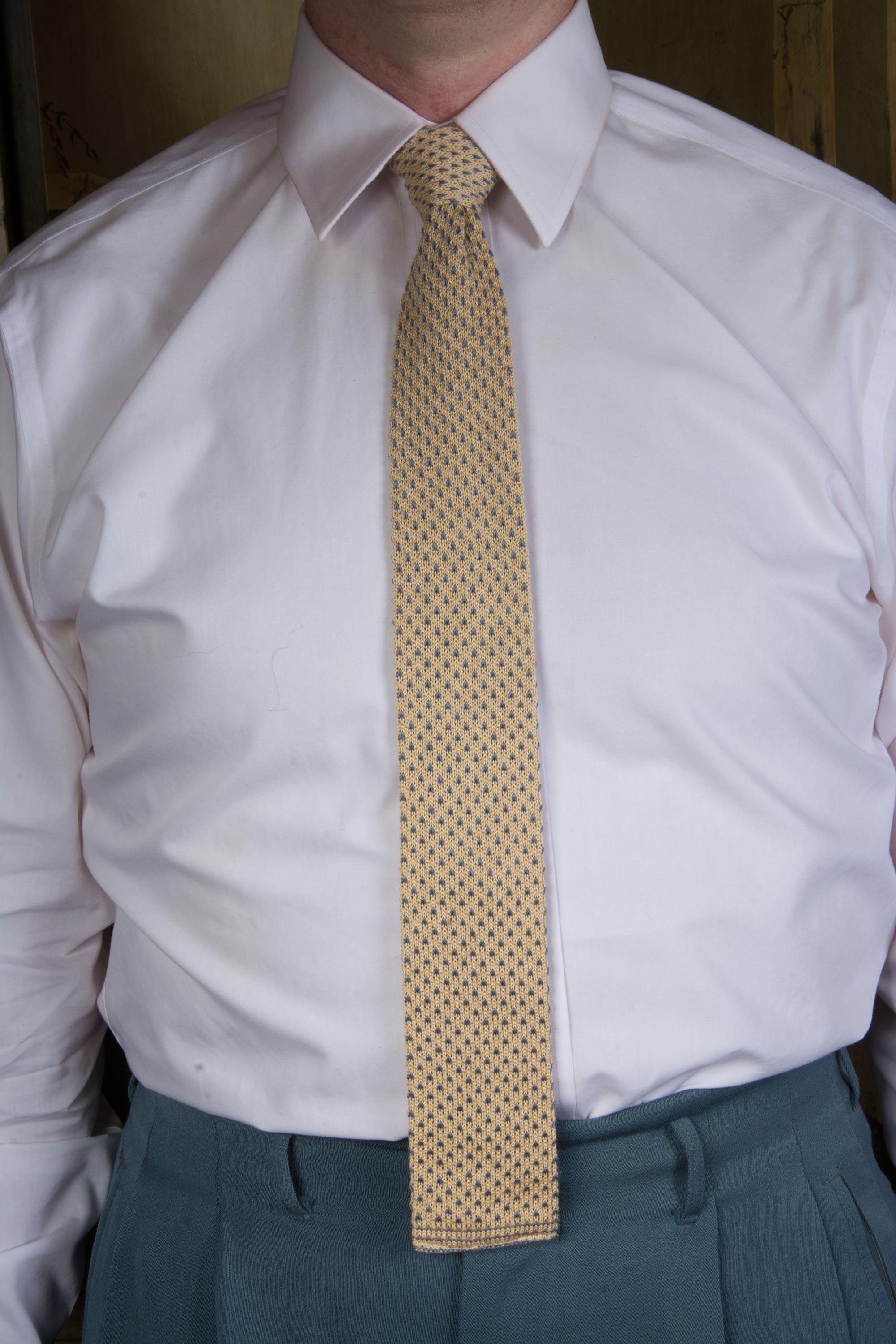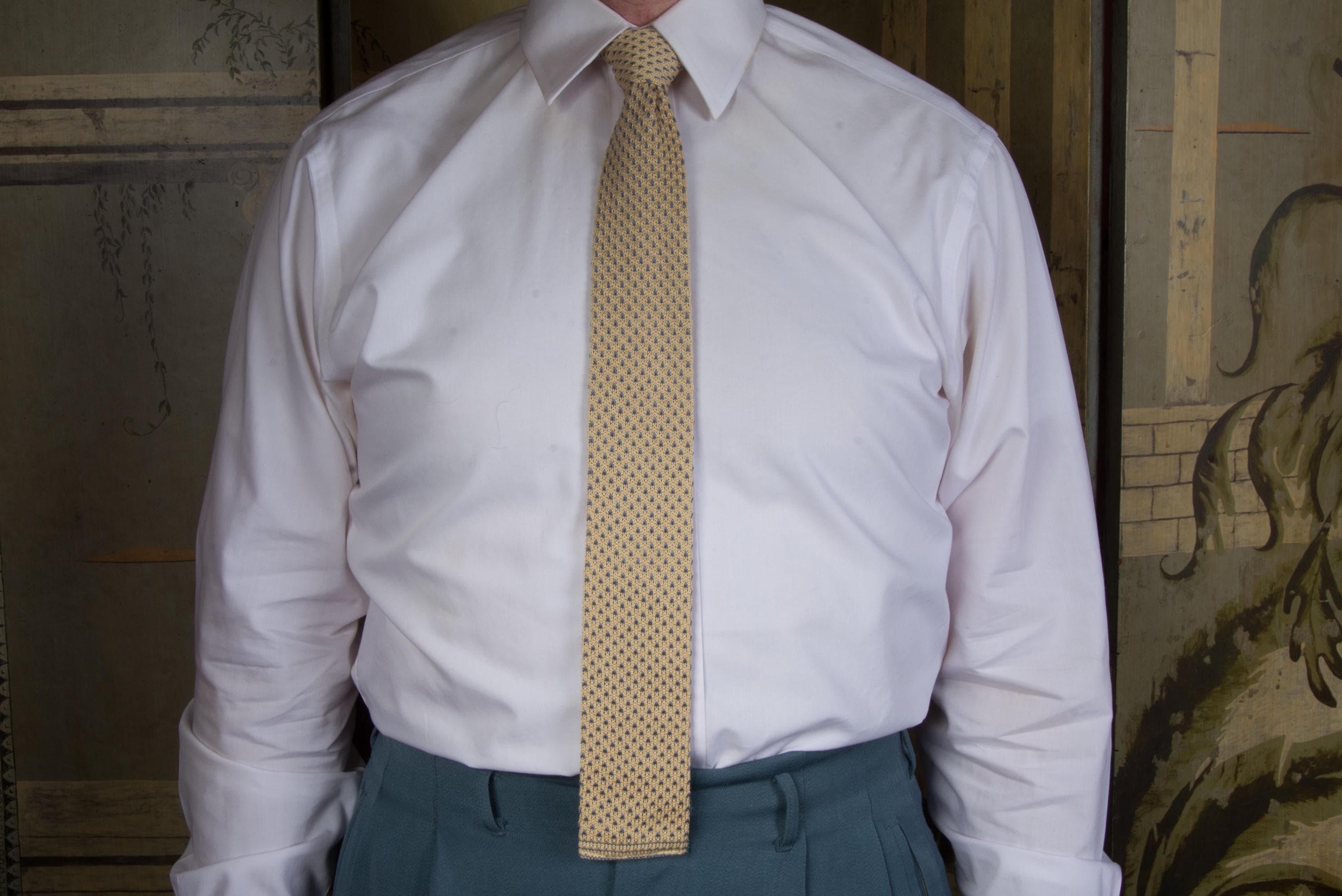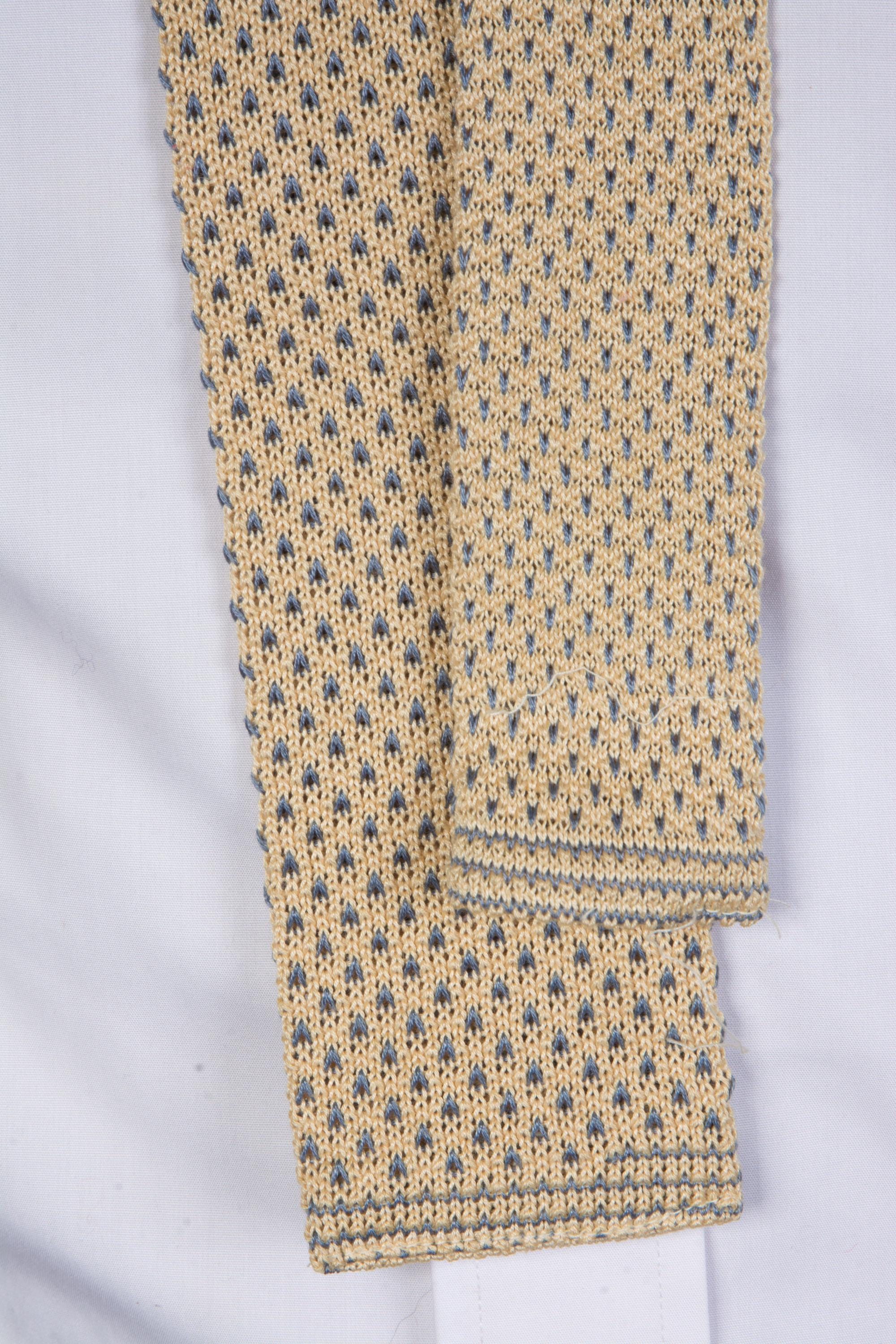A really sporty knit tie, the quintessential casual collegiate look. This square bottom tie is a matte knit n yellow with blue diamonds. The length and width say 50s to me, but its constructed like 30s versions, with a banded stripe around the back of the neck.
