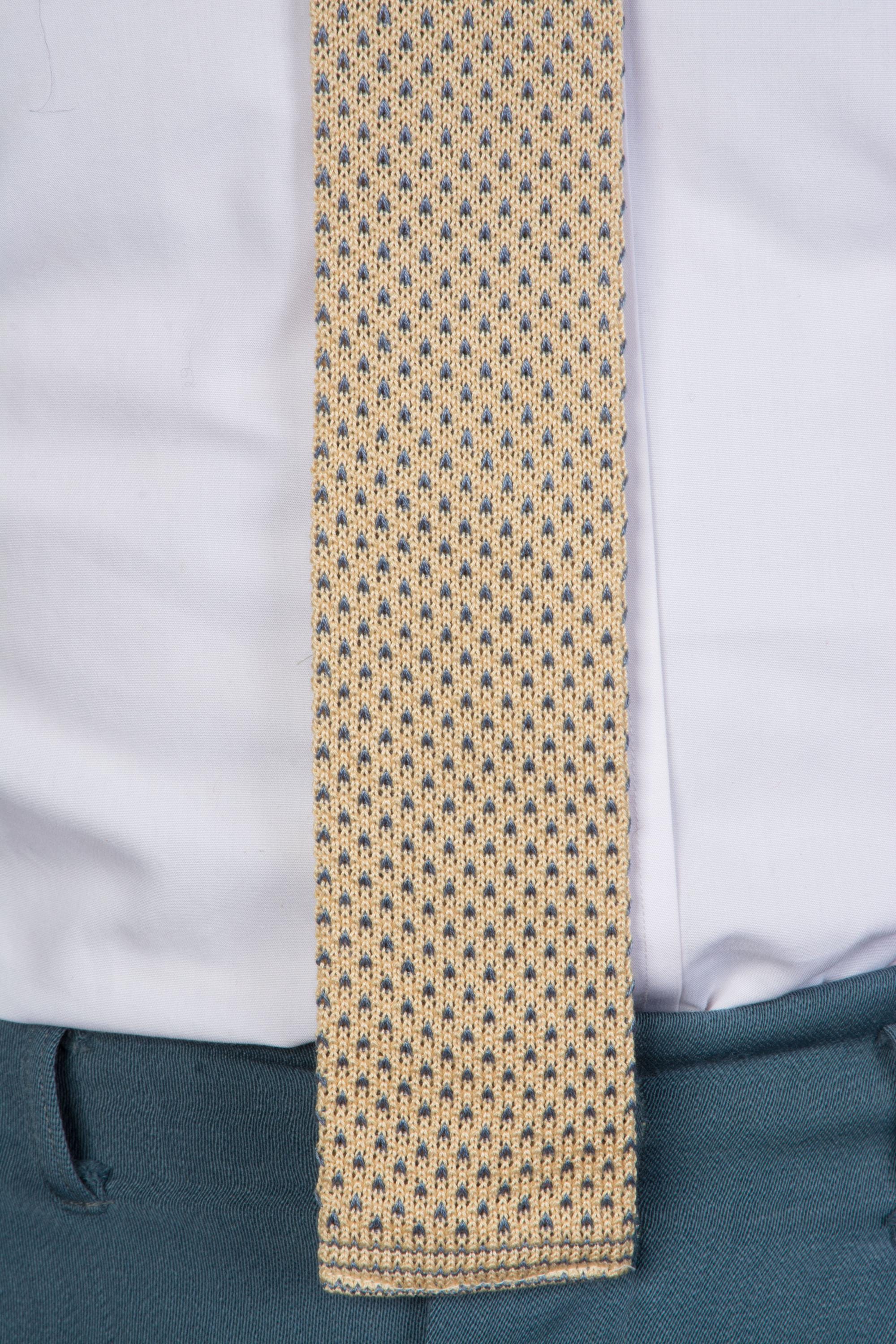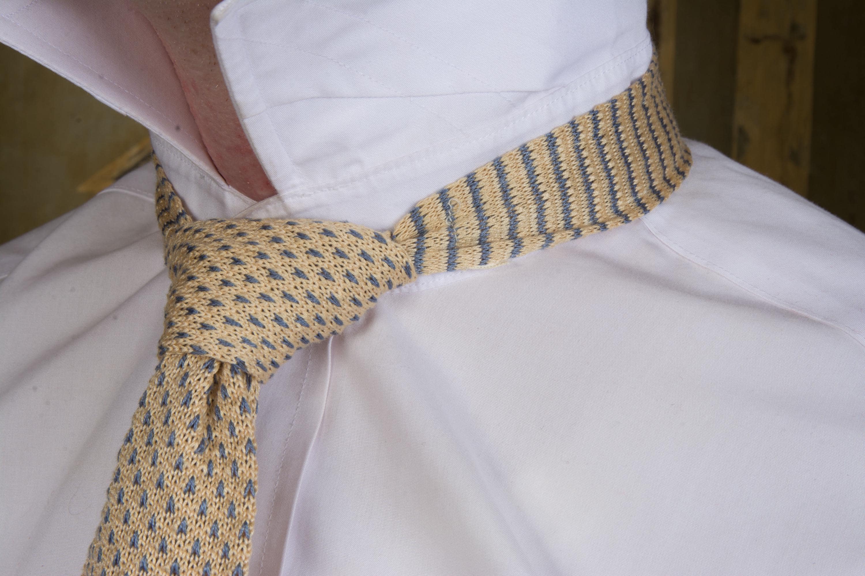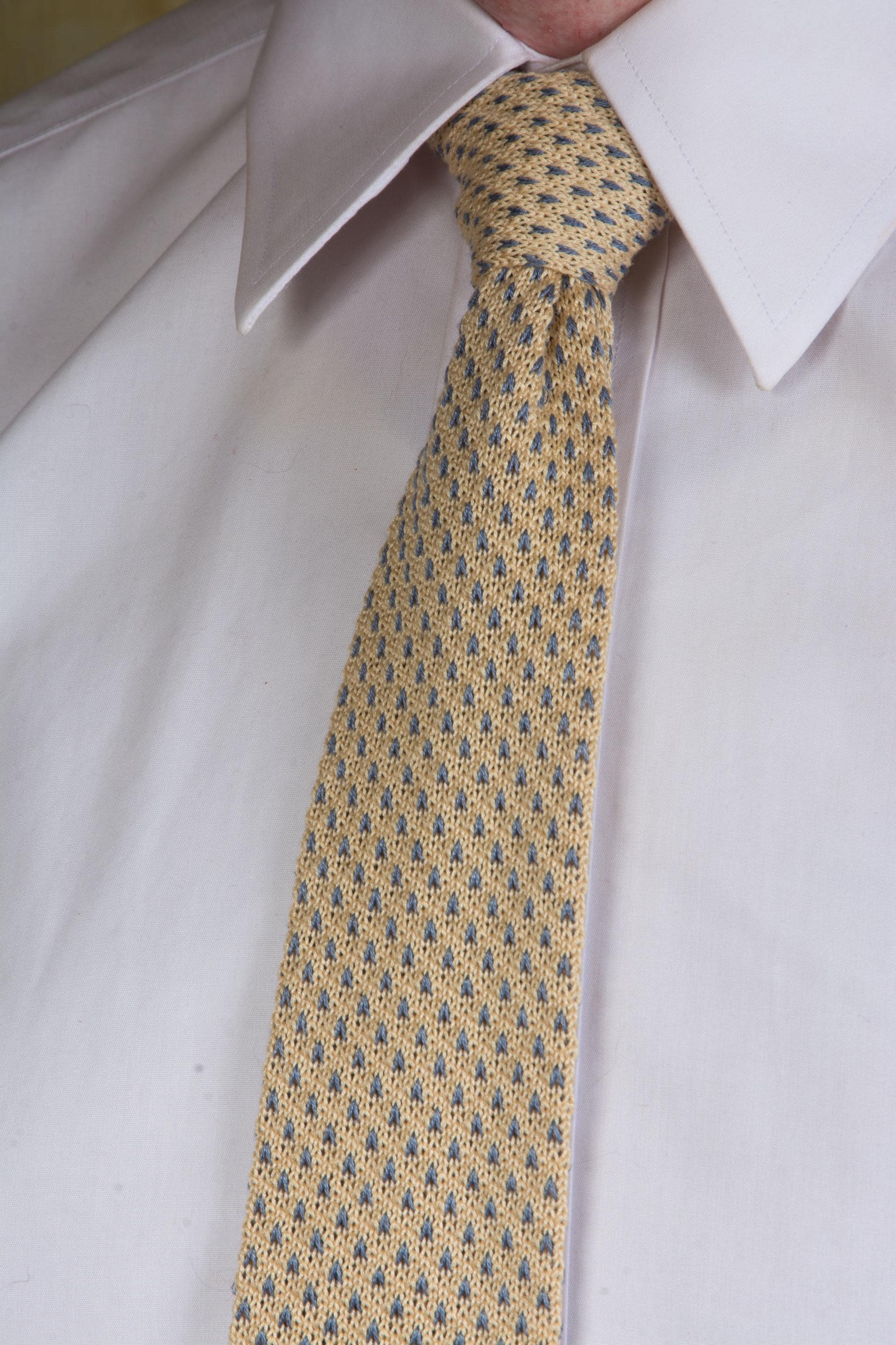 A really sporty knit tie, the quintessential casual collegiate look. This square bottom tie is a matte knit n yellow with blue diamonds. The length and width say 50s to me, but its constructed like 30s versions, with a banded stripe around the back of the neck.