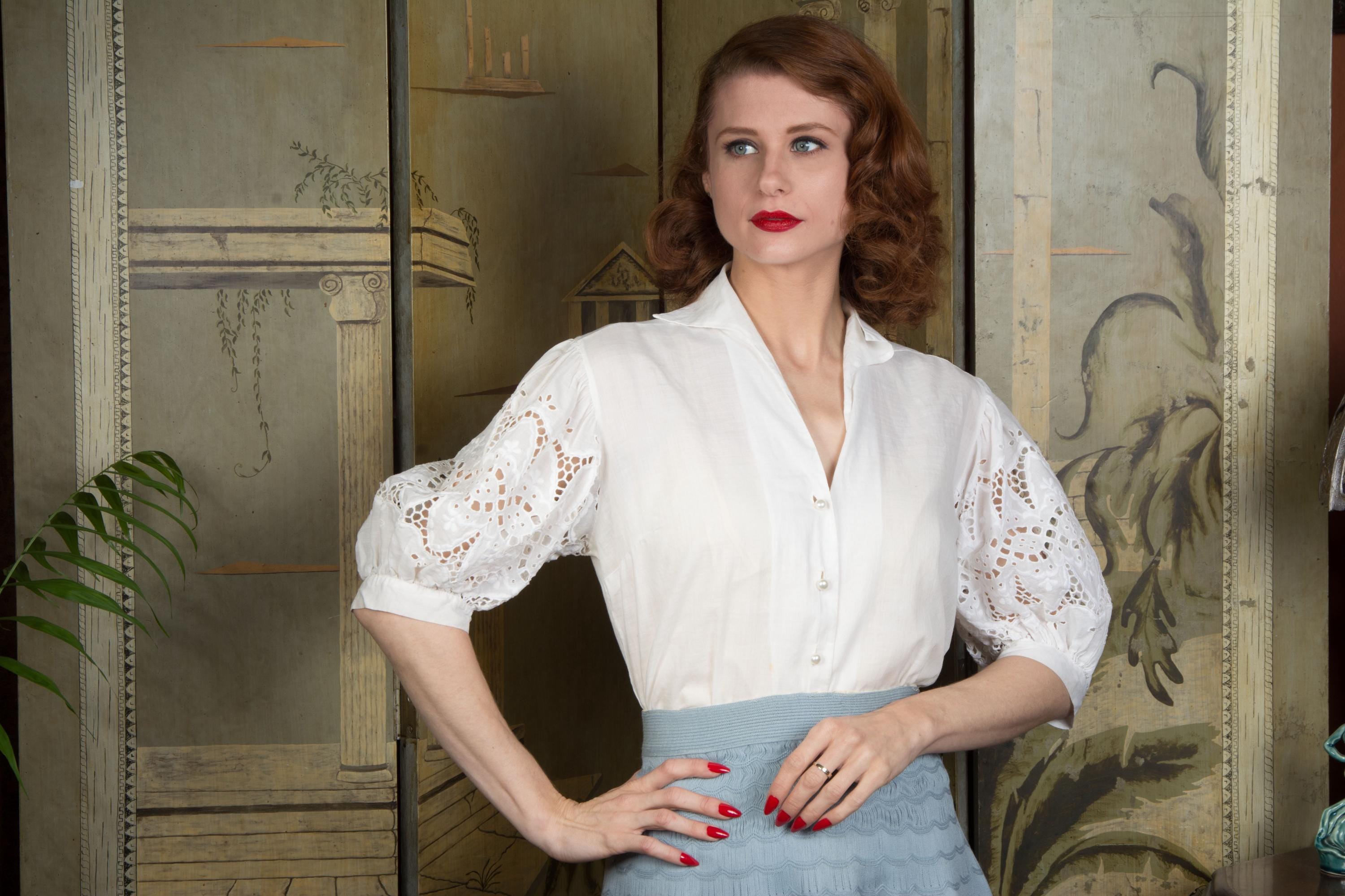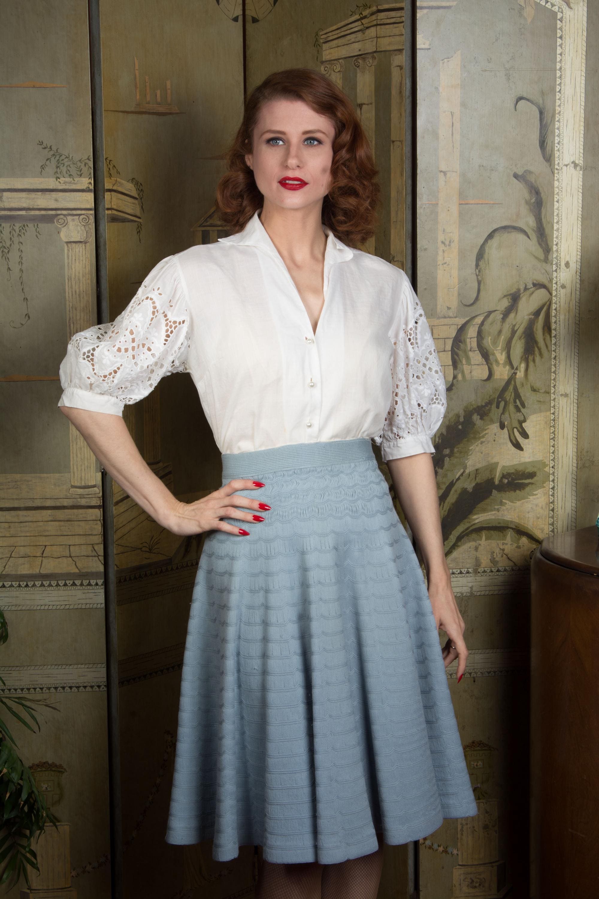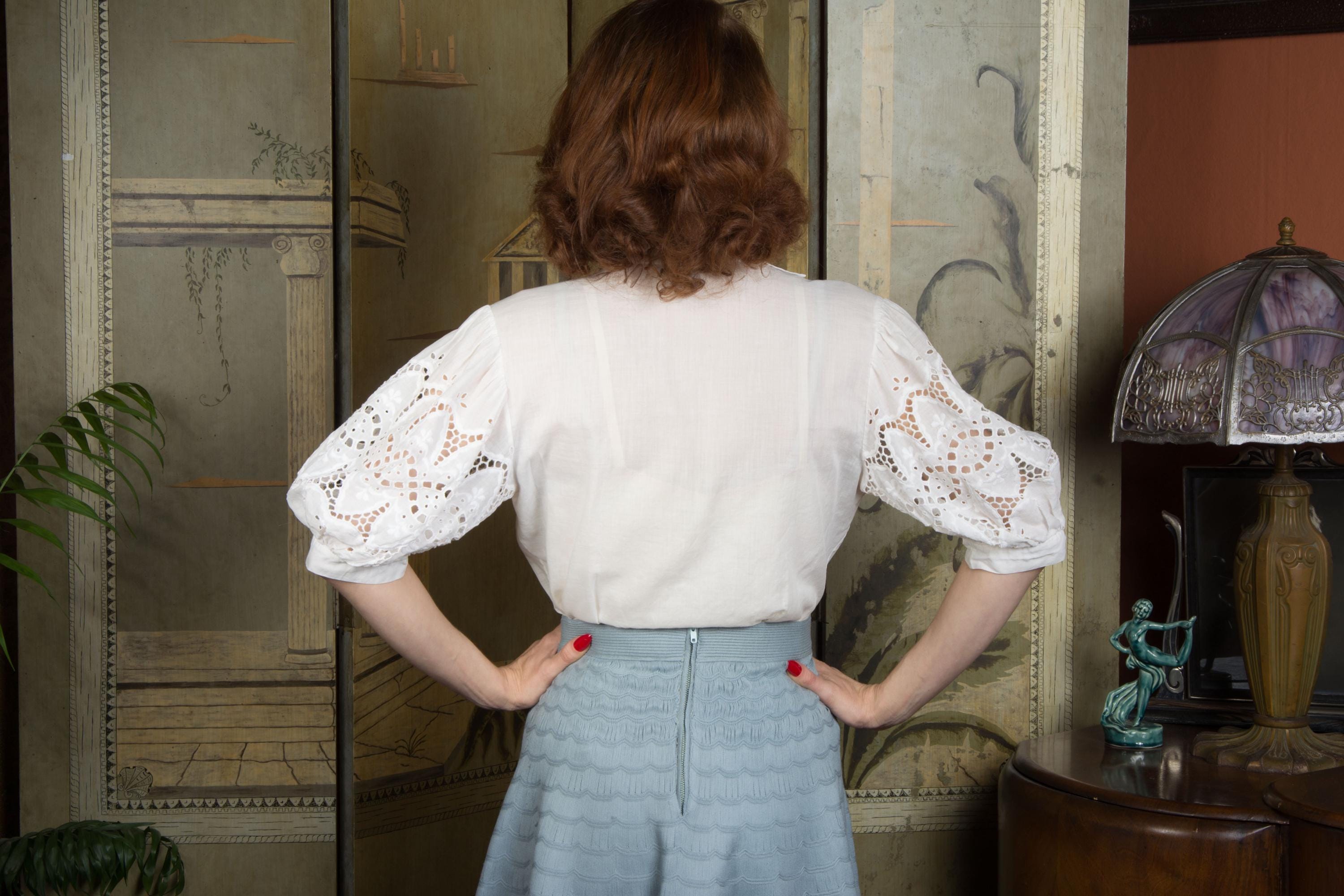 An absolutely charming, versatile early 1950s blouse in soft white cotton. Lightweight enough to require a slip (I mean, unless you'd rather not) it has a winged collar and fantastic sleeves. White embroidery and eyelet helps the full, half-length sleeves pop. It's a stand out separate for pairing with sleeveless dress and sweater vest! Closes up the front with pearly little buttons.