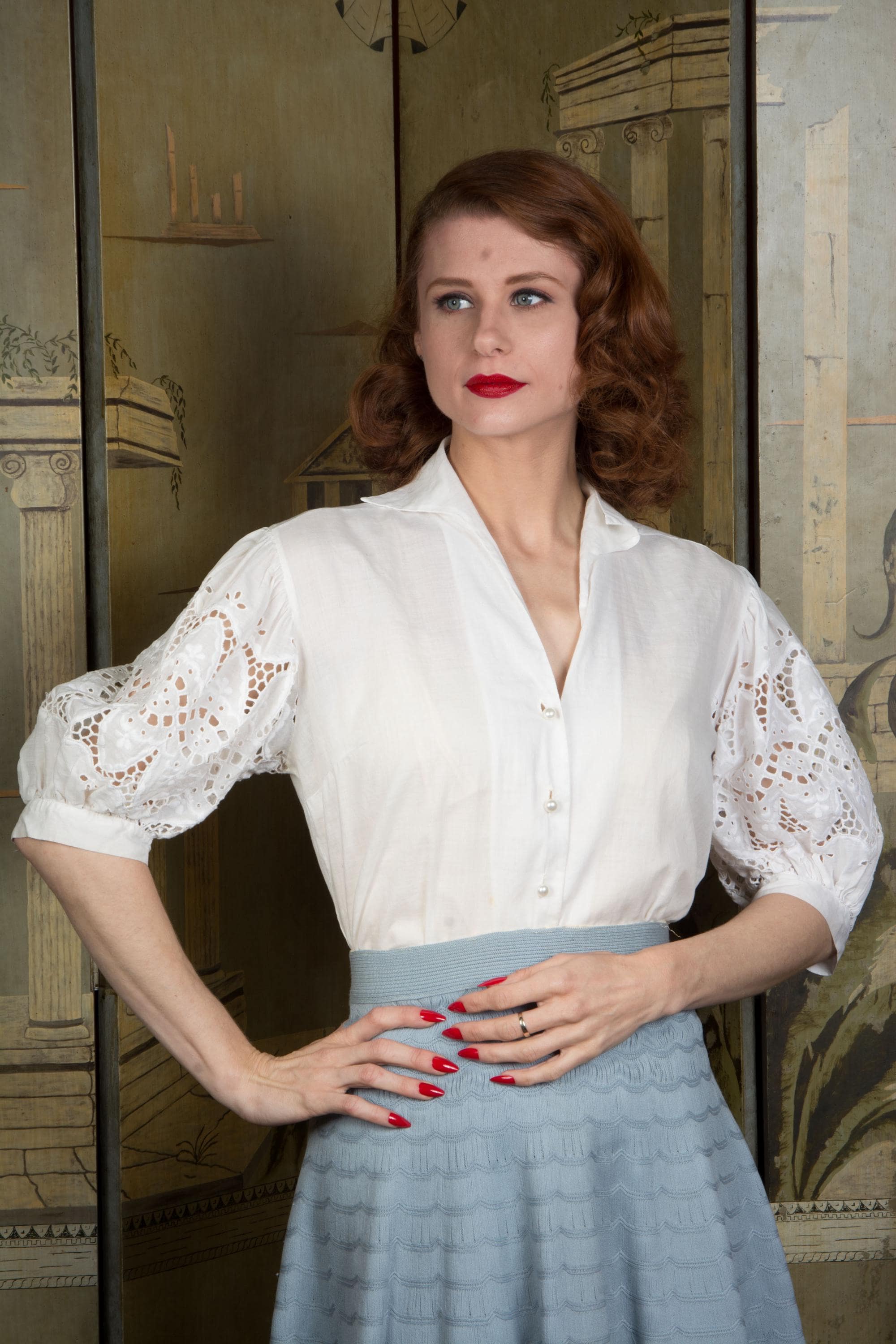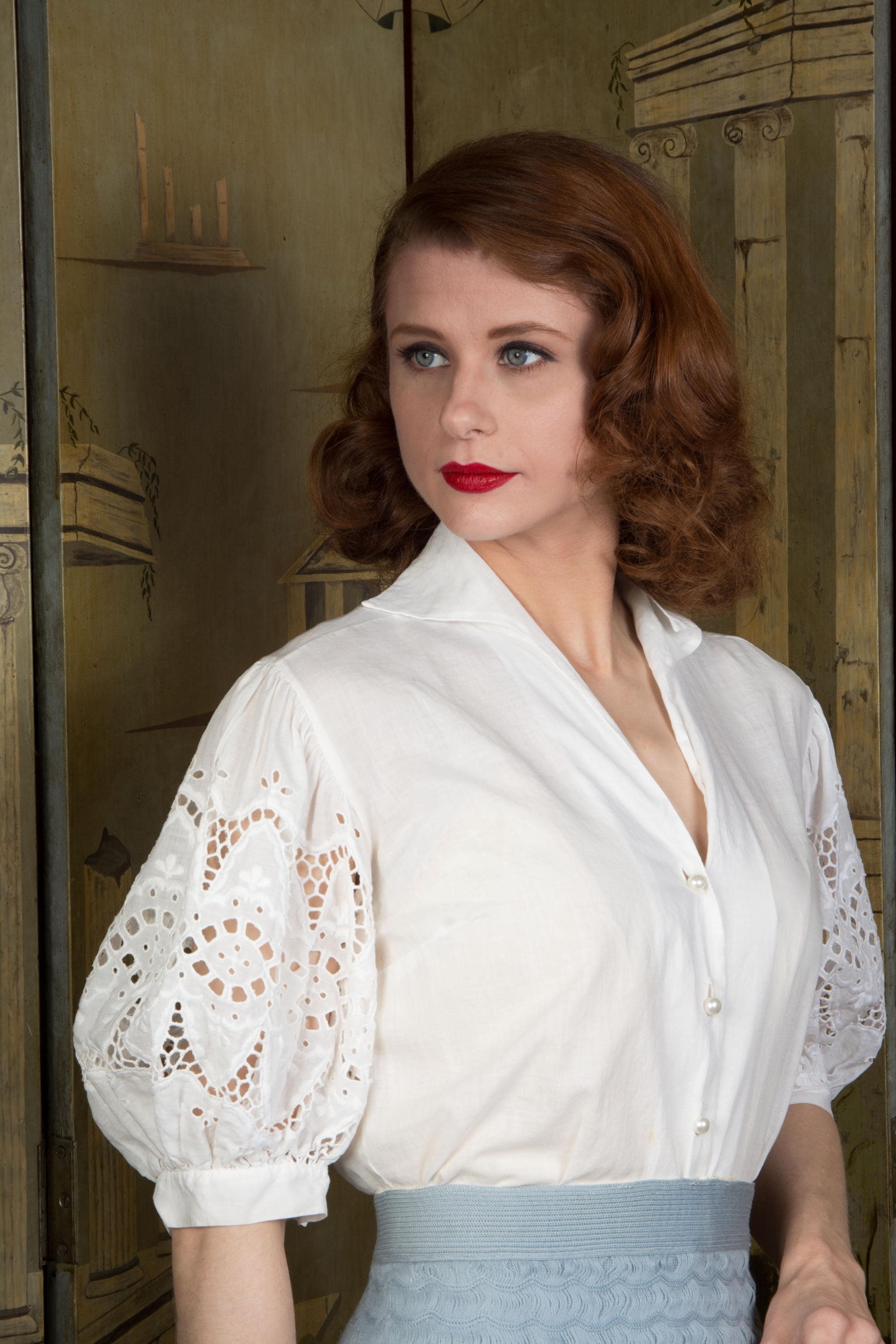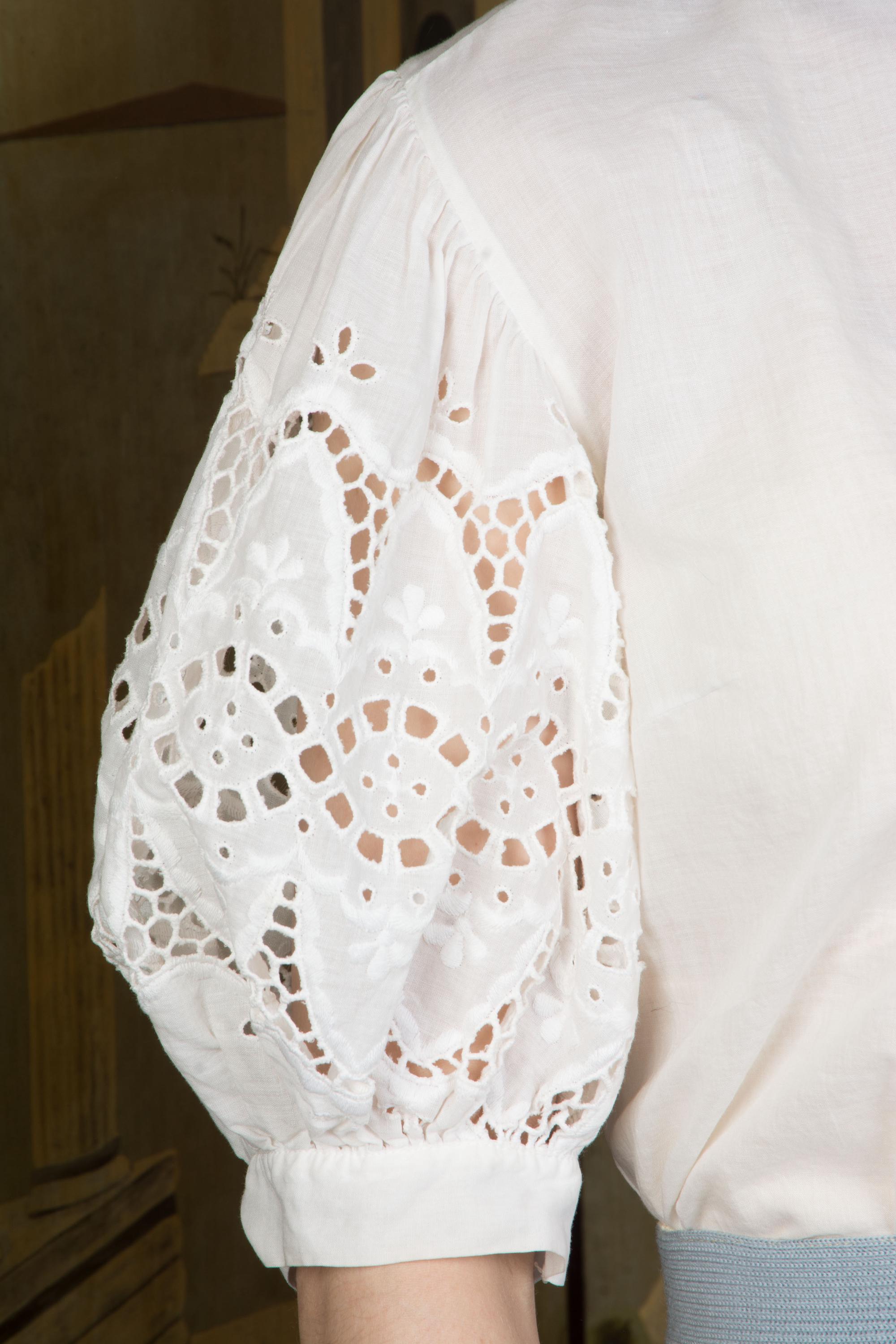 An absolutely charming, versatile early 1950s blouse in soft white cotton. Lightweight enough to require a slip (I mean, unless you'd rather not) it has a winged collar and fantastic sleeves. White embroidery and eyelet helps the full, half-length sleeves pop. It's a stand out separate for pairing with sleeveless dress and sweater vest! Closes up the front with pearly little buttons.