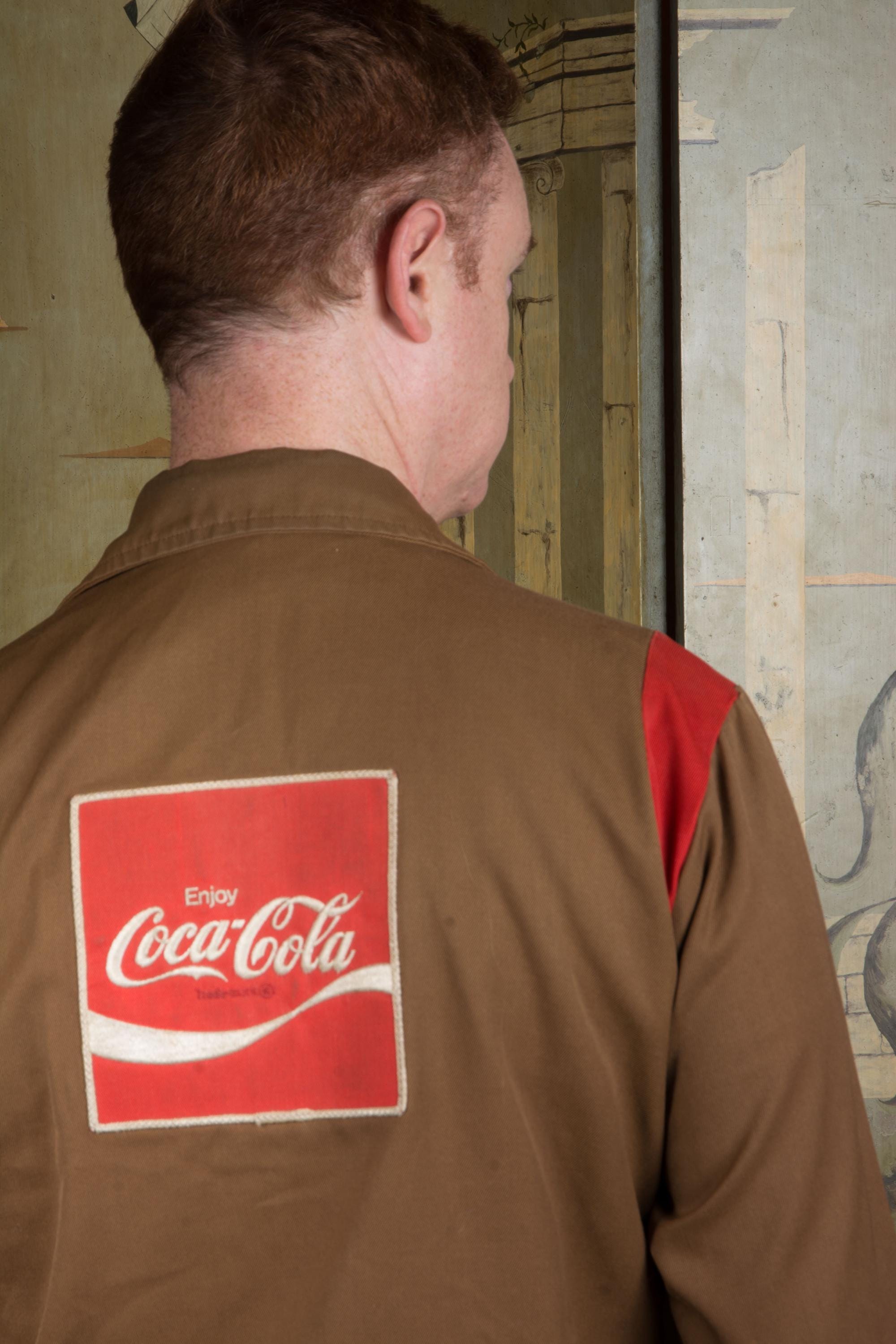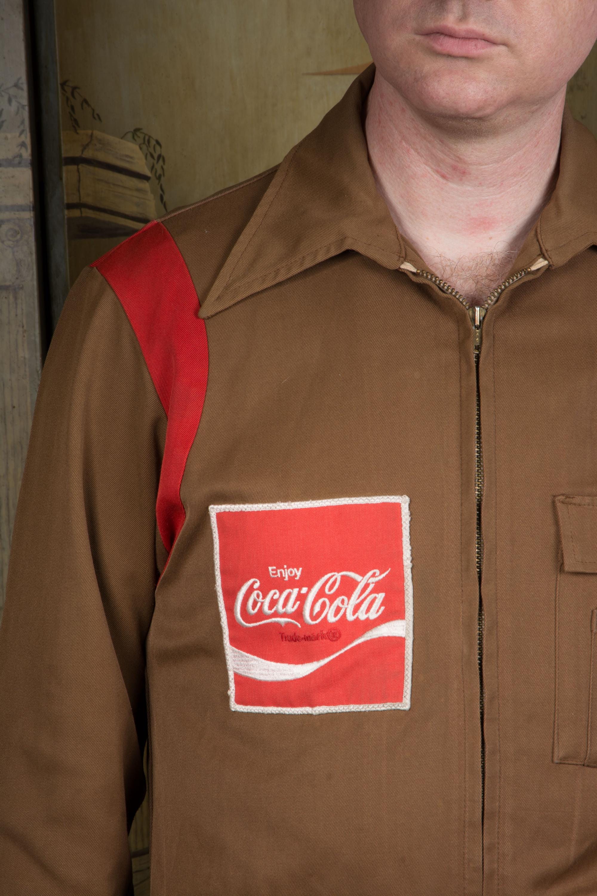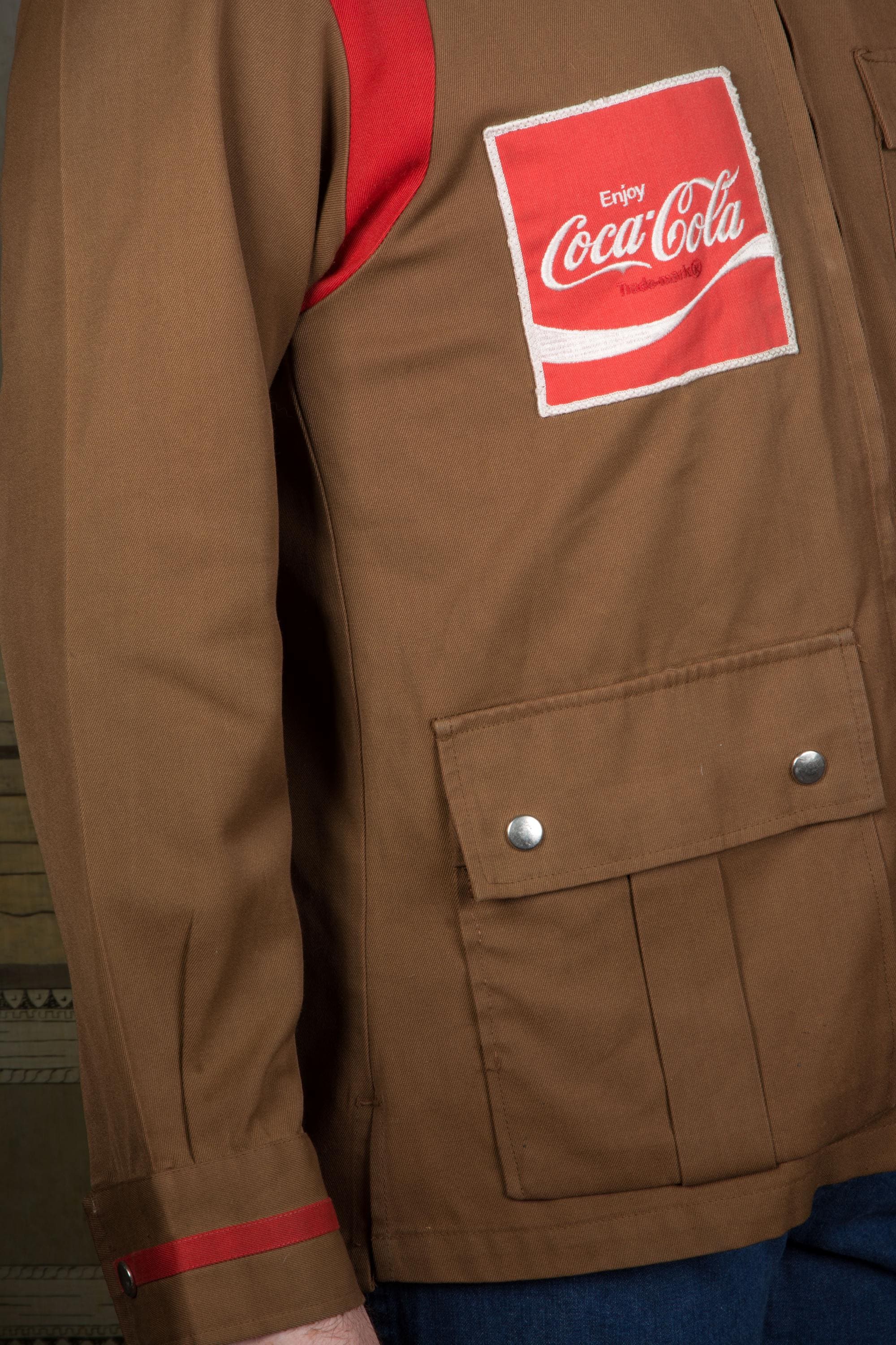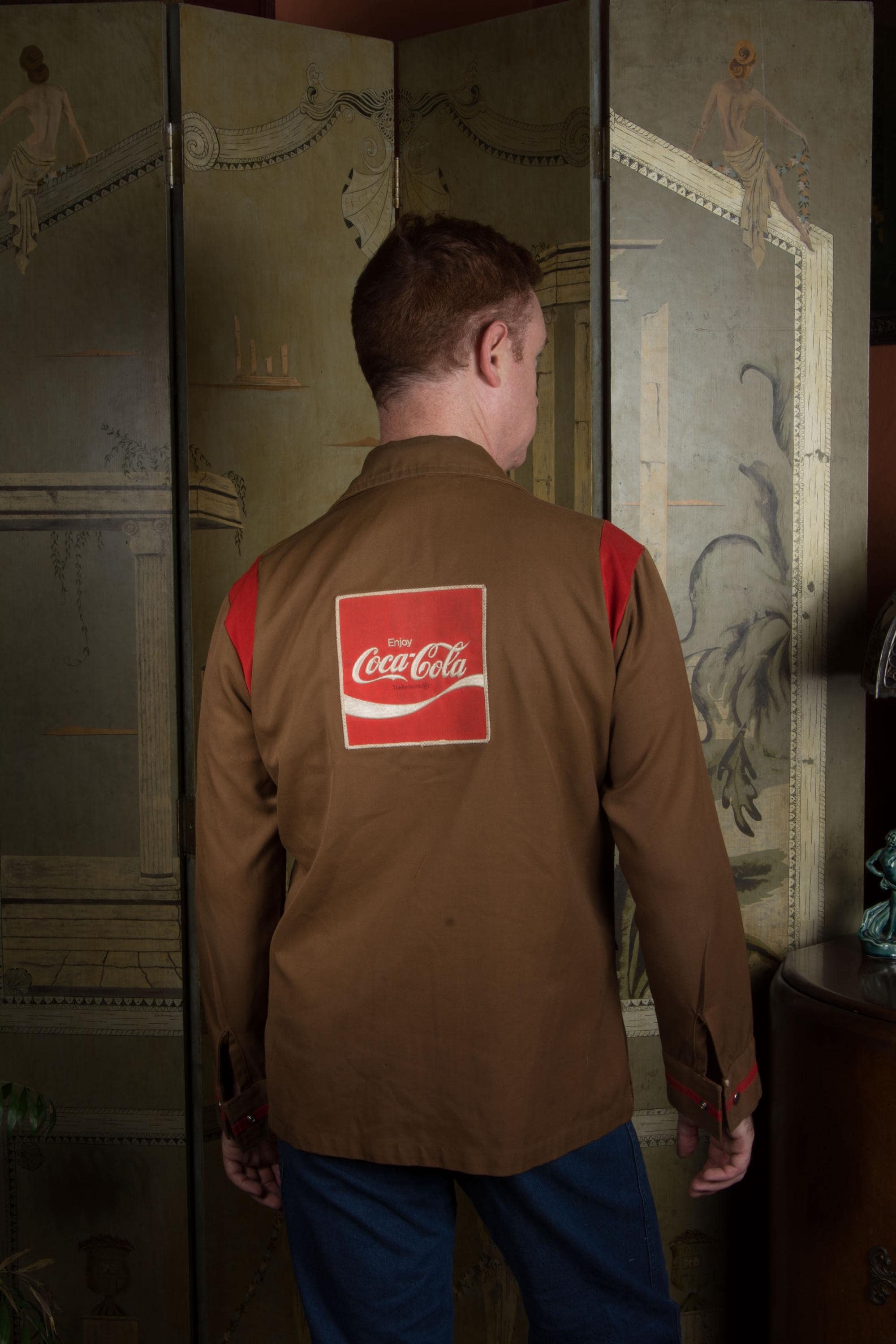 Vintage 1970s classic Coca-Cola delivery driver uniform jacket in brown poly-rayon with orange-red shoulder inserts and two large Coke logo patches, at the right front and center back. This closes with a sturdy brass Talon zipper up the front. There's a single chest pocket on the left and two lower front pockets, all that close with snaps.