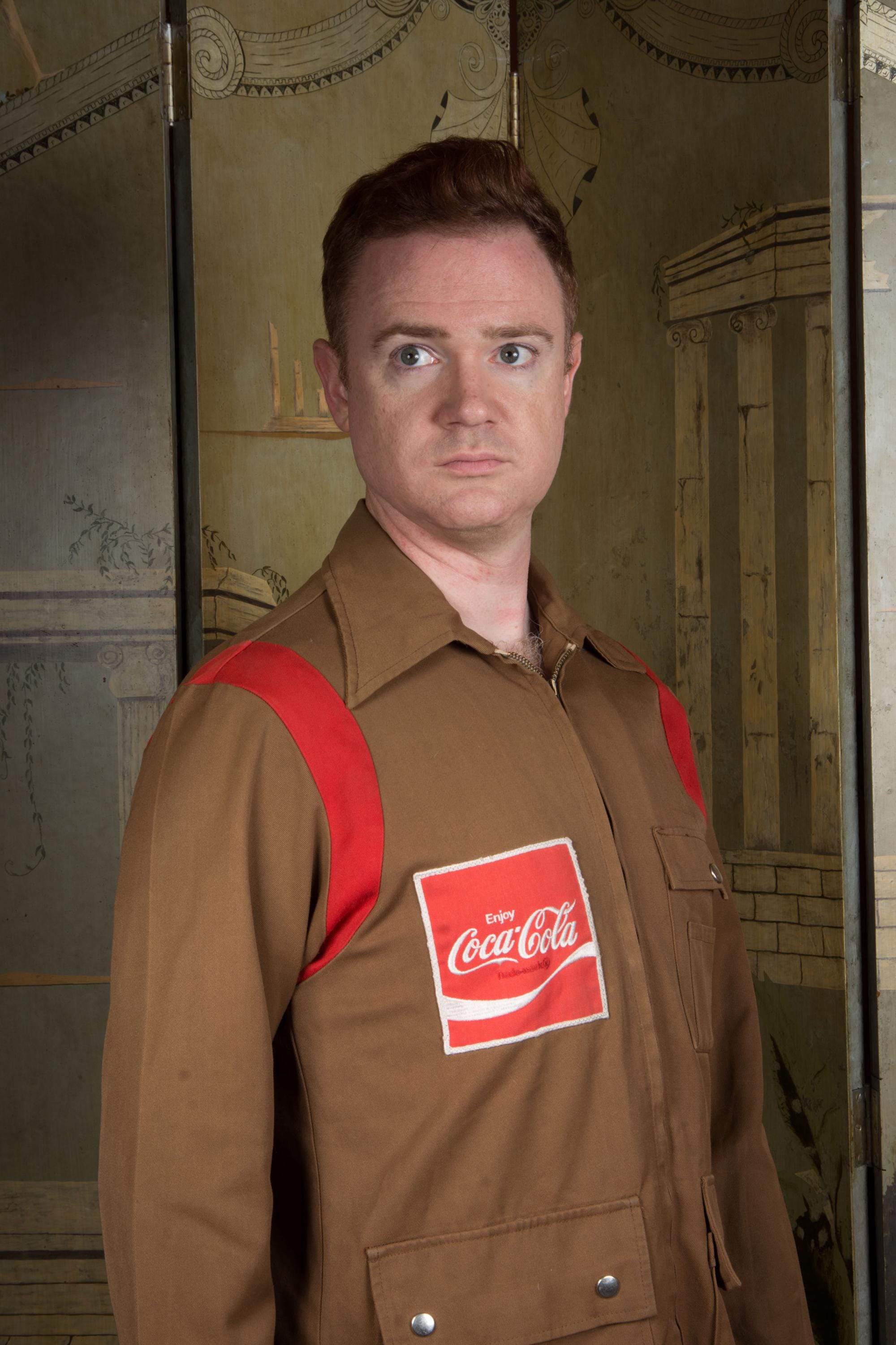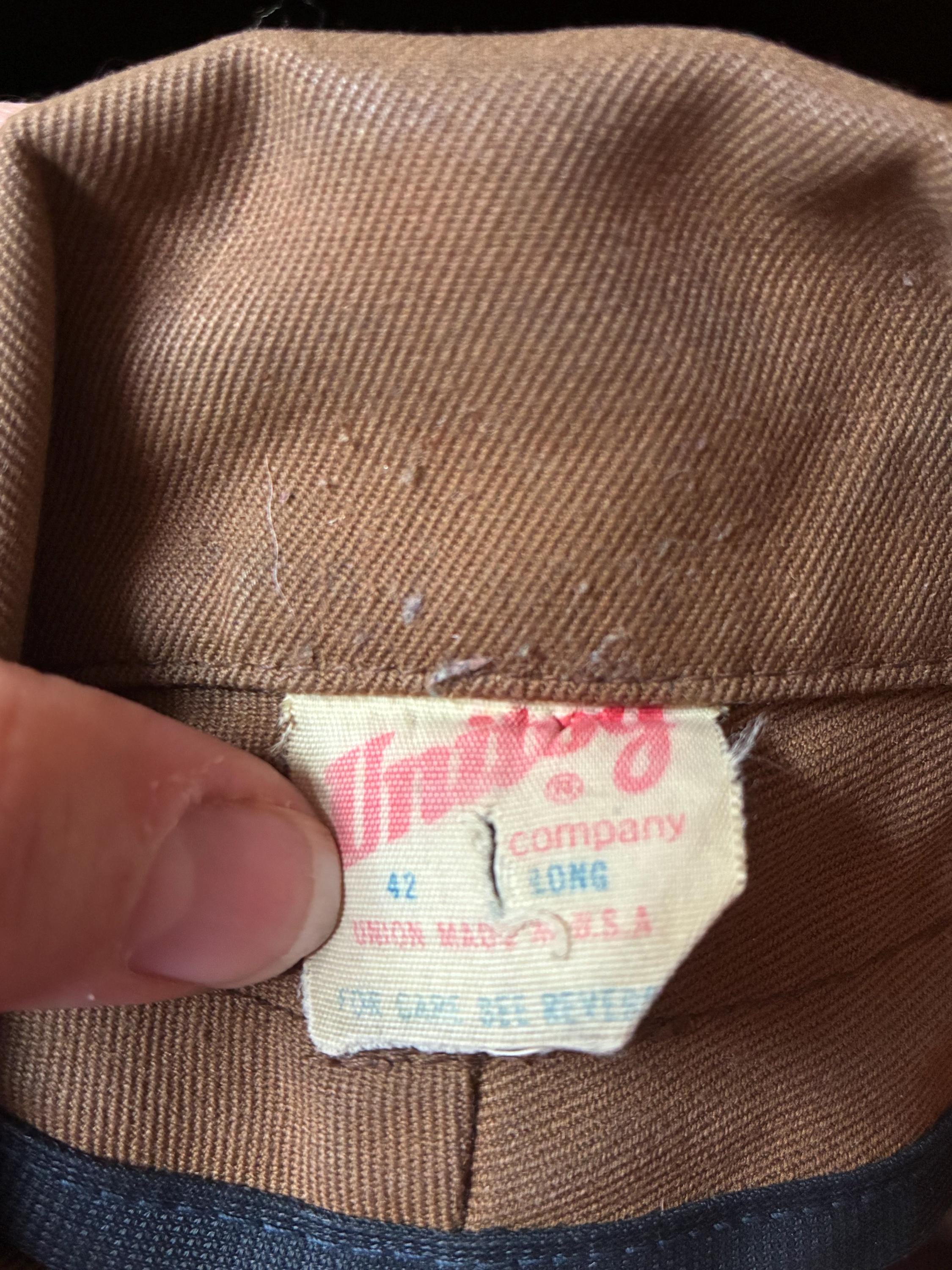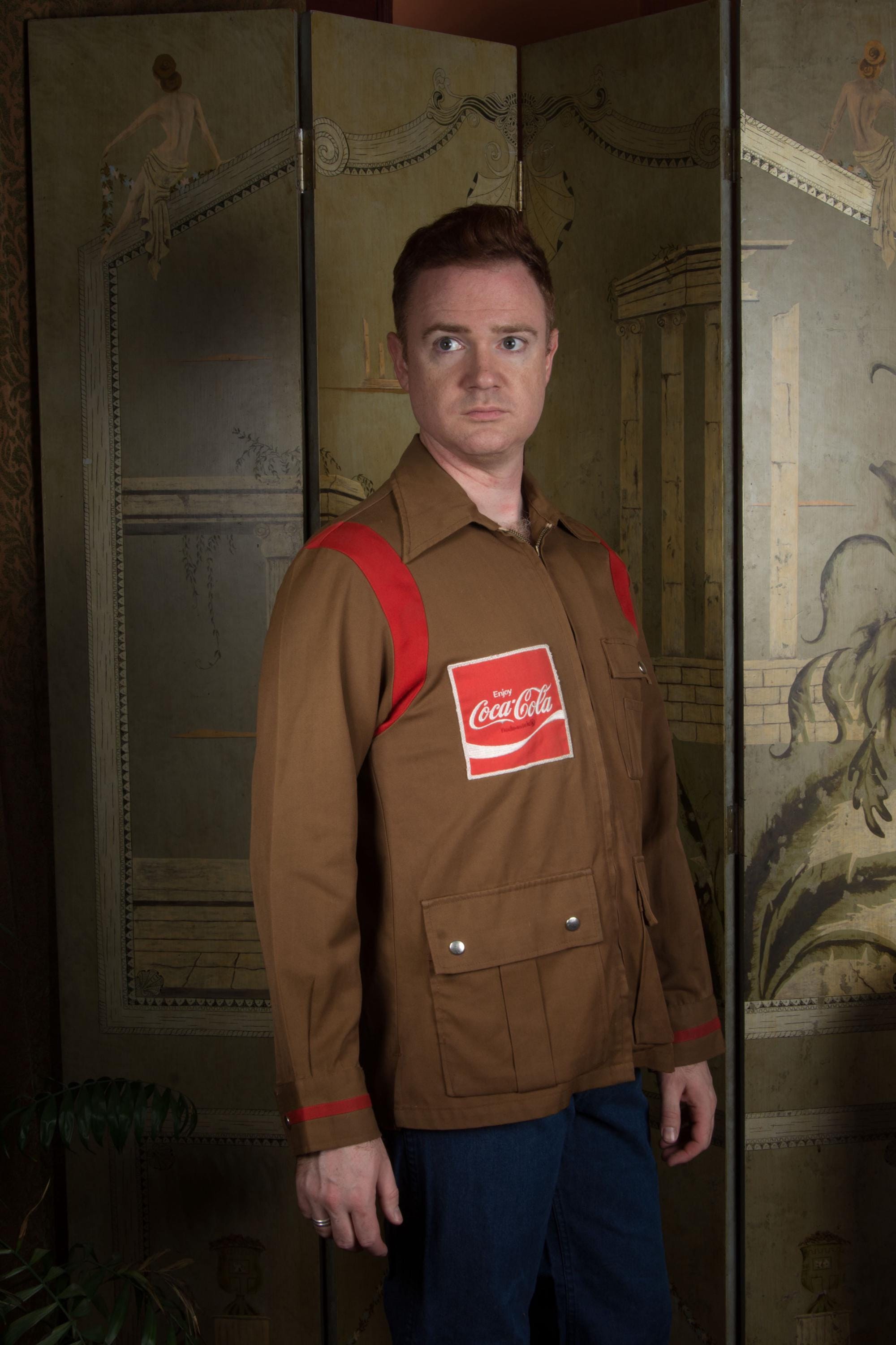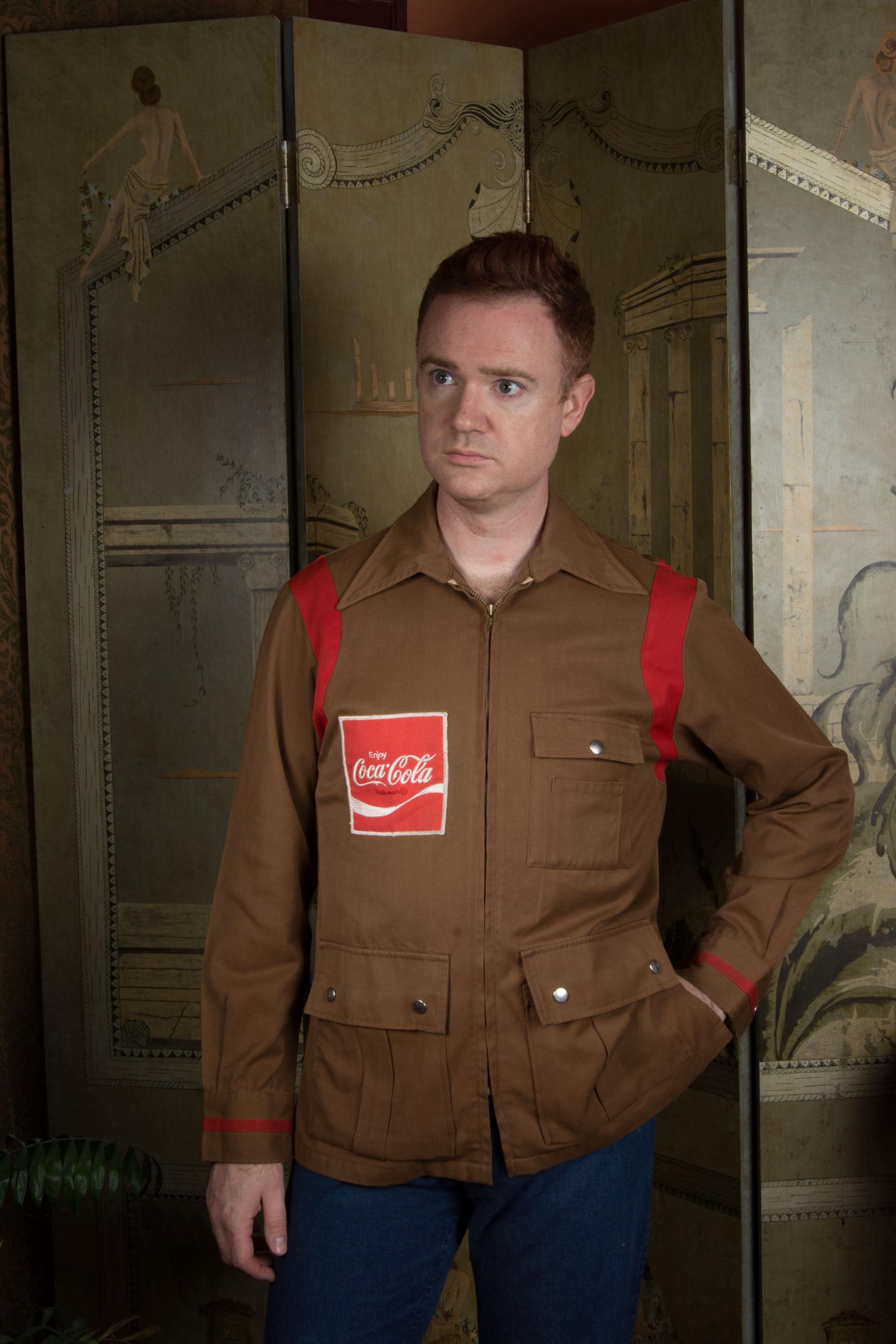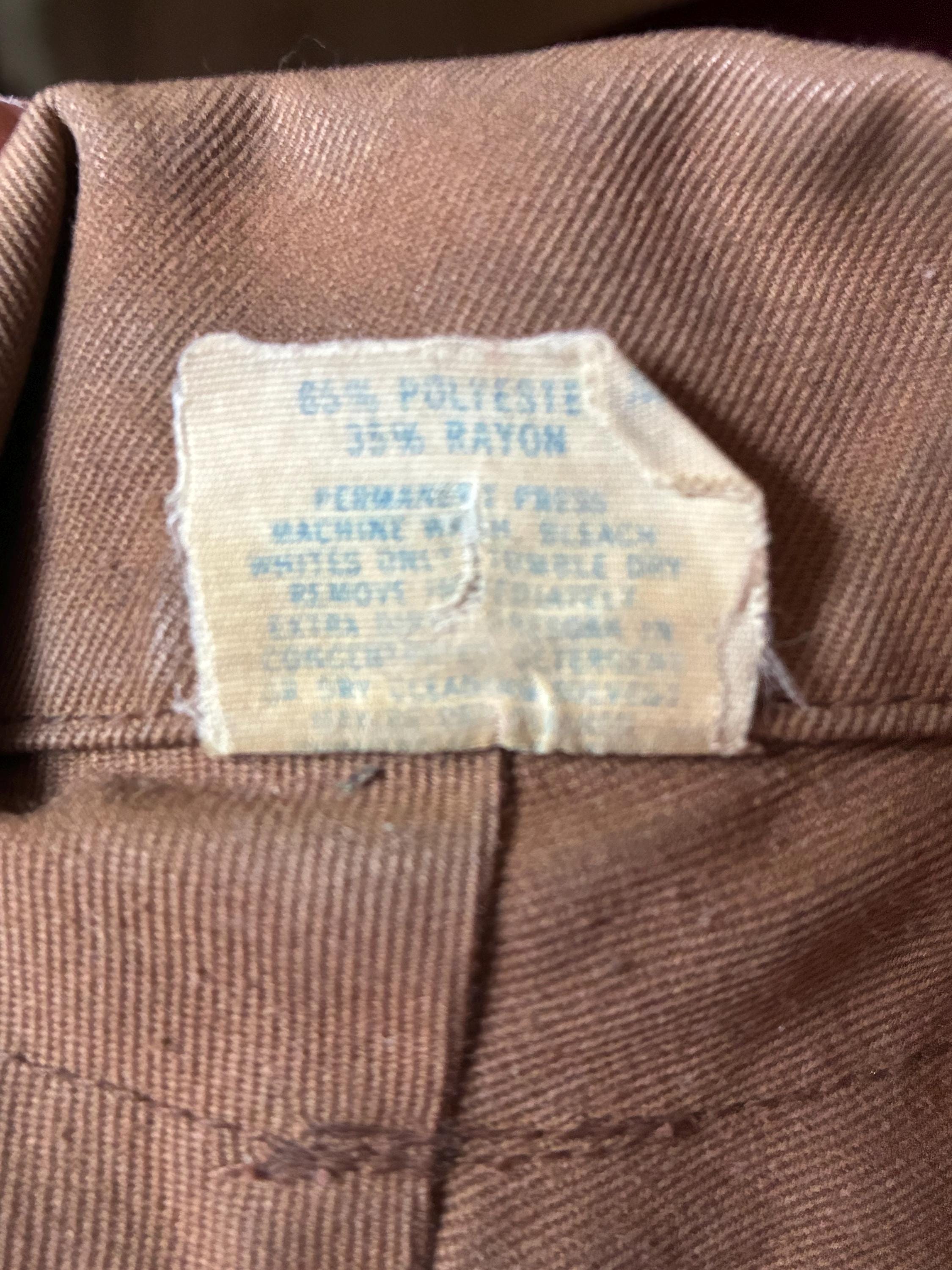 Vintage 1970s classic Coca-Cola delivery driver uniform jacket in brown poly-rayon with orange-red shoulder inserts and two large Coke logo patches, at the right front and center back. This closes with a sturdy brass Talon zipper up the front. There's a single chest pocket on the left and two lower front pockets, all that close with snaps.