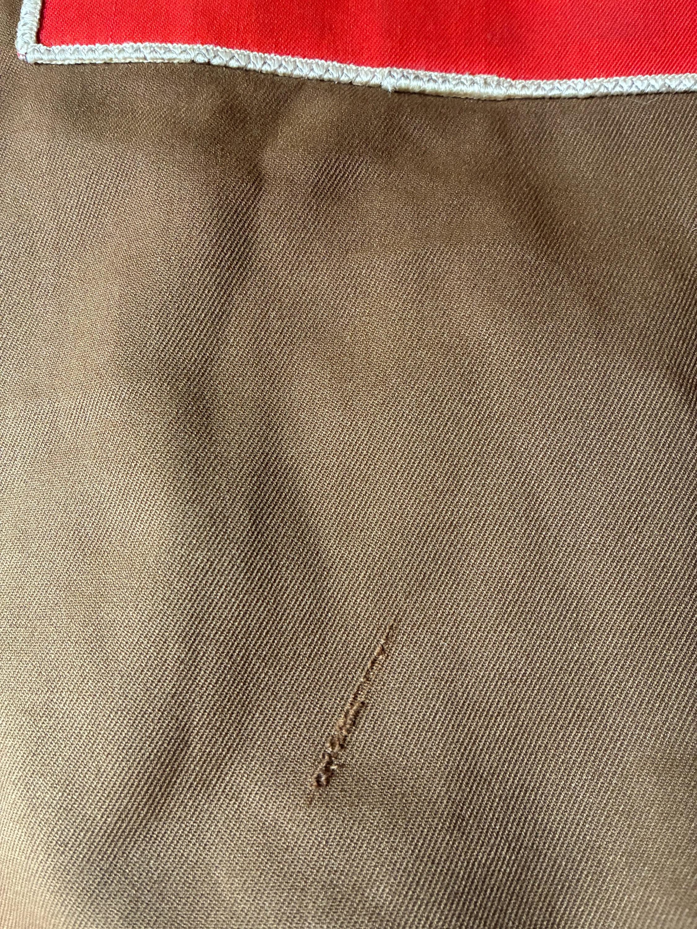 This has been gently hand washed but still has a lightly patinaed look. There is a scratch to the surface of the material at the center back, but it's not an actual tear. There's a couple small spots at the edge of the cuff.